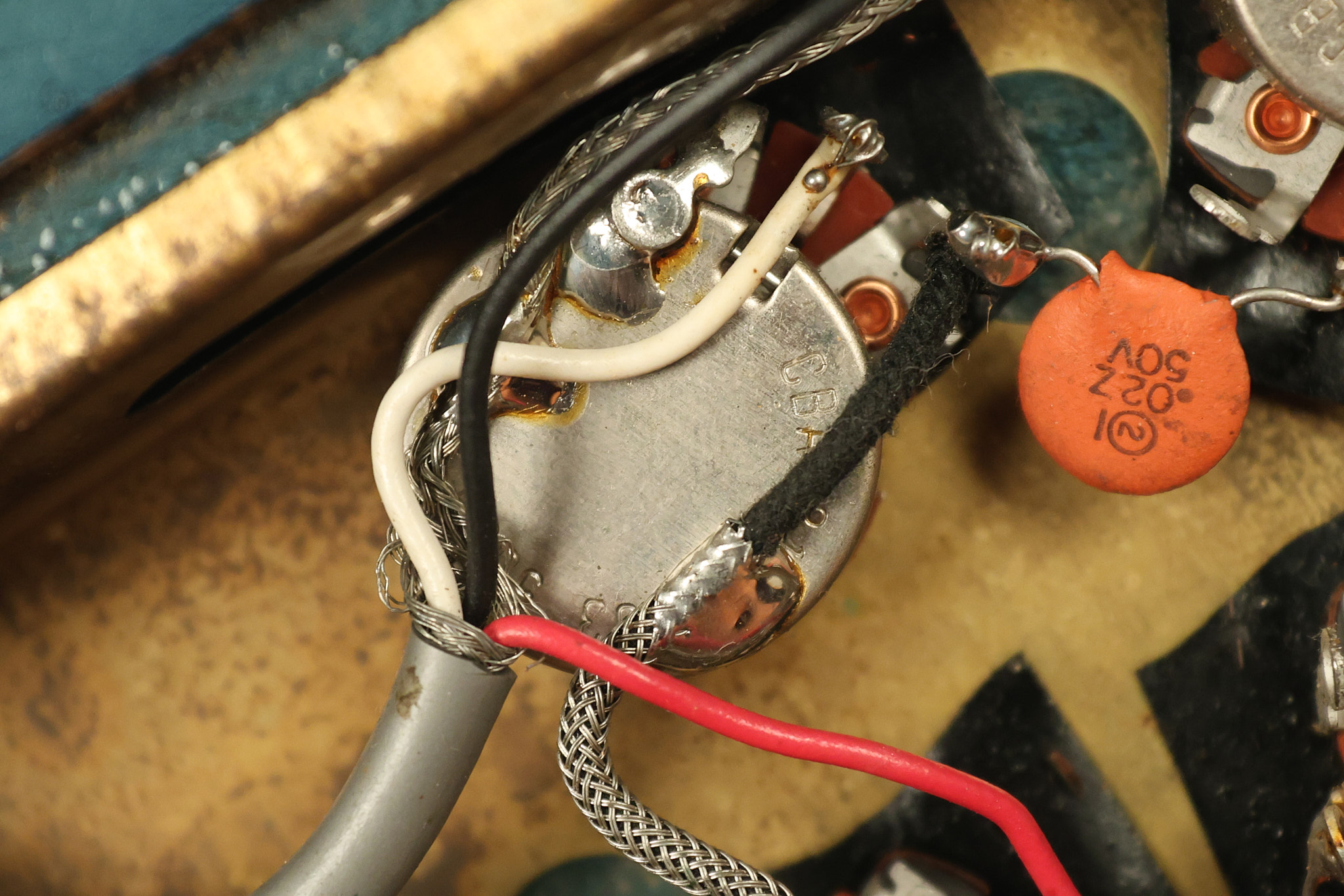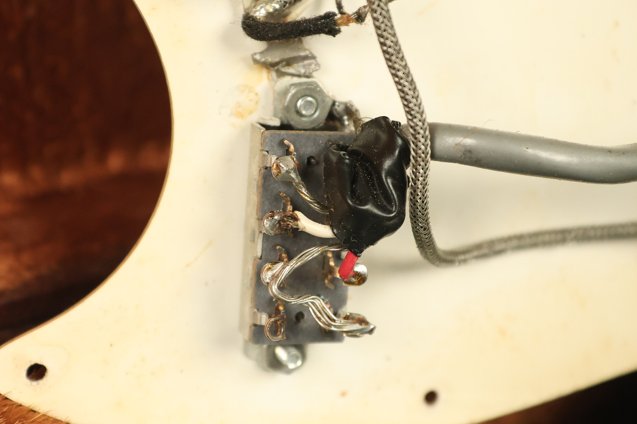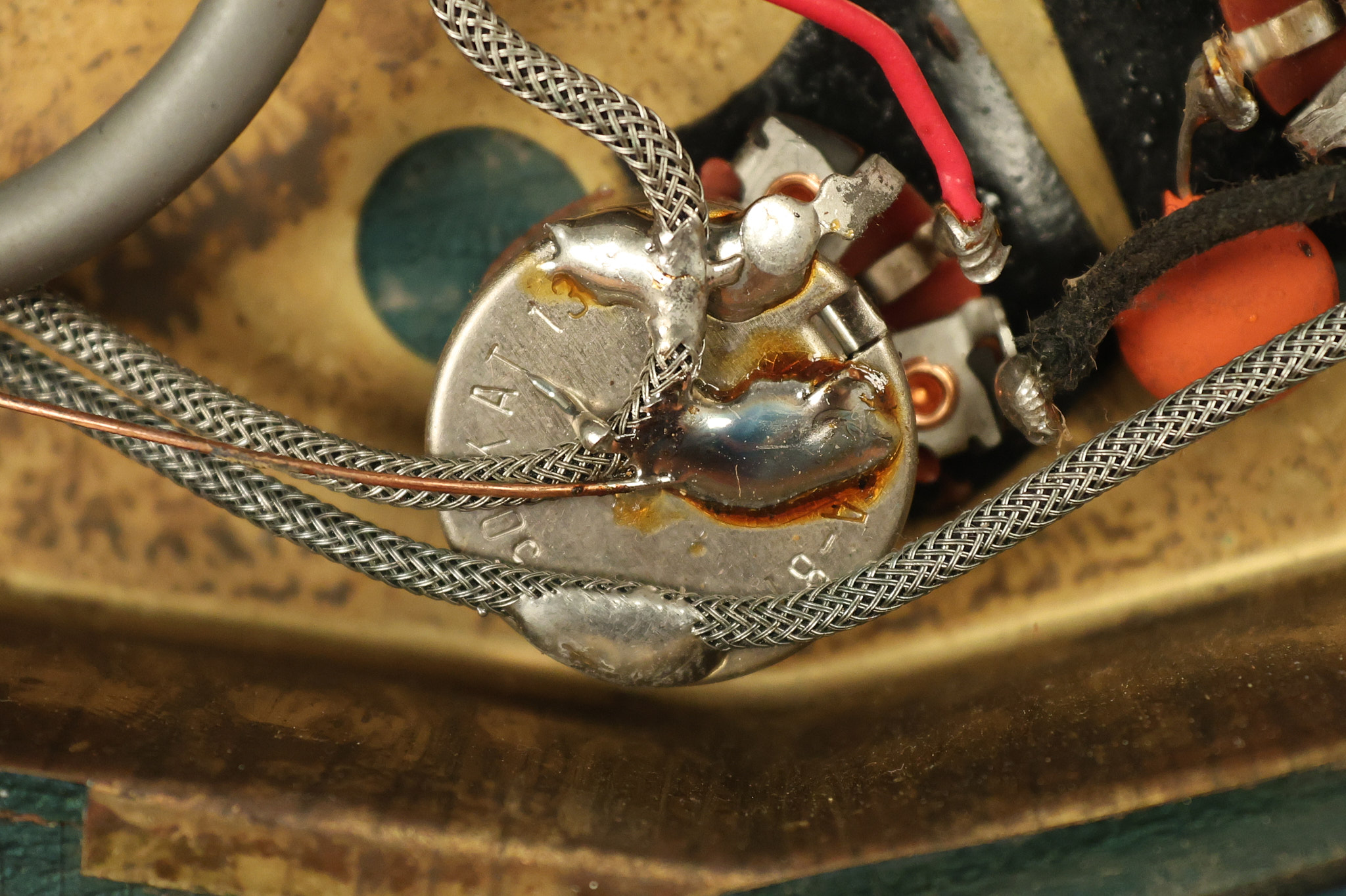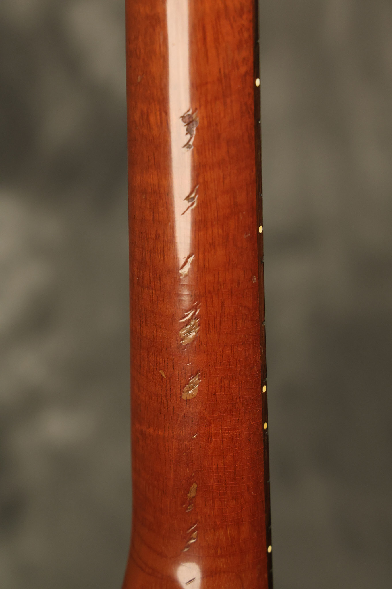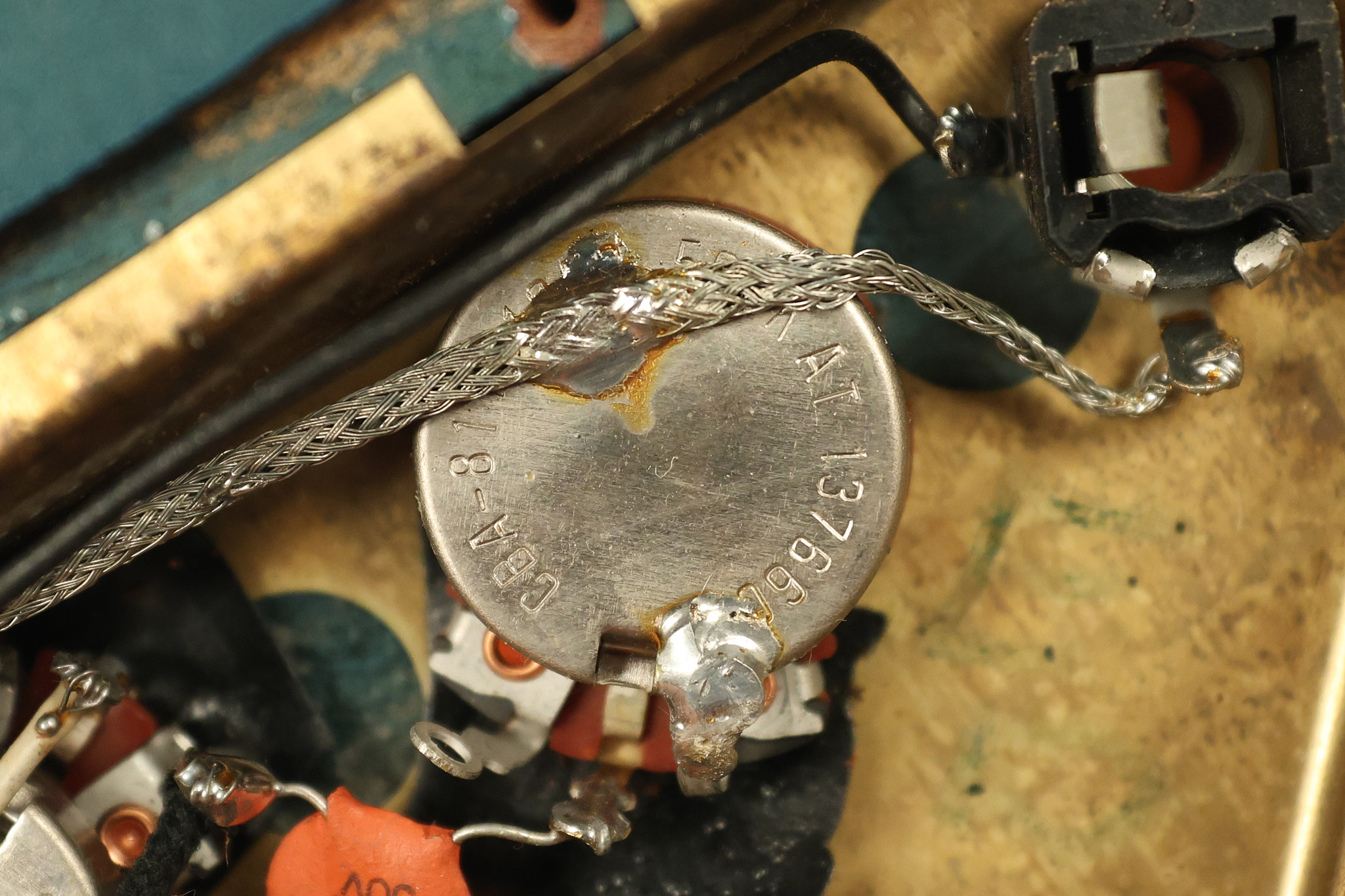 1966 Gibson Melody Maker II in its original Pelham Blue finish. It has a good playing neck as it has been re-fretted with a Plek machine by Wolff Guitars and includes the Plek certificate. It's all original with the exception of the switch and the frets (the original frets are included). The Vibrato arm and claw are included, but not recommended for use as it prevents a proper break angle over the bridge. A later non-original hardshell case is included. There are lots of nicks + dings, finish checking and other cosmetic wear. The guitar itself remains structurally sound with no cracks, breaks or repairs. All electronics work and sound great. There is a name etched on the underside of the back control cavity cover.