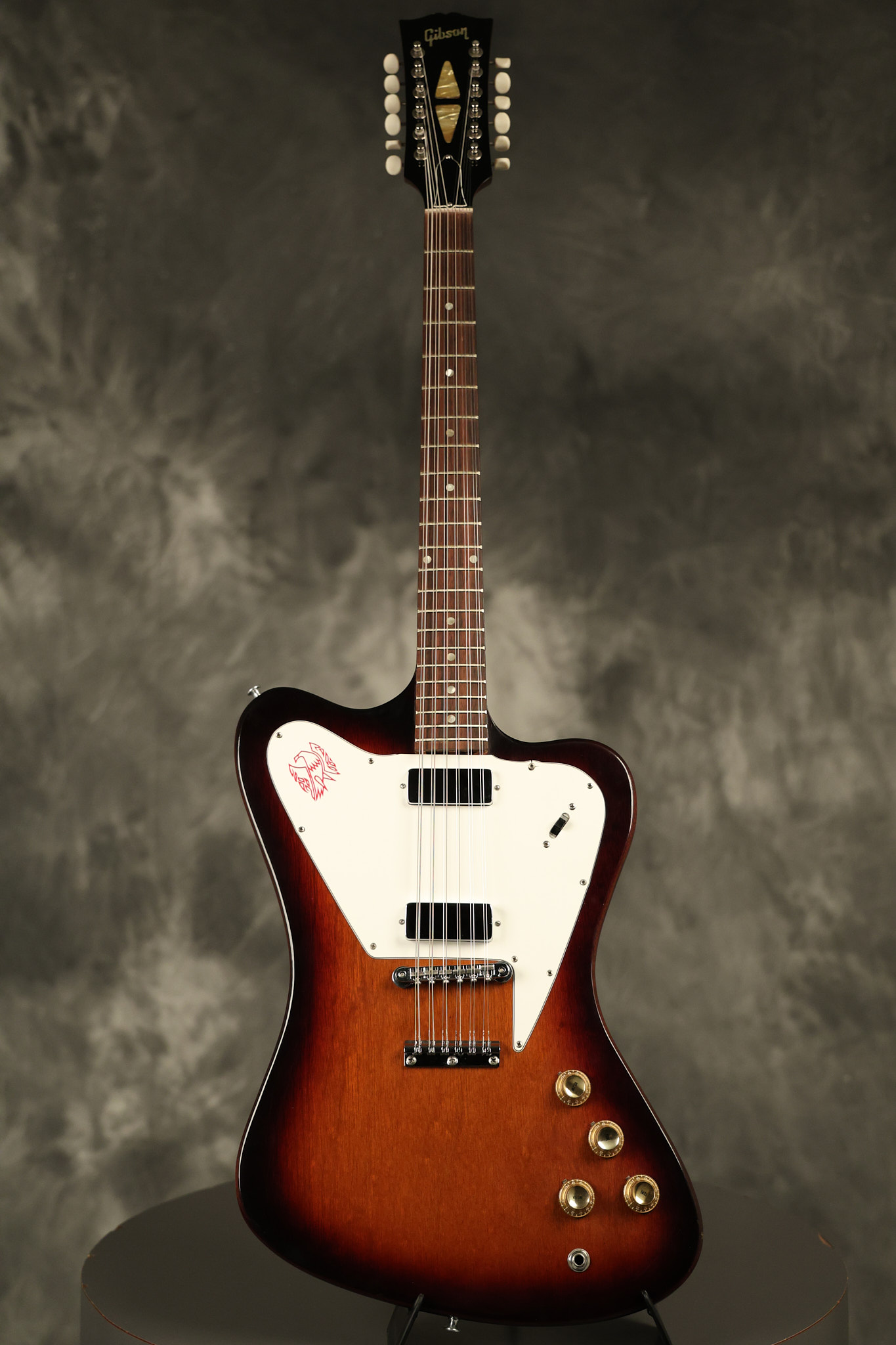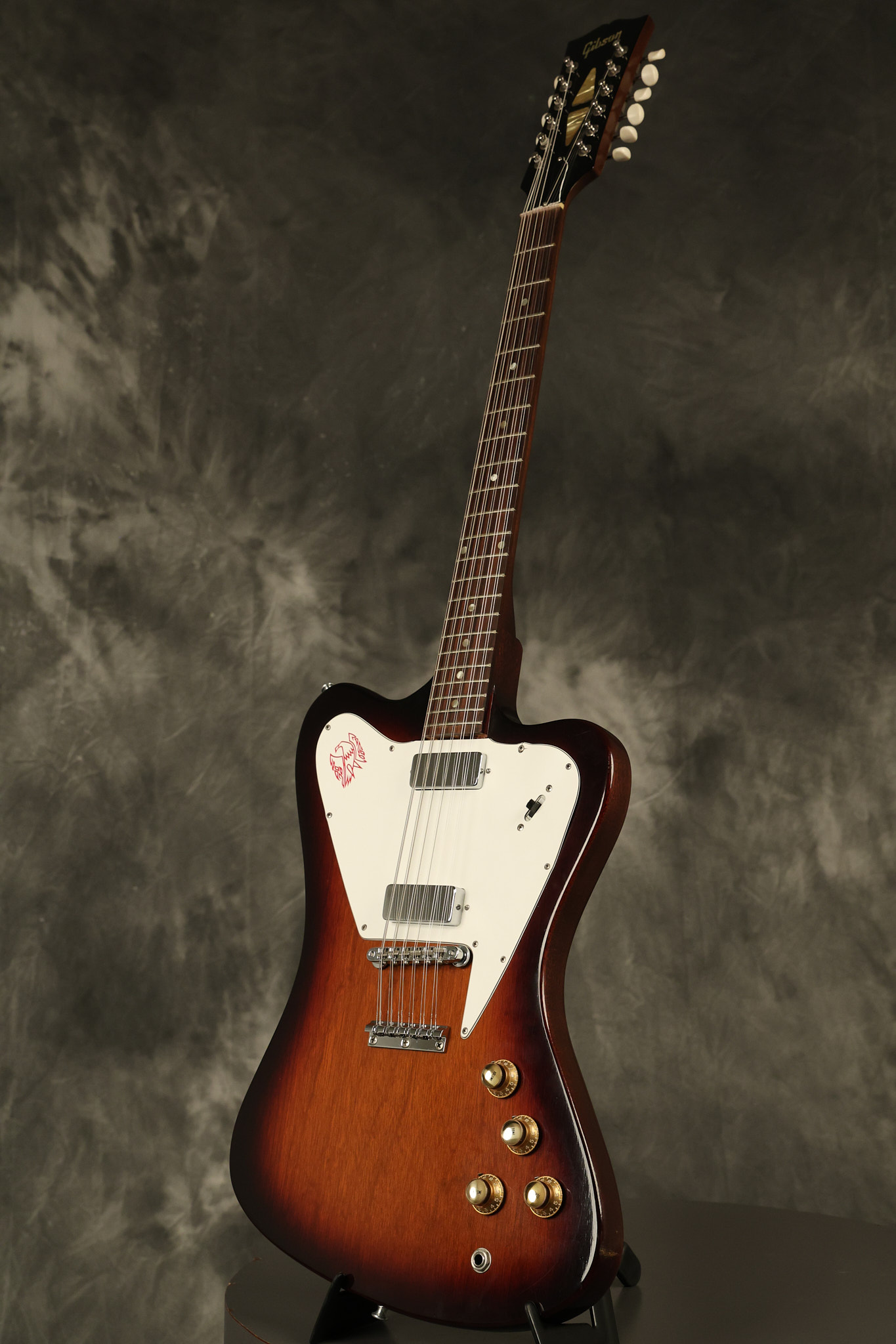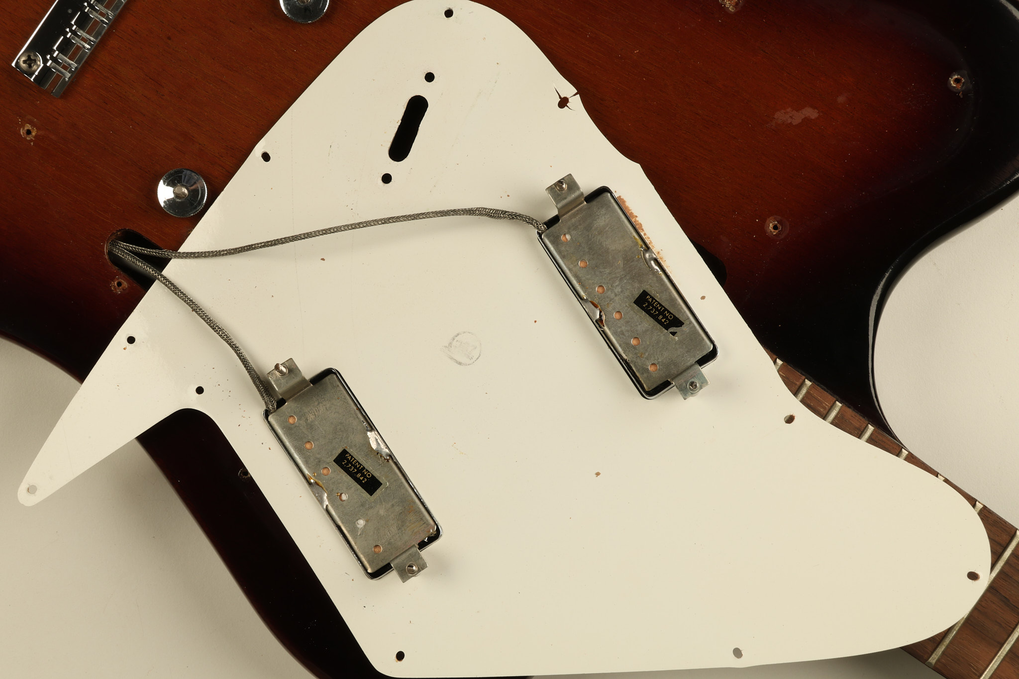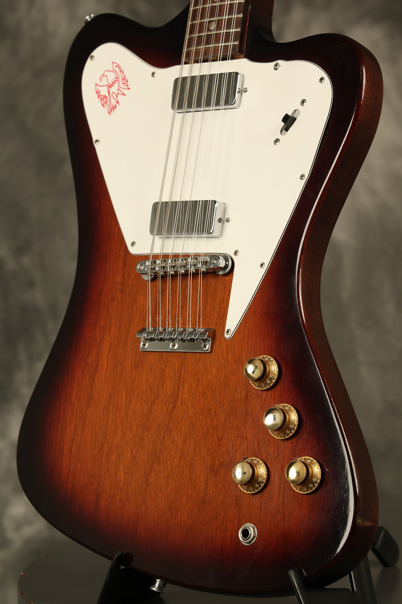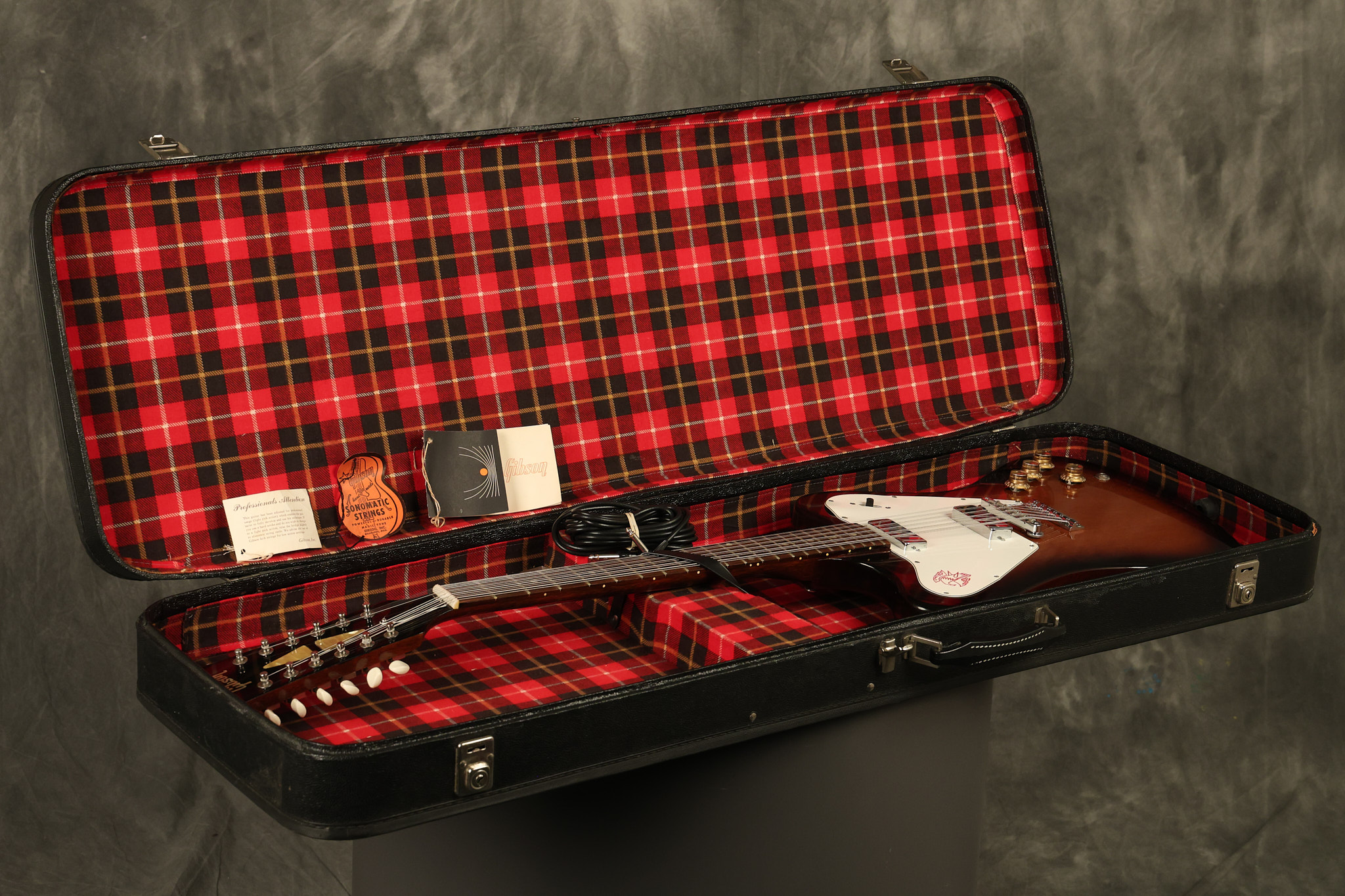1966 Gibson non-reverse Firebird XII in its original Sunburst finish. It has a a great playing neck with great frets. It's all original and 100% complete along with its original hardshell case, hang tags and original cable. It's in very good condition with some nicks + dings and other cosmetic wear including a couple of tiny cracks in the pickguard around one of the screws. There is also a small hairline crack on the bottom edge of the body running over the back edge of the body towards the control cavity where the wood has the most shallow depth from the cavity wall to the edge of the body. It does not run over the top edge of the body and remains more of a cosmetic issue as the guitar itself remains structurally sound. All electronics work and sound great while all solder joints remain original and untampered with.