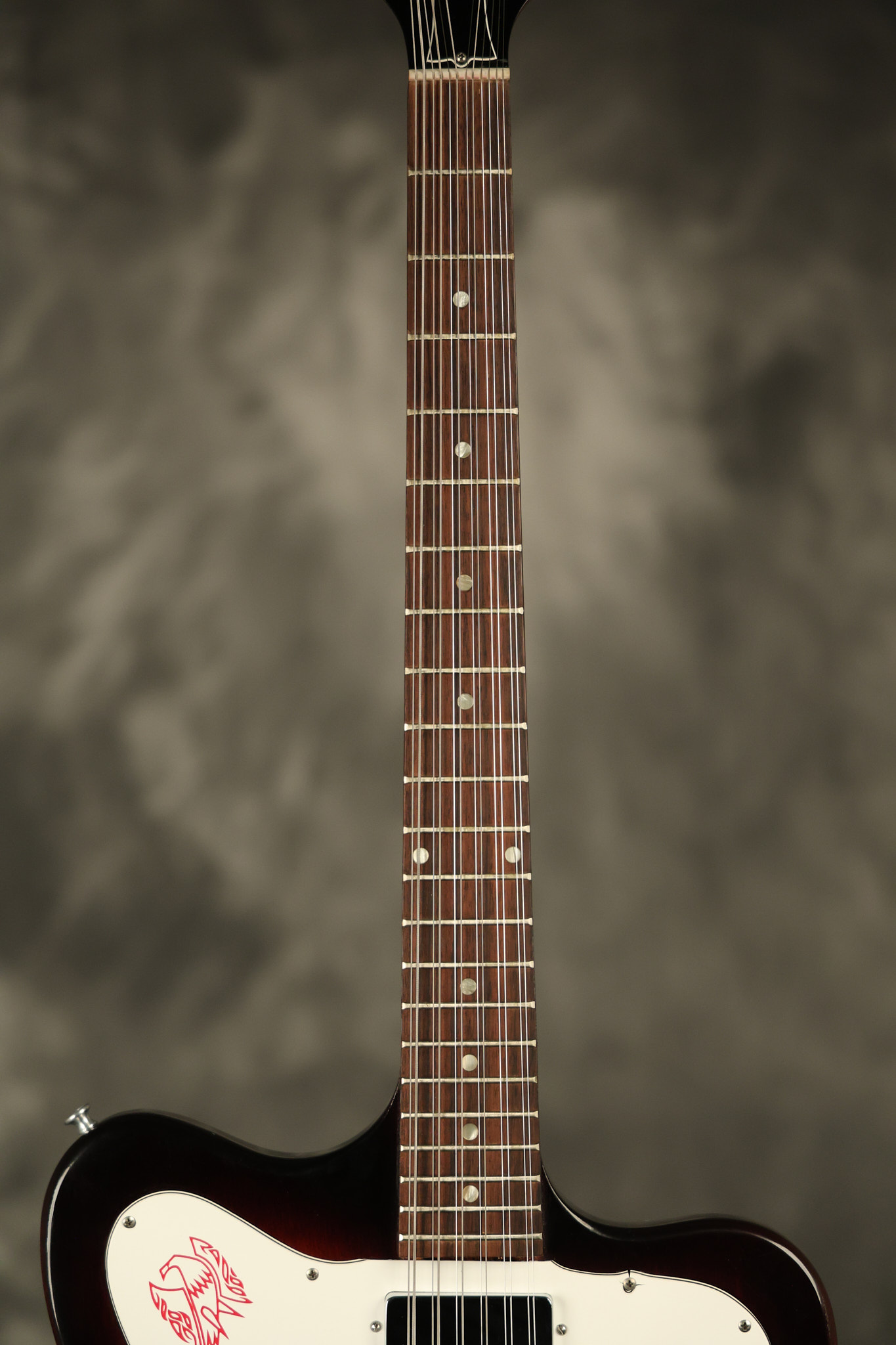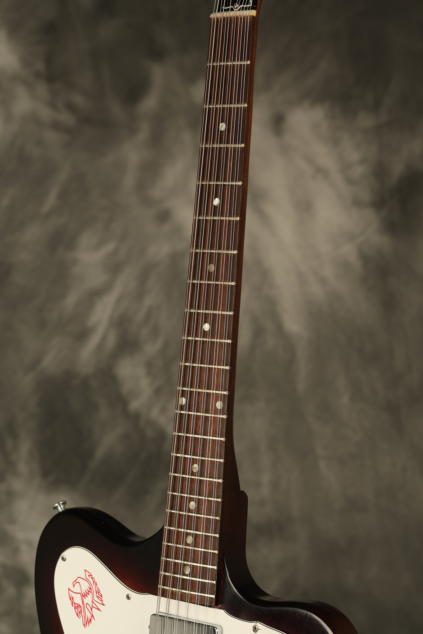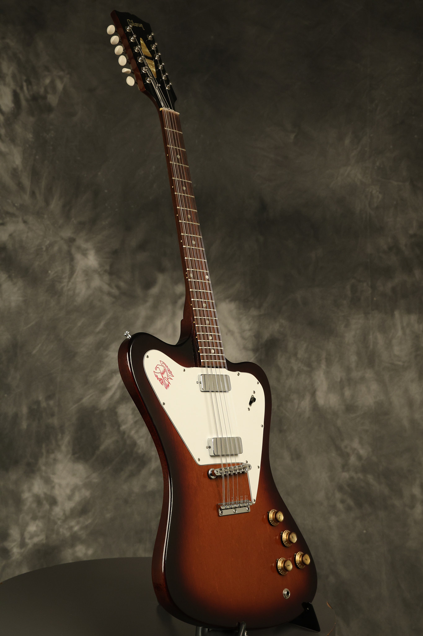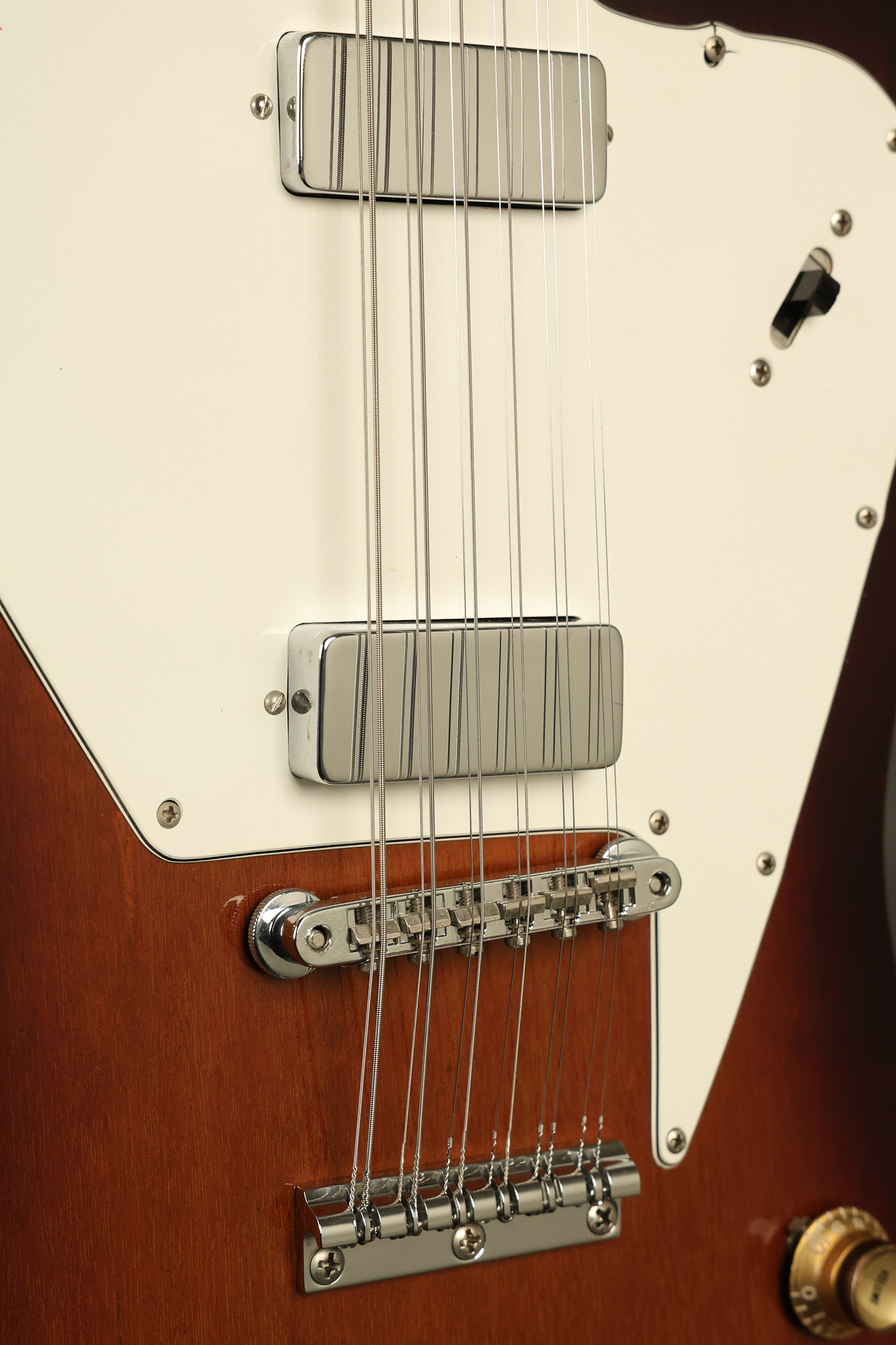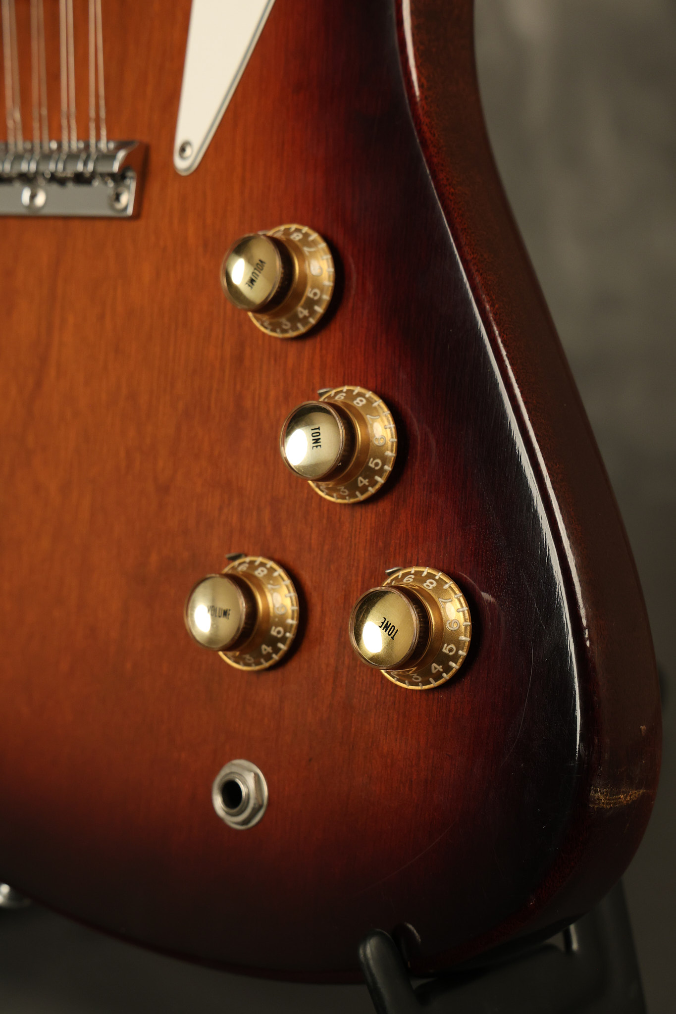 1966 Gibson non-reverse Firebird XII in its original Sunburst finish. It has a a great playing neck with great frets. It's all original and 100% complete along with its original hardshell case, hang tags and original cable. It's in very good condition with some nicks + dings and other cosmetic wear including a couple of tiny cracks in the pickguard around one of the screws. There is also a small hairline crack on the bottom edge of the body running over the back edge of the body towards the control cavity where the wood has the most shallow depth from the cavity wall to the edge of the body. It does not run over the top edge of the body and remains more of a cosmetic issue as the guitar itself remains structurally sound. All electronics work and sound great while all solder joints remain original and untampered with.