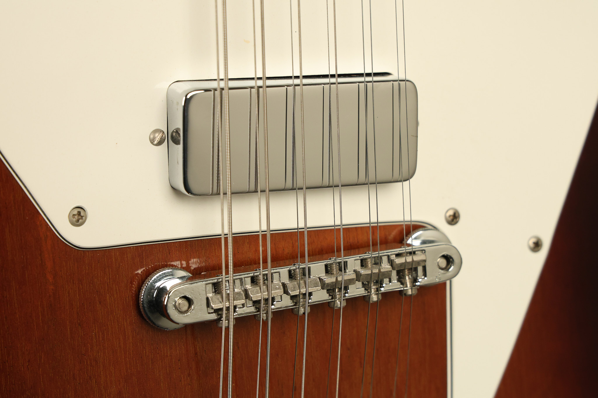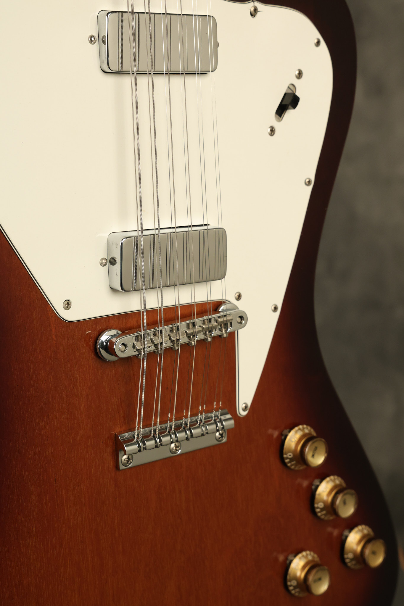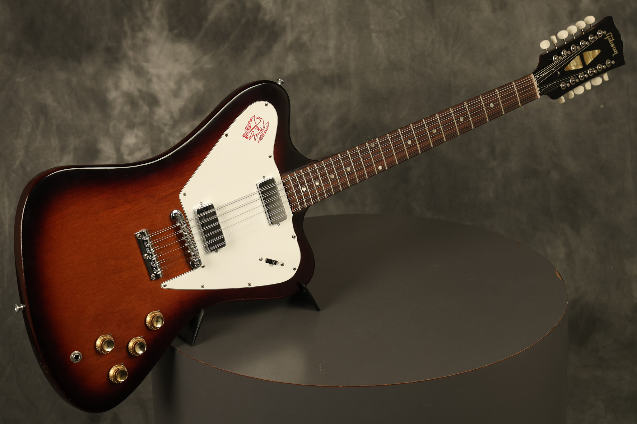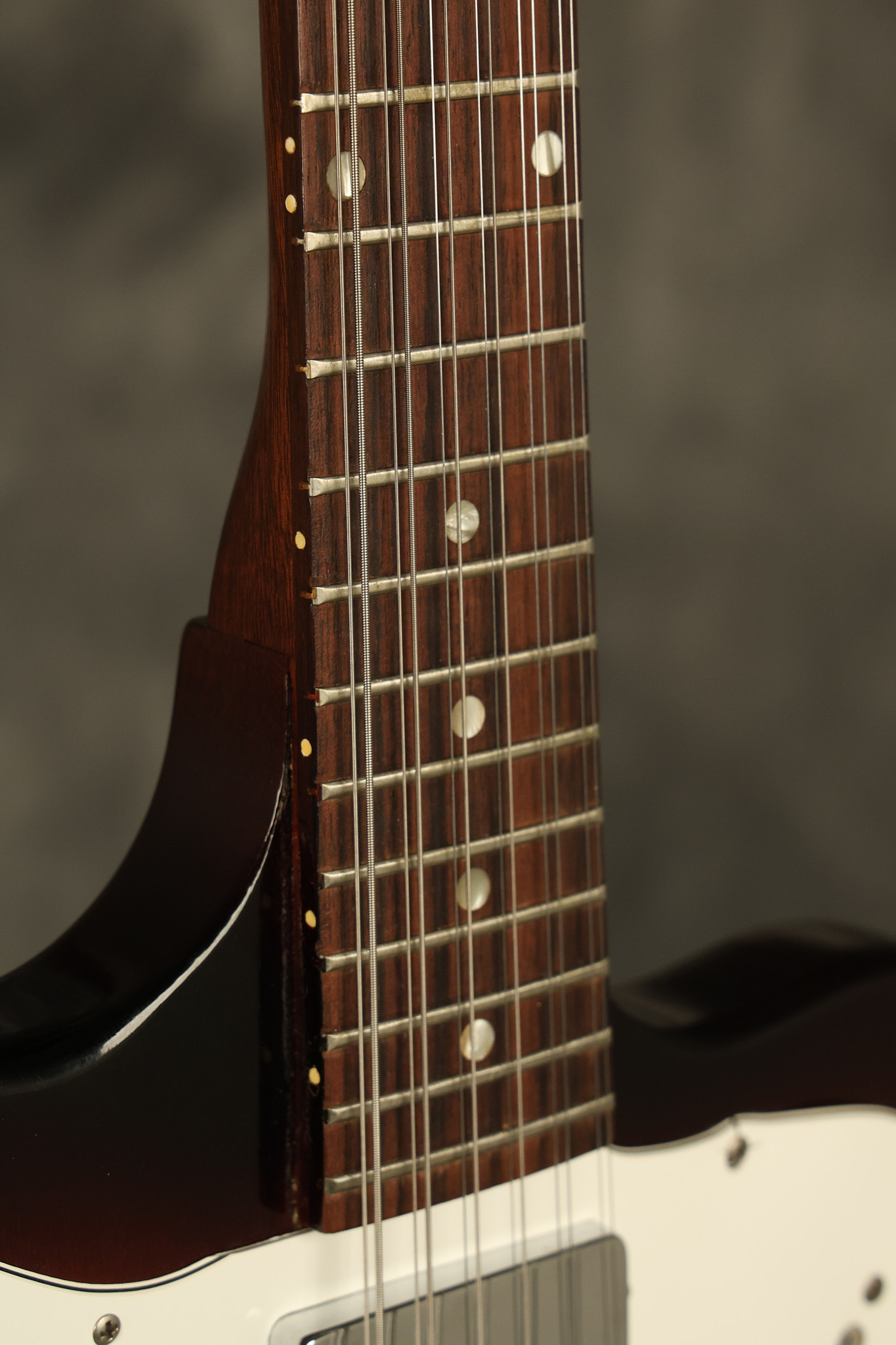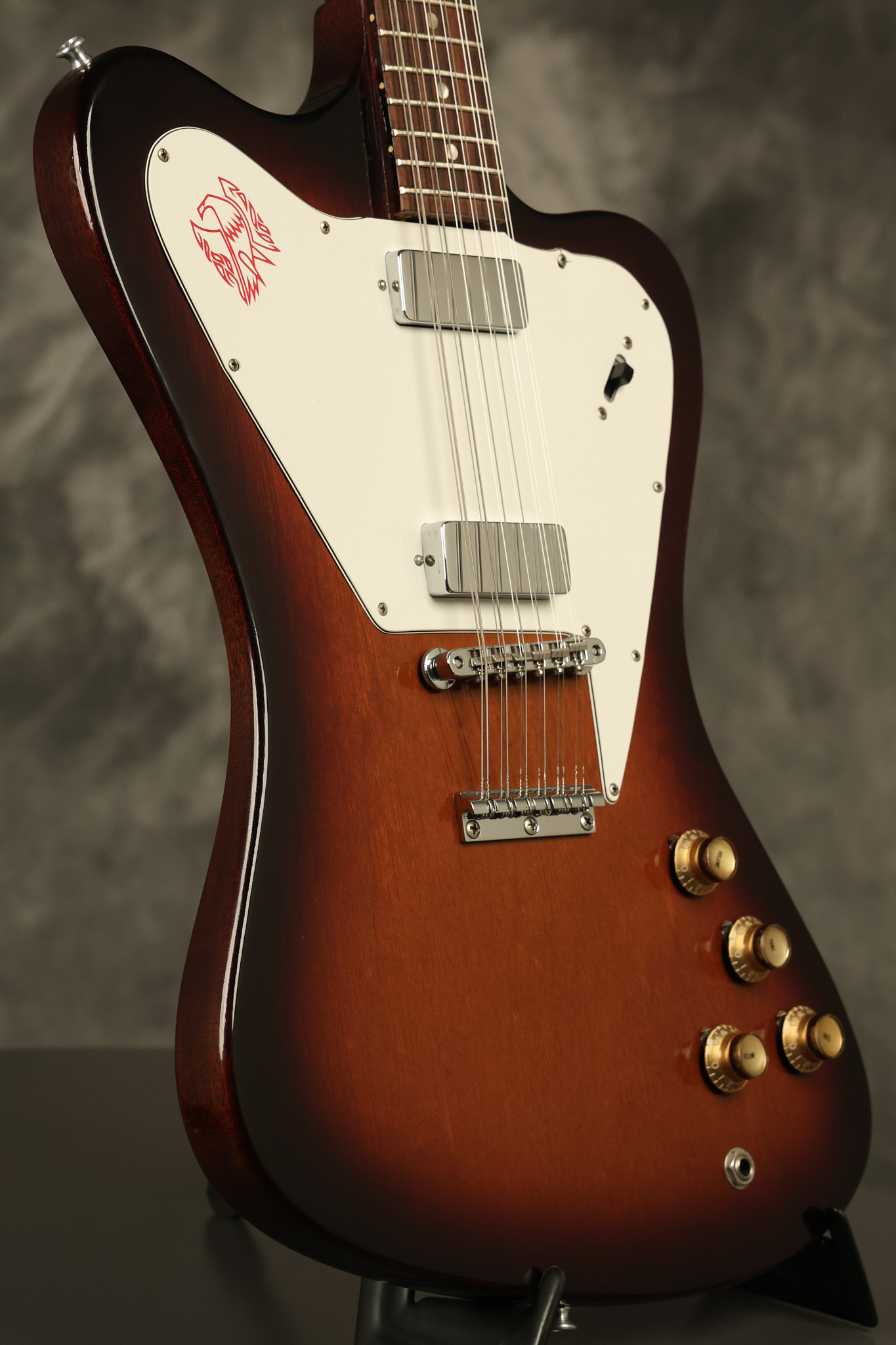 1966 Gibson non-reverse Firebird XII in its original Sunburst finish. It has a a great playing neck with great frets. It's all original and 100% complete along with its original hardshell case, hang tags and original cable. It's in very good condition with some nicks + dings and other cosmetic wear including a couple of tiny cracks in the pickguard around one of the screws. There is also a small hairline crack on the bottom edge of the body running over the back edge of the body towards the control cavity where the wood has the most shallow depth from the cavity wall to the edge of the body. It does not run over the top edge of the body and remains more of a cosmetic issue as the guitar itself remains structurally sound. All electronics work and sound great while all solder joints remain original and untampered with.