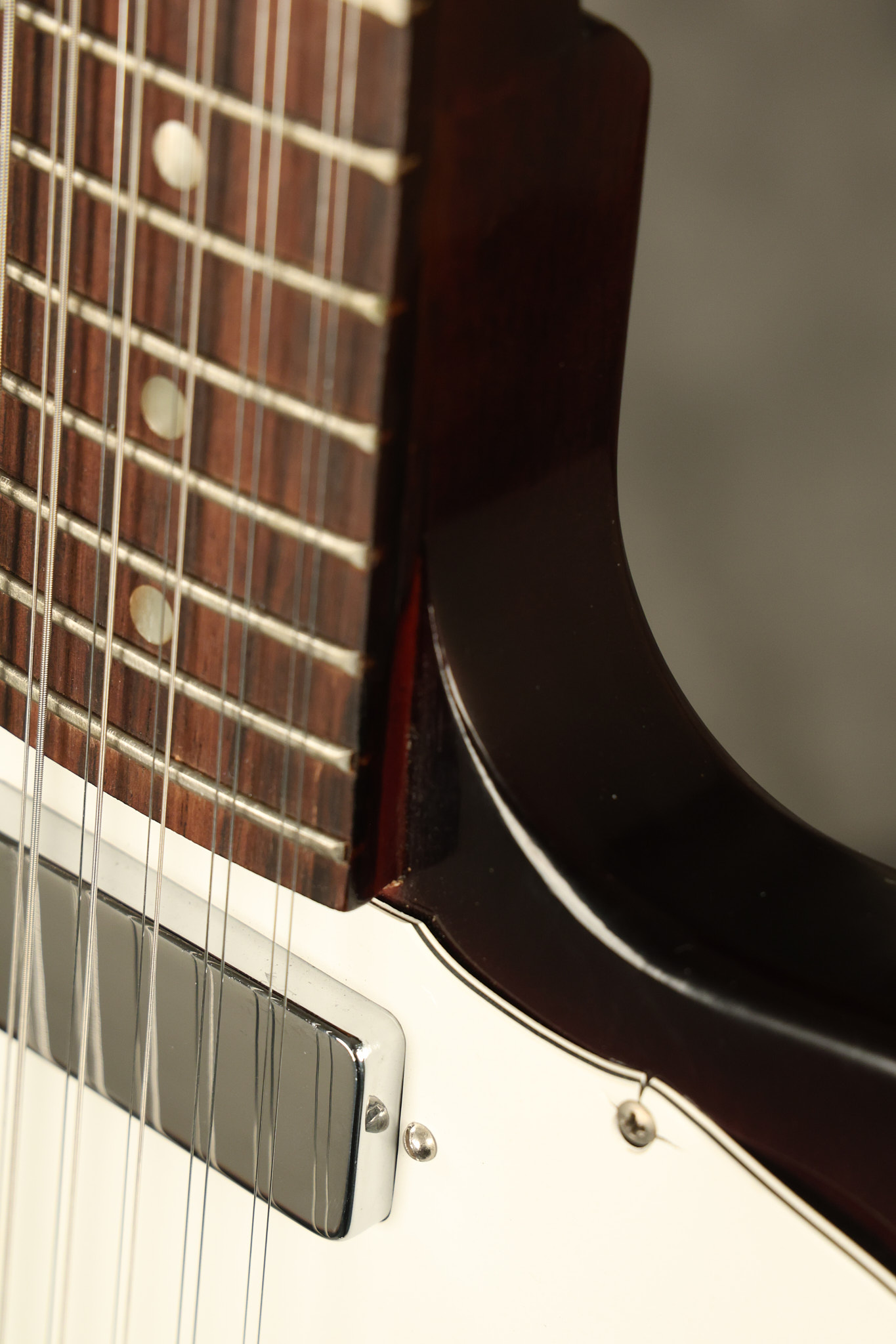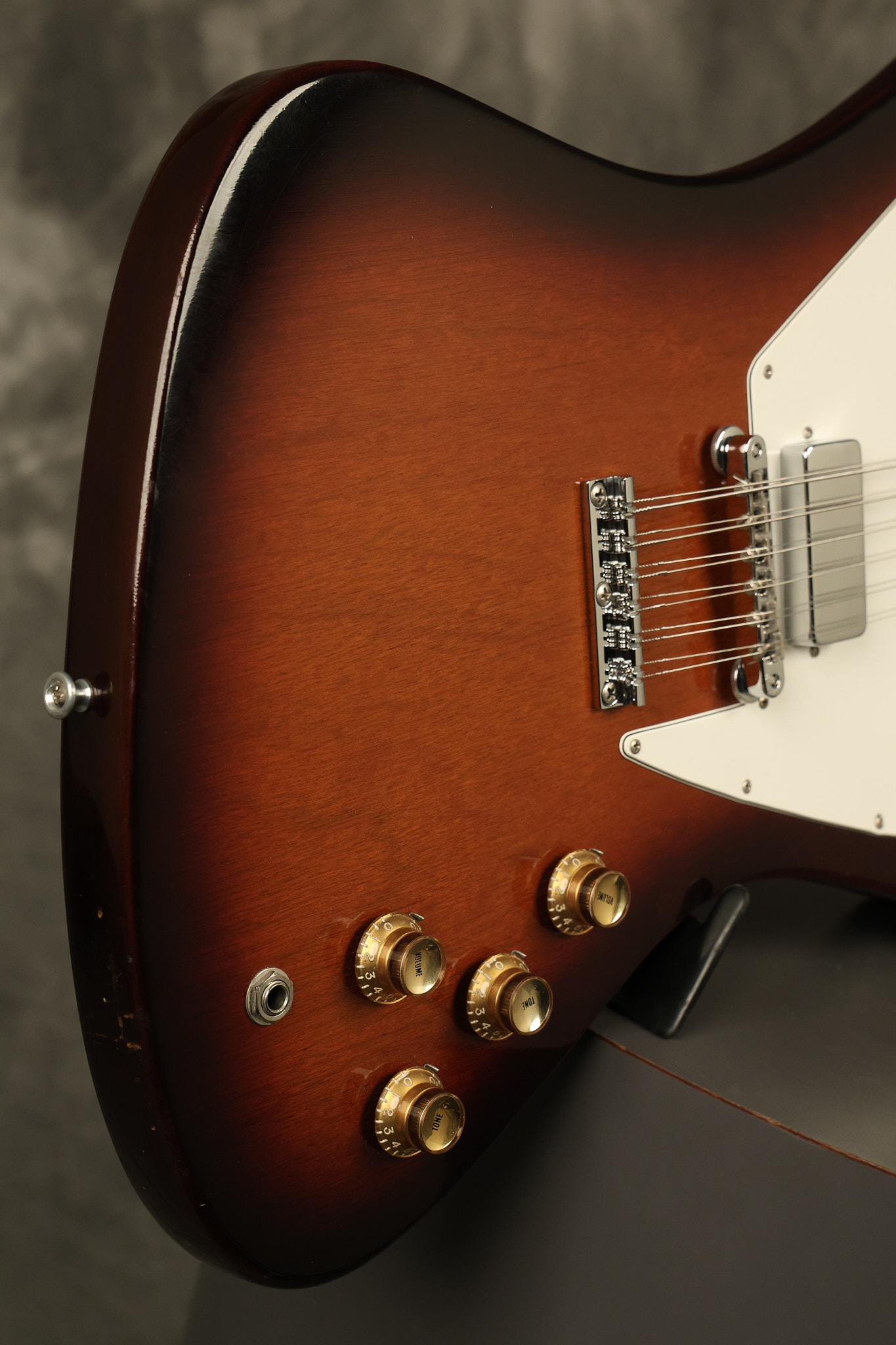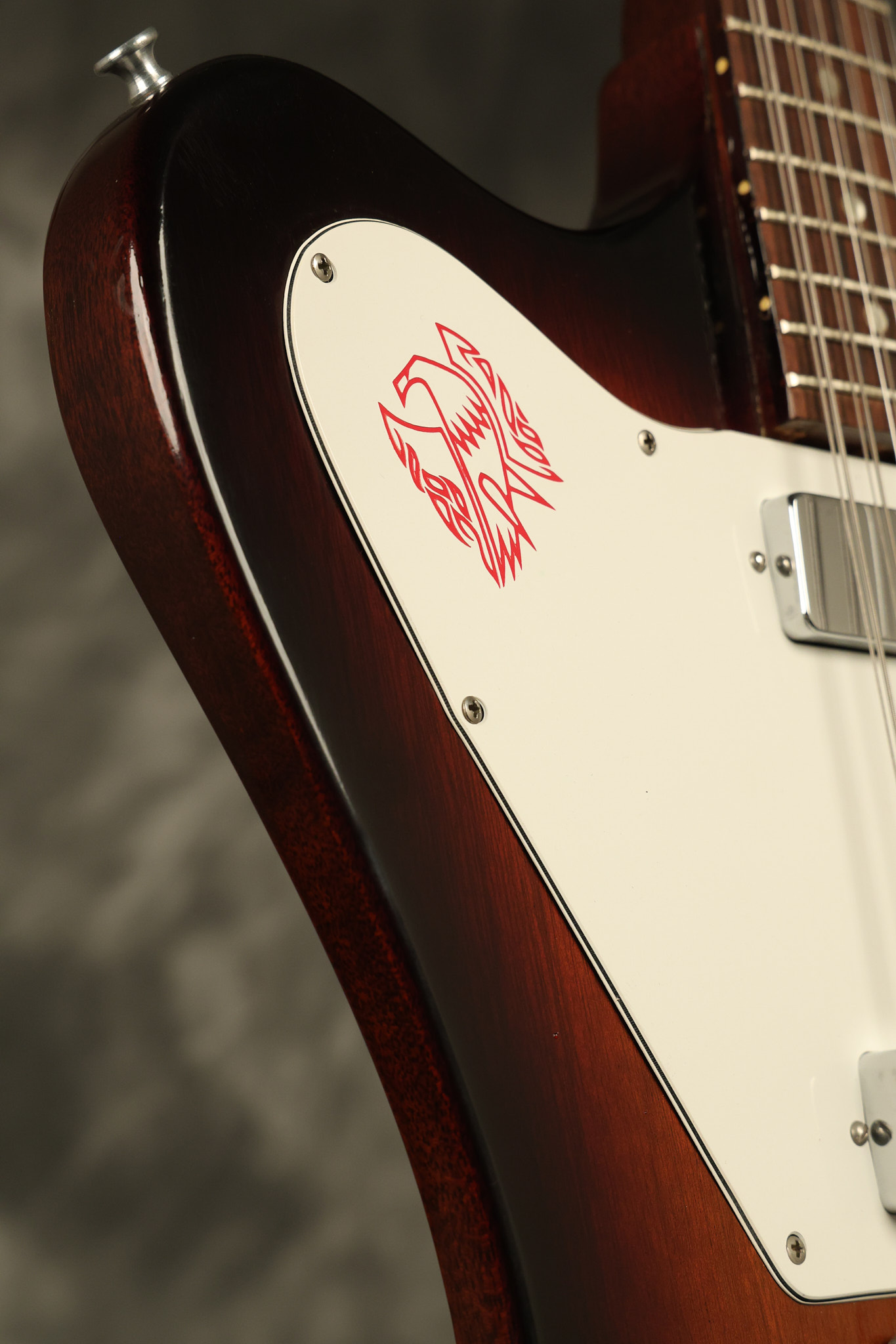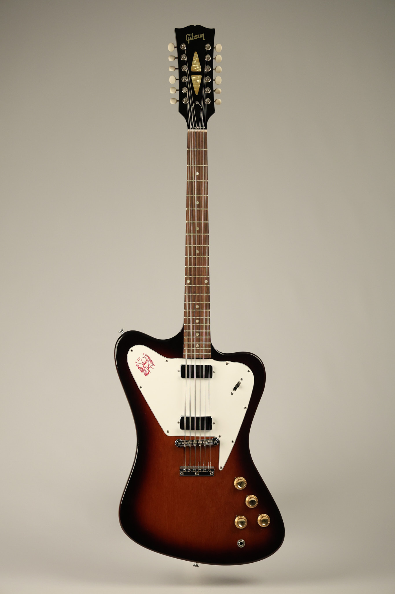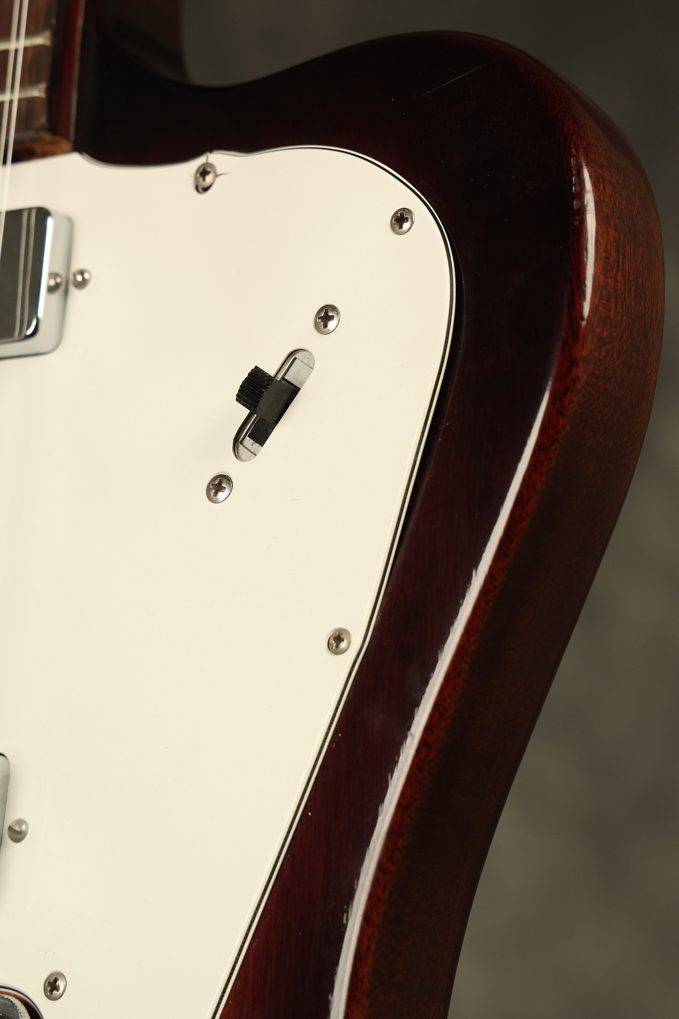 1966 Gibson non-reverse Firebird XII in its original Sunburst finish. It has a a great playing neck with great frets. It's all original and 100% complete along with its original hardshell case, hang tags and original cable. It's in very good condition with some nicks + dings and other cosmetic wear including a couple of tiny cracks in the pickguard around one of the screws. There is also a small hairline crack on the bottom edge of the body running over the back edge of the body towards the control cavity where the wood has the most shallow depth from the cavity wall to the edge of the body. It does not run over the top edge of the body and remains more of a cosmetic issue as the guitar itself remains structurally sound. All electronics work and sound great while all solder joints remain original and untampered with.