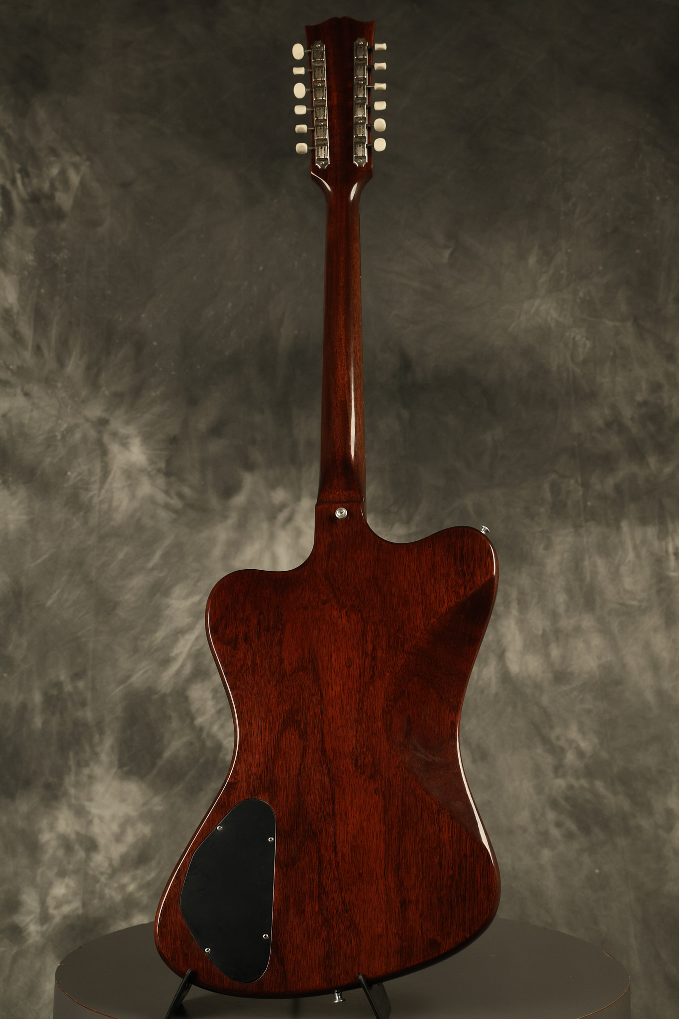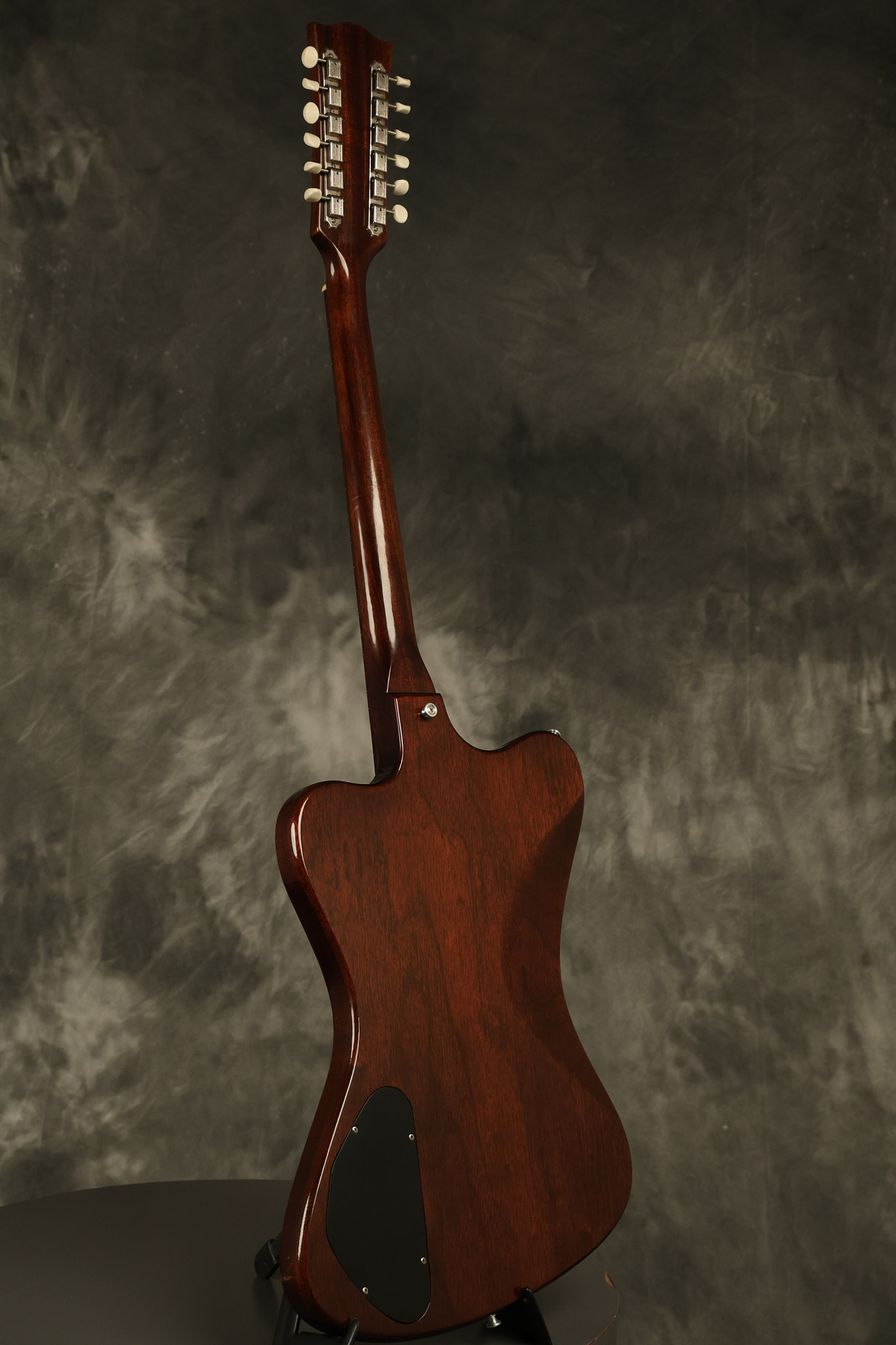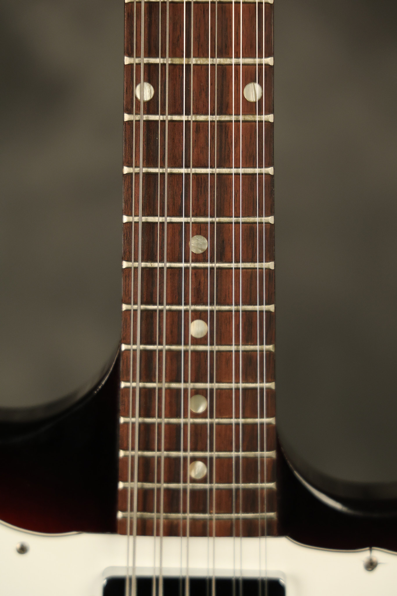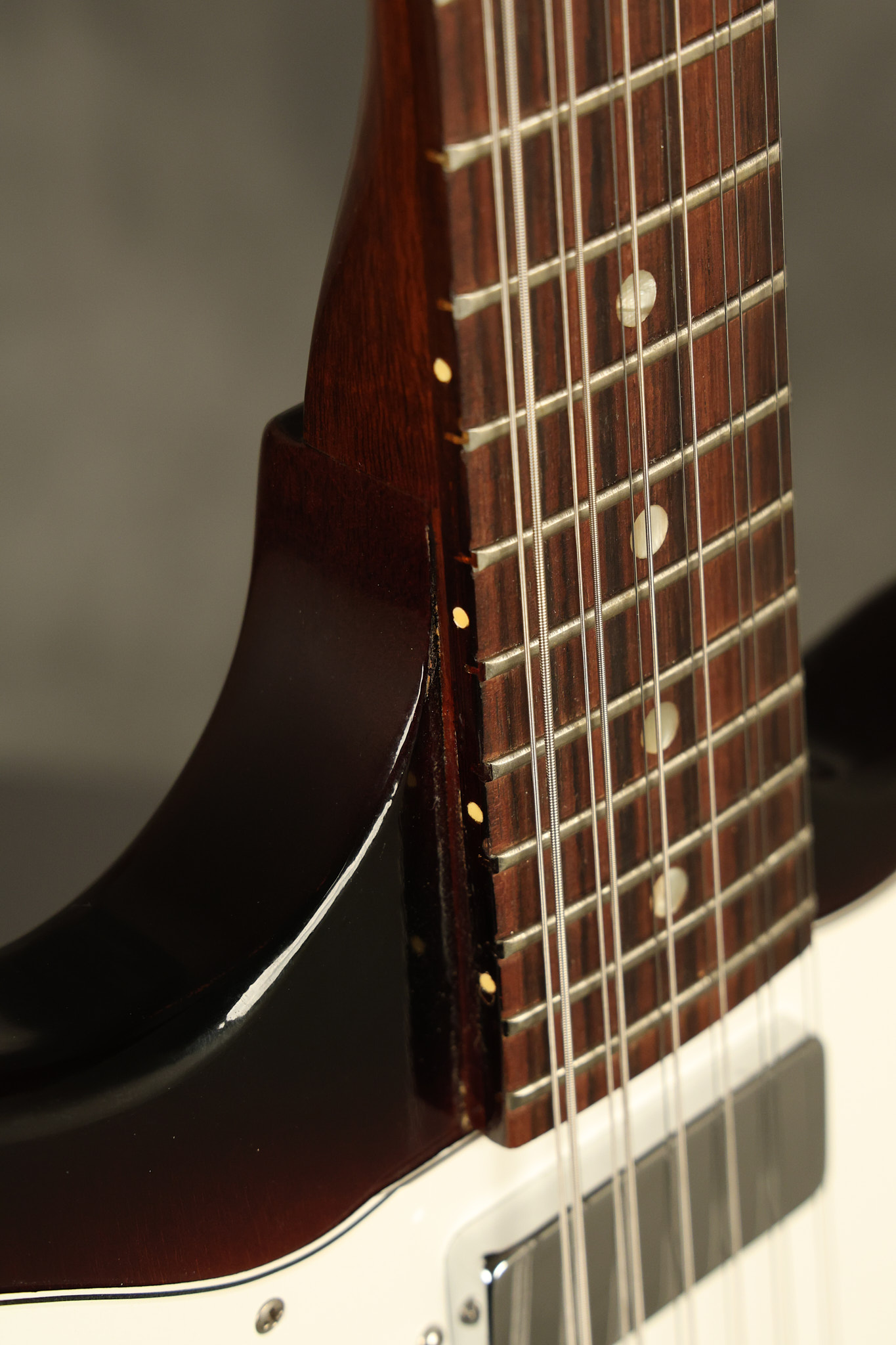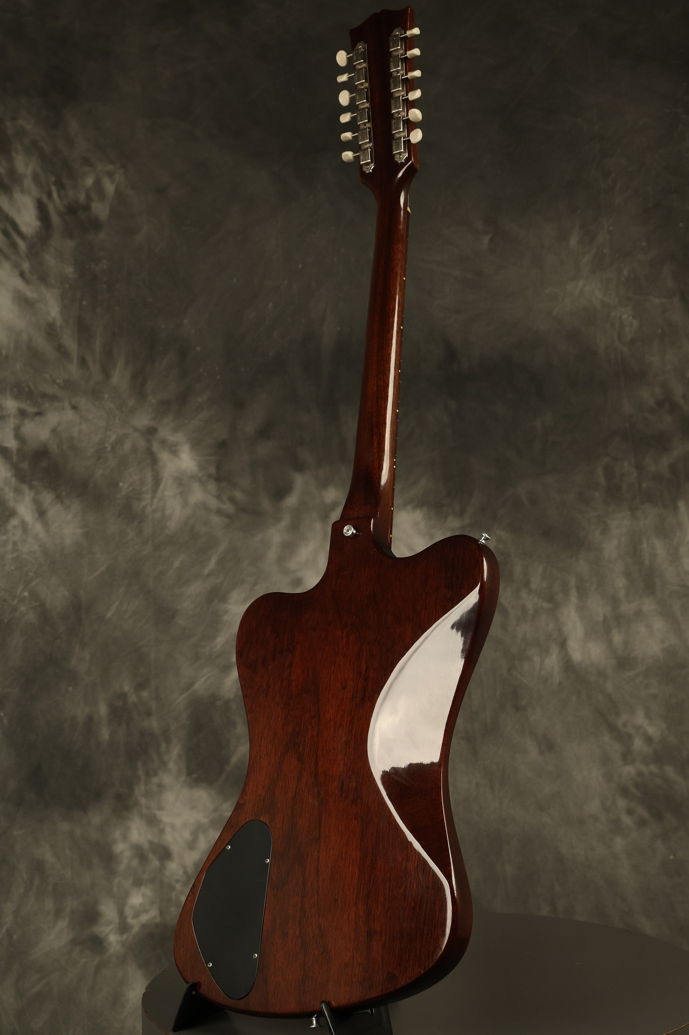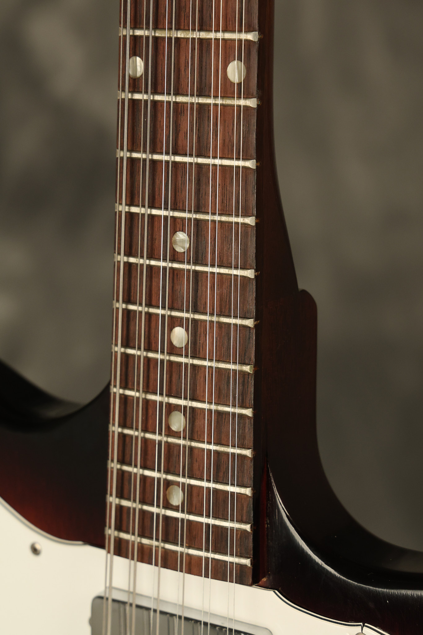 1966 Gibson non-reverse Firebird XII in its original Sunburst finish. It has a a great playing neck with great frets. It's all original and 100% complete along with its original hardshell case, hang tags and original cable. It's in very good condition with some nicks + dings and other cosmetic wear including a couple of tiny cracks in the pickguard around one of the screws. There is also a small hairline crack on the bottom edge of the body running over the back edge of the body towards the control cavity where the wood has the most shallow depth from the cavity wall to the edge of the body. It does not run over the top edge of the body and remains more of a cosmetic issue as the guitar itself remains structurally sound. All electronics work and sound great while all solder joints remain original and untampered with.