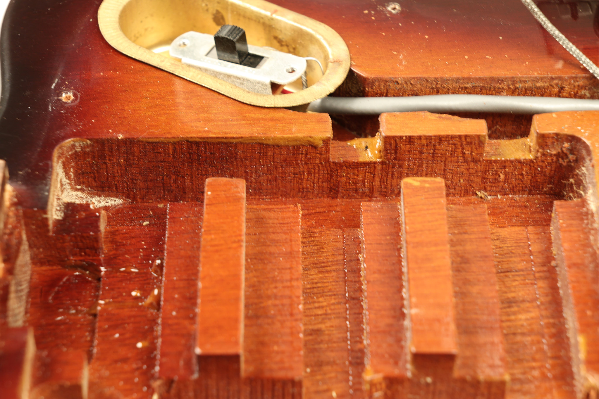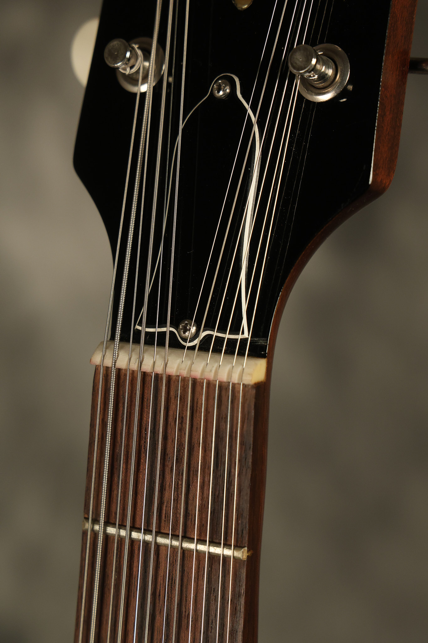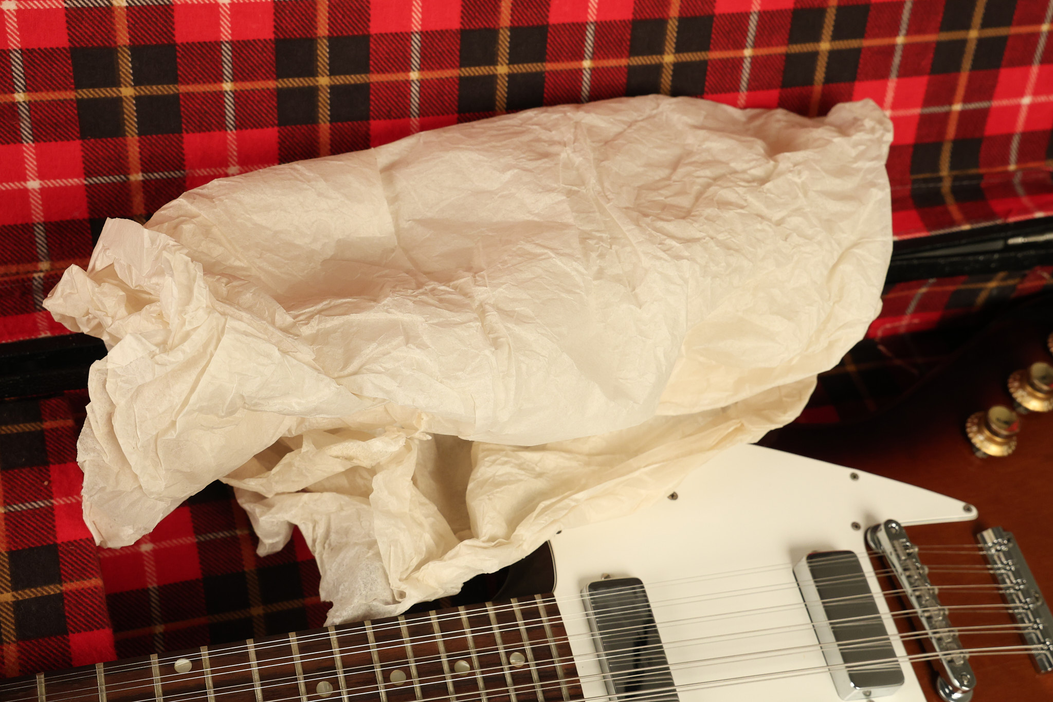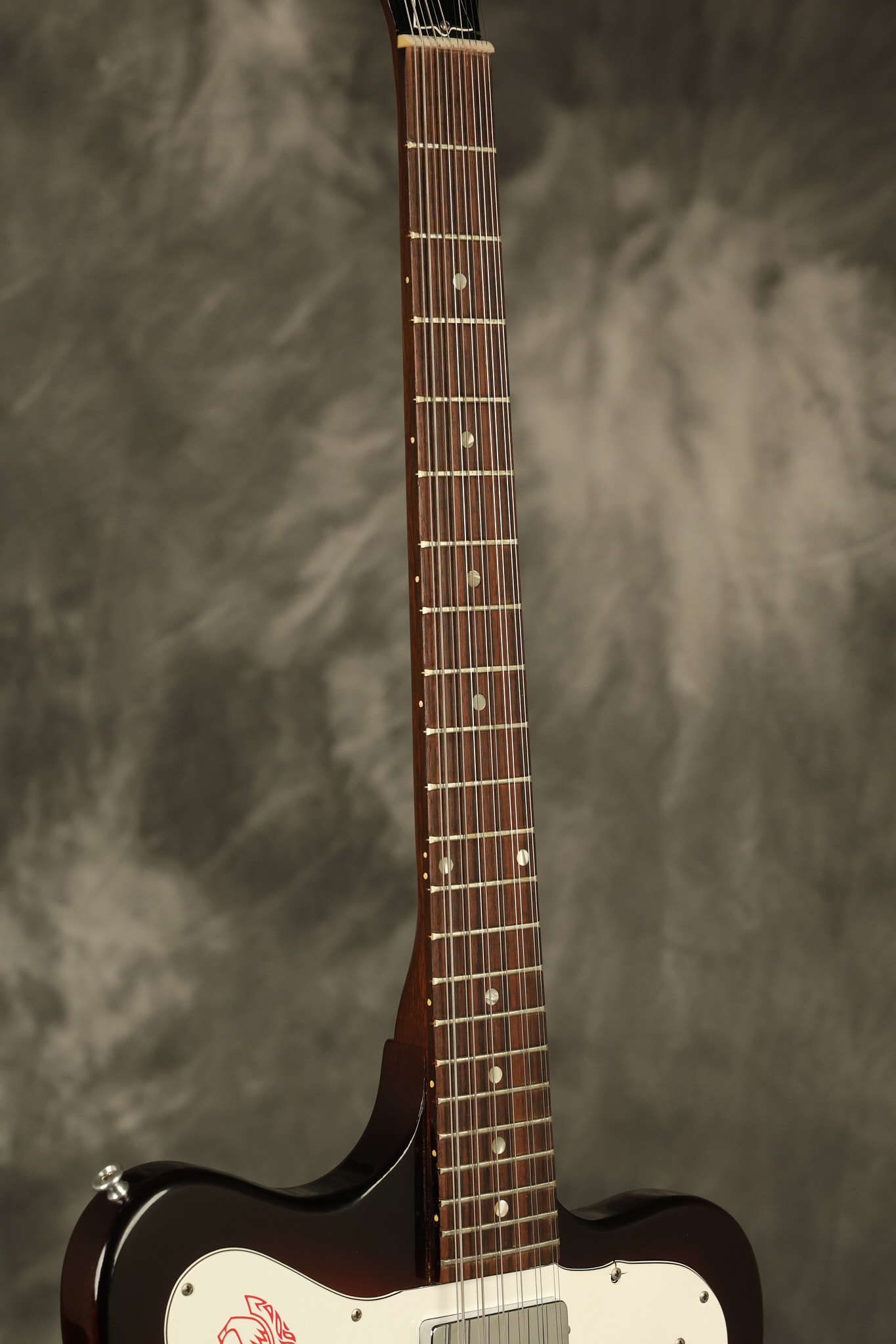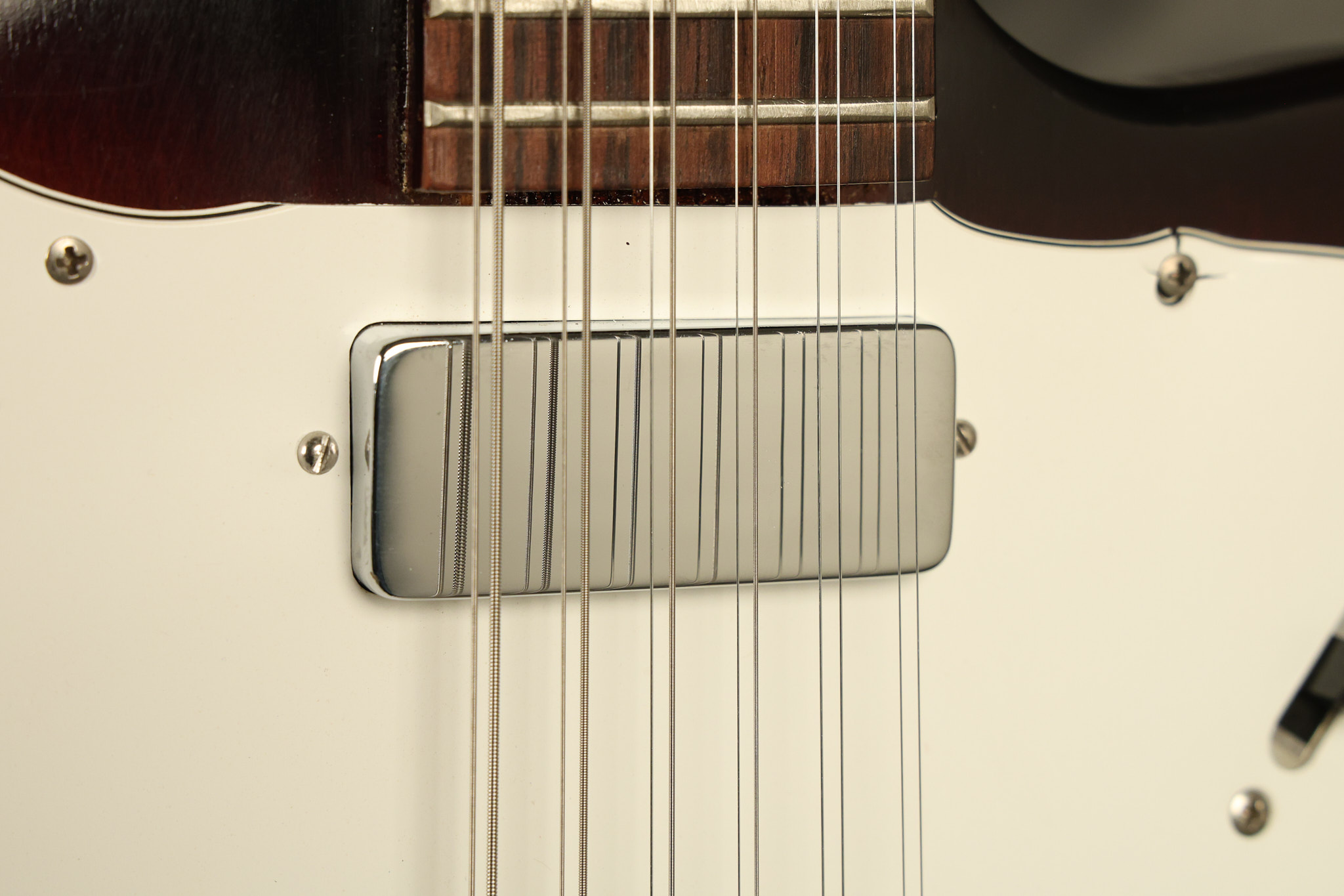 1966 Gibson non-reverse Firebird XII in its original Sunburst finish. It has a a great playing neck with great frets. It's all original and 100% complete along with its original hardshell case, hang tags and original cable. It's in very good condition with some nicks + dings and other cosmetic wear including a couple of tiny cracks in the pickguard around one of the screws. There is also a small hairline crack on the bottom edge of the body running over the back edge of the body towards the control cavity where the wood has the most shallow depth from the cavity wall to the edge of the body. It does not run over the top edge of the body and remains more of a cosmetic issue as the guitar itself remains structurally sound. All electronics work and sound great while all solder joints remain original and untampered with.