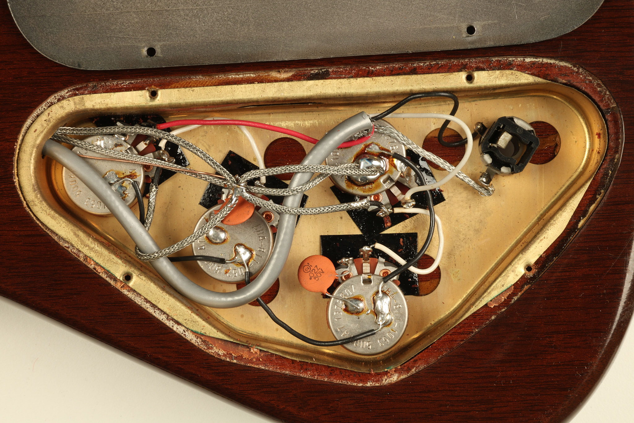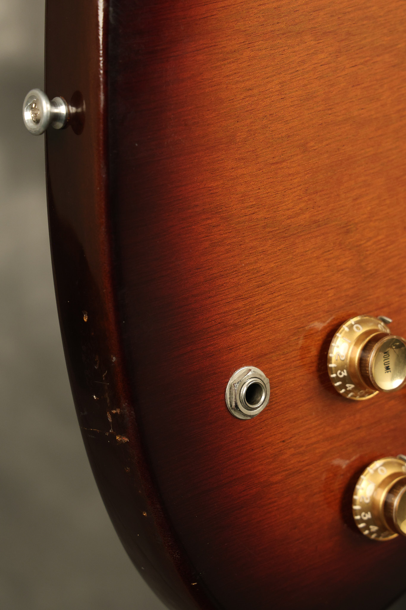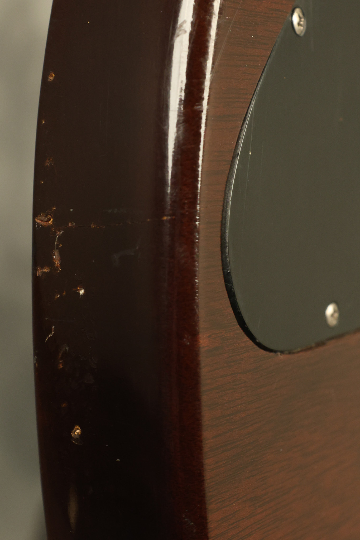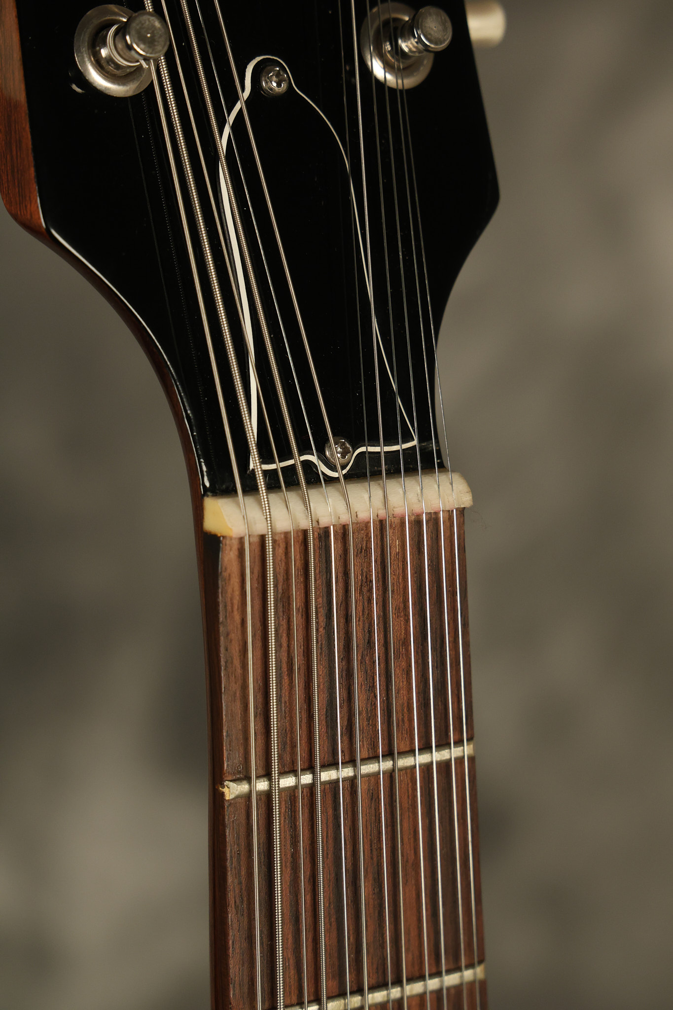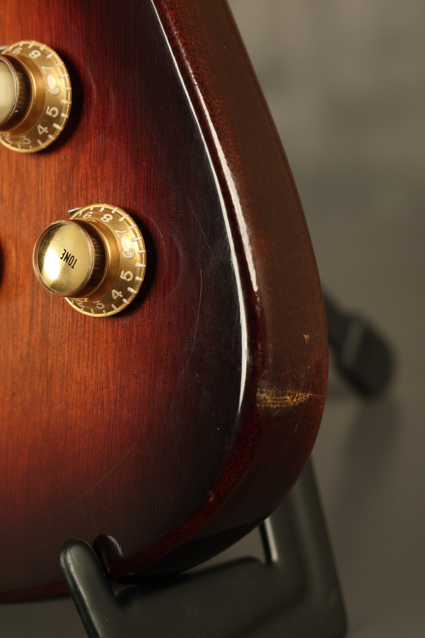 1966 Gibson non-reverse Firebird XII in its original Sunburst finish. It has a a great playing neck with great frets. It's all original and 100% complete along with its original hardshell case, hang tags and original cable. It's in very good condition with some nicks + dings and other cosmetic wear including a couple of tiny cracks in the pickguard around one of the screws. There is also a small hairline crack on the bottom edge of the body running over the back edge of the body towards the control cavity where the wood has the most shallow depth from the cavity wall to the edge of the body. It does not run over the top edge of the body and remains more of a cosmetic issue as the guitar itself remains structurally sound. All electronics work and sound great while all solder joints remain original and untampered with.