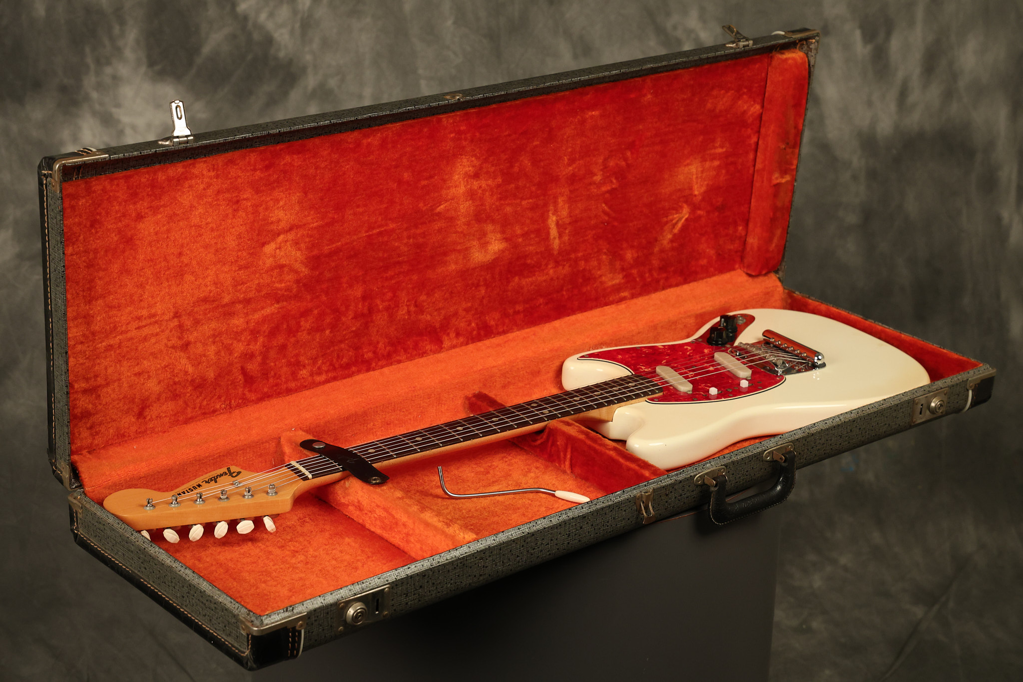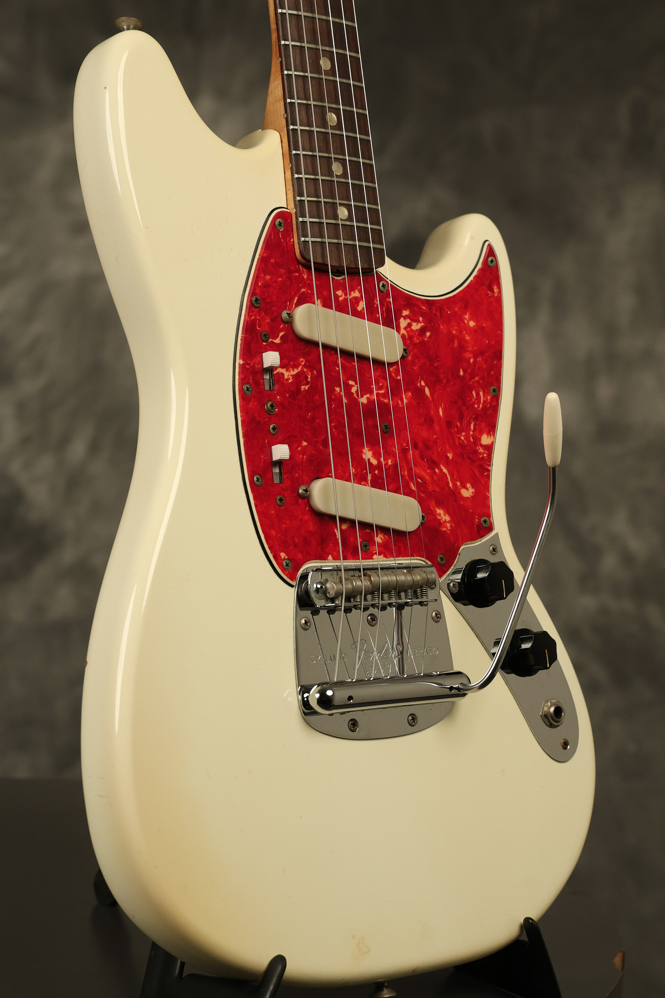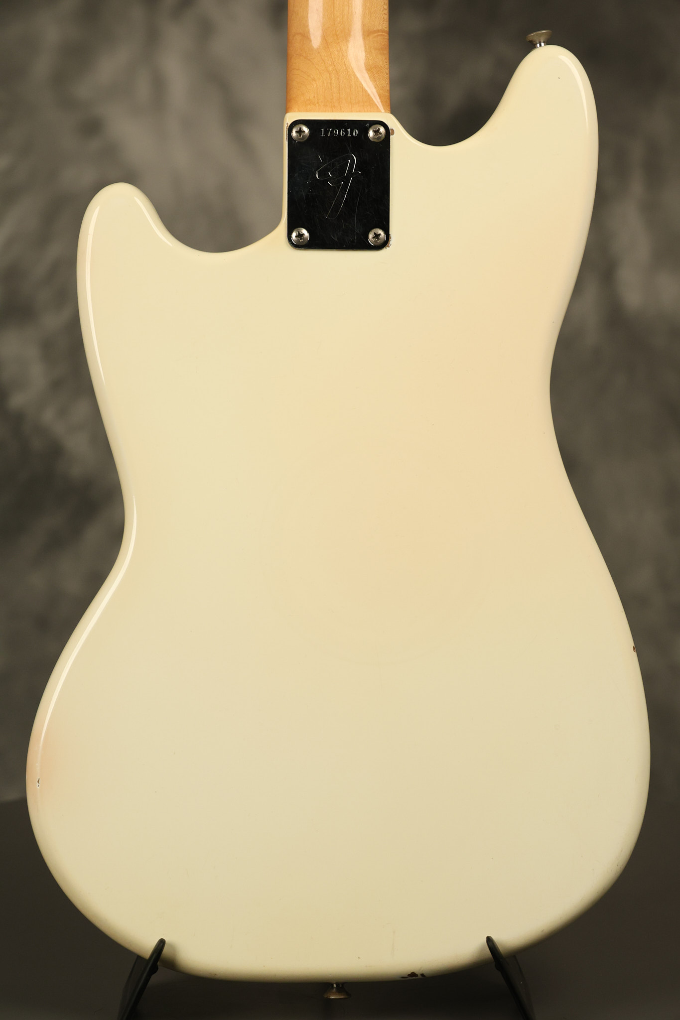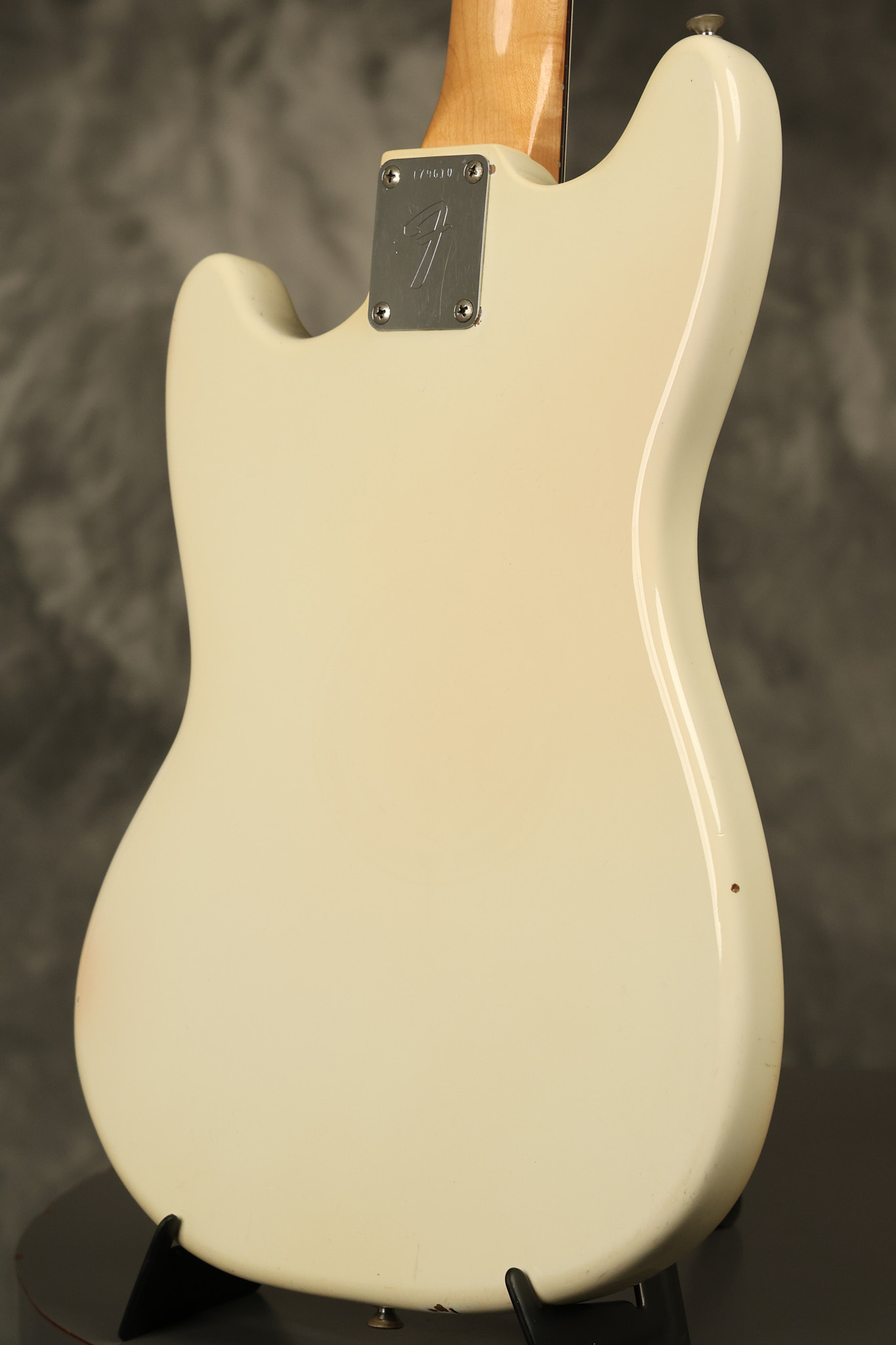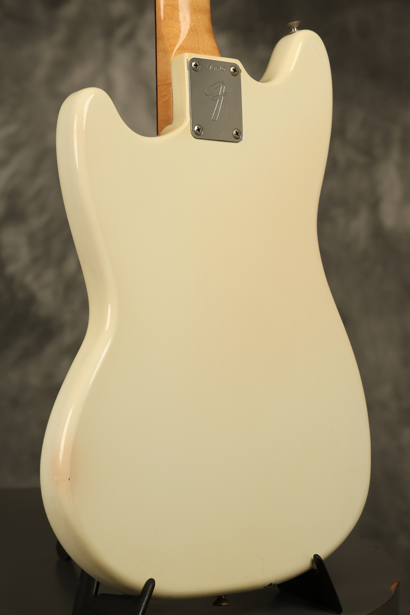 1967 Fender Mustang in its original White finish. It has a great playing neck with good frets. It includes the original tremolo arm and original hardshell case. It's in very good condition with some minor nicks + dings, finish checking on the headstock and other minor cosmetic wear including a very faint ring of discoloration on the back of the body which is barely visible. There is a small beveled washer in one of the screw holes for one of the switches where the hole was too wide for the screw. The guitar itself remains structurally sound with no cracks, breaks or repairs. All electronics work and sound great.