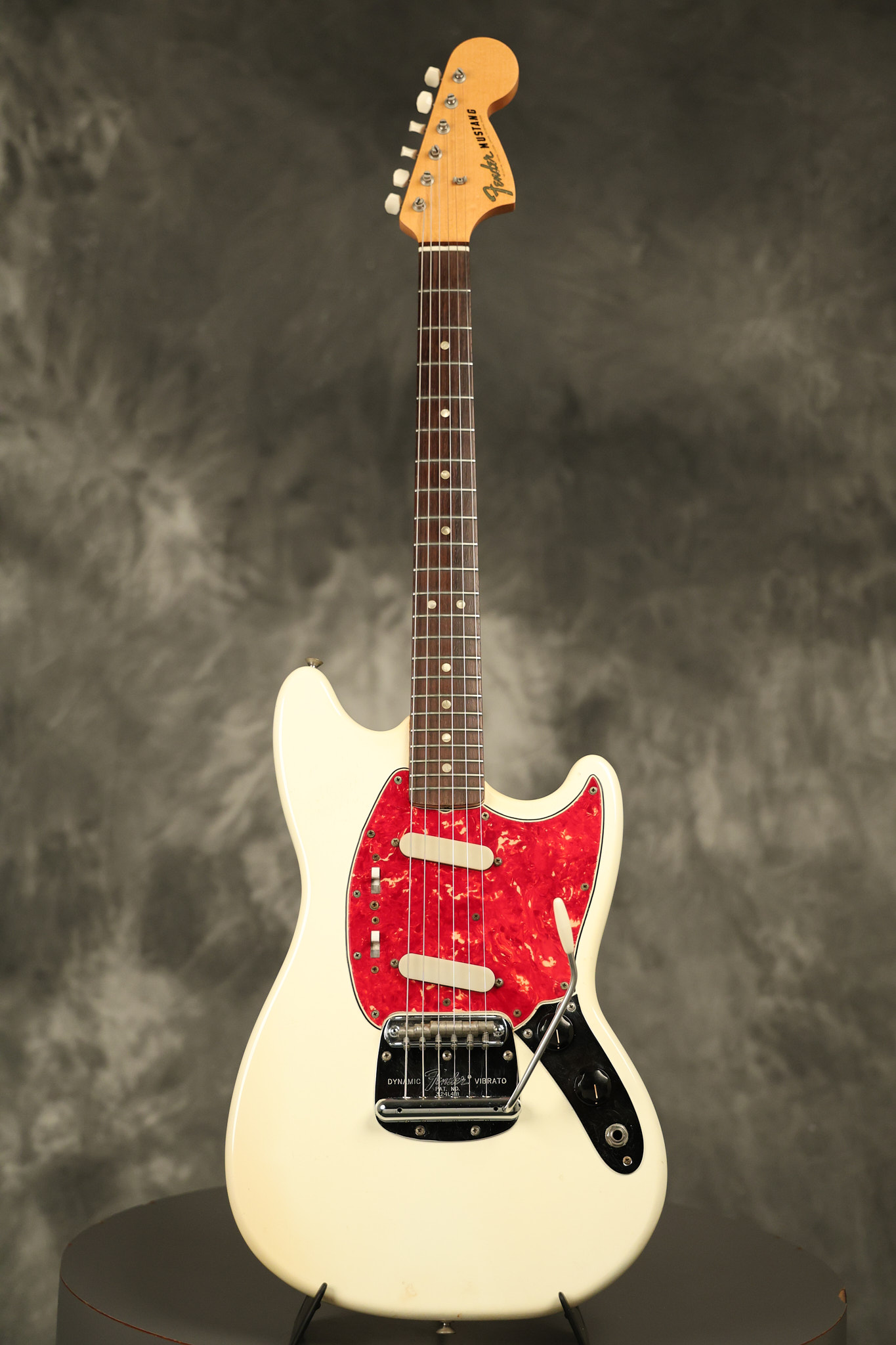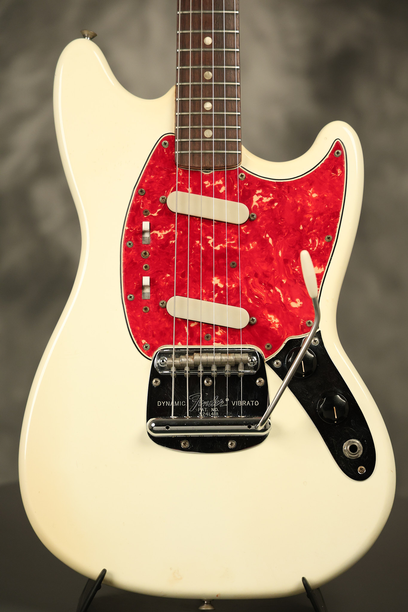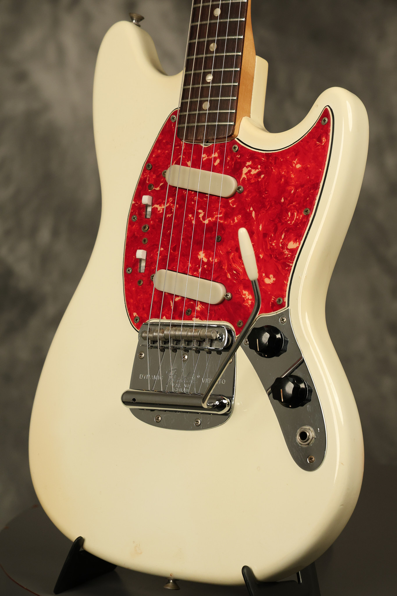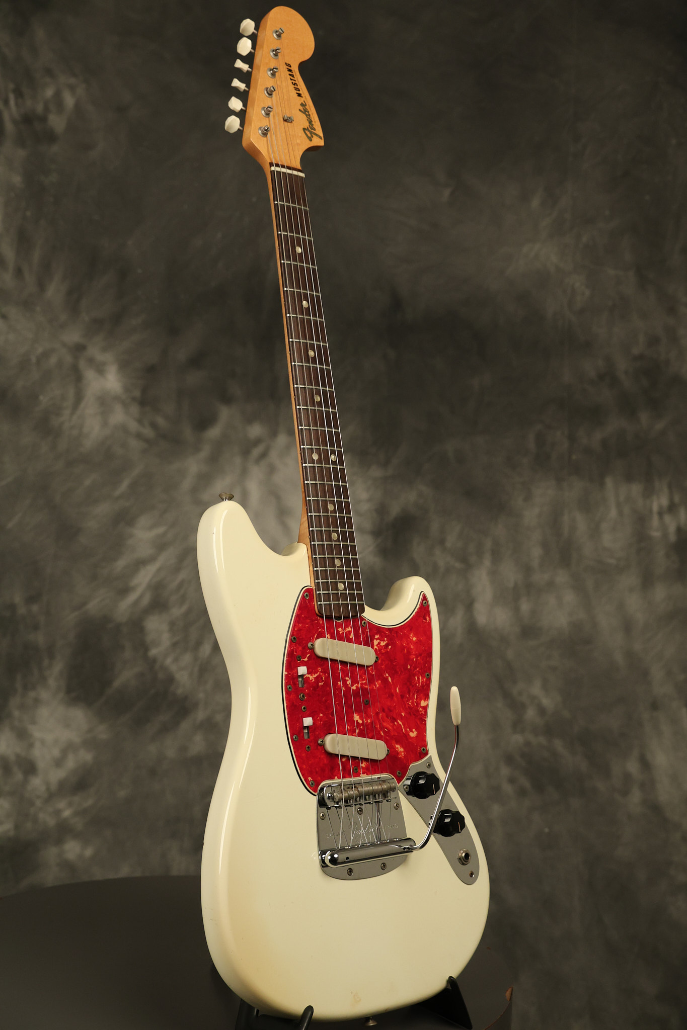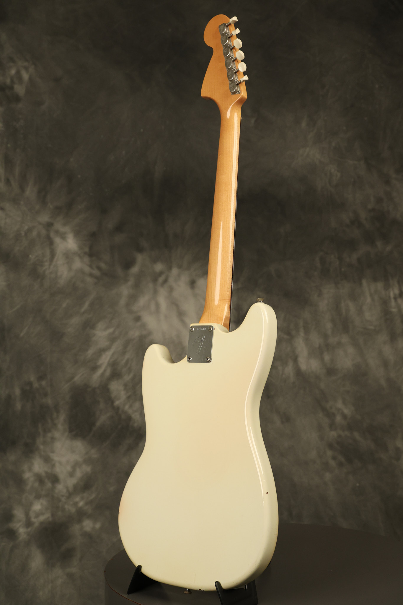 1967 Fender Mustang in its original White finish. It has a great playing neck with good frets. It includes the original tremolo arm and original hardshell case. It's in very good condition with some minor nicks + dings, finish checking on the headstock and other minor cosmetic wear including a very faint ring of discoloration on the back of the body which is barely visible. There is a small beveled washer in one of the screw holes for one of the switches where the hole was too wide for the screw. The guitar itself remains structurally sound with no cracks, breaks or repairs. All electronics work and sound great.