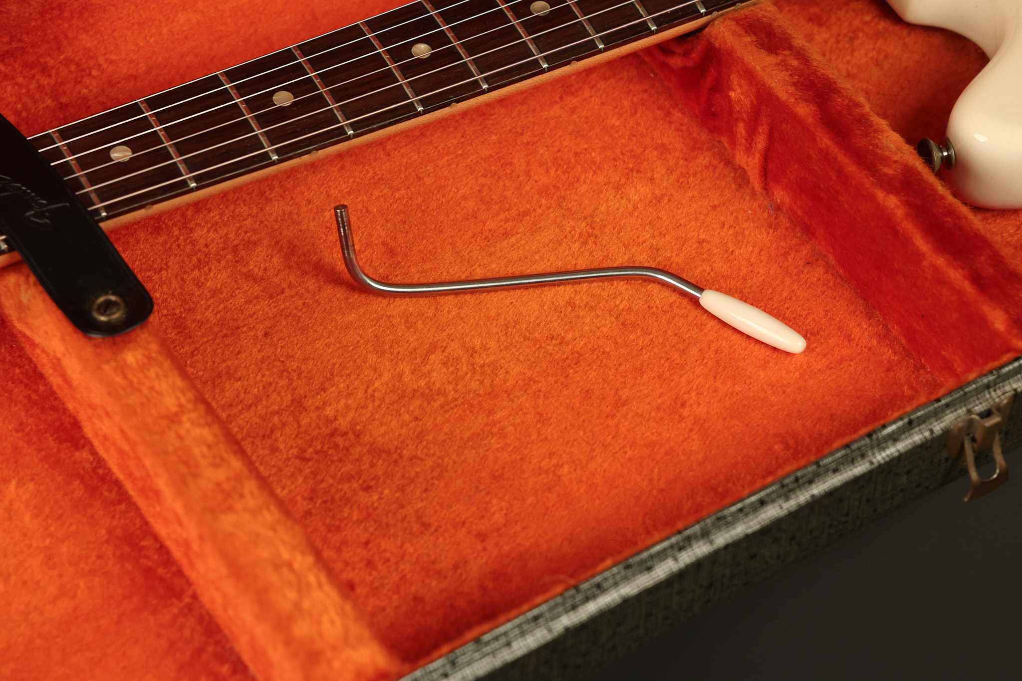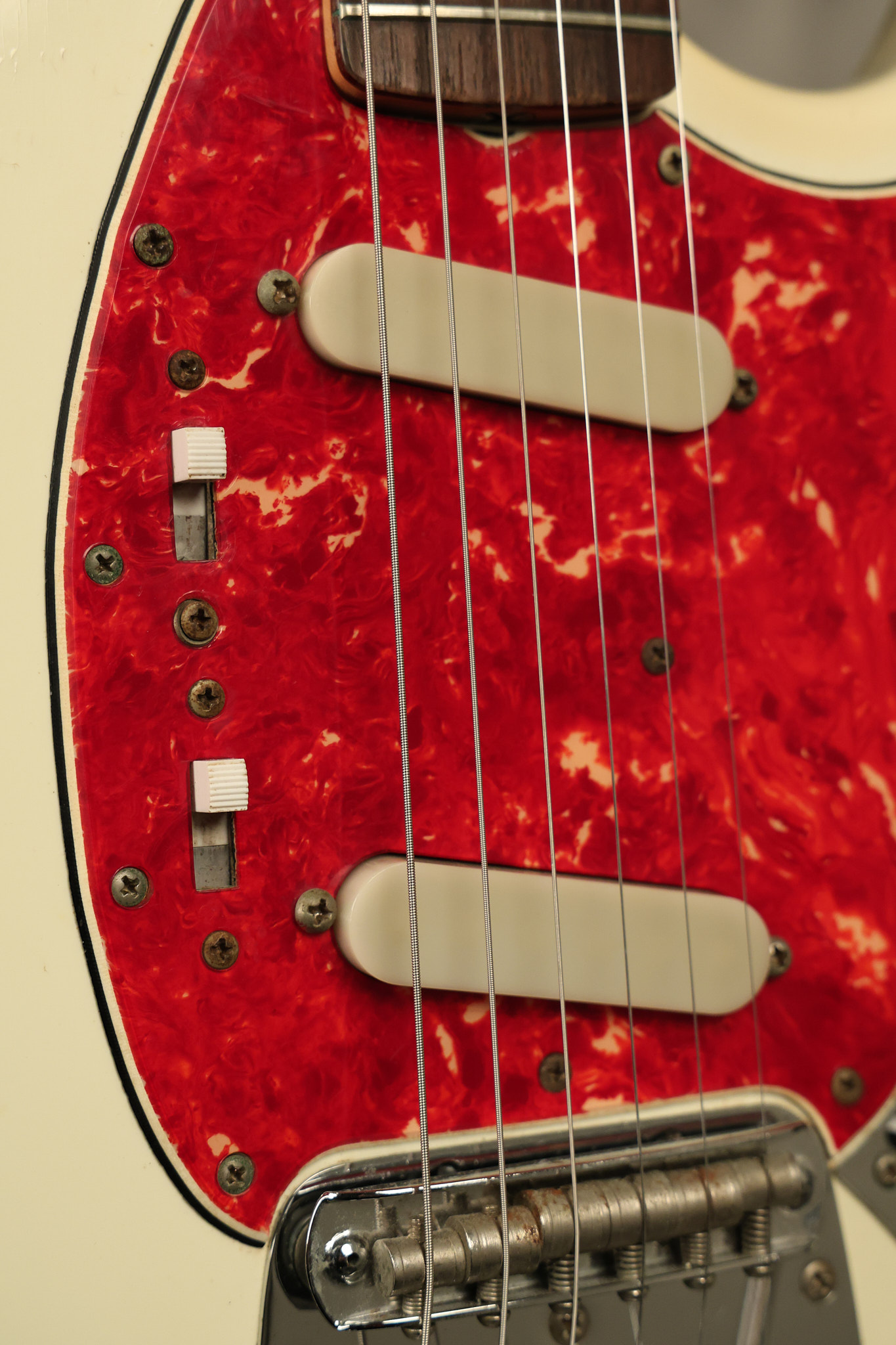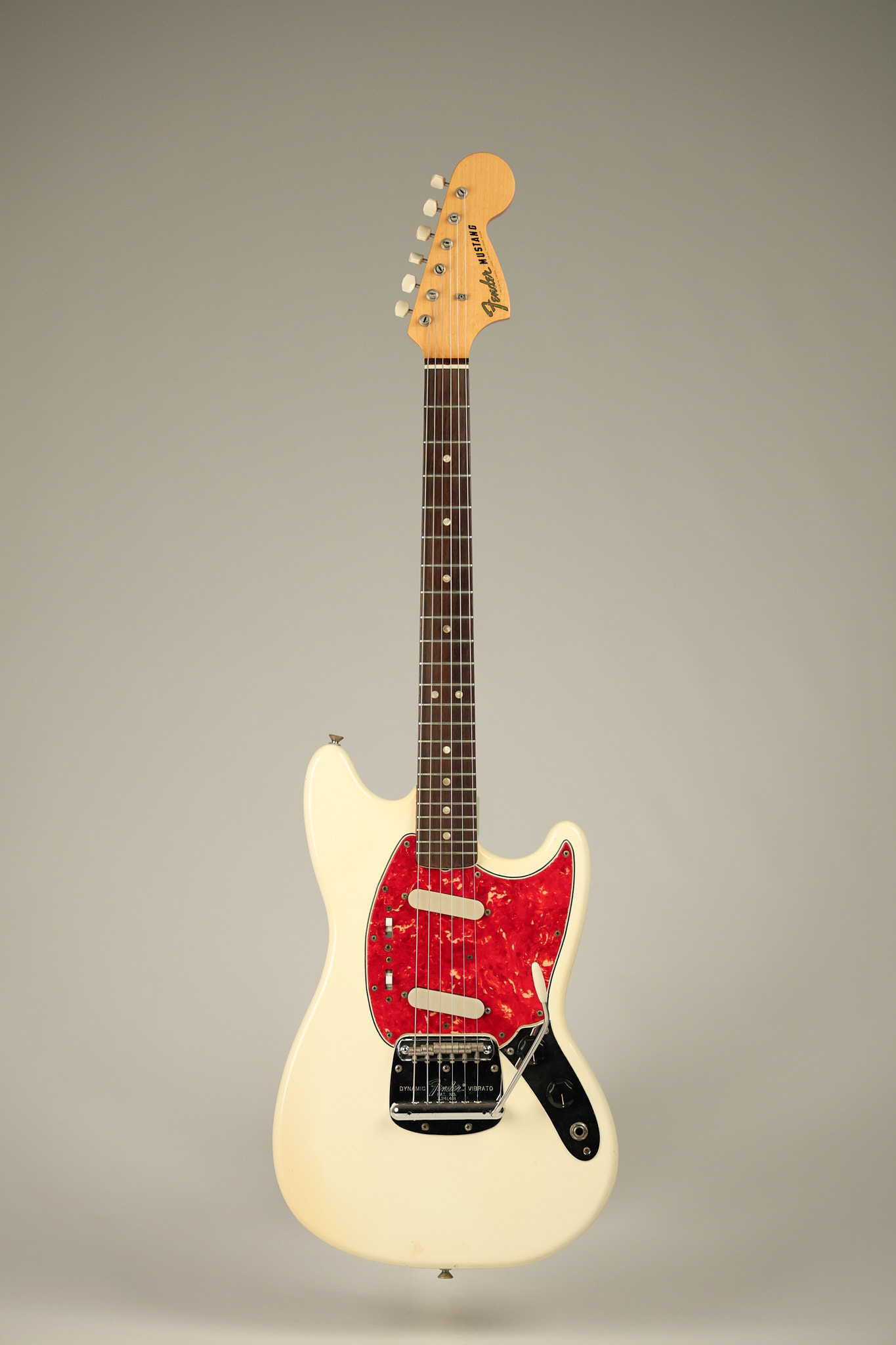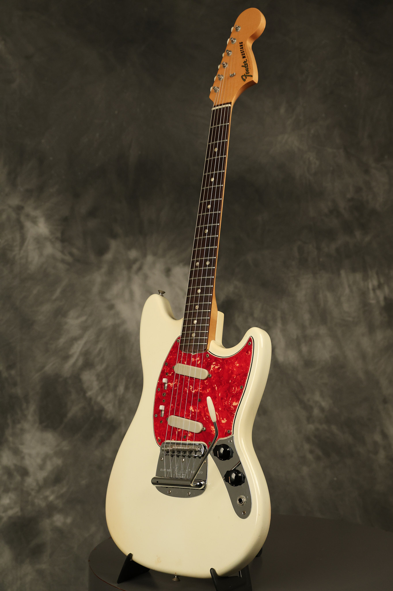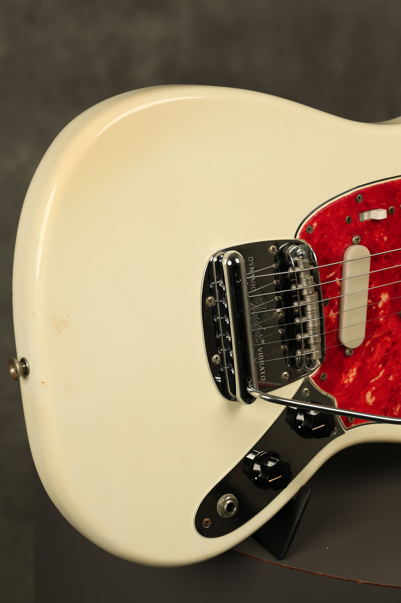 1967 Fender Mustang in its original White finish. It has a great playing neck with good frets. It includes the original tremolo arm and original hardshell case. It's in very good condition with some minor nicks + dings, finish checking on the headstock and other minor cosmetic wear including a very faint ring of discoloration on the back of the body which is barely visible. There is a small beveled washer in one of the screw holes for one of the switches where the hole was too wide for the screw. The guitar itself remains structurally sound with no cracks, breaks or repairs. All electronics work and sound great.