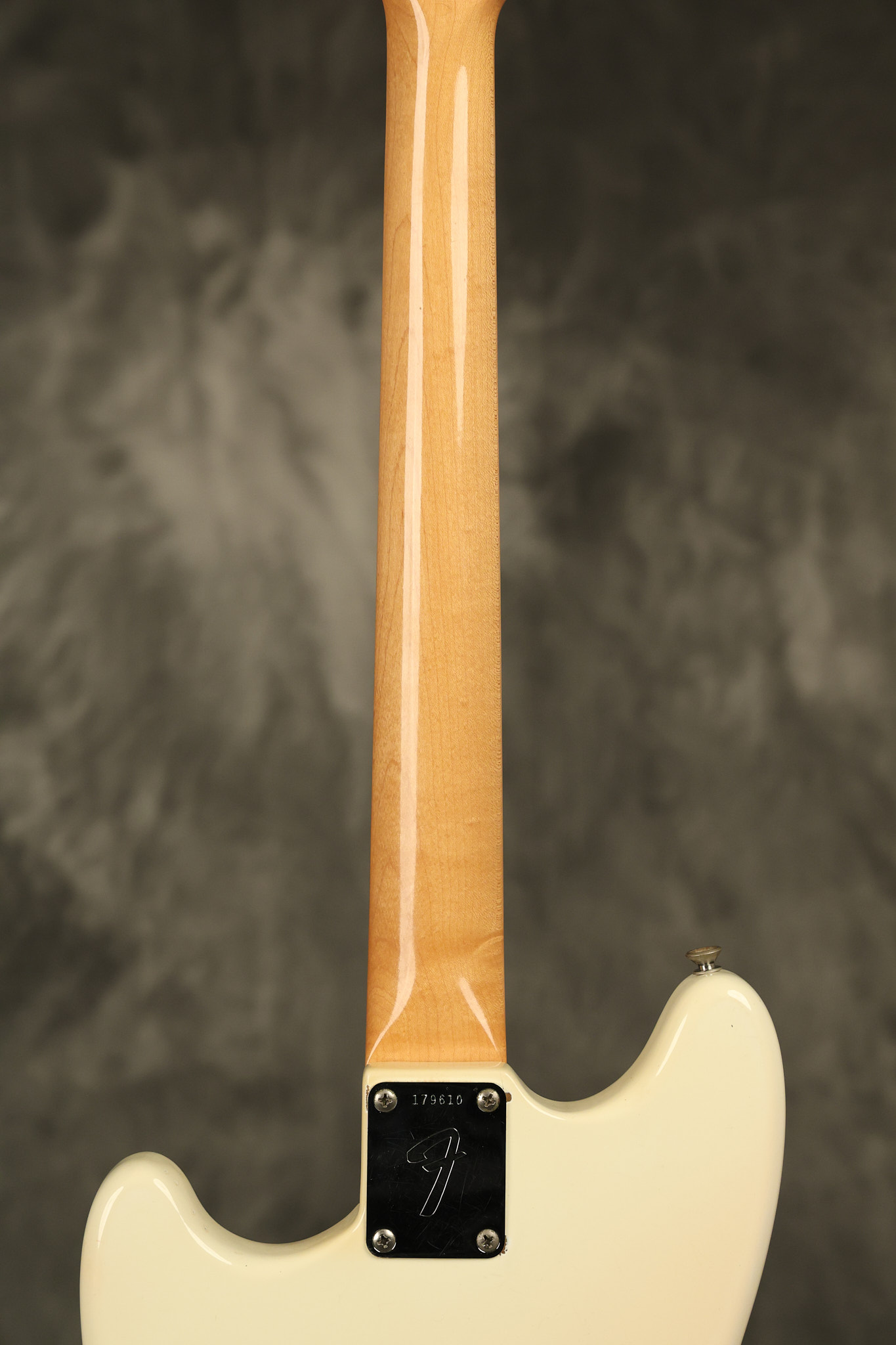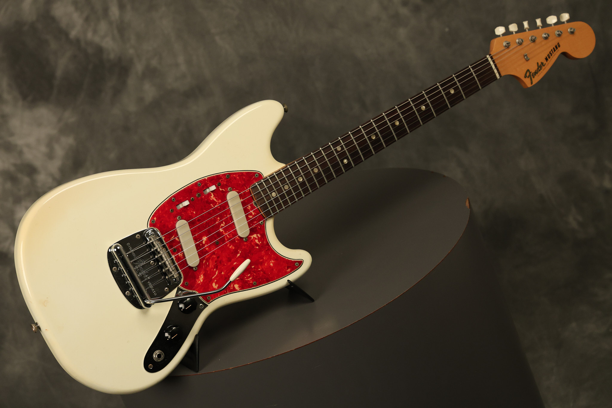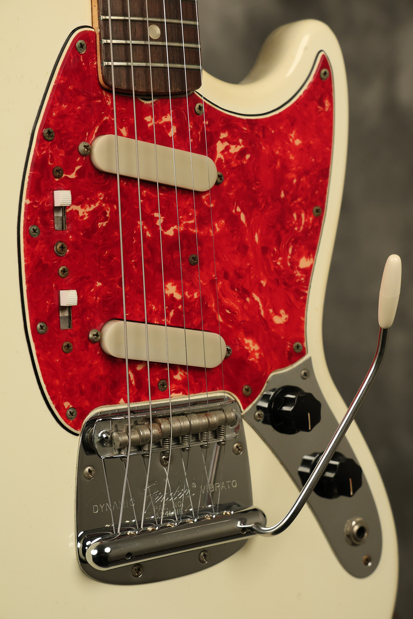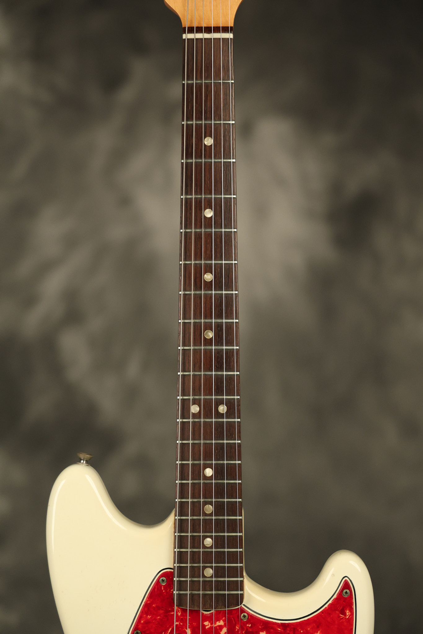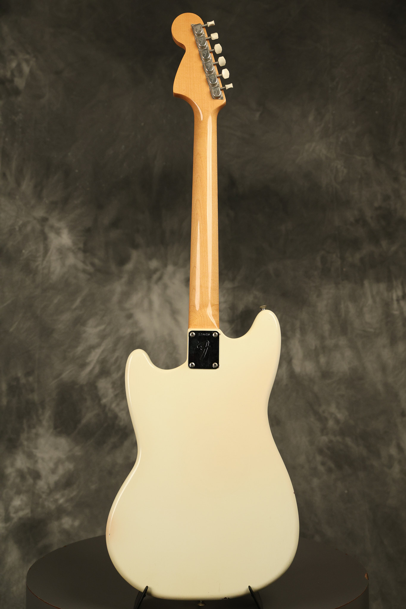 1967 Fender Mustang in its original White finish. It has a great playing neck with good frets. It includes the original tremolo arm and original hardshell case. It's in very good condition with some minor nicks + dings, finish checking on the headstock and other minor cosmetic wear including a very faint ring of discoloration on the back of the body which is barely visible. There is a small beveled washer in one of the screw holes for one of the switches where the hole was too wide for the screw. The guitar itself remains structurally sound with no cracks, breaks or repairs. All electronics work and sound great.
