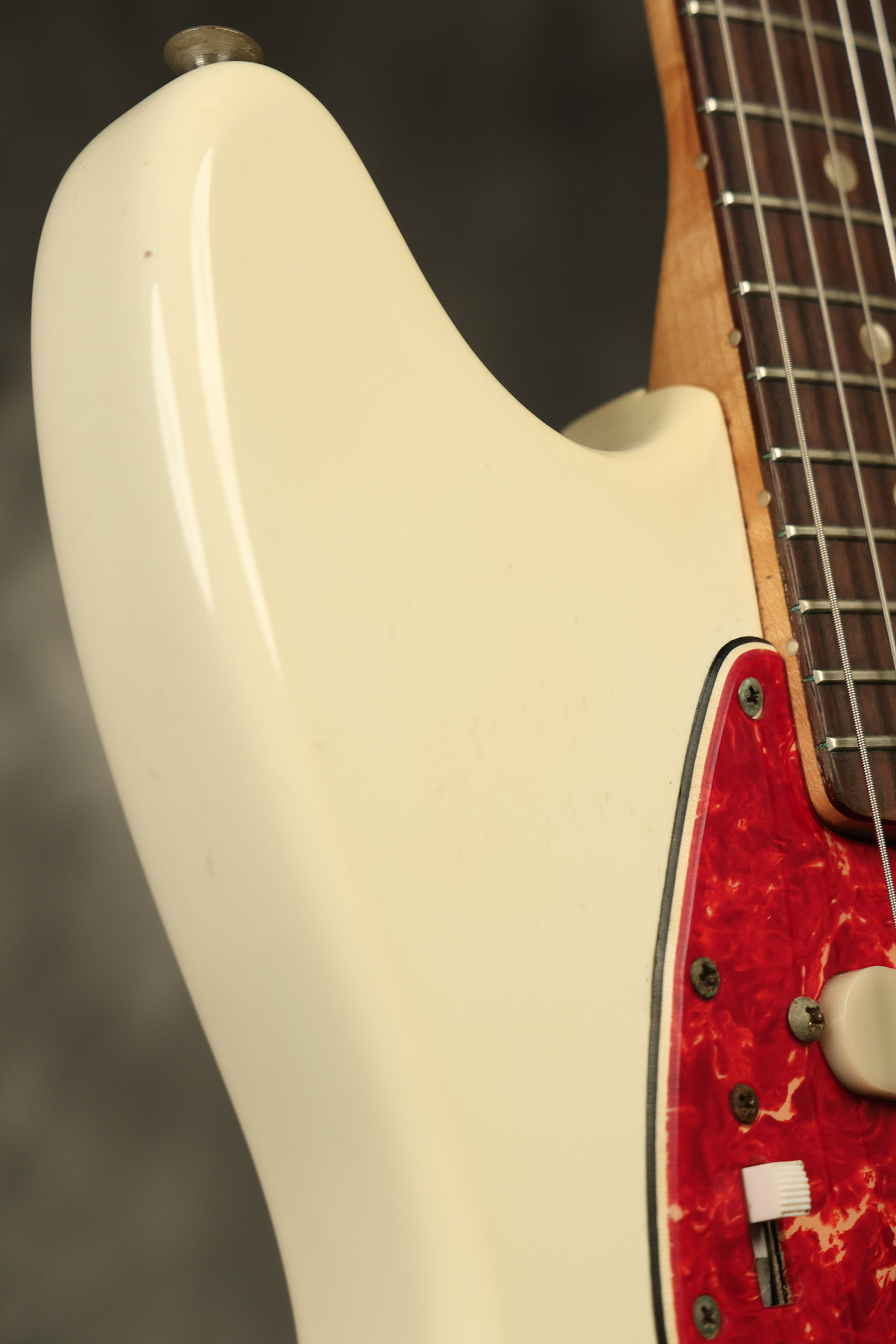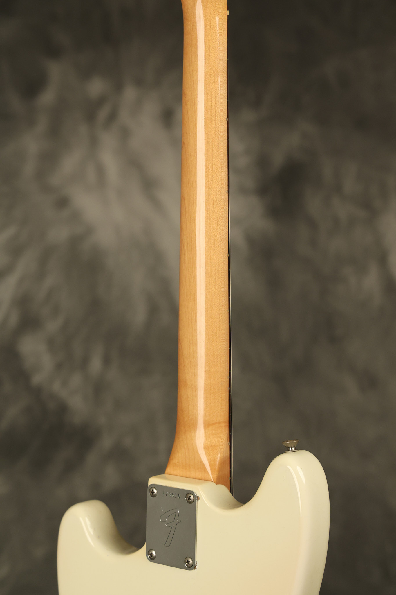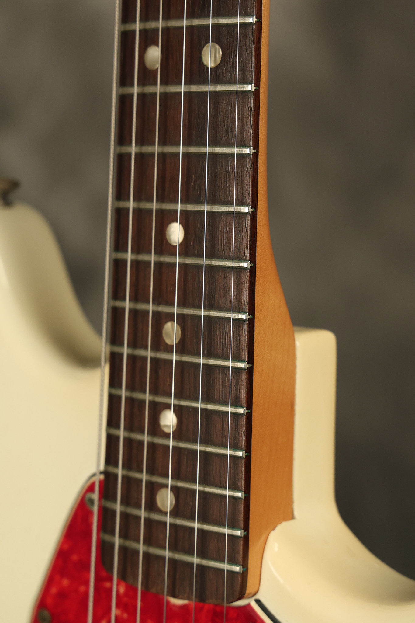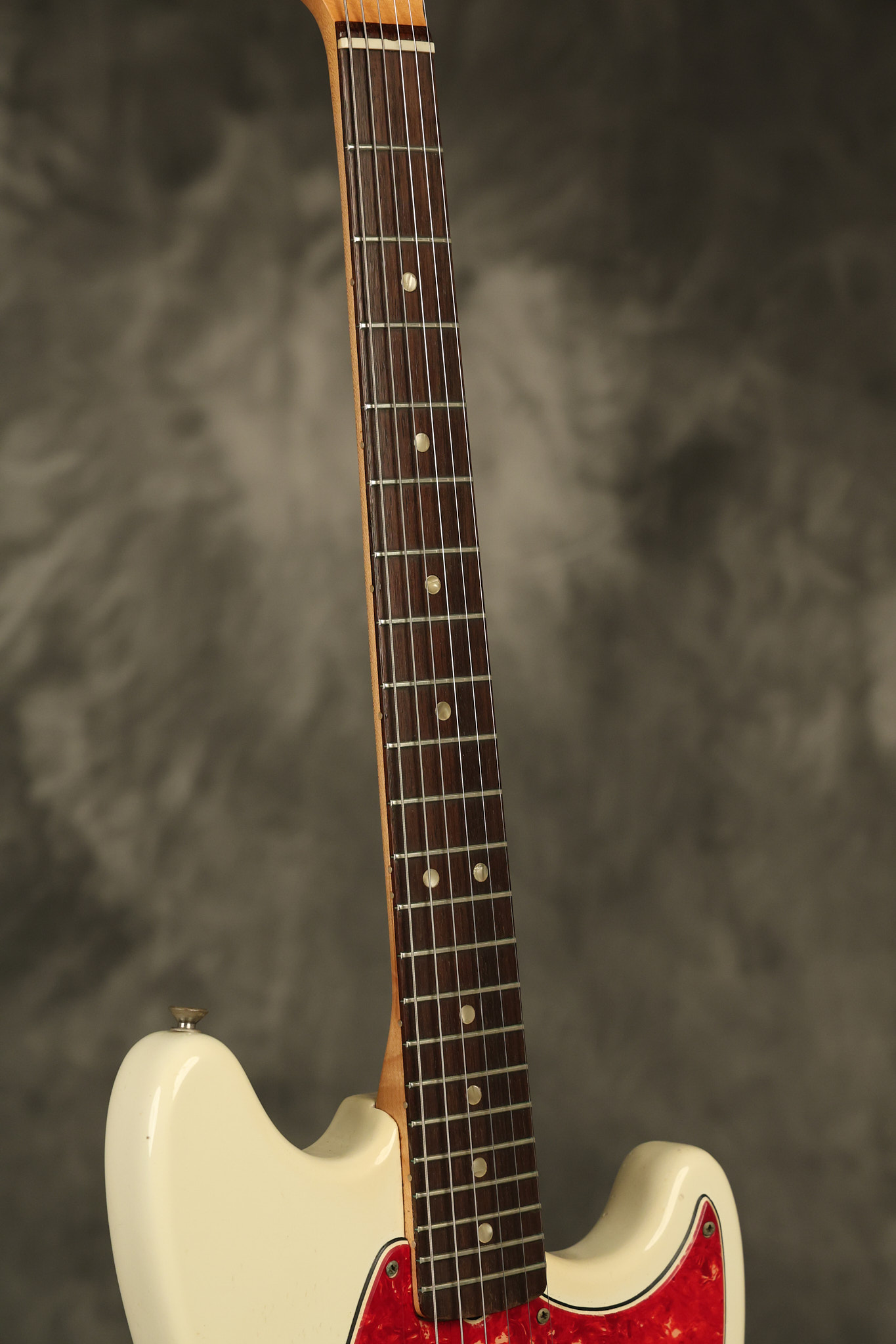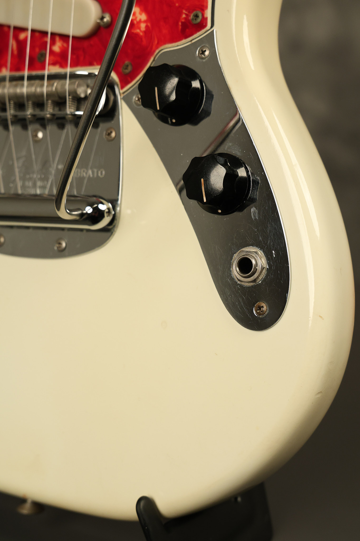 1967 Fender Mustang in its original White finish. It has a great playing neck with good frets. It includes the original tremolo arm and original hardshell case. It's in very good condition with some minor nicks + dings, finish checking on the headstock and other minor cosmetic wear including a very faint ring of discoloration on the back of the body which is barely visible. There is a small beveled washer in one of the screw holes for one of the switches where the hole was too wide for the screw. The guitar itself remains structurally sound with no cracks, breaks or repairs. All electronics work and sound great.