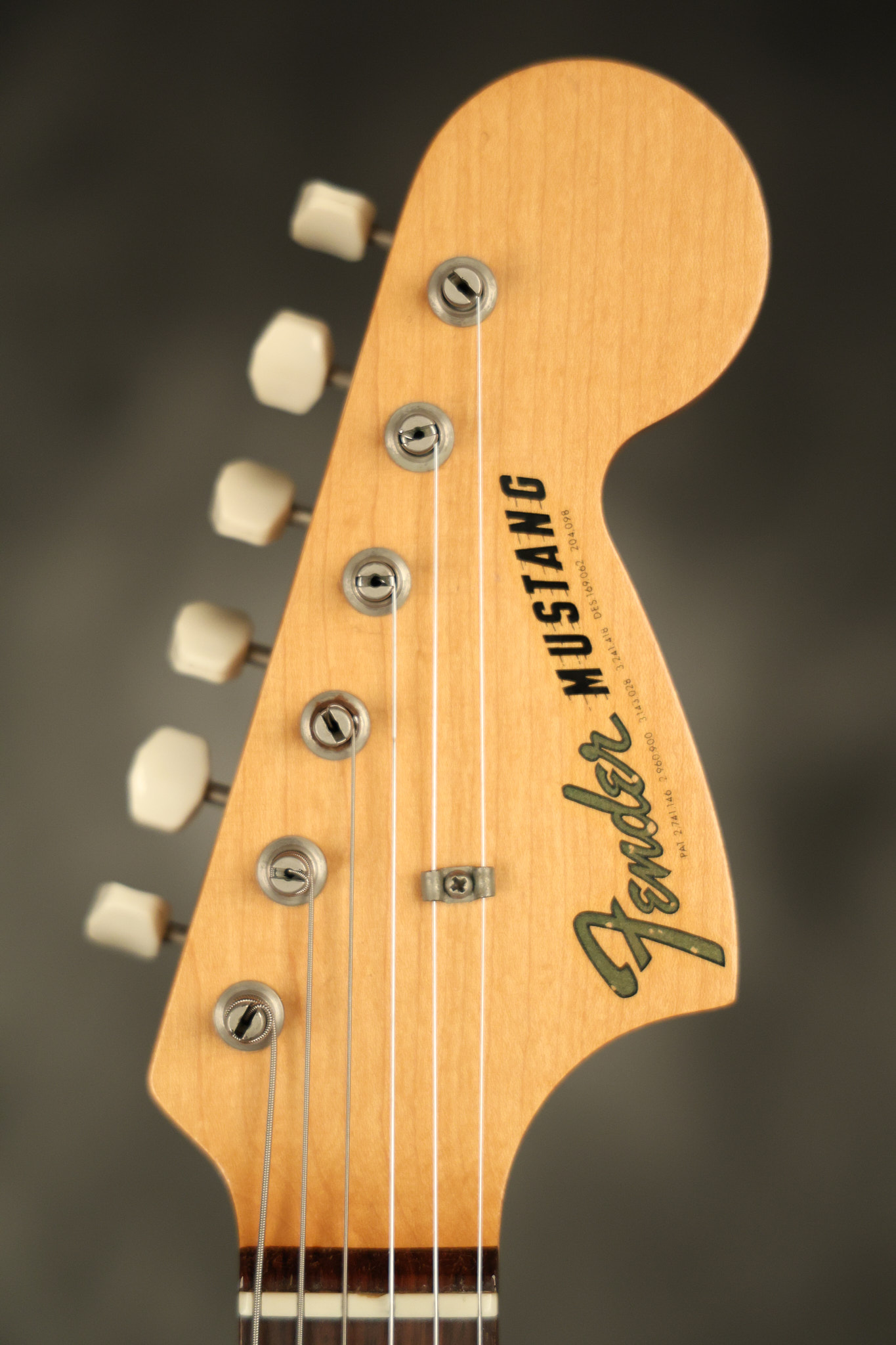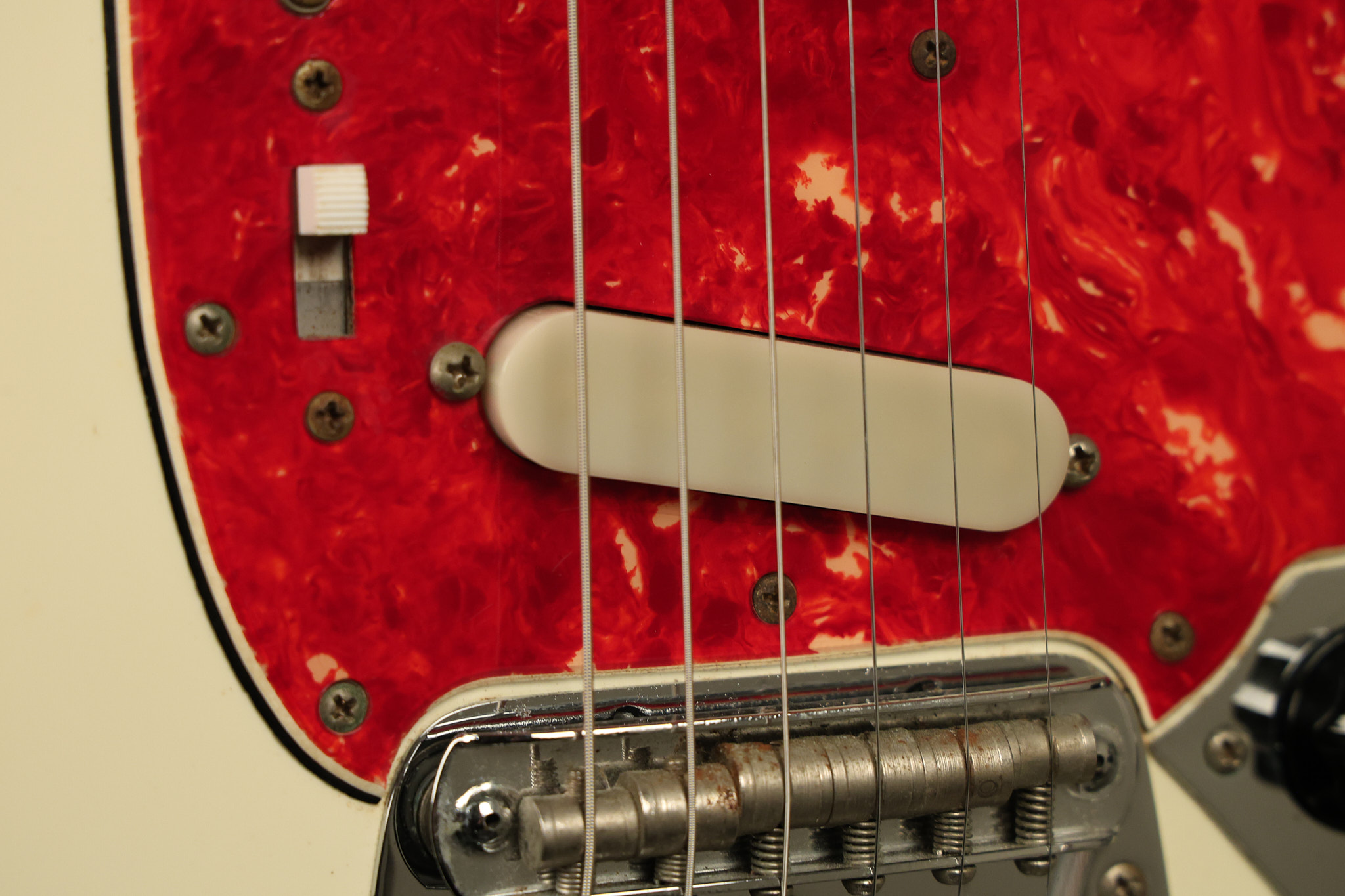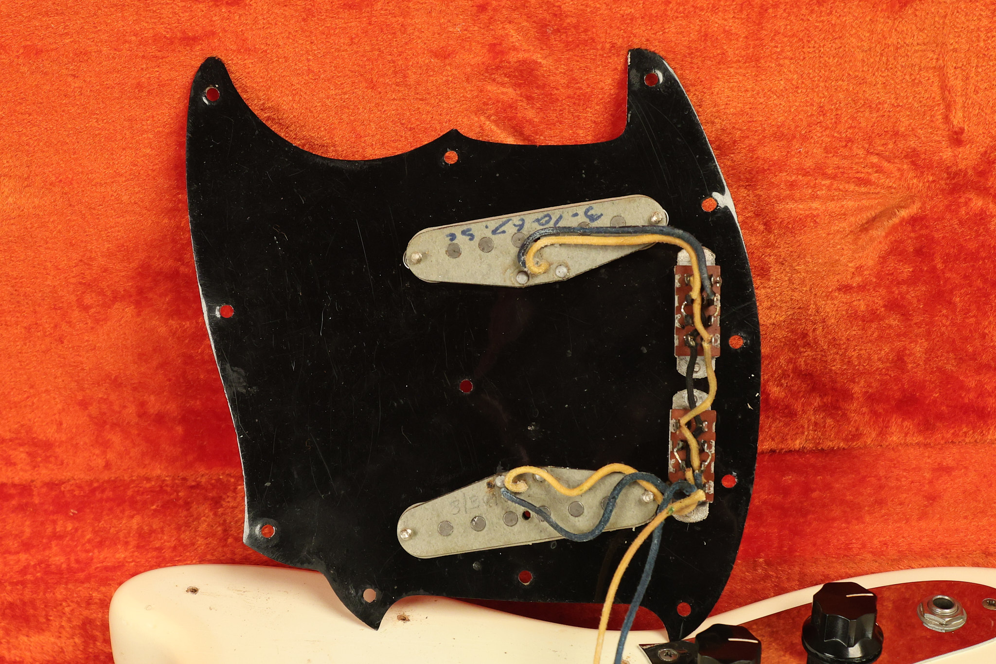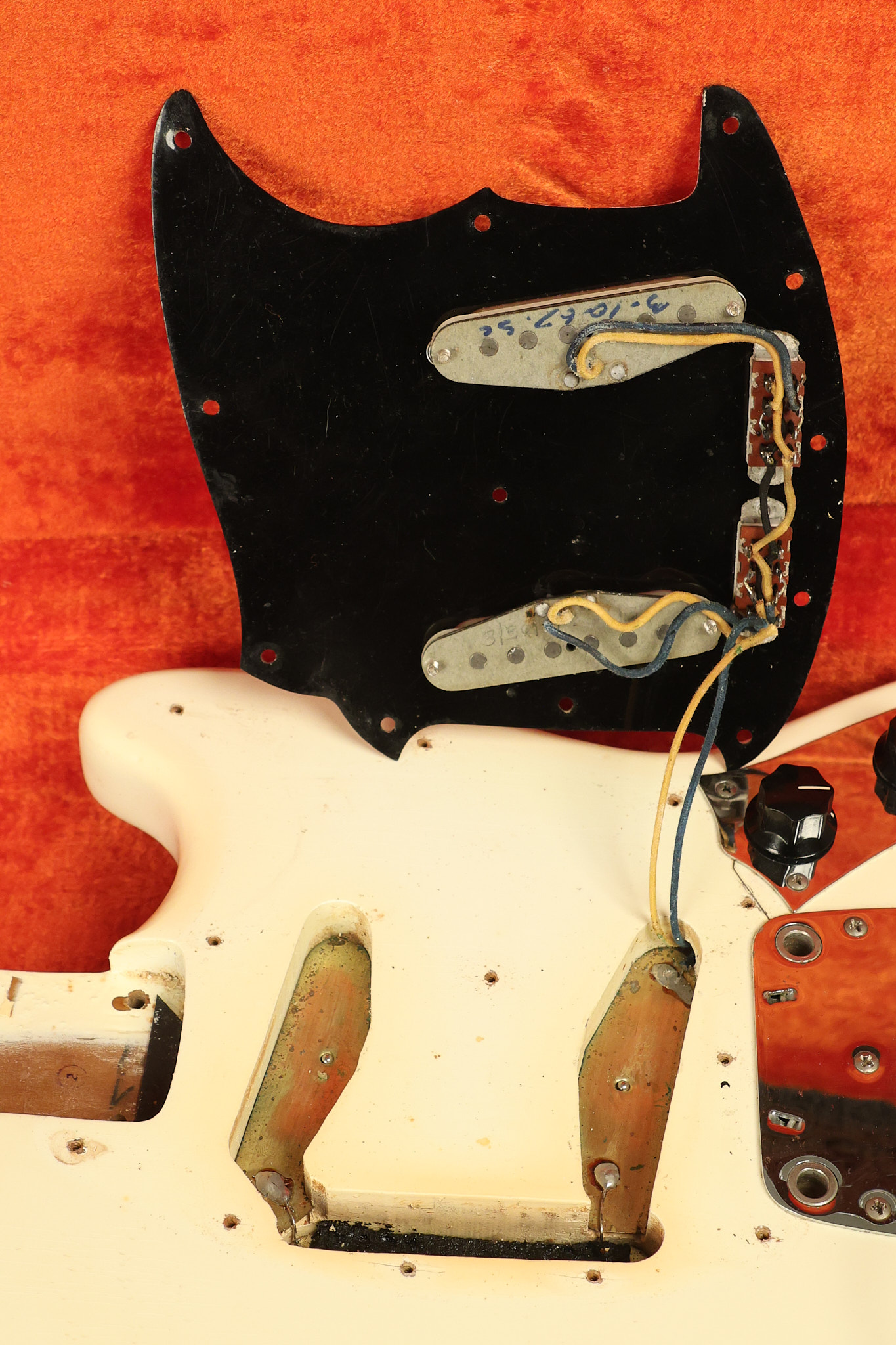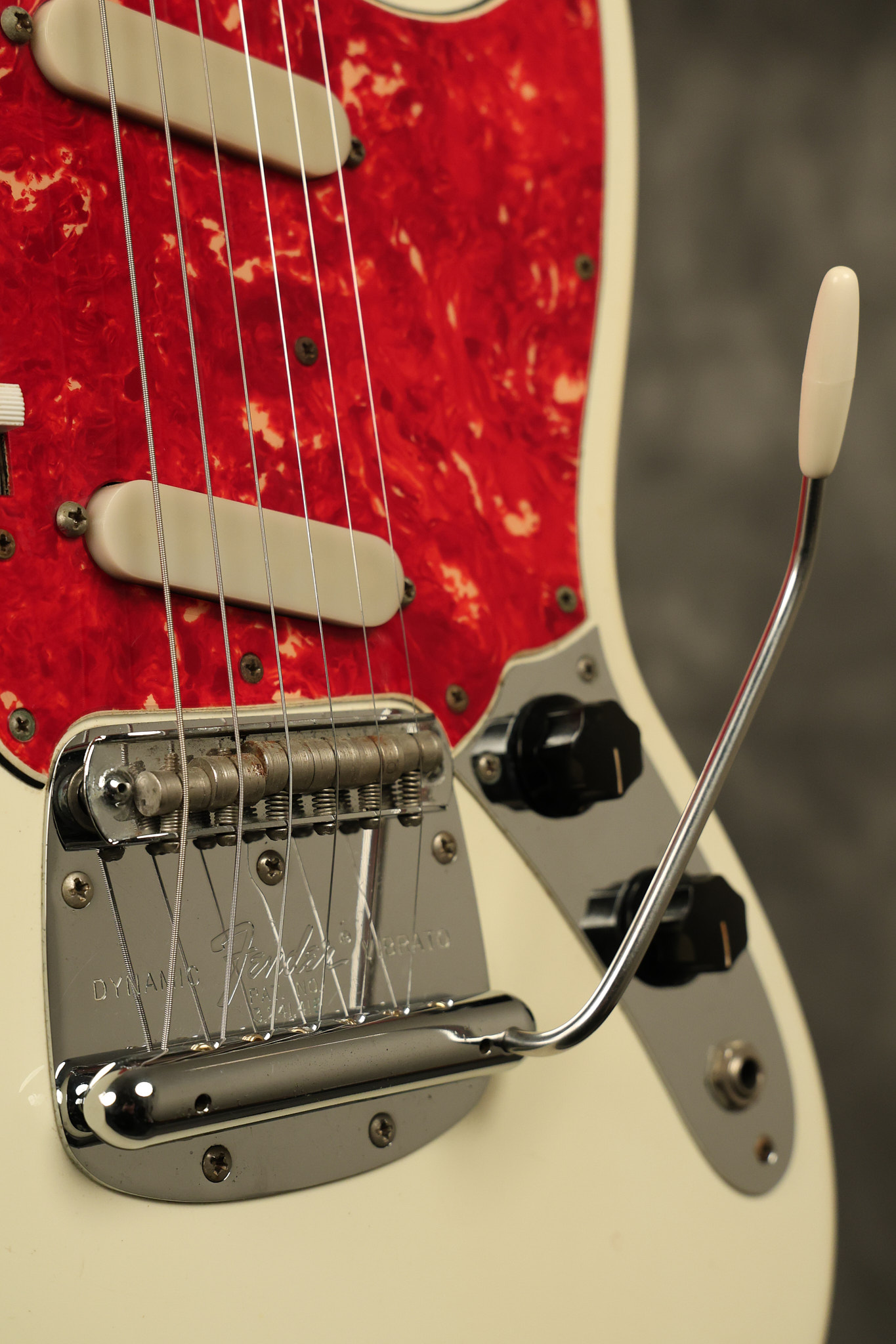 1967 Fender Mustang in its original White finish. It has a great playing neck with good frets. It includes the original tremolo arm and original hardshell case. It's in very good condition with some minor nicks + dings, finish checking on the headstock and other minor cosmetic wear including a very faint ring of discoloration on the back of the body which is barely visible. There is a small beveled washer in one of the screw holes for one of the switches where the hole was too wide for the screw. The guitar itself remains structurally sound with no cracks, breaks or repairs. All electronics work and sound great.
