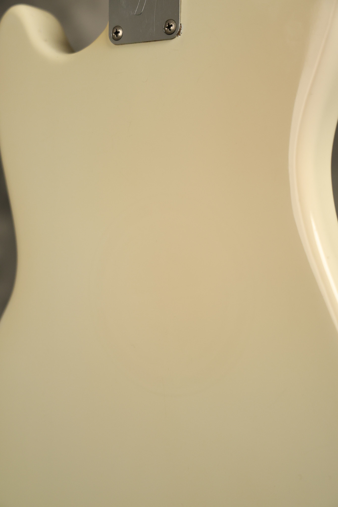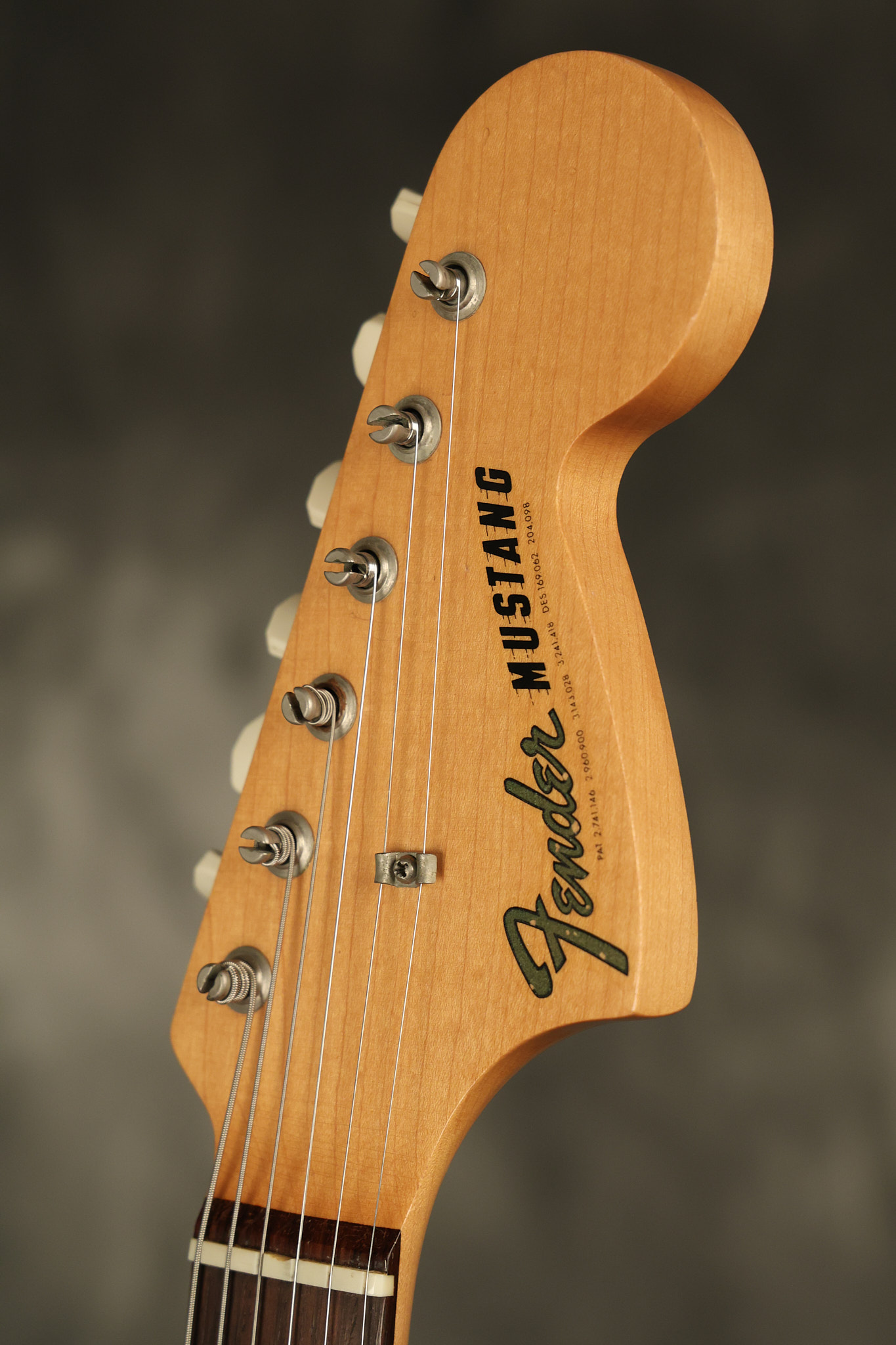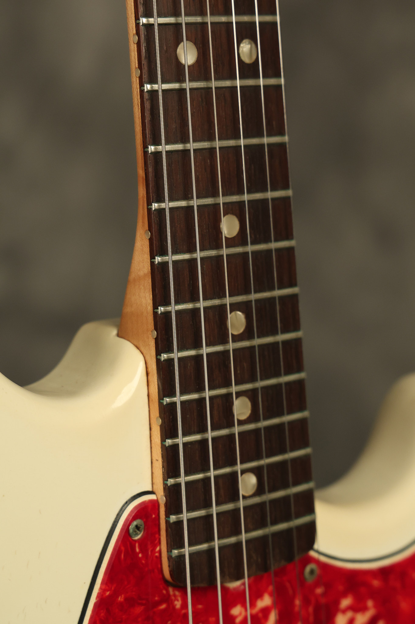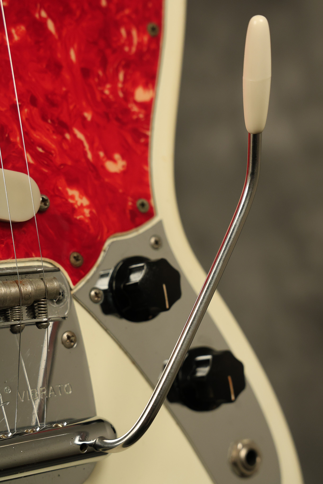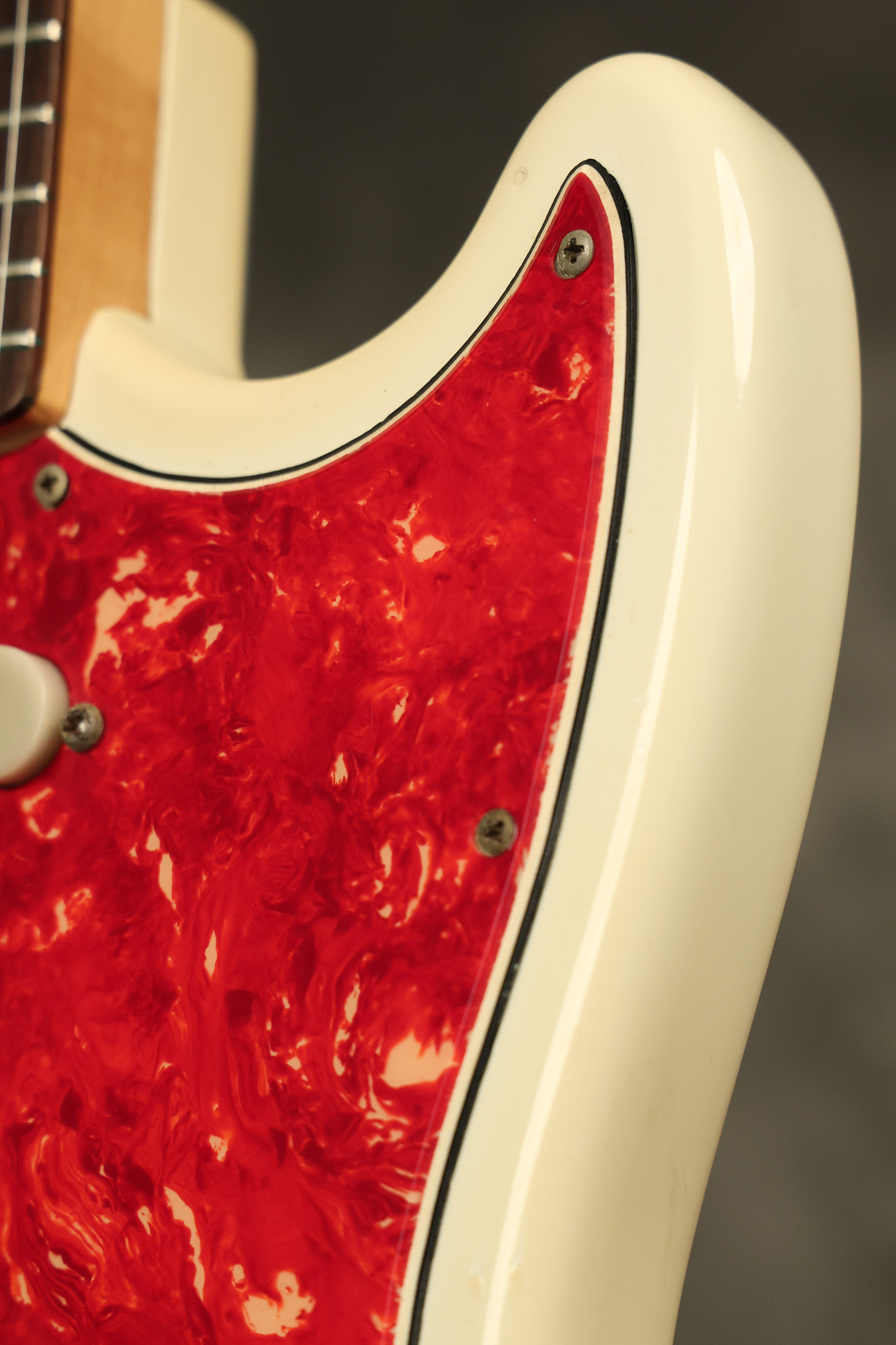 1967 Fender Mustang in its original White finish. It has a great playing neck with good frets. It includes the original tremolo arm and original hardshell case. It's in very good condition with some minor nicks + dings, finish checking on the headstock and other minor cosmetic wear including a very faint ring of discoloration on the back of the body which is barely visible. There is a small beveled washer in one of the screw holes for one of the switches where the hole was too wide for the screw. The guitar itself remains structurally sound with no cracks, breaks or repairs. All electronics work and sound great.