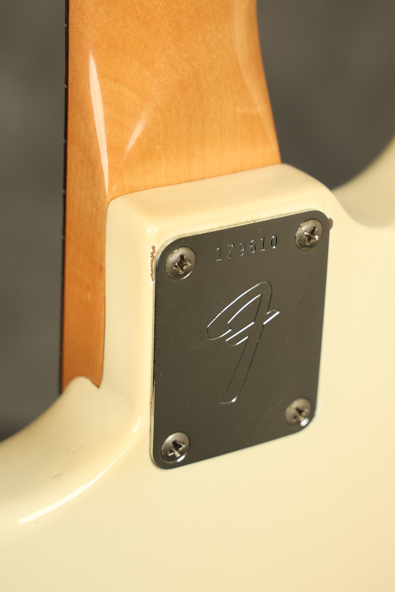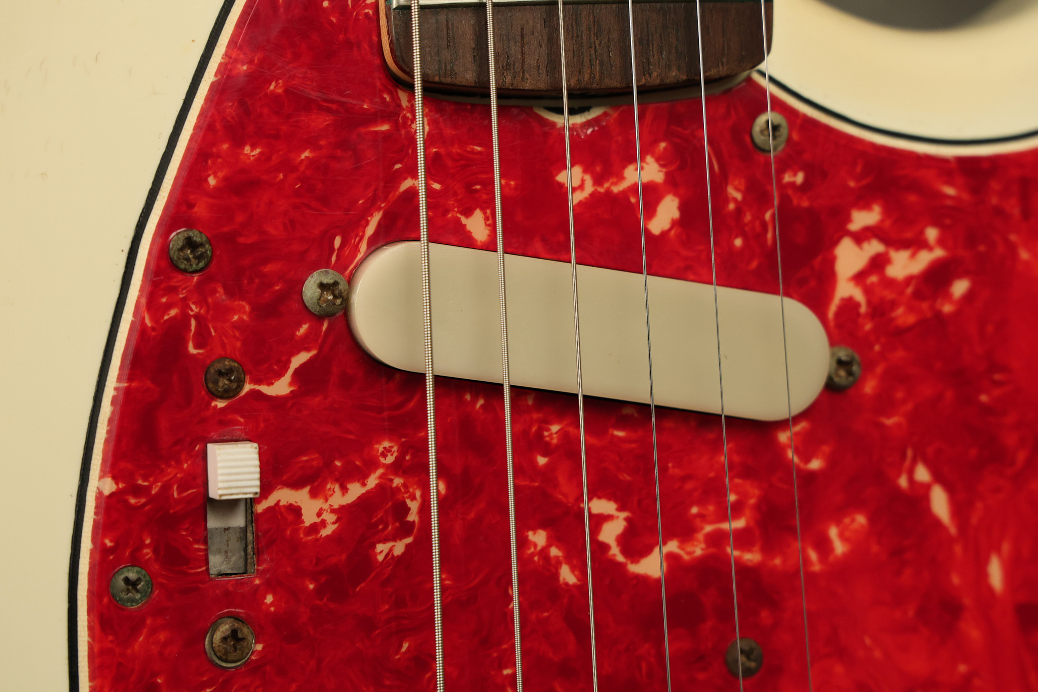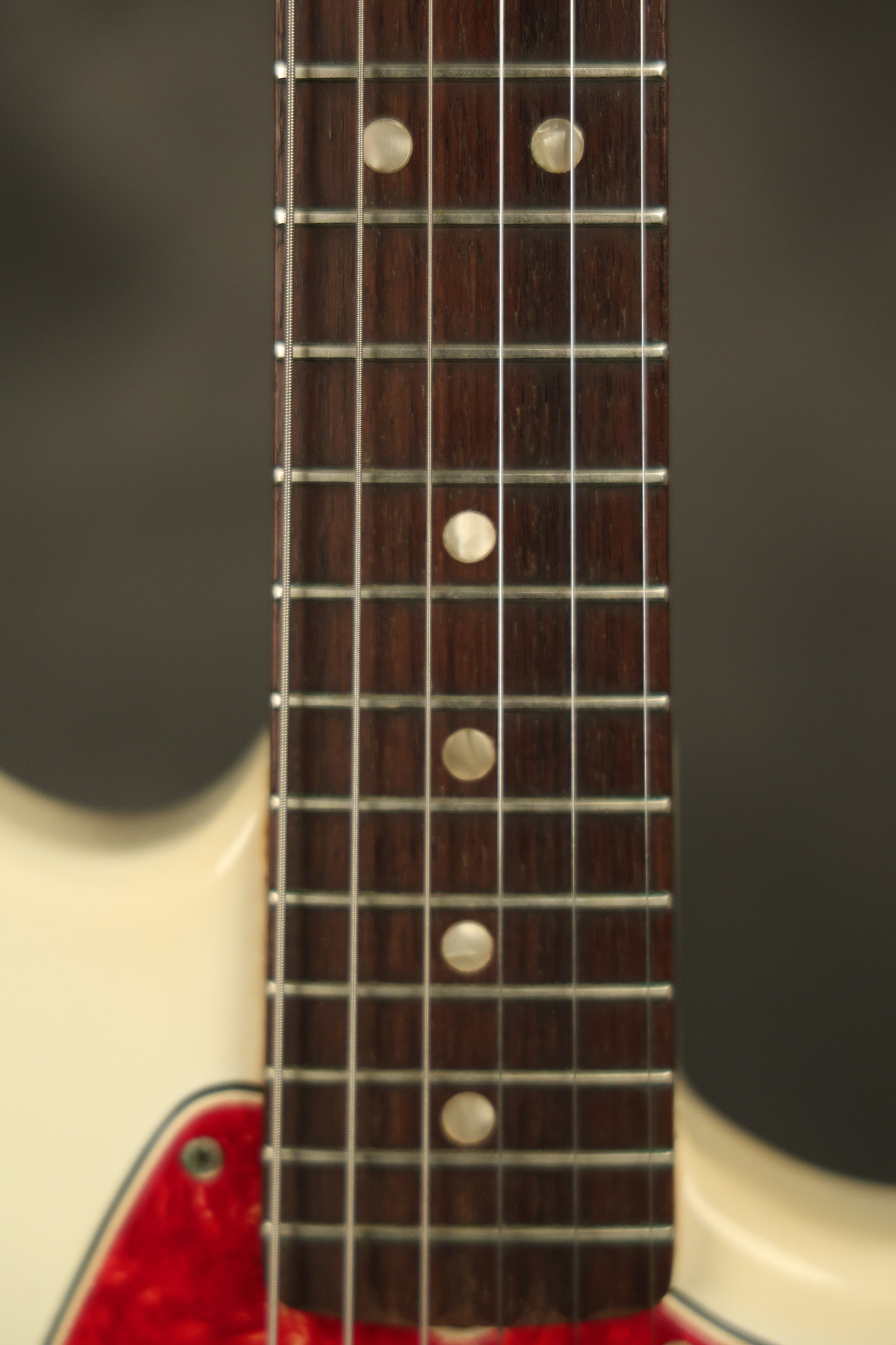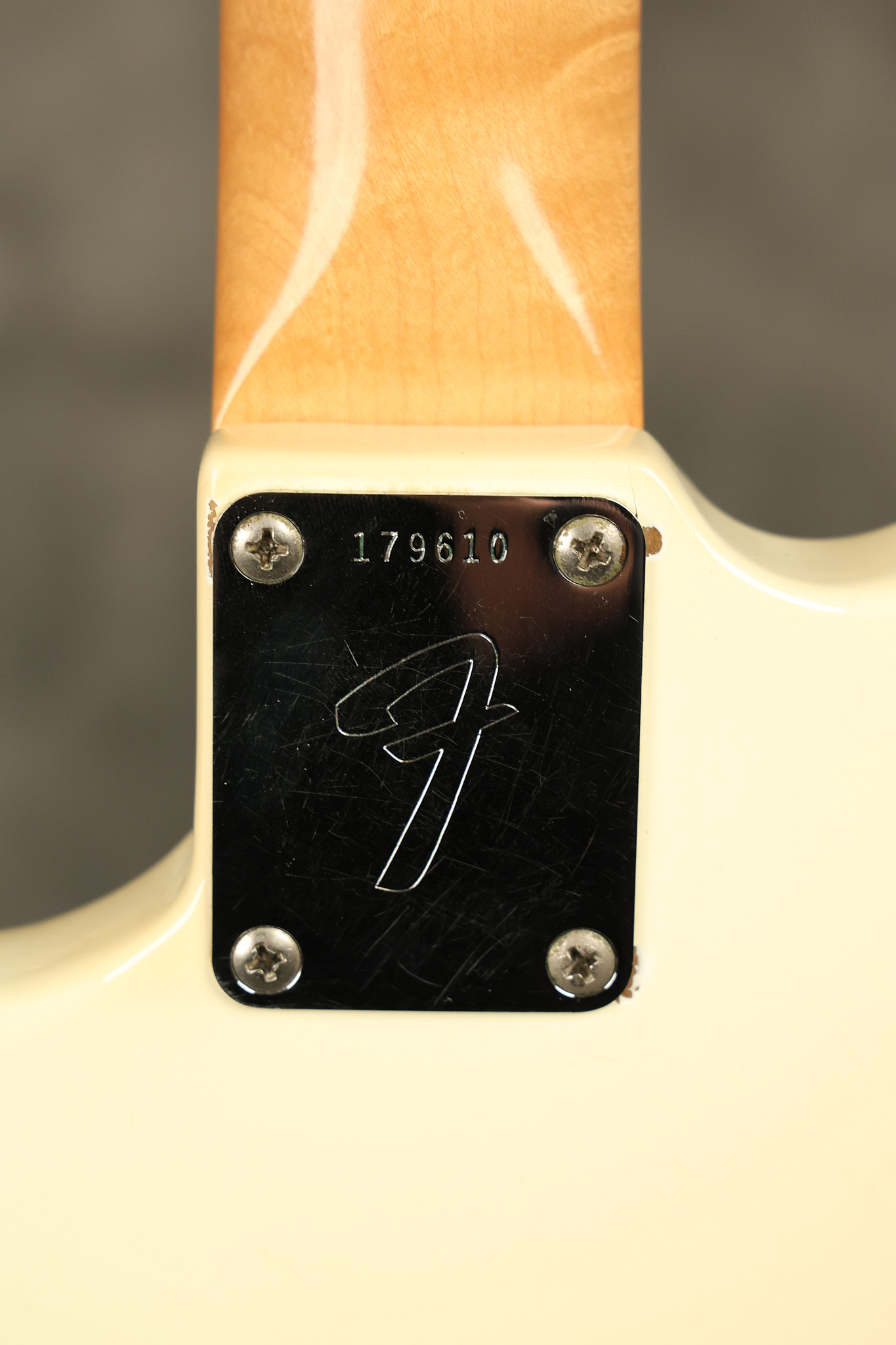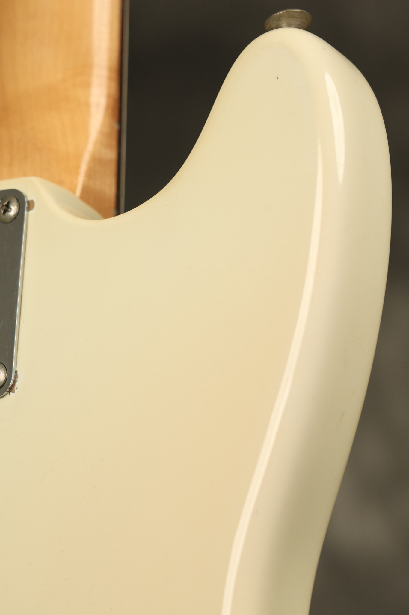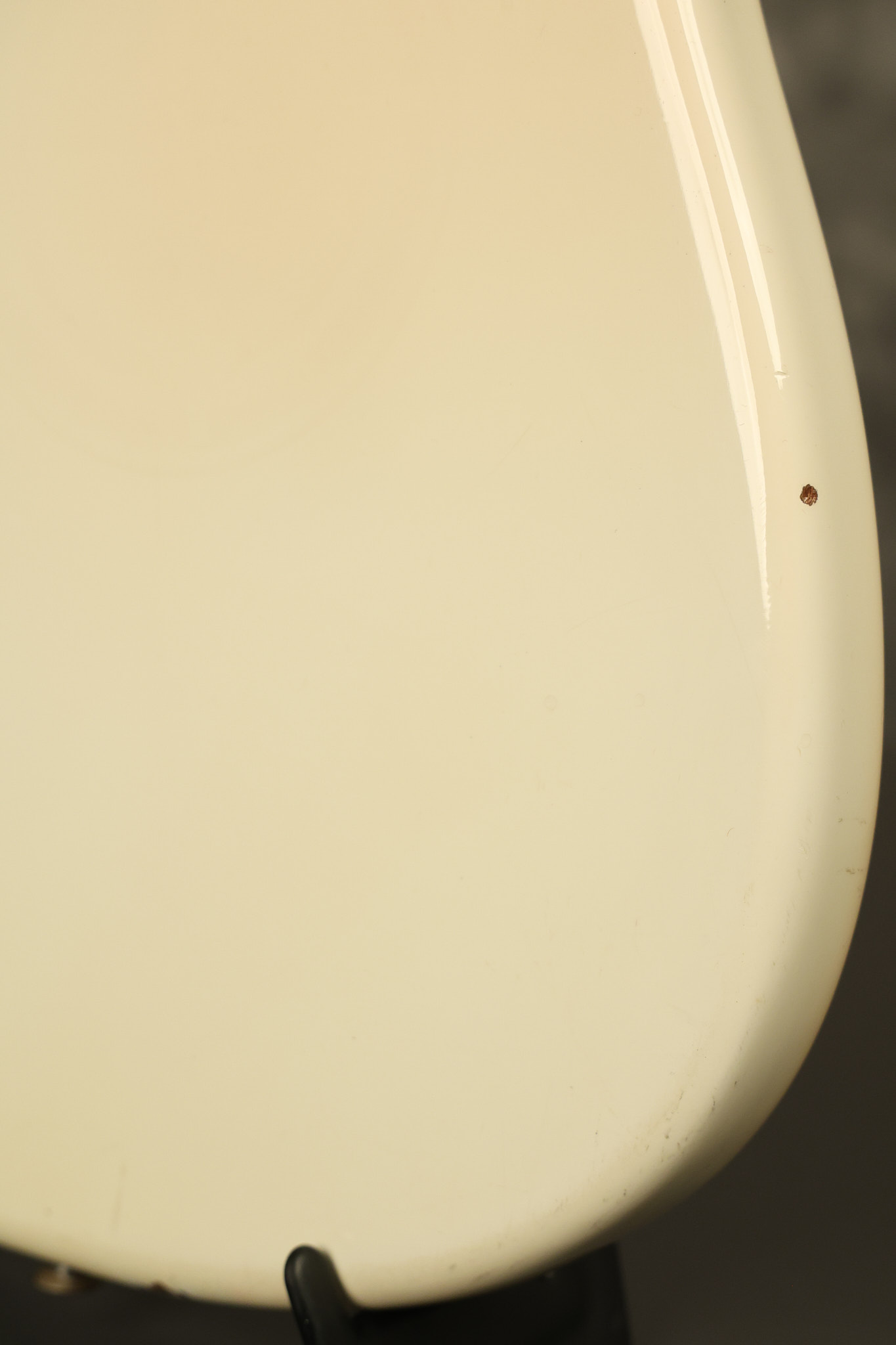 1967 Fender Mustang in its original White finish. It has a great playing neck with good frets. It includes the original tremolo arm and original hardshell case. It's in very good condition with some minor nicks + dings, finish checking on the headstock and other minor cosmetic wear including a very faint ring of discoloration on the back of the body which is barely visible. There is a small beveled washer in one of the screw holes for one of the switches where the hole was too wide for the screw. The guitar itself remains structurally sound with no cracks, breaks or repairs. All electronics work and sound great.