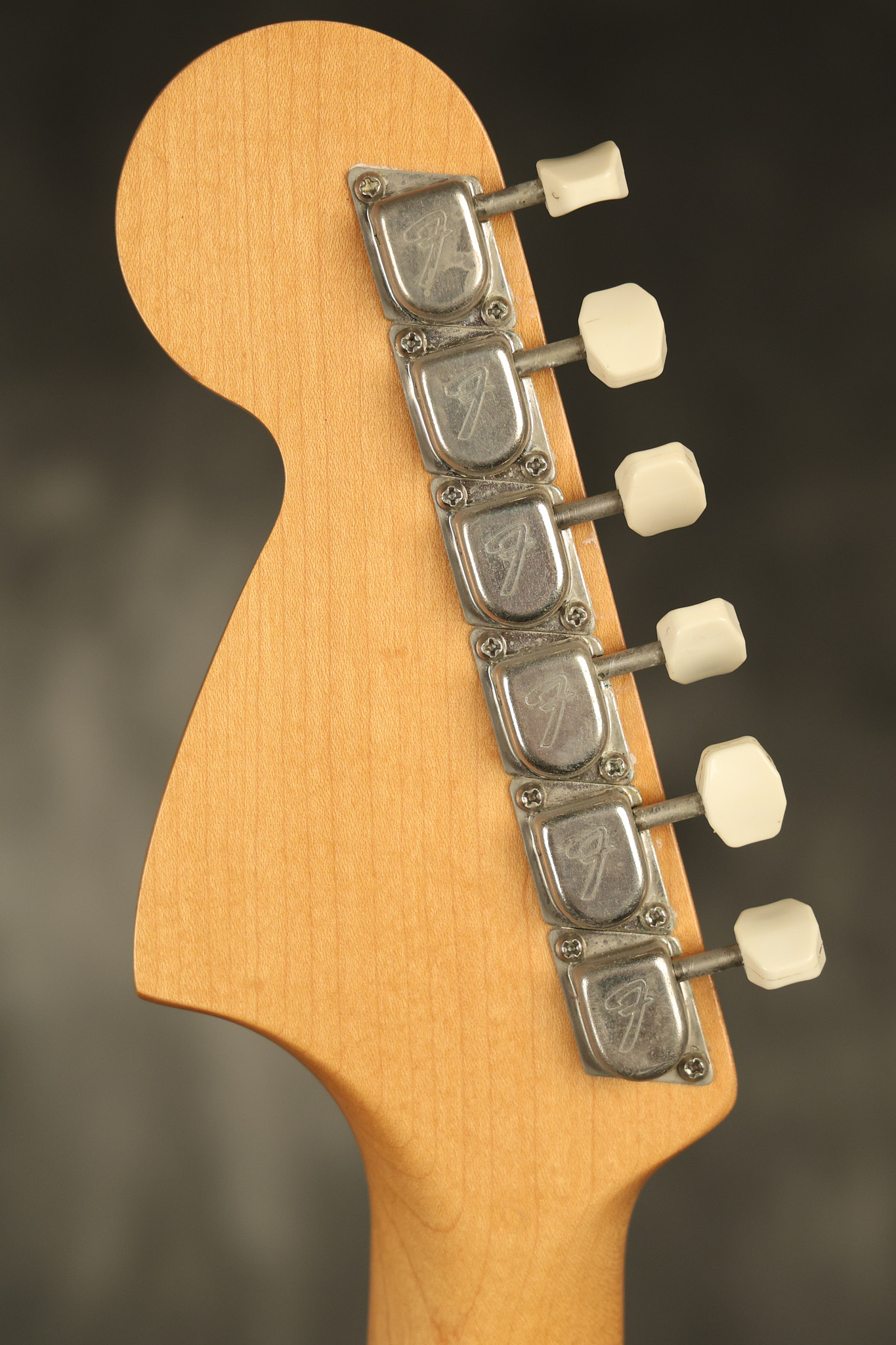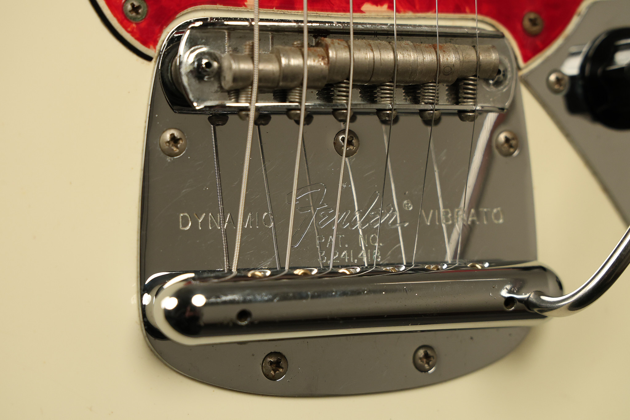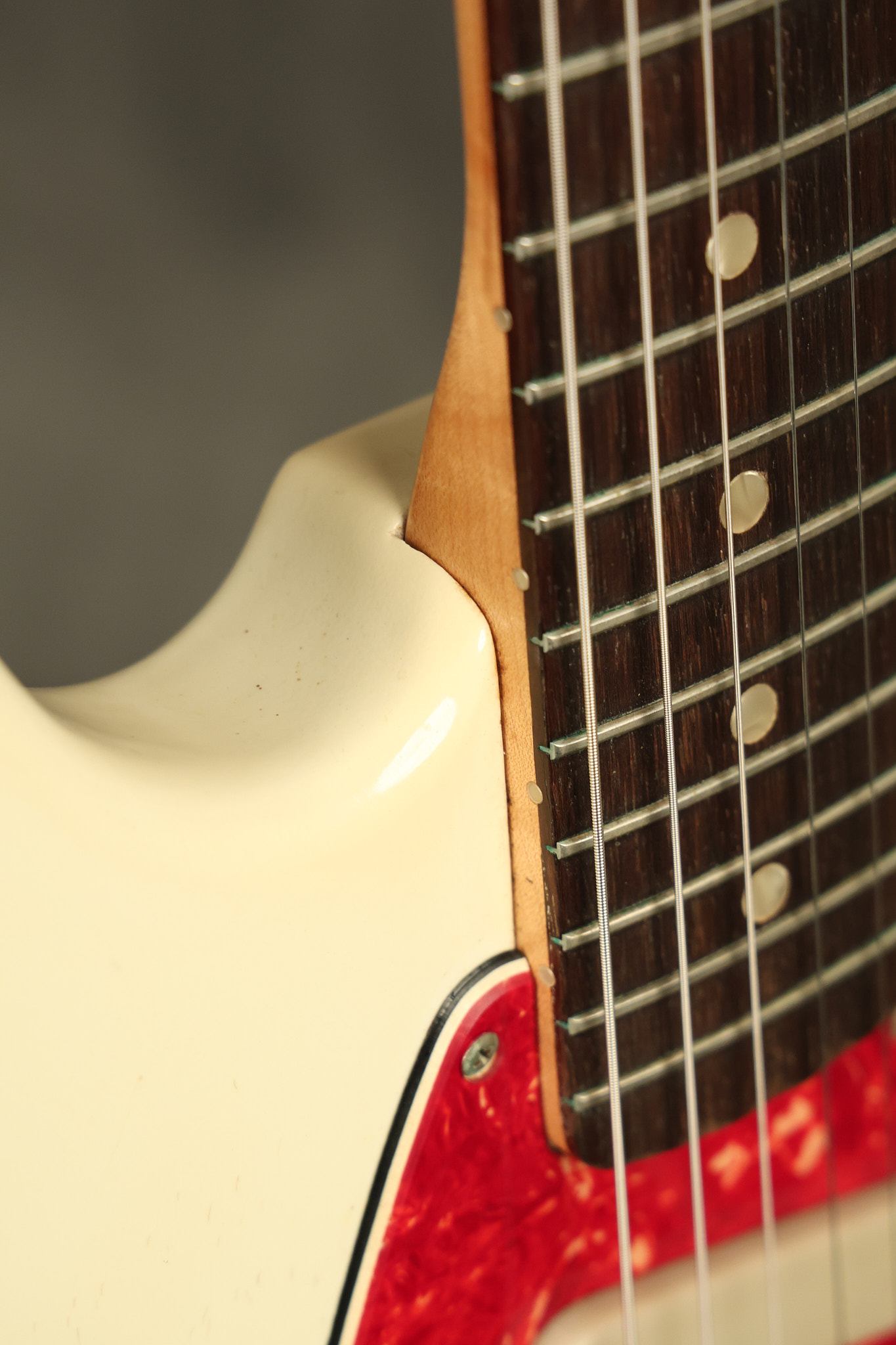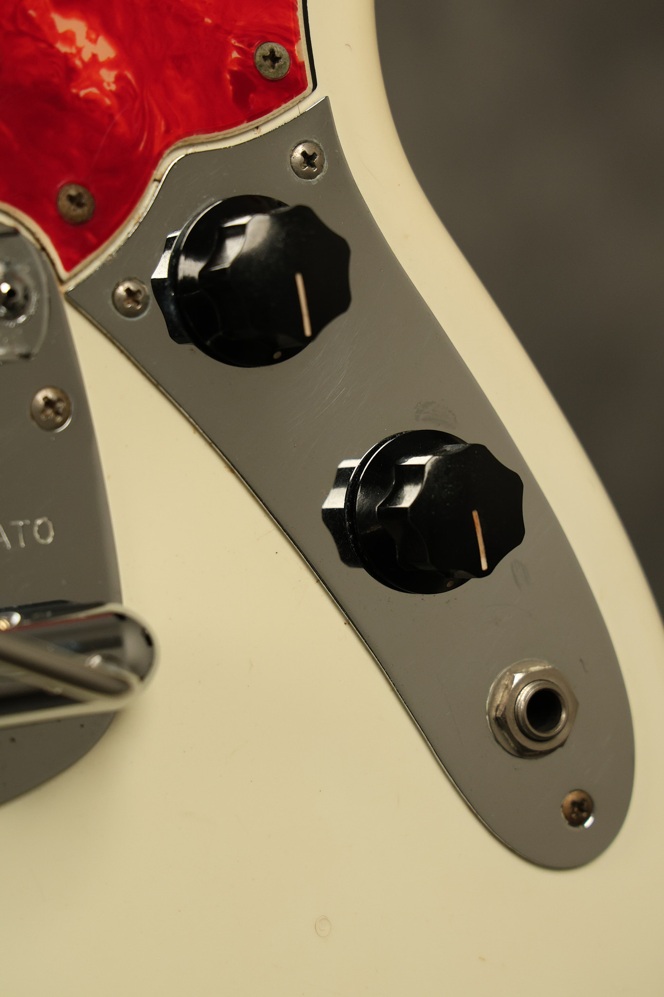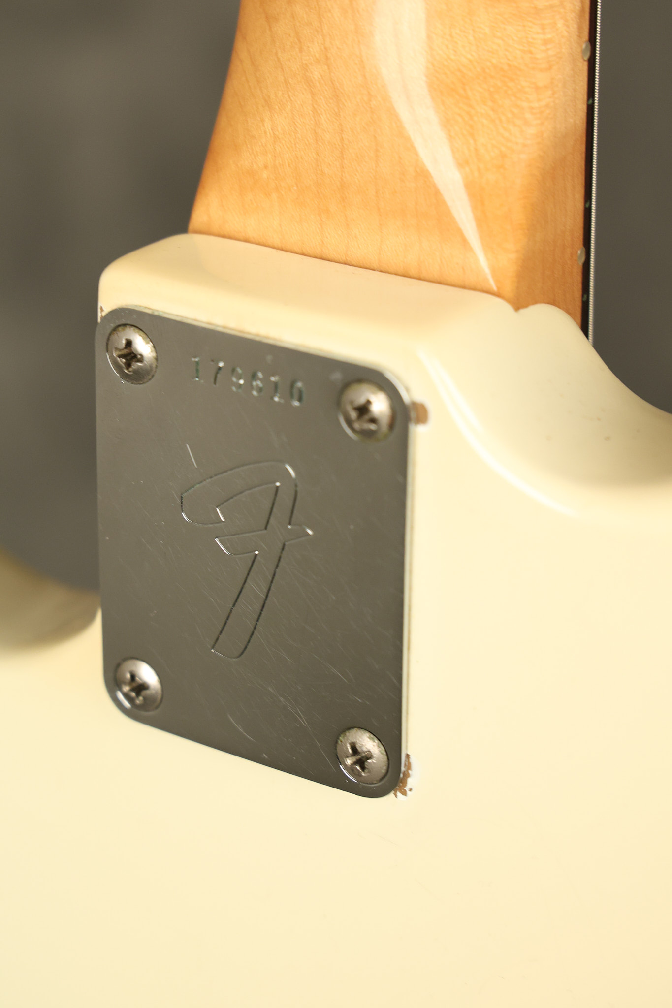 1967 Fender Mustang in its original White finish. It has a great playing neck with good frets. It includes the original tremolo arm and original hardshell case. It's in very good condition with some minor nicks + dings, finish checking on the headstock and other minor cosmetic wear including a very faint ring of discoloration on the back of the body which is barely visible. There is a small beveled washer in one of the screw holes for one of the switches where the hole was too wide for the screw. The guitar itself remains structurally sound with no cracks, breaks or repairs. All electronics work and sound great.