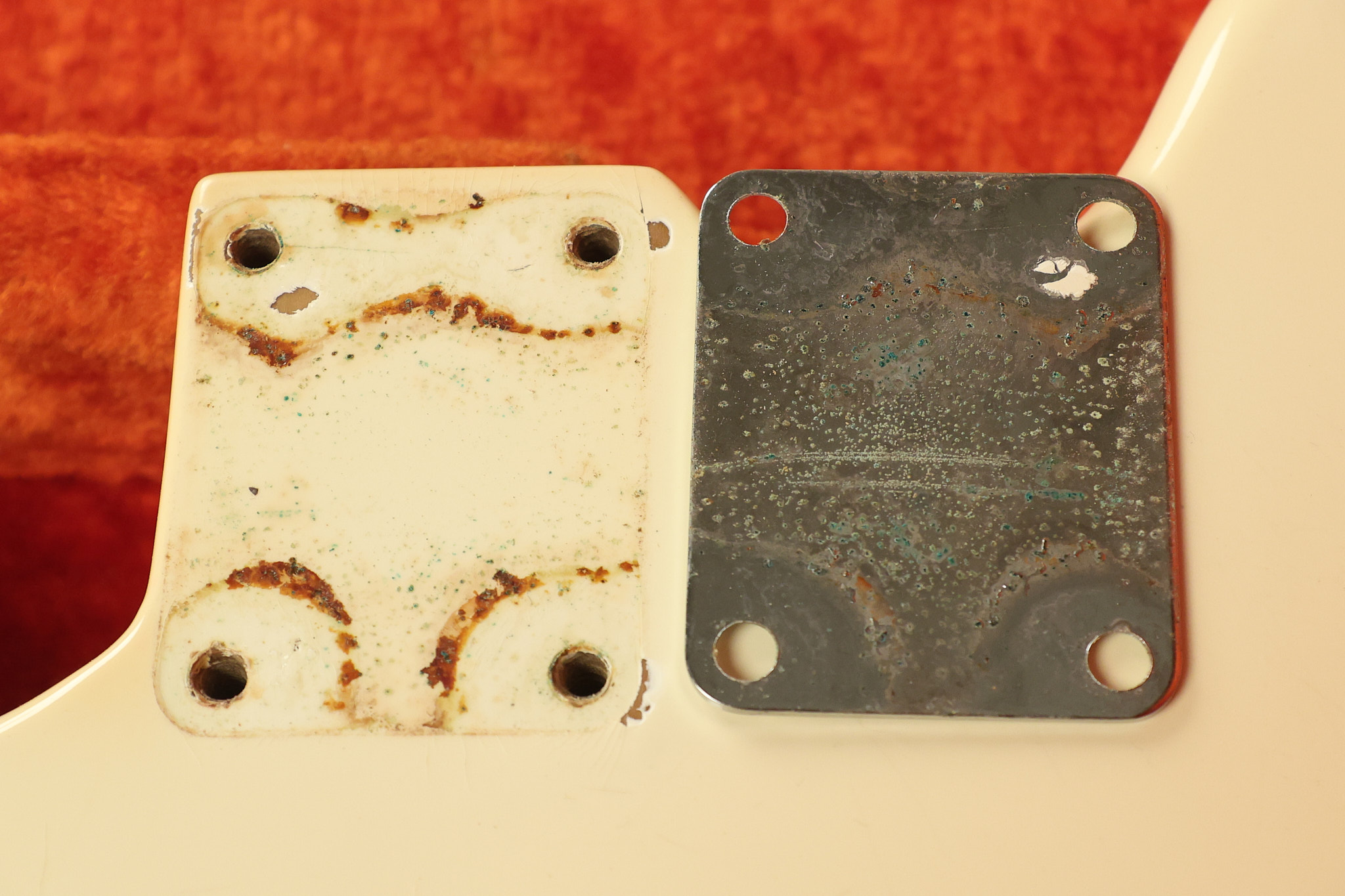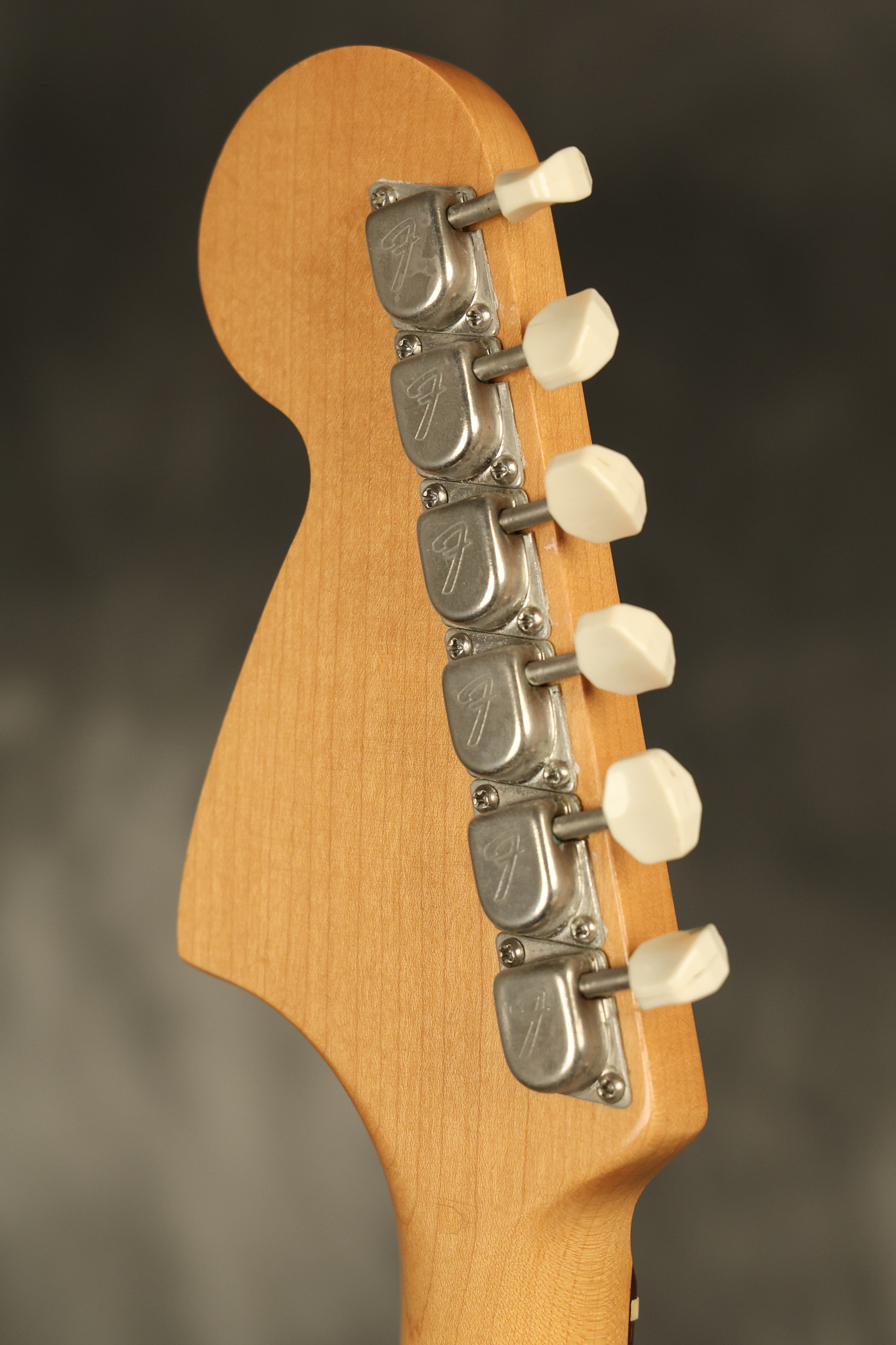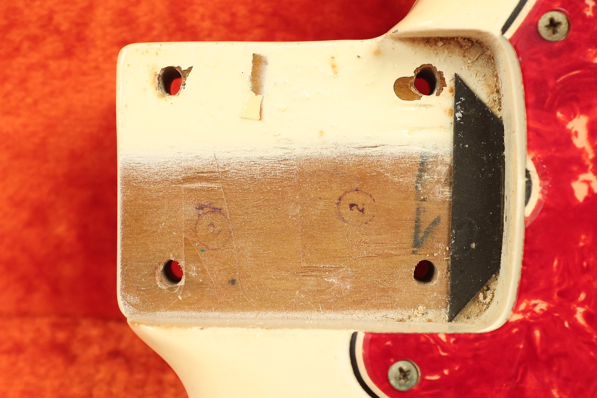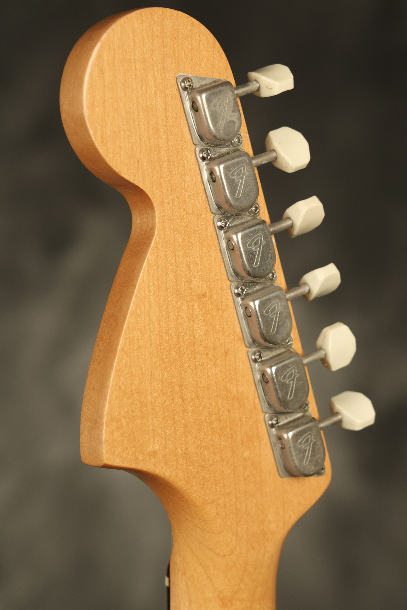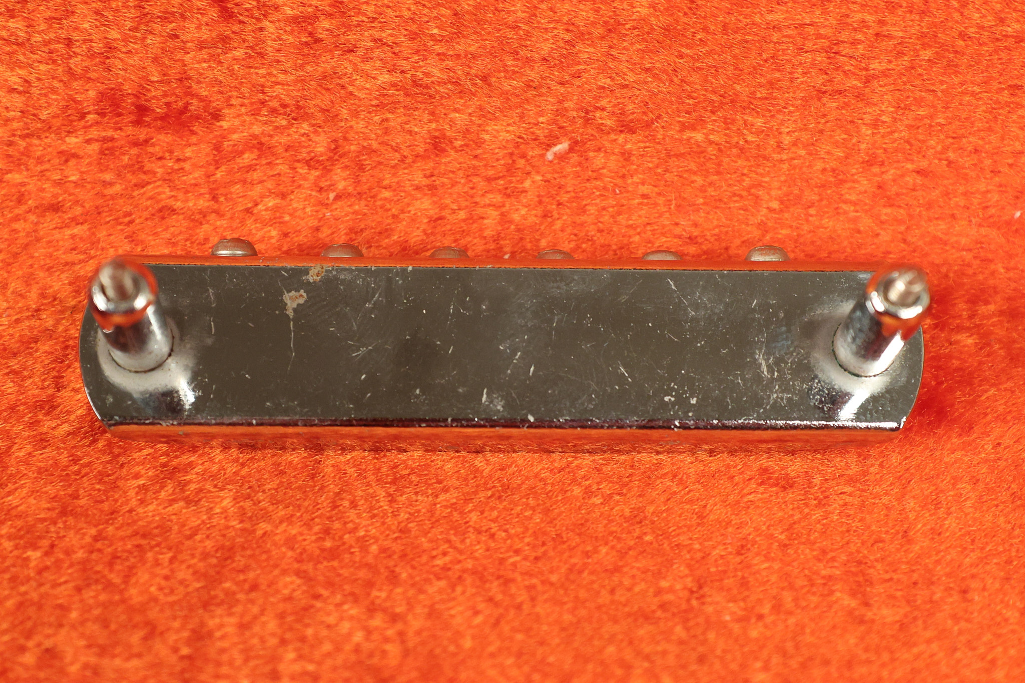 1967 Fender Mustang in its original White finish. It has a great playing neck with good frets. It includes the original tremolo arm and original hardshell case. It's in very good condition with some minor nicks + dings, finish checking on the headstock and other minor cosmetic wear including a very faint ring of discoloration on the back of the body which is barely visible. There is a small beveled washer in one of the screw holes for one of the switches where the hole was too wide for the screw. The guitar itself remains structurally sound with no cracks, breaks or repairs. All electronics work and sound great.