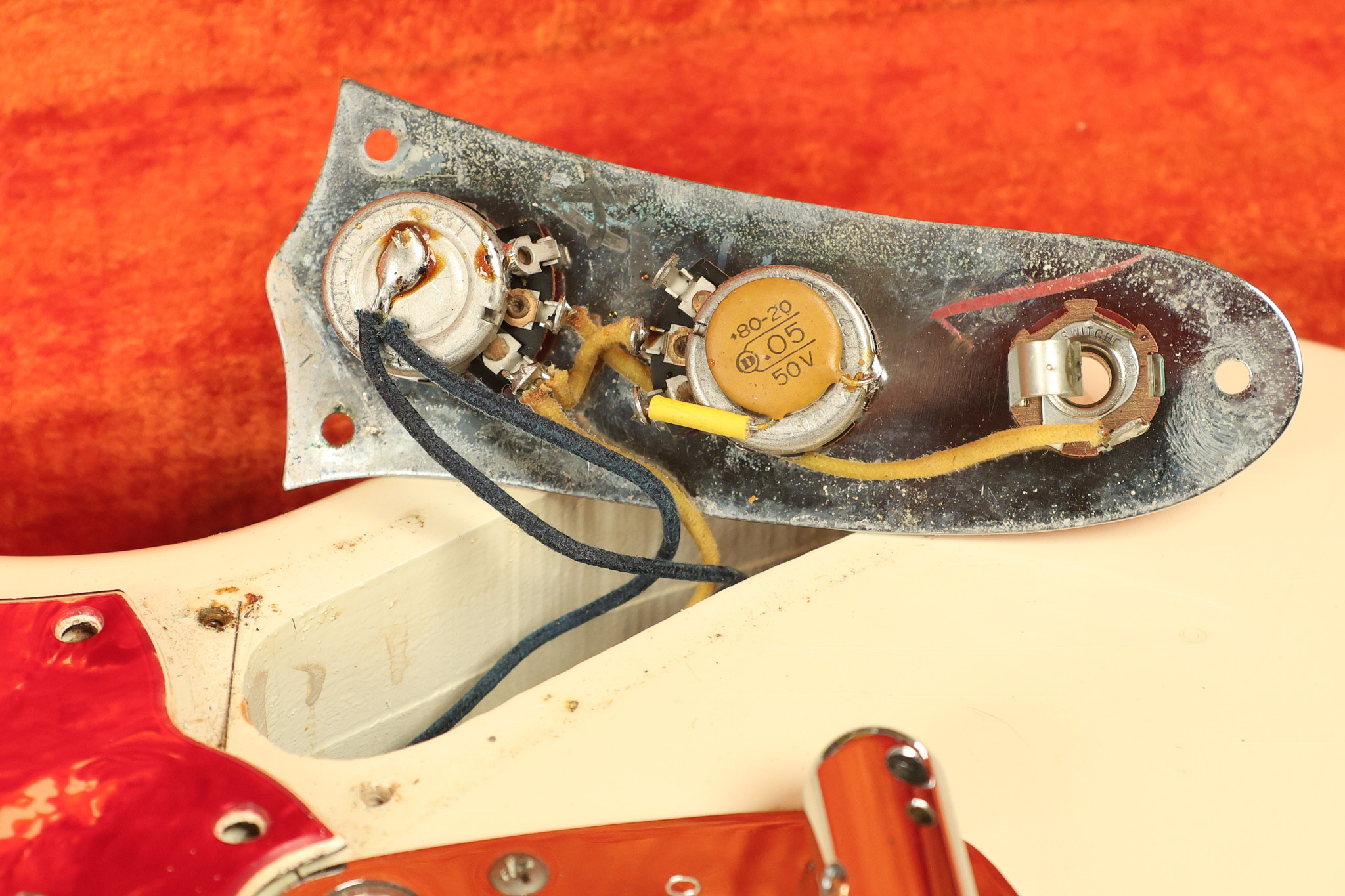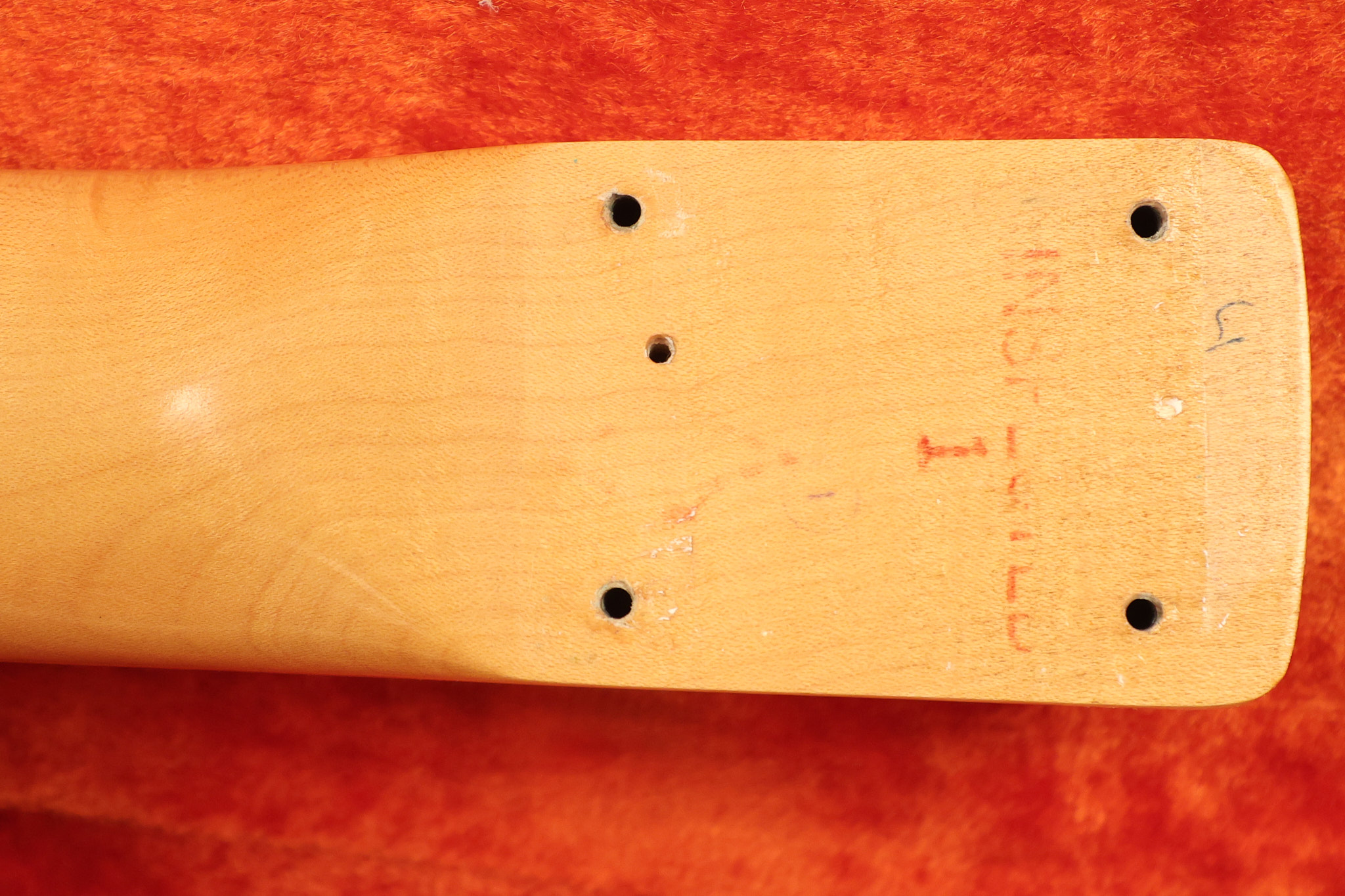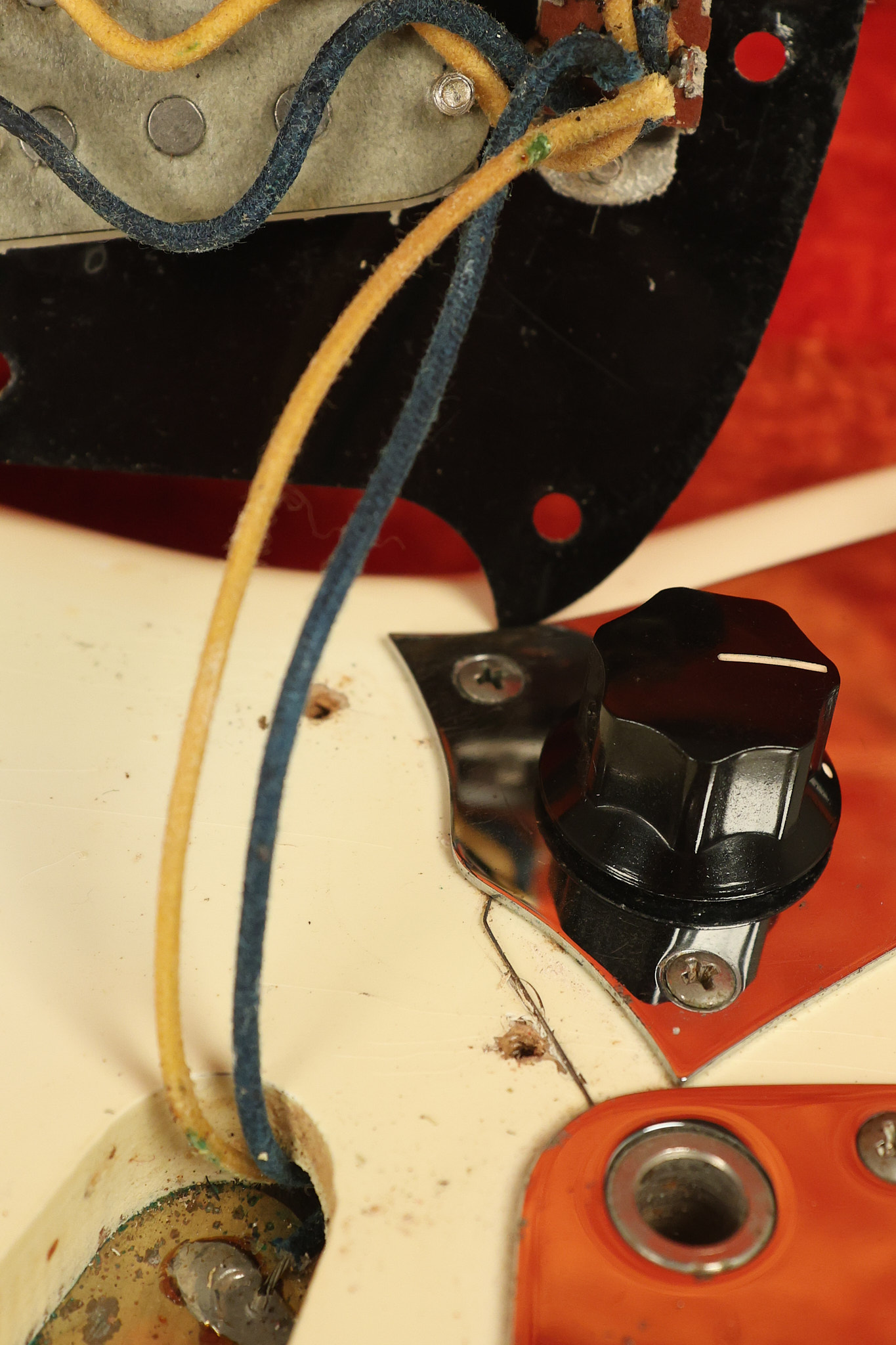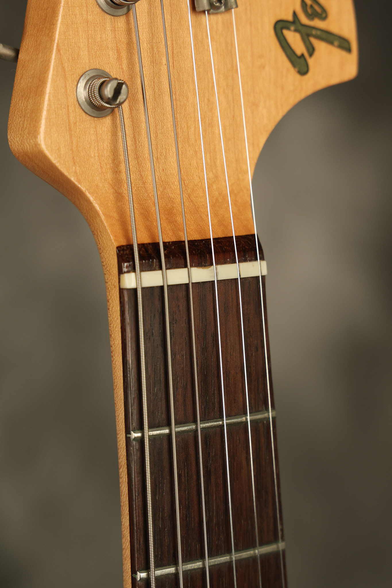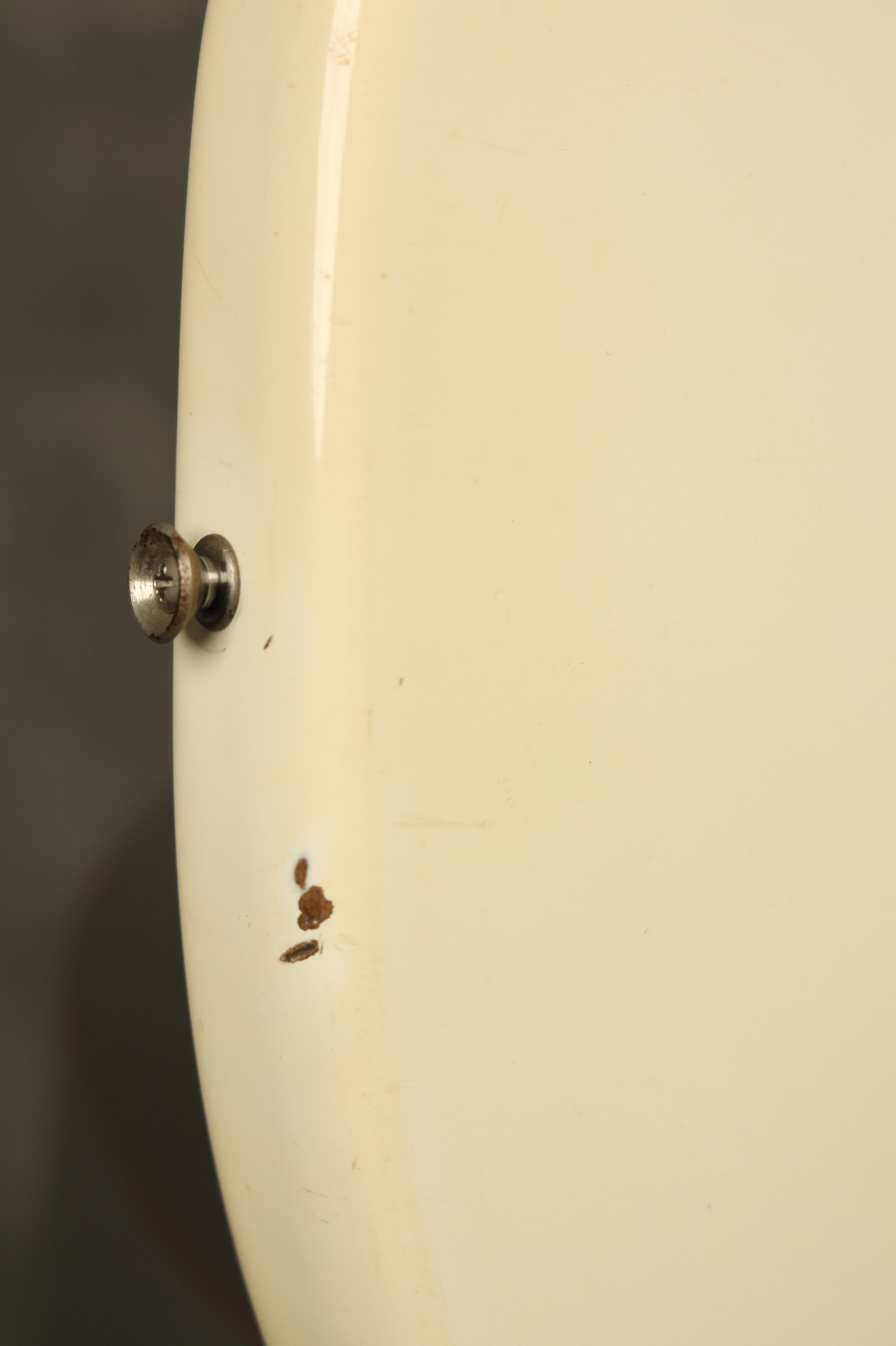 1967 Fender Mustang in its original White finish. It has a great playing neck with good frets. It includes the original tremolo arm and original hardshell case. It's in very good condition with some minor nicks + dings, finish checking on the headstock and other minor cosmetic wear including a very faint ring of discoloration on the back of the body which is barely visible. There is a small beveled washer in one of the screw holes for one of the switches where the hole was too wide for the screw. The guitar itself remains structurally sound with no cracks, breaks or repairs. All electronics work and sound great.