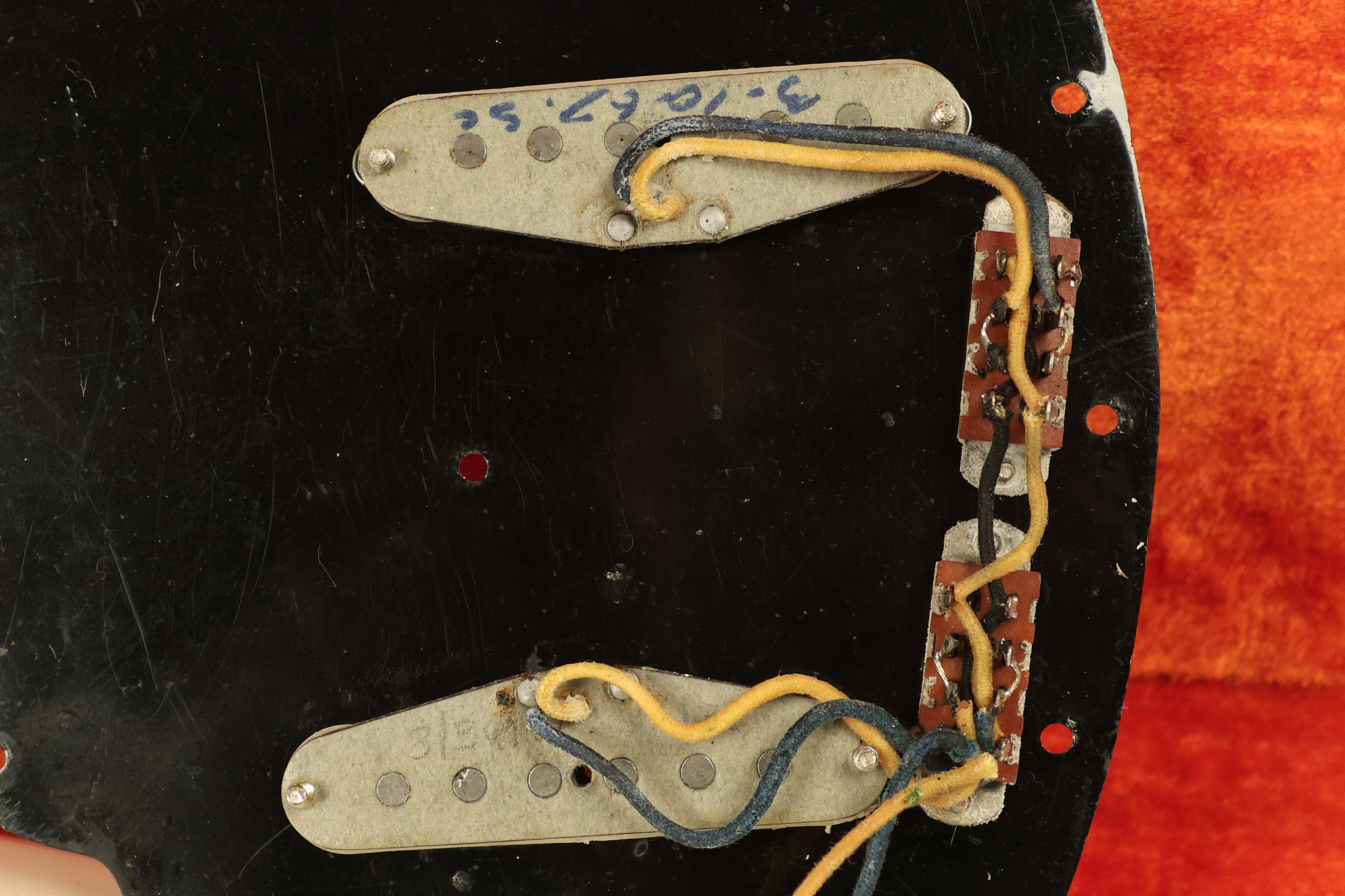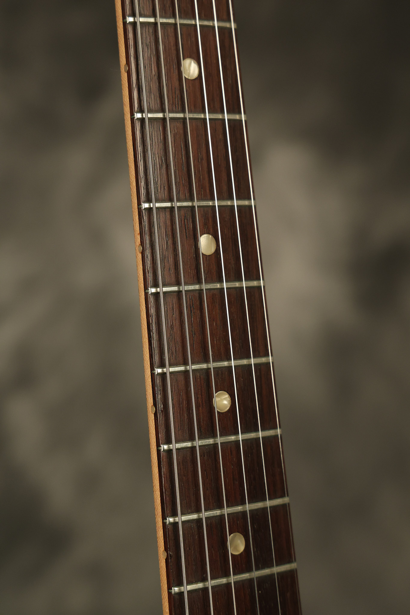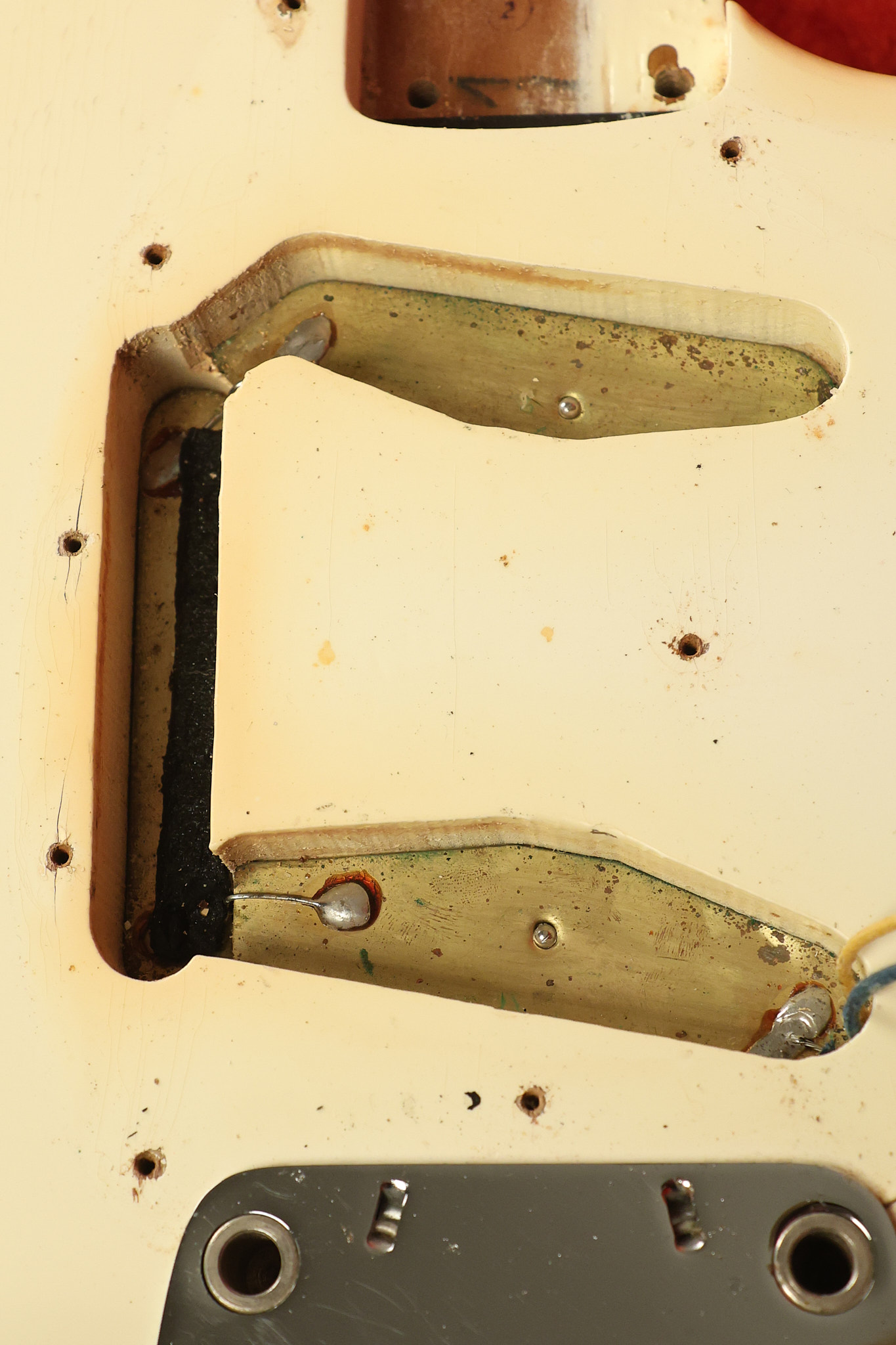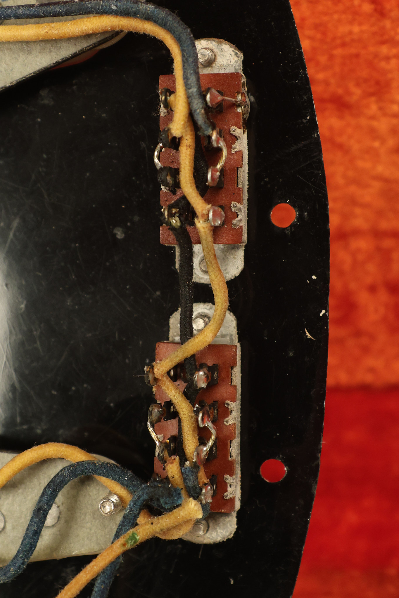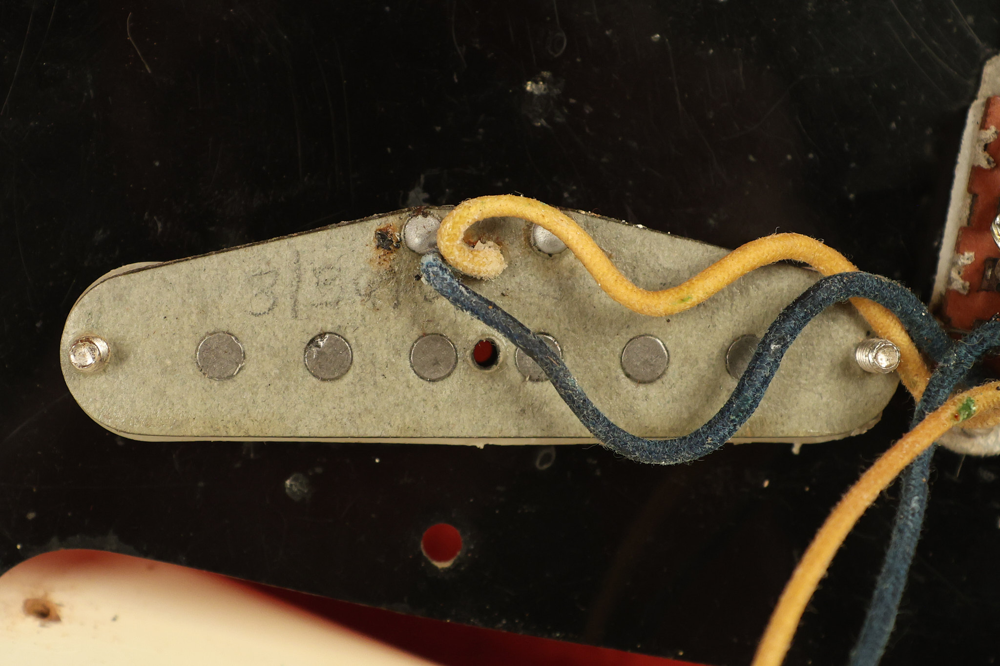 1967 Fender Mustang in its original White finish. It has a great playing neck with good frets. It includes the original tremolo arm and original hardshell case. It's in very good condition with some minor nicks + dings, finish checking on the headstock and other minor cosmetic wear including a very faint ring of discoloration on the back of the body which is barely visible. There is a small beveled washer in one of the screw holes for one of the switches where the hole was too wide for the screw. The guitar itself remains structurally sound with no cracks, breaks or repairs. All electronics work and sound great.