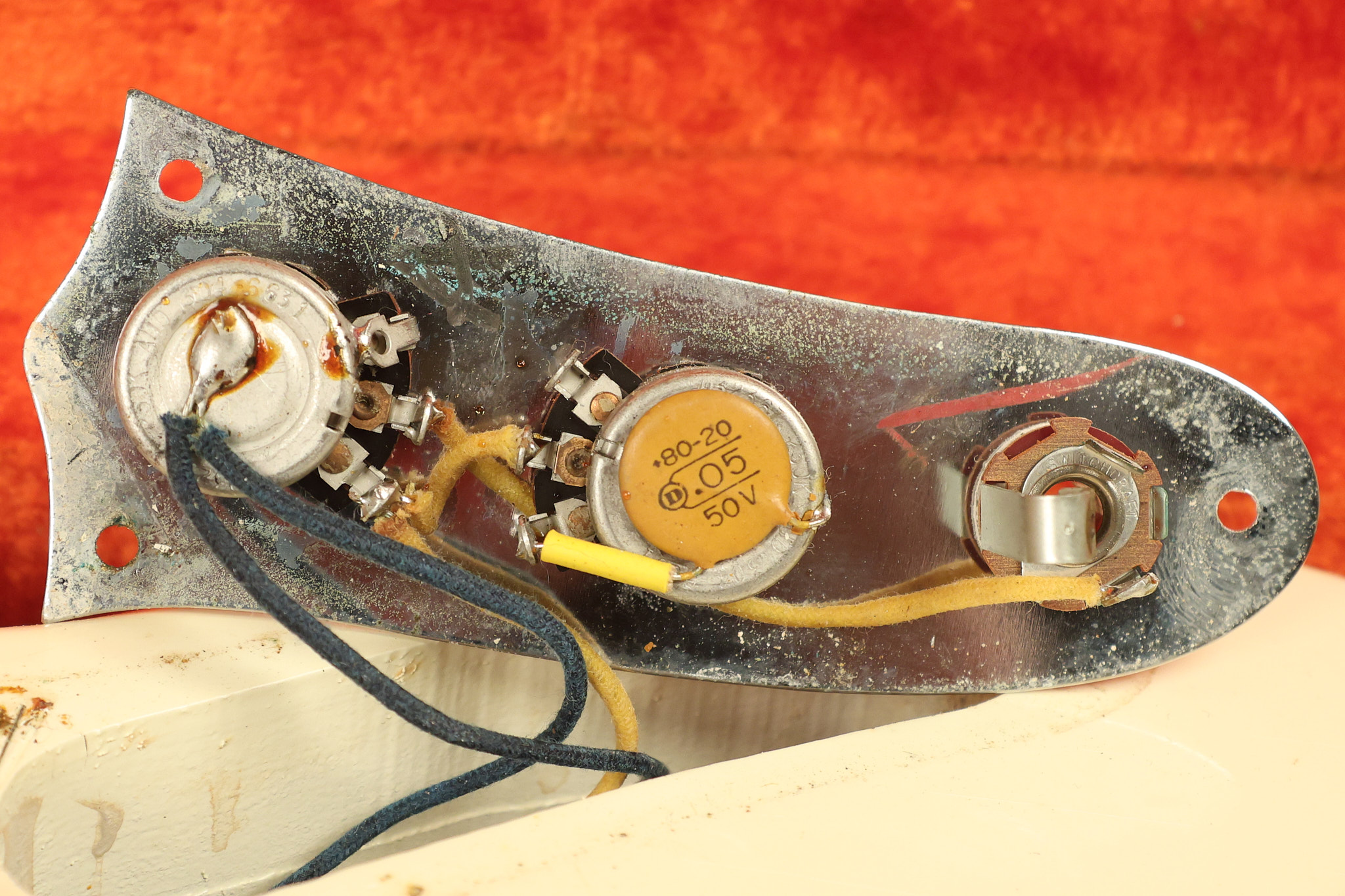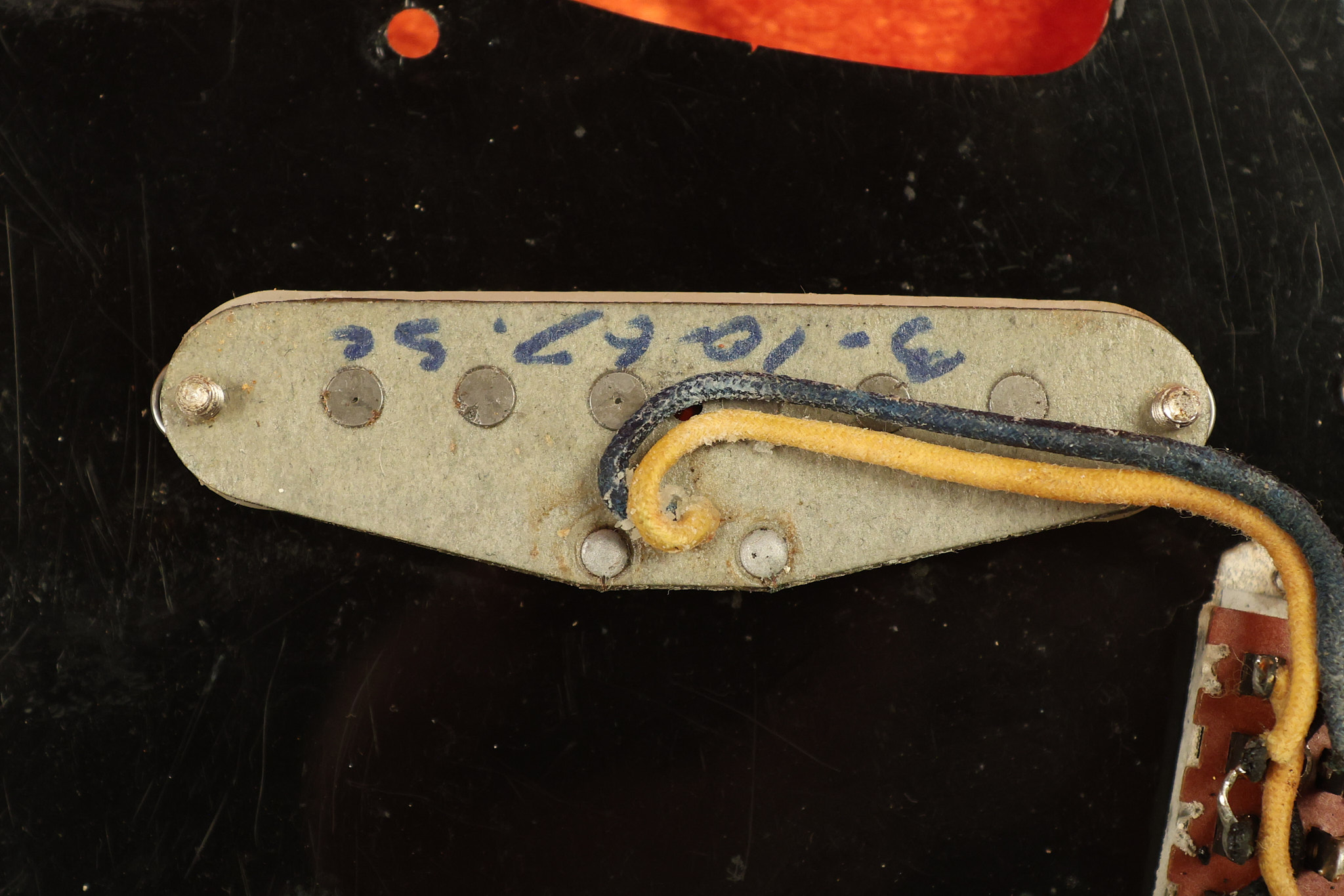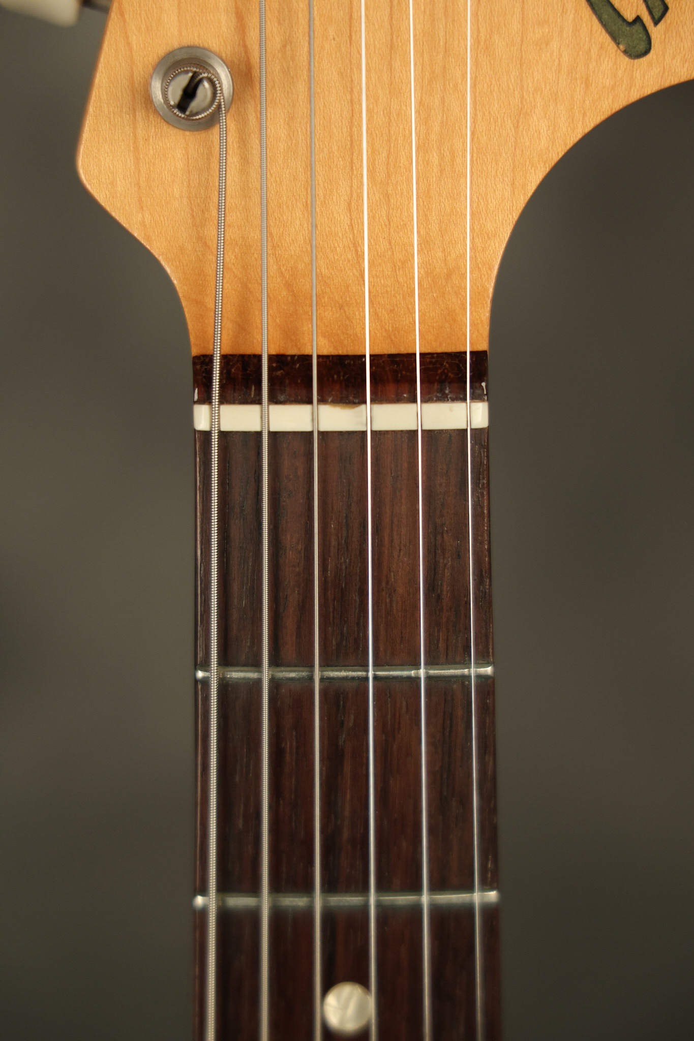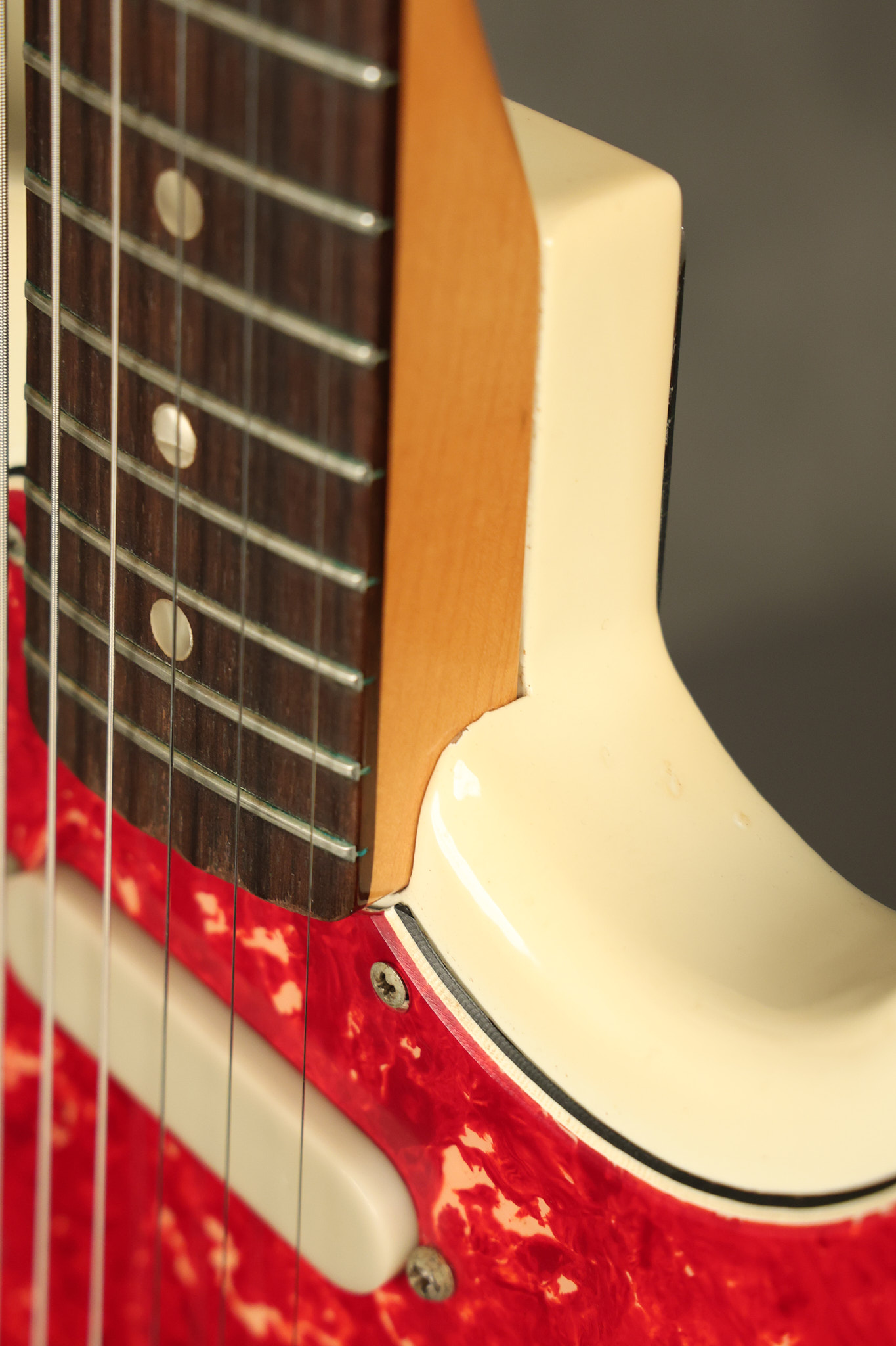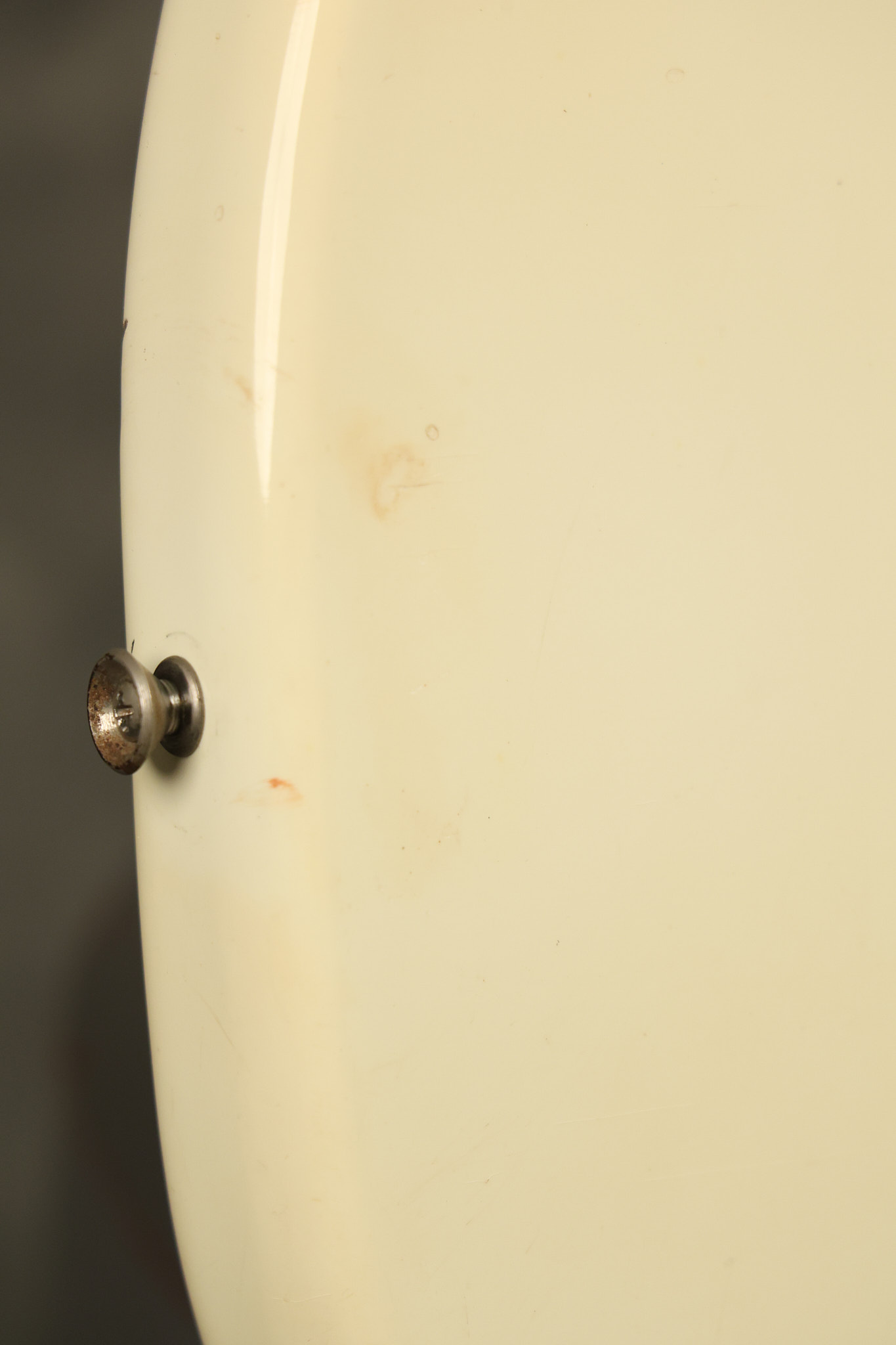 1967 Fender Mustang in its original White finish. It has a great playing neck with good frets. It includes the original tremolo arm and original hardshell case. It's in very good condition with some minor nicks + dings, finish checking on the headstock and other minor cosmetic wear including a very faint ring of discoloration on the back of the body which is barely visible. There is a small beveled washer in one of the screw holes for one of the switches where the hole was too wide for the screw. The guitar itself remains structurally sound with no cracks, breaks or repairs. All electronics work and sound great.