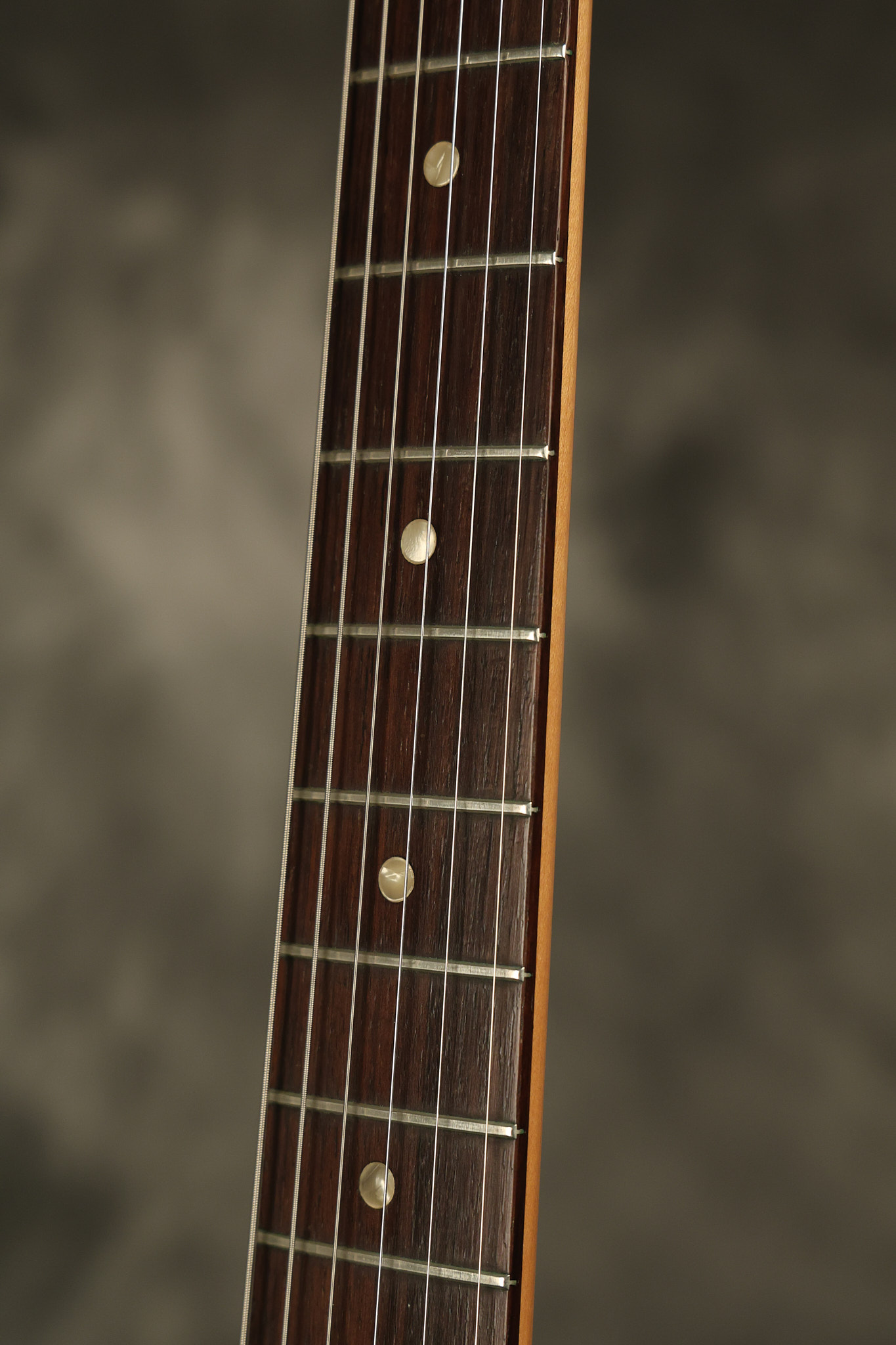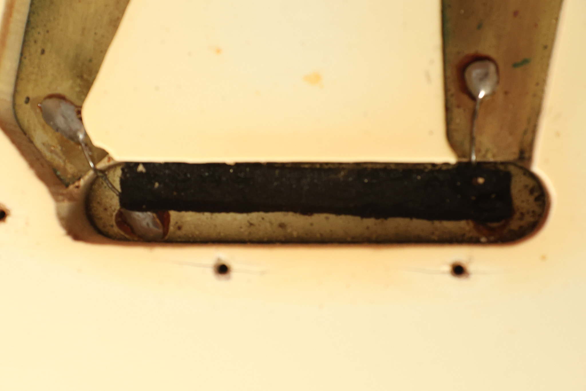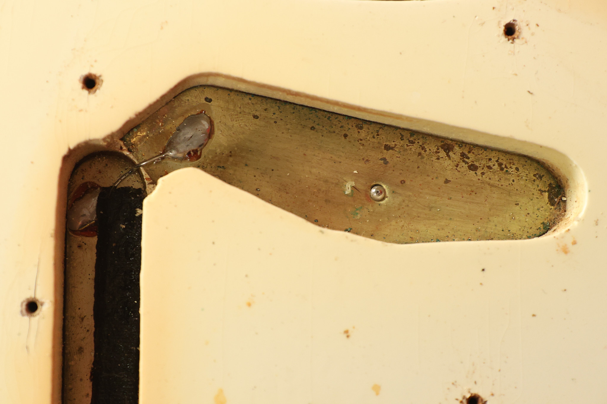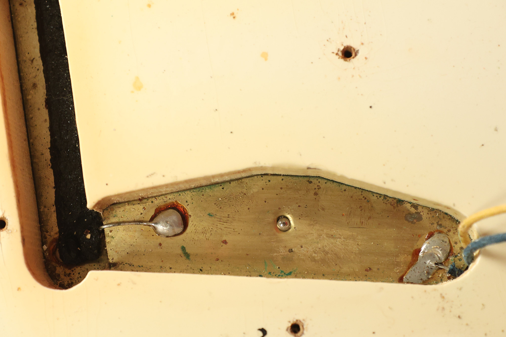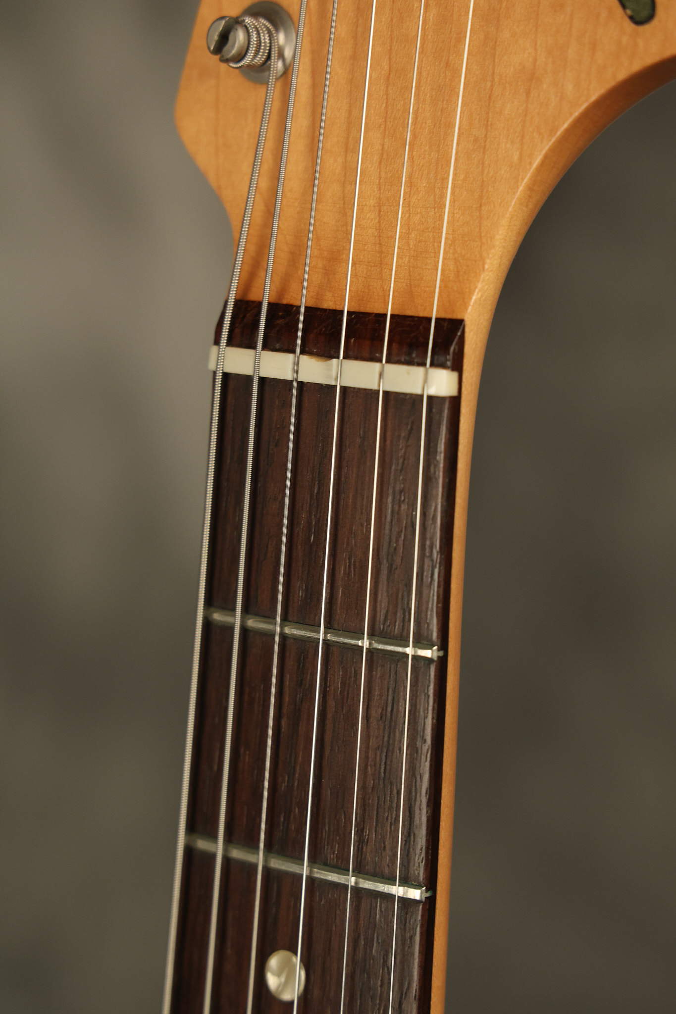 1967 Fender Mustang in its original White finish. It has a great playing neck with good frets. It includes the original tremolo arm and original hardshell case. It's in very good condition with some minor nicks + dings, finish checking on the headstock and other minor cosmetic wear including a very faint ring of discoloration on the back of the body which is barely visible. There is a small beveled washer in one of the screw holes for one of the switches where the hole was too wide for the screw. The guitar itself remains structurally sound with no cracks, breaks or repairs. All electronics work and sound great.