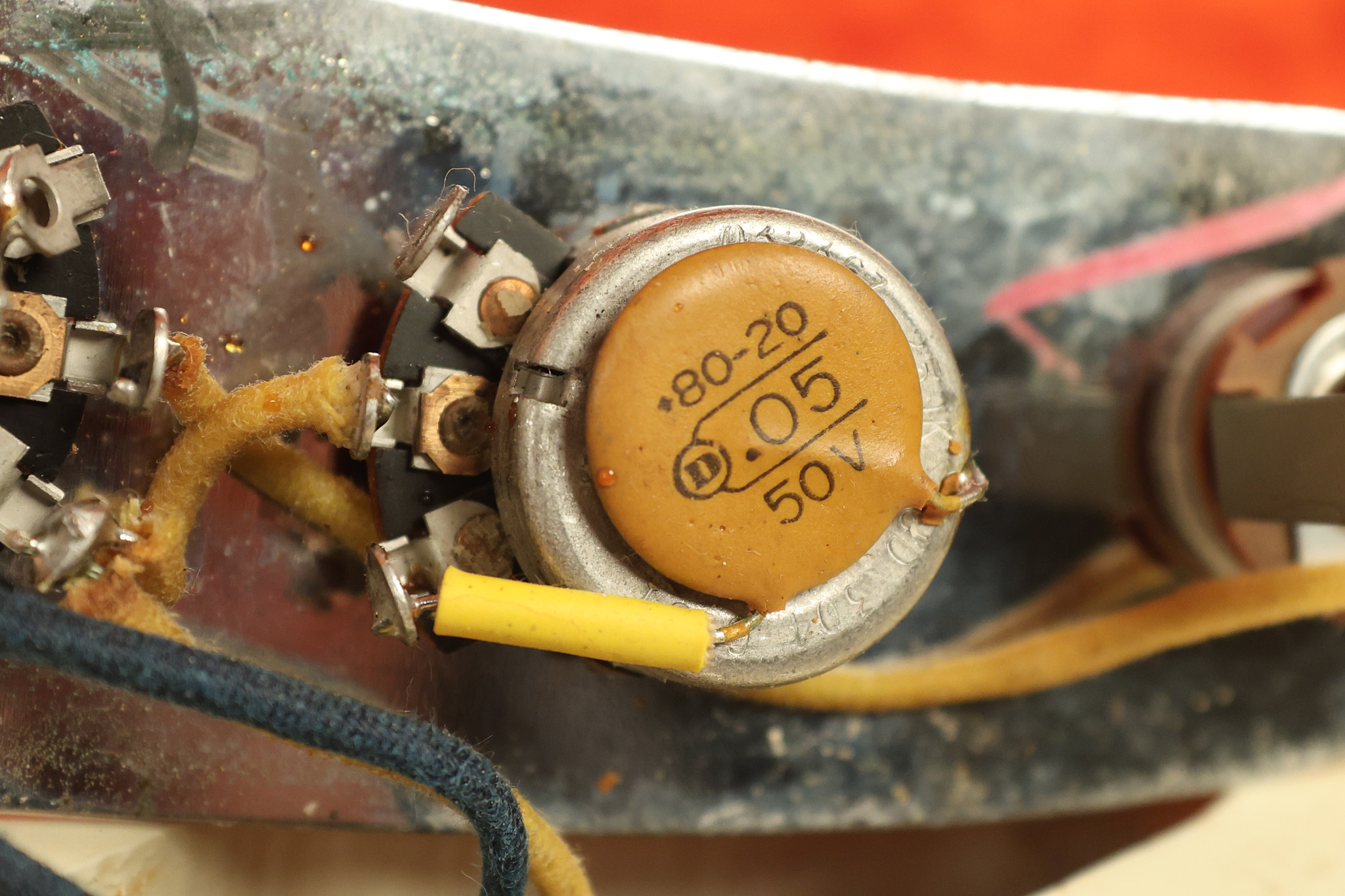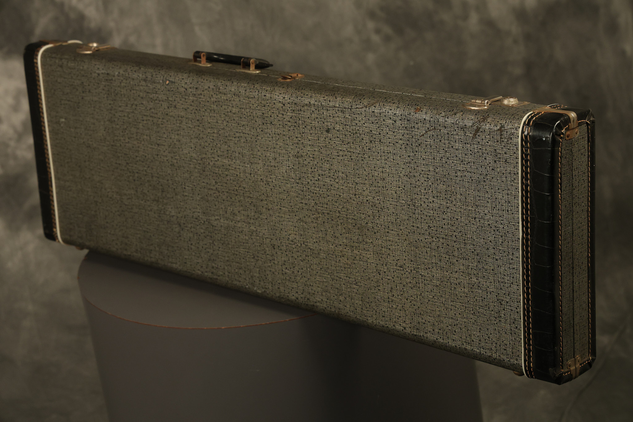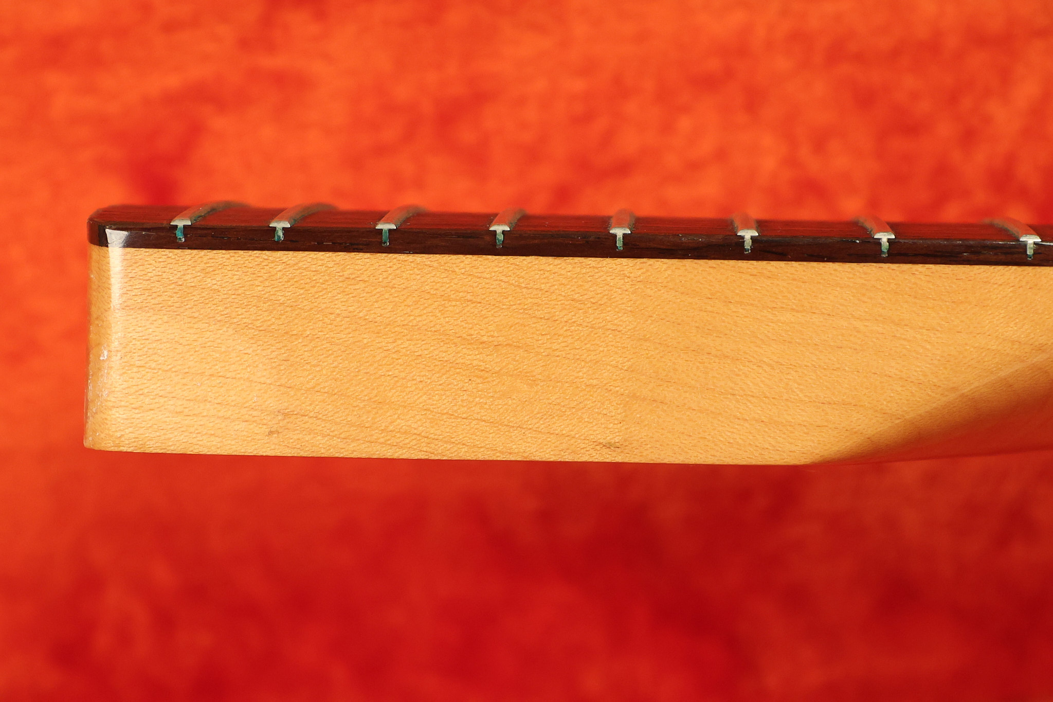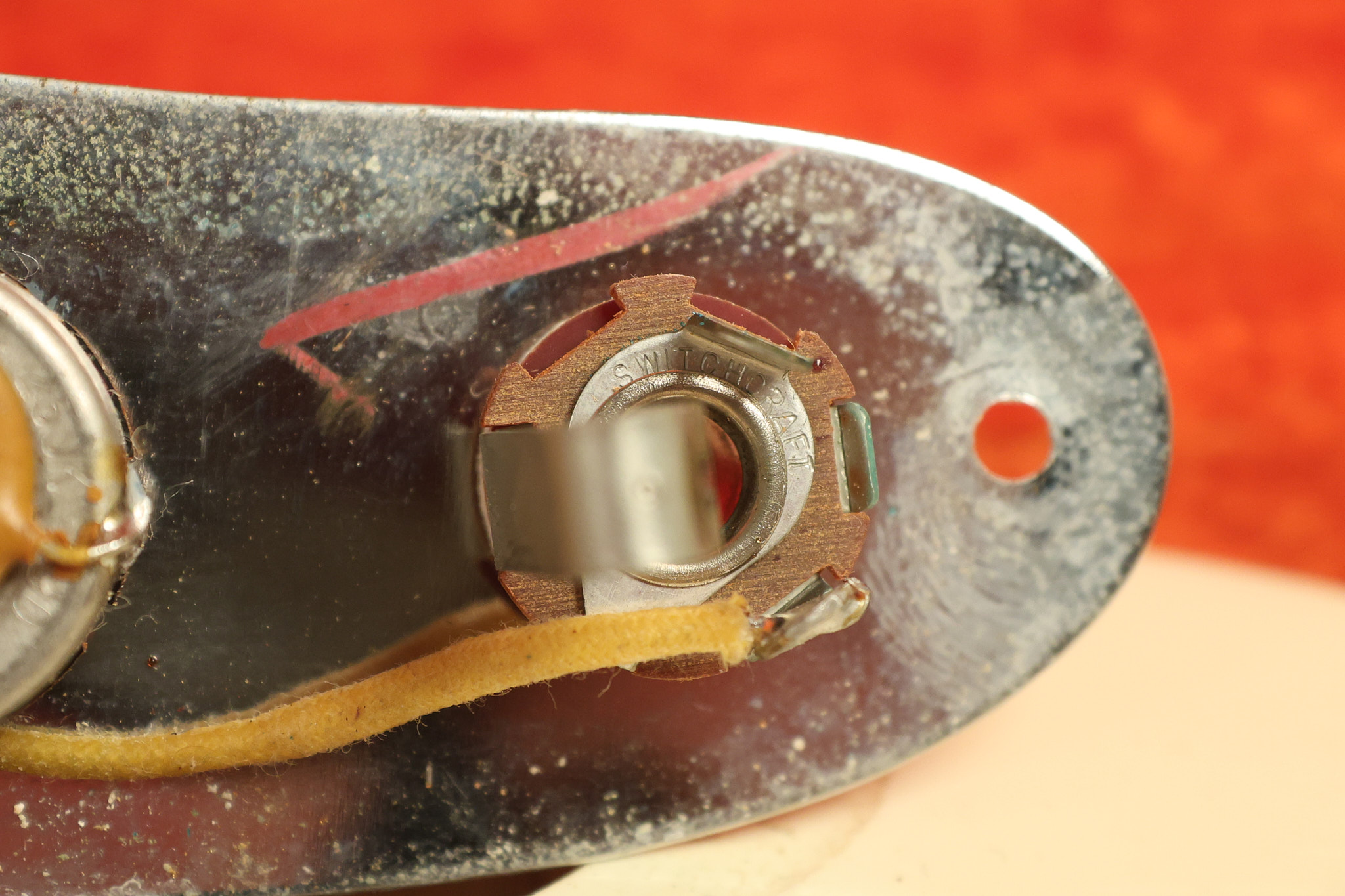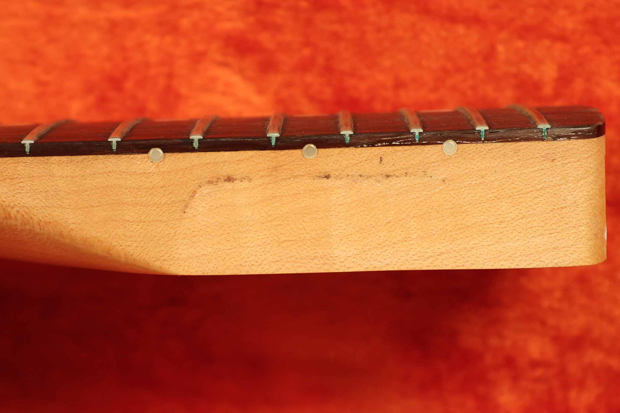 1967 Fender Mustang in its original White finish. It has a great playing neck with good frets. It includes the original tremolo arm and original hardshell case. It's in very good condition with some minor nicks + dings, finish checking on the headstock and other minor cosmetic wear including a very faint ring of discoloration on the back of the body which is barely visible. There is a small beveled washer in one of the screw holes for one of the switches where the hole was too wide for the screw. The guitar itself remains structurally sound with no cracks, breaks or repairs. All electronics work and sound great.