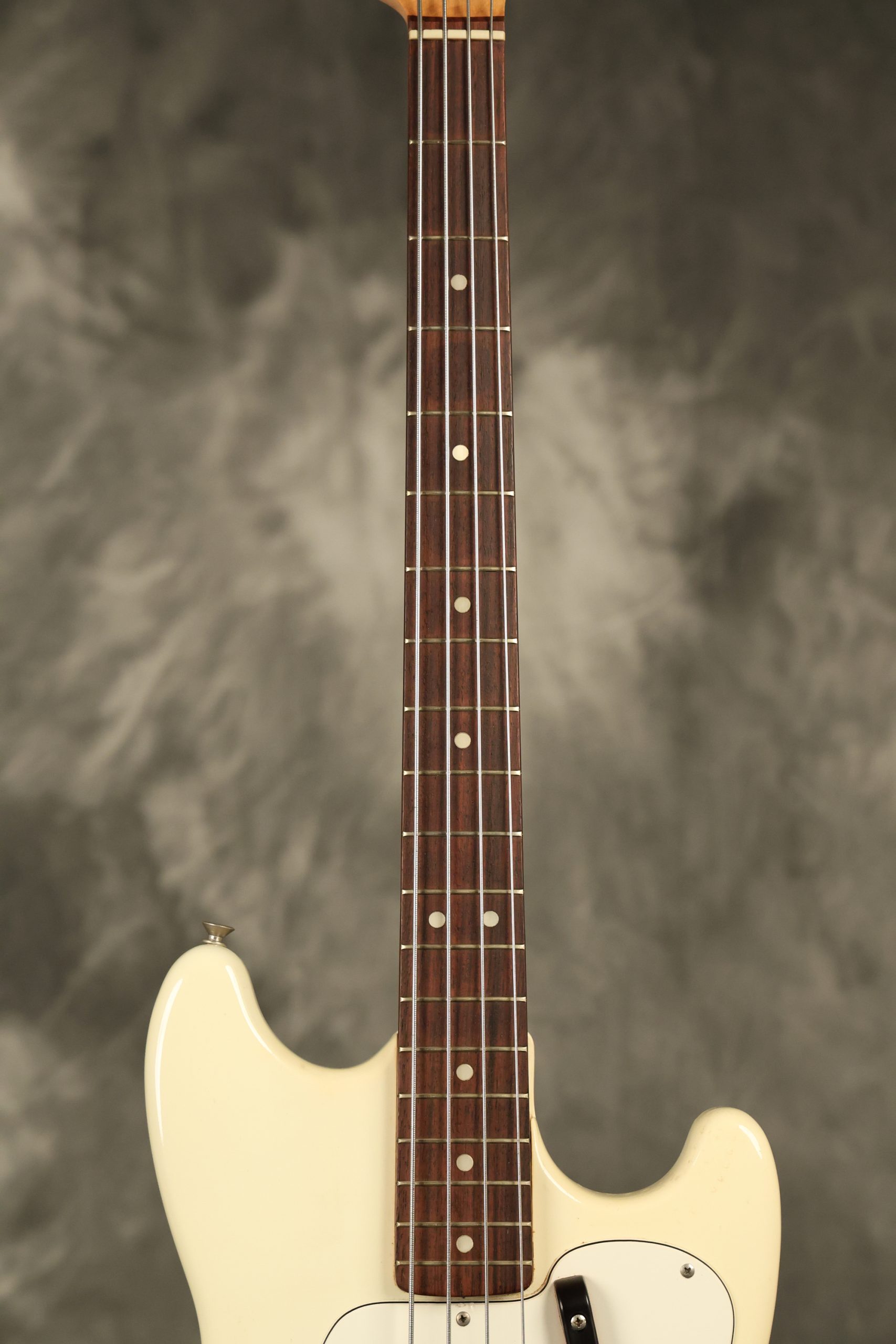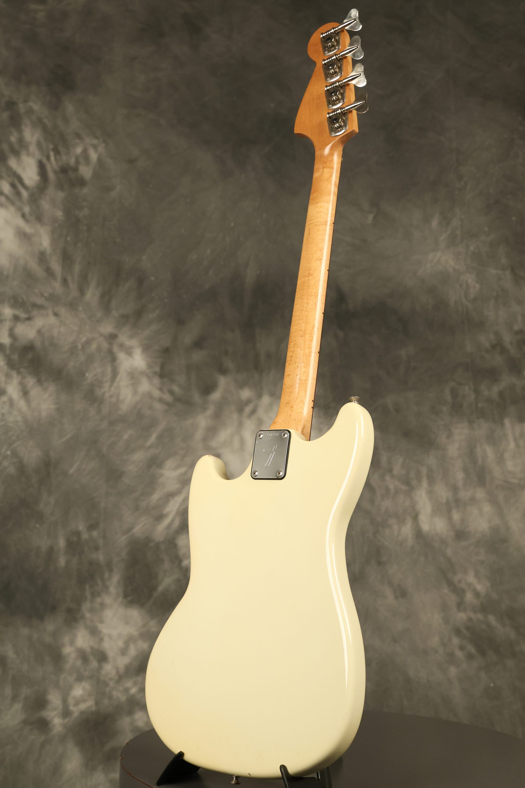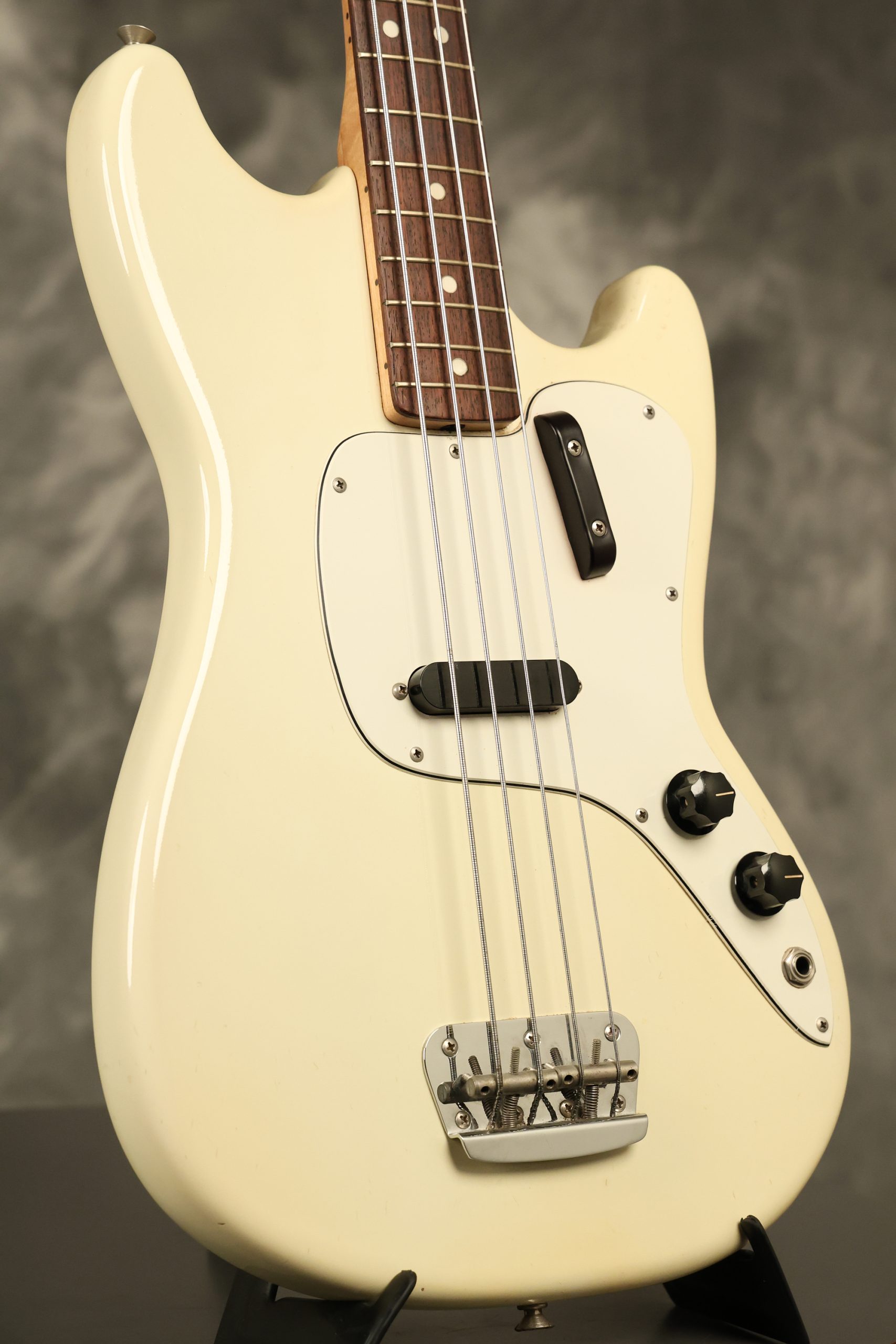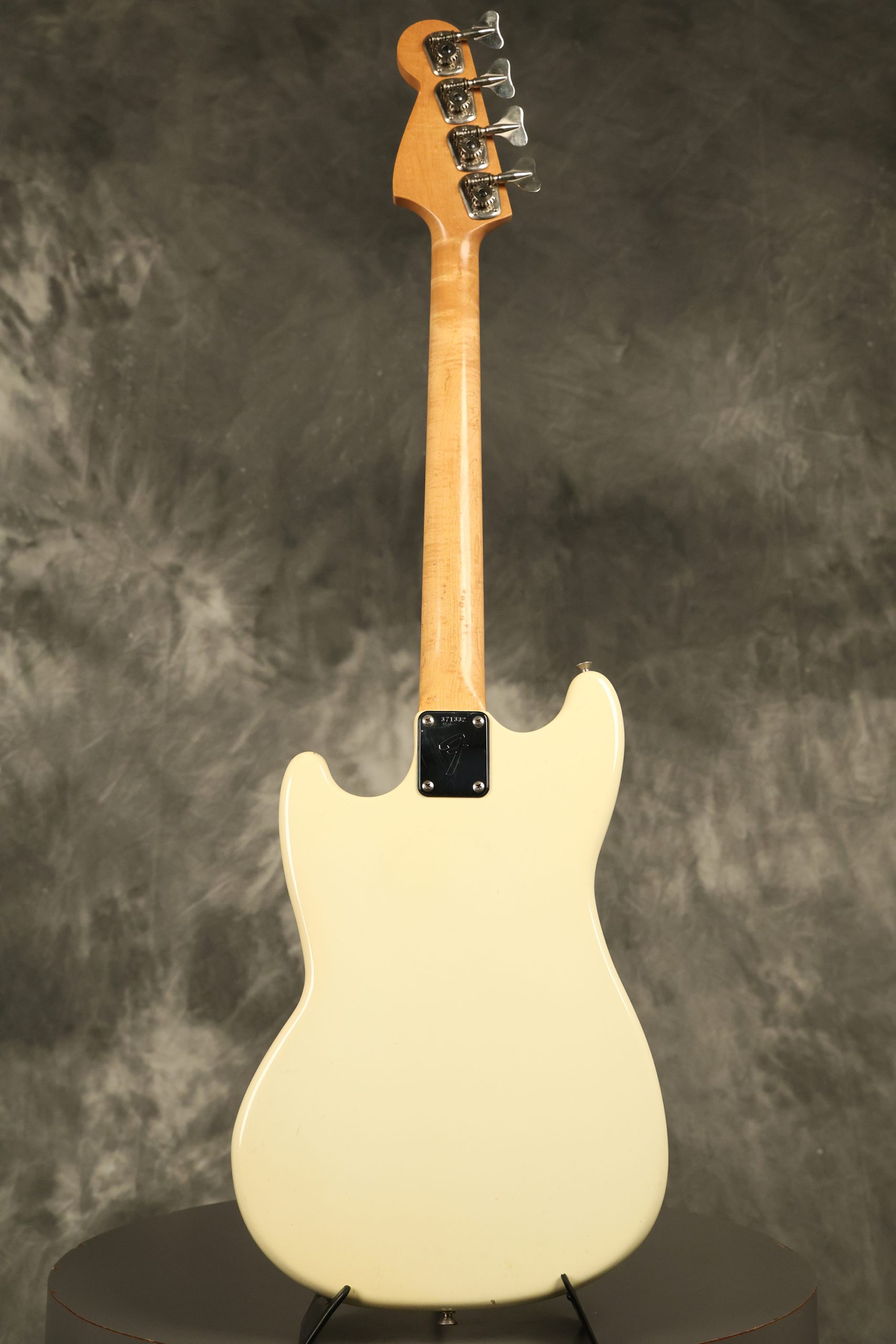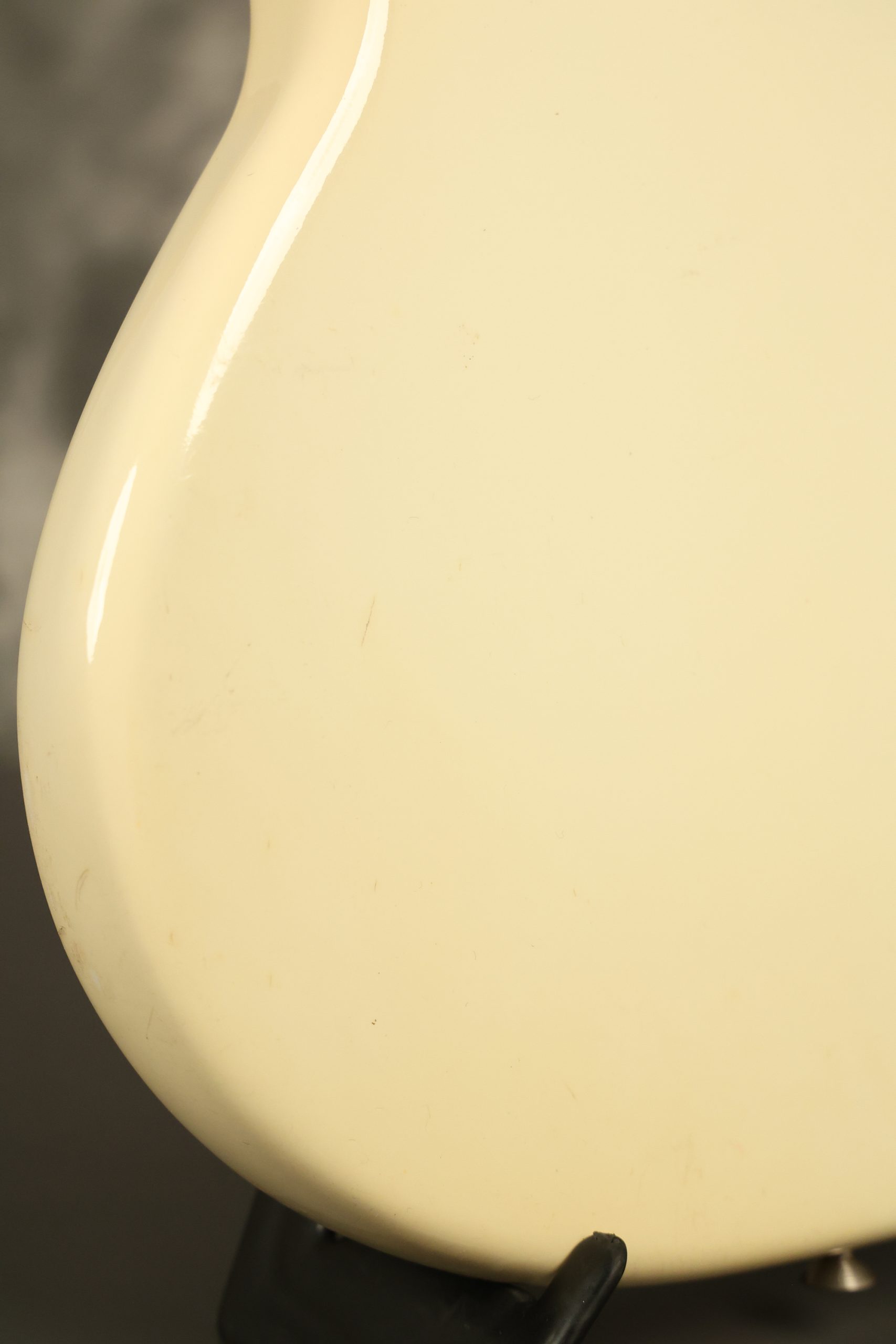 1972 Fender Musicmaster Bass in its original White finish. It has a great playing neck with good frets. It's all original with the exception of the pots and a resistor. A later Fender hardshell case is included. This Musicmaster bass looks good with some nicks + dings and other cosmetic wear including impressions in the finish on the back of the neck and body caused by an old guitar cable laying underneath it while stored in the case. The bass itself remains structurally sound with no cracks, breaks or repairs. All electronics work and sound great.