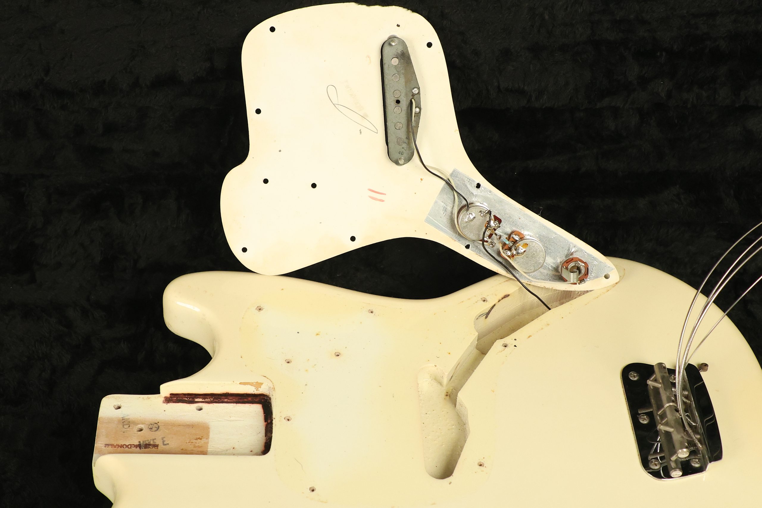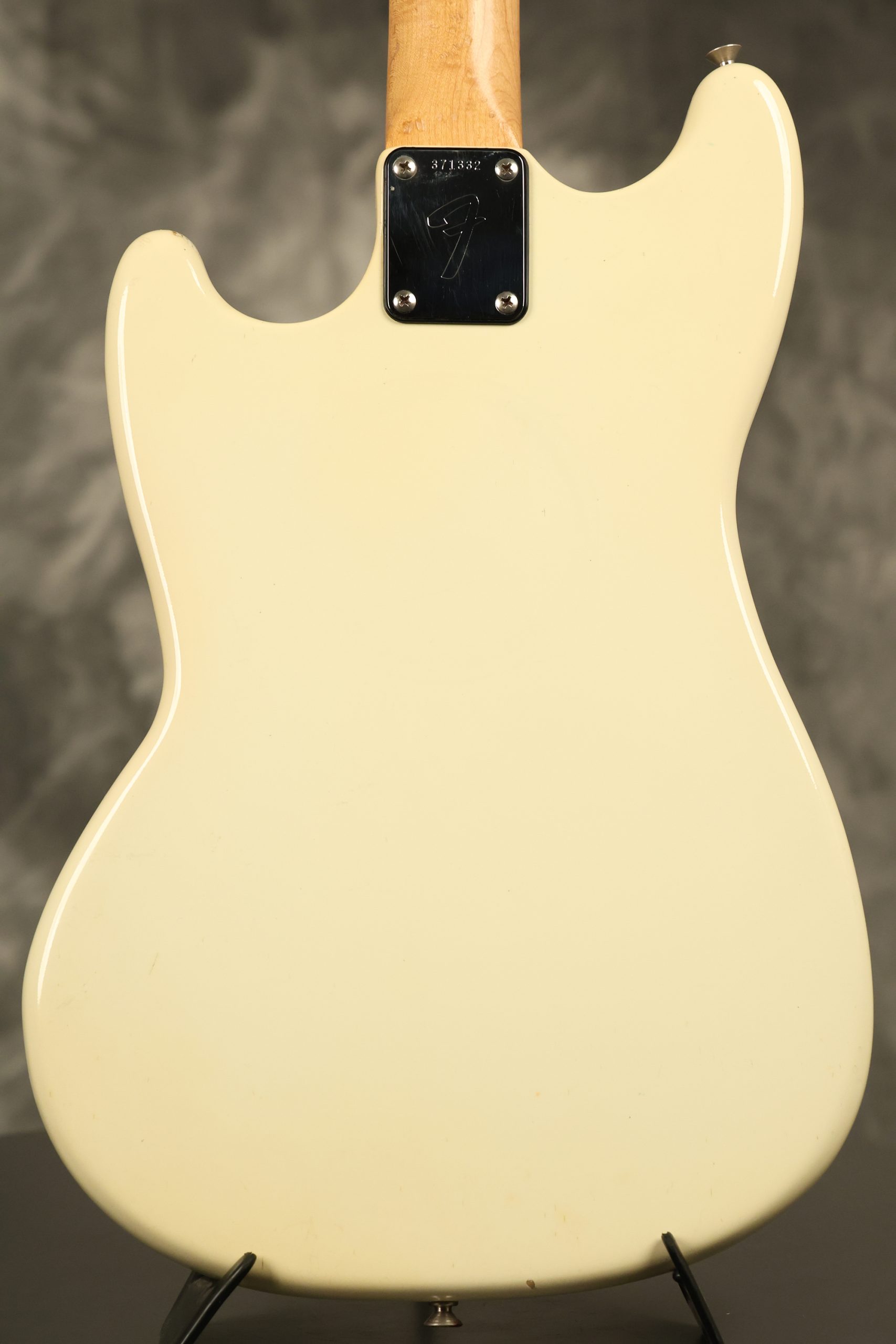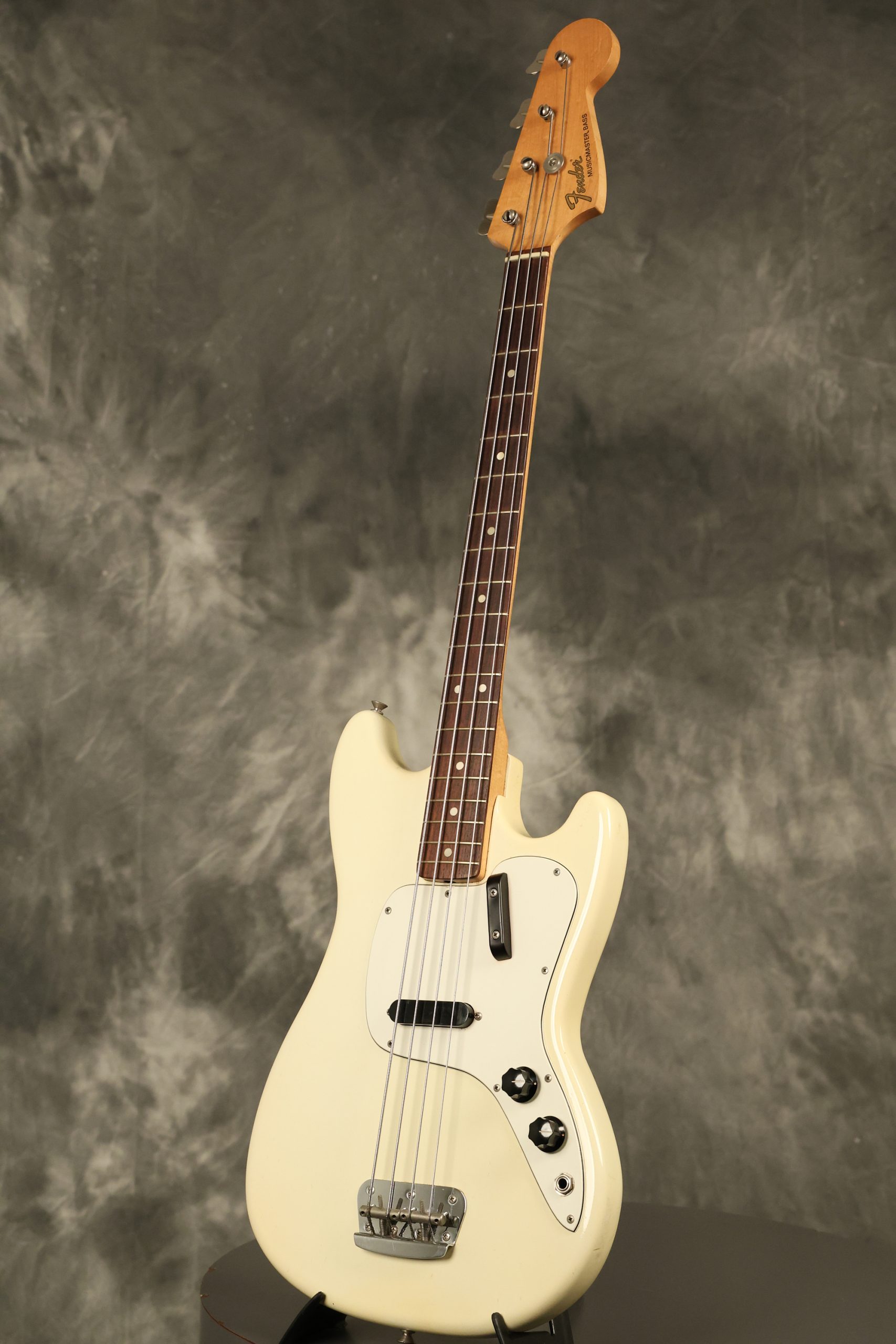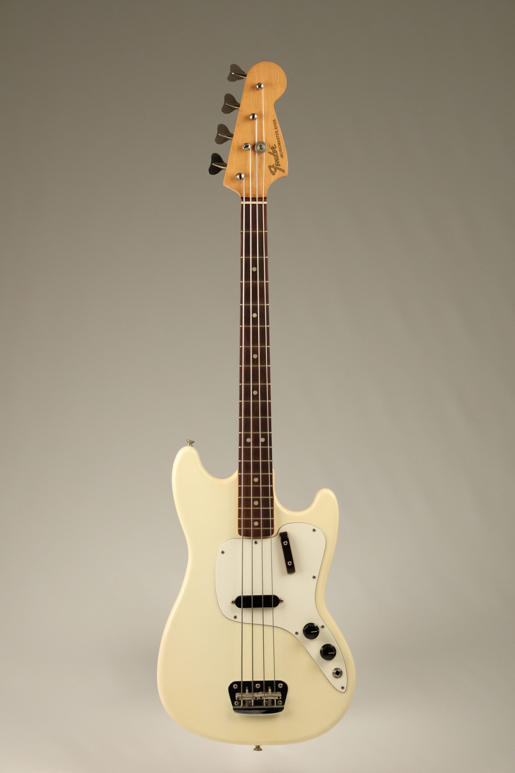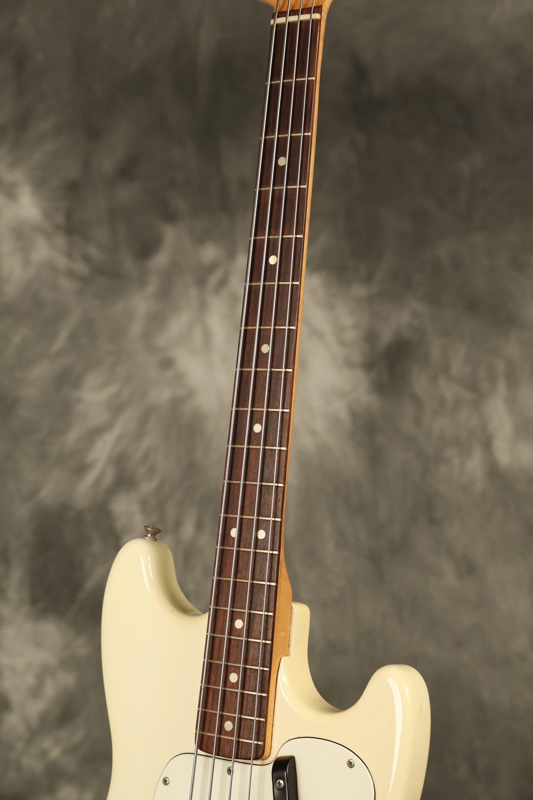 1972 Fender Musicmaster Bass in its original White finish. It has a great playing neck with good frets. It's all original with the exception of the pots and a resistor. A later Fender hardshell case is included. This Musicmaster bass looks good with some nicks + dings and other cosmetic wear including impressions in the finish on the back of the neck and body caused by an old guitar cable laying underneath it while stored in the case. The bass itself remains structurally sound with no cracks, breaks or repairs. All electronics work and sound great.