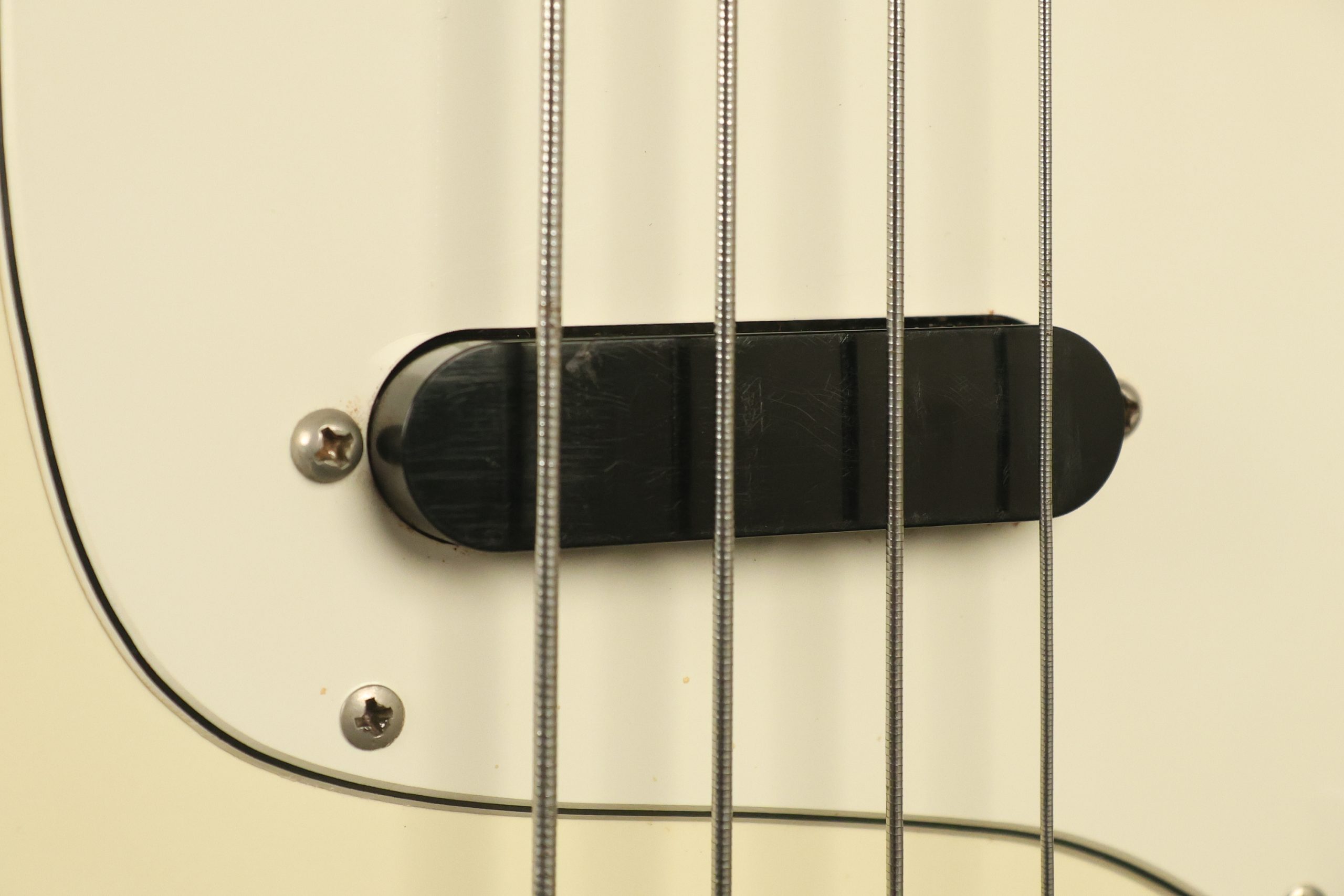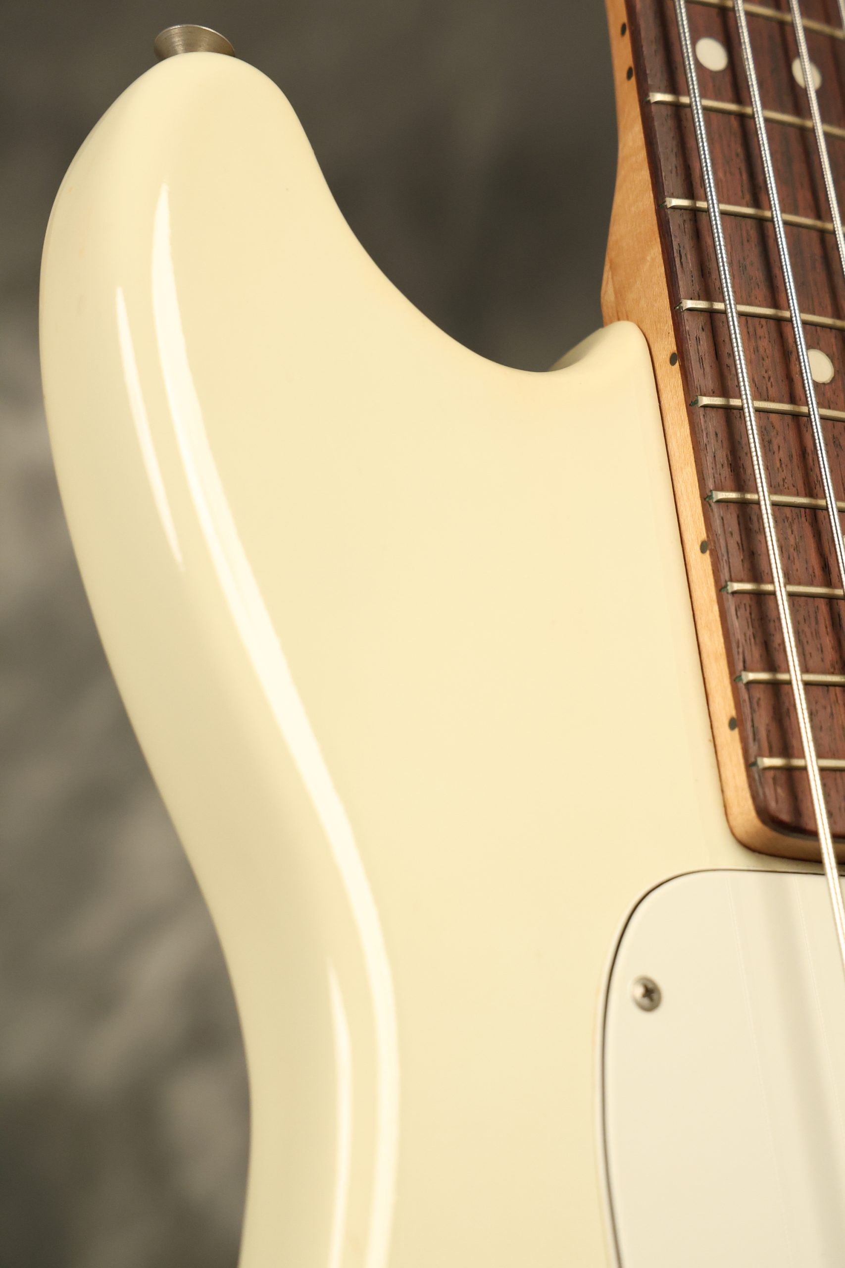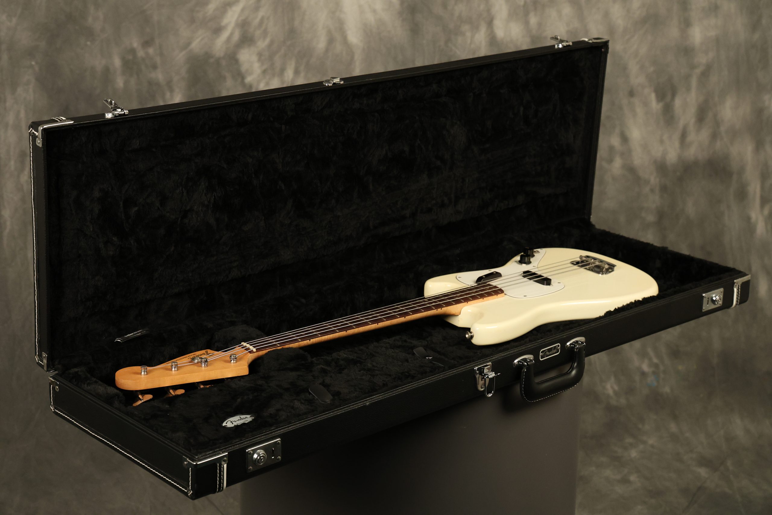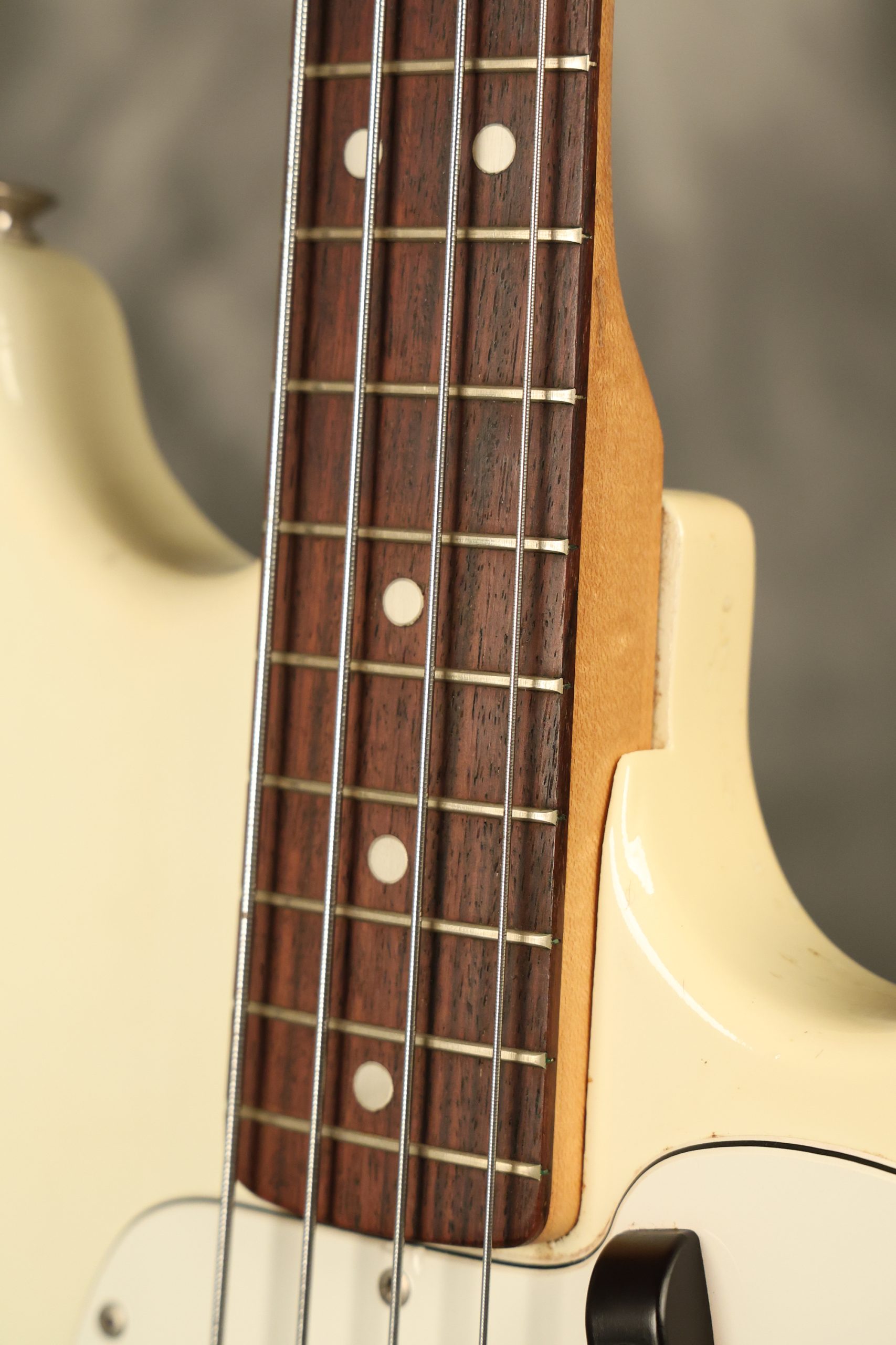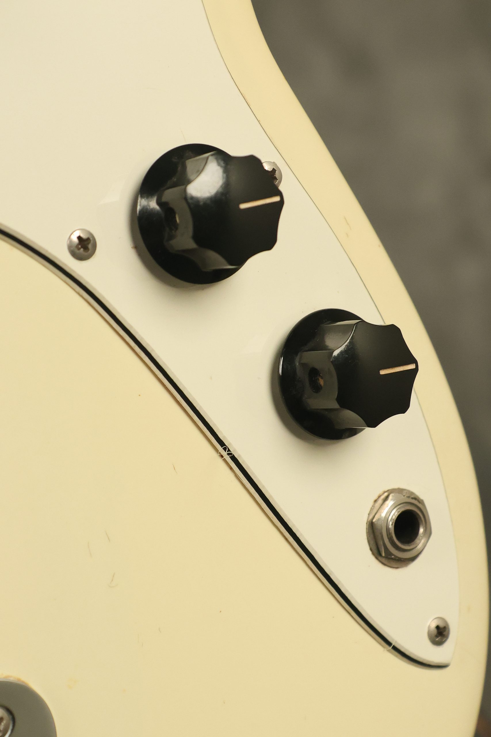 1972 Fender Musicmaster Bass in its original White finish. It has a great playing neck with good frets. It's all original with the exception of the pots and a resistor. A later Fender hardshell case is included. This Musicmaster bass looks good with some nicks + dings and other cosmetic wear including impressions in the finish on the back of the neck and body caused by an old guitar cable laying underneath it while stored in the case. The bass itself remains structurally sound with no cracks, breaks or repairs. All electronics work and sound great.