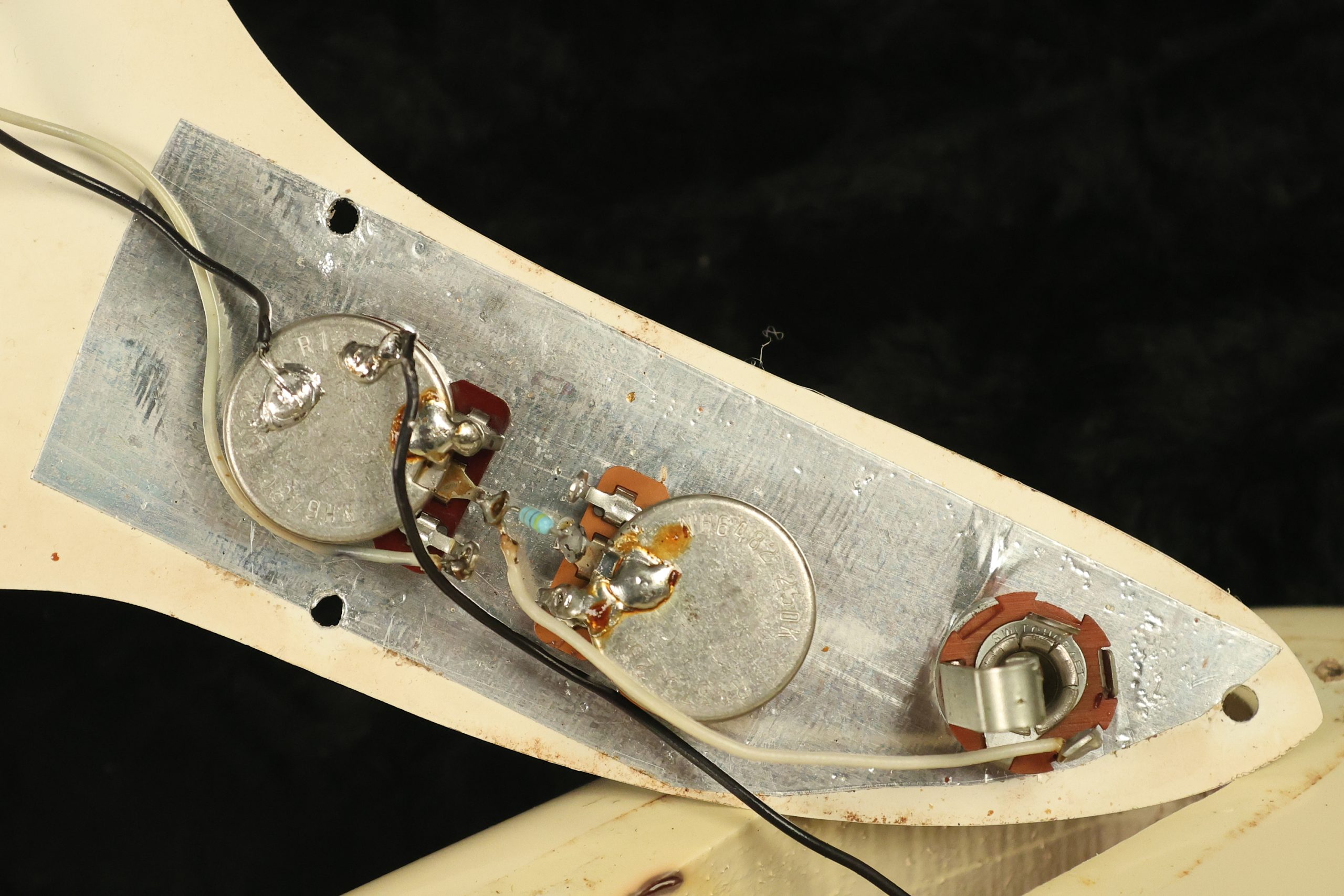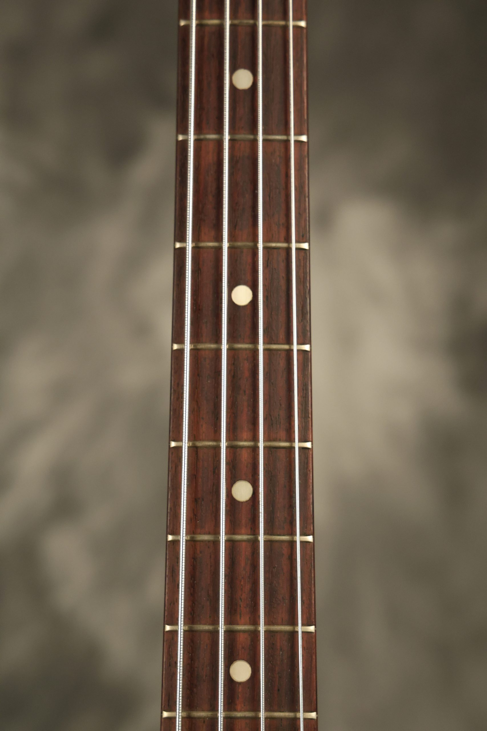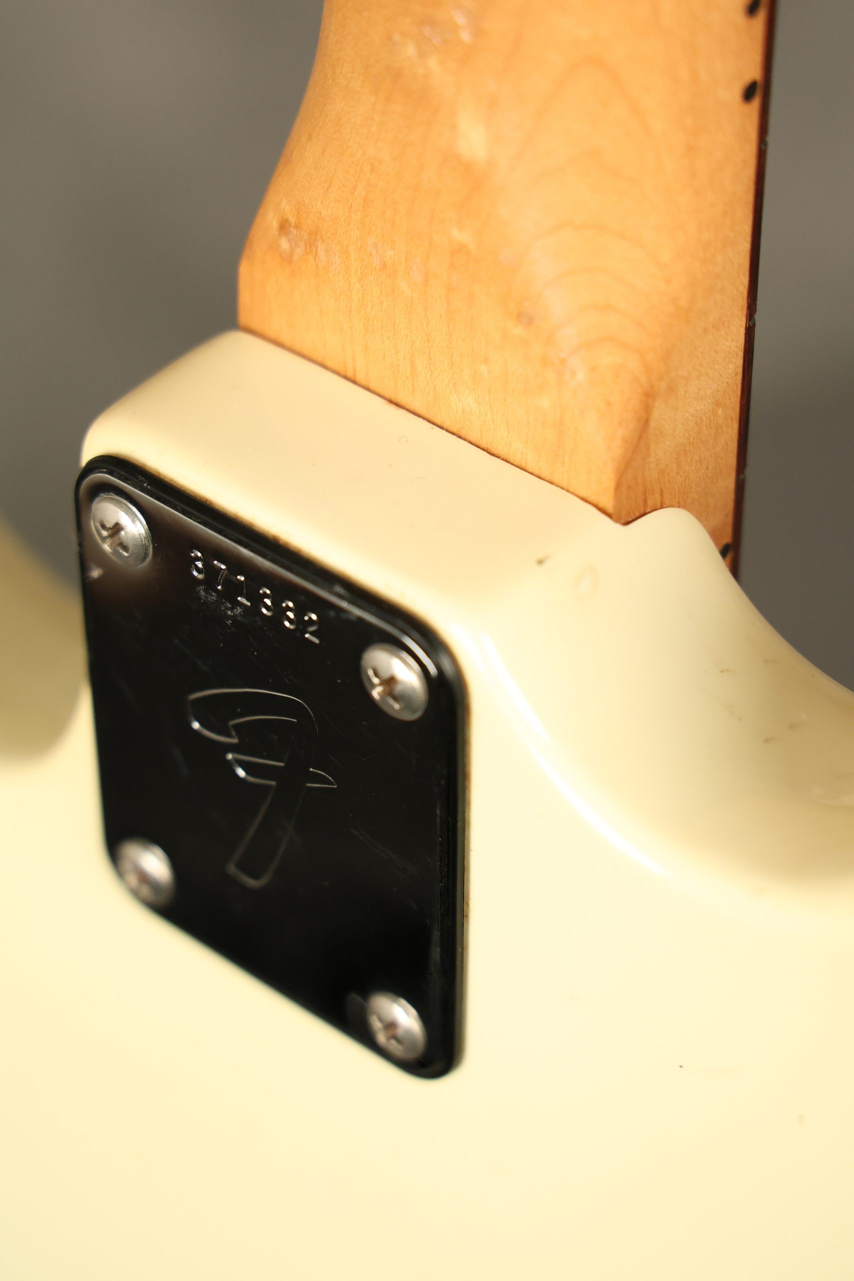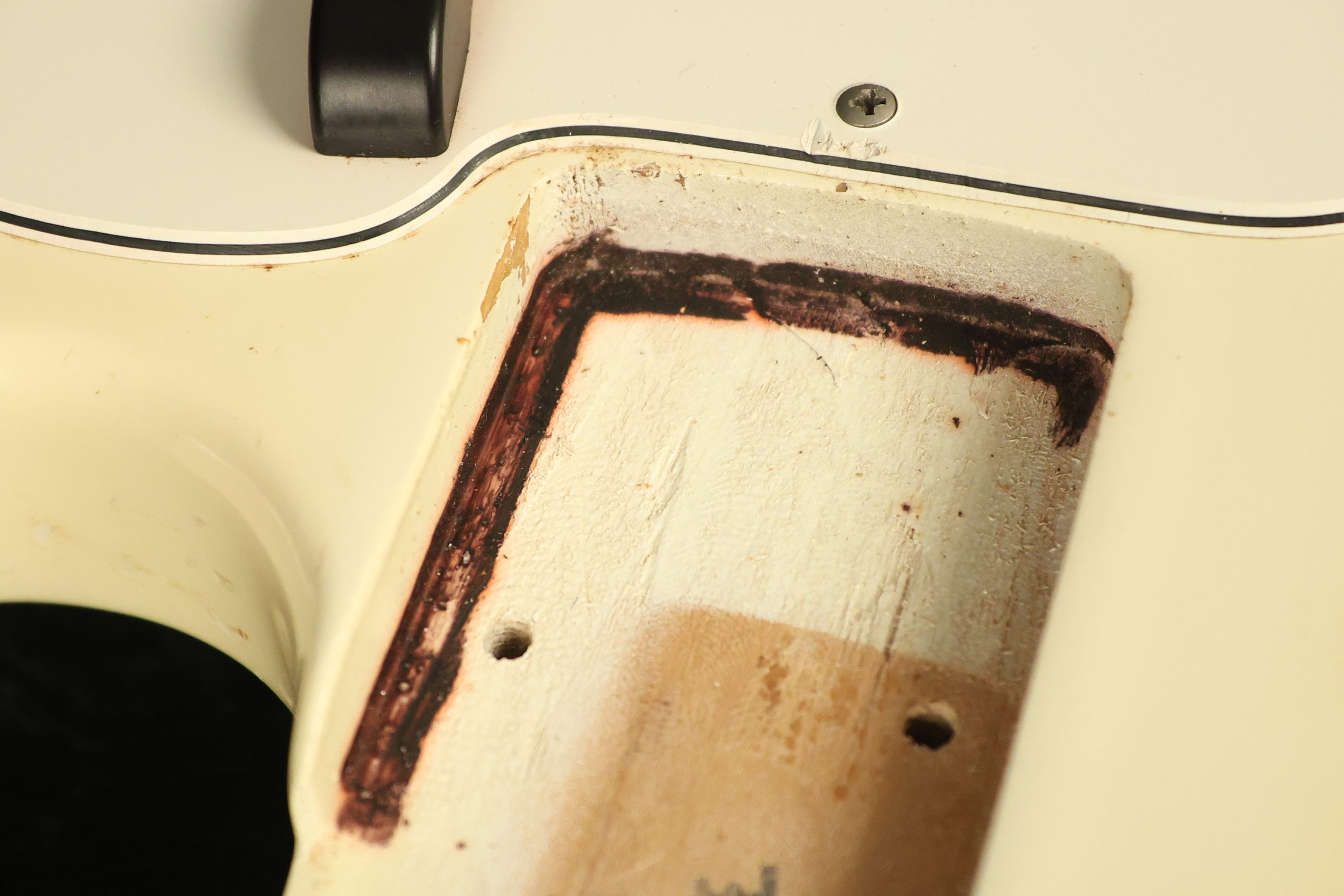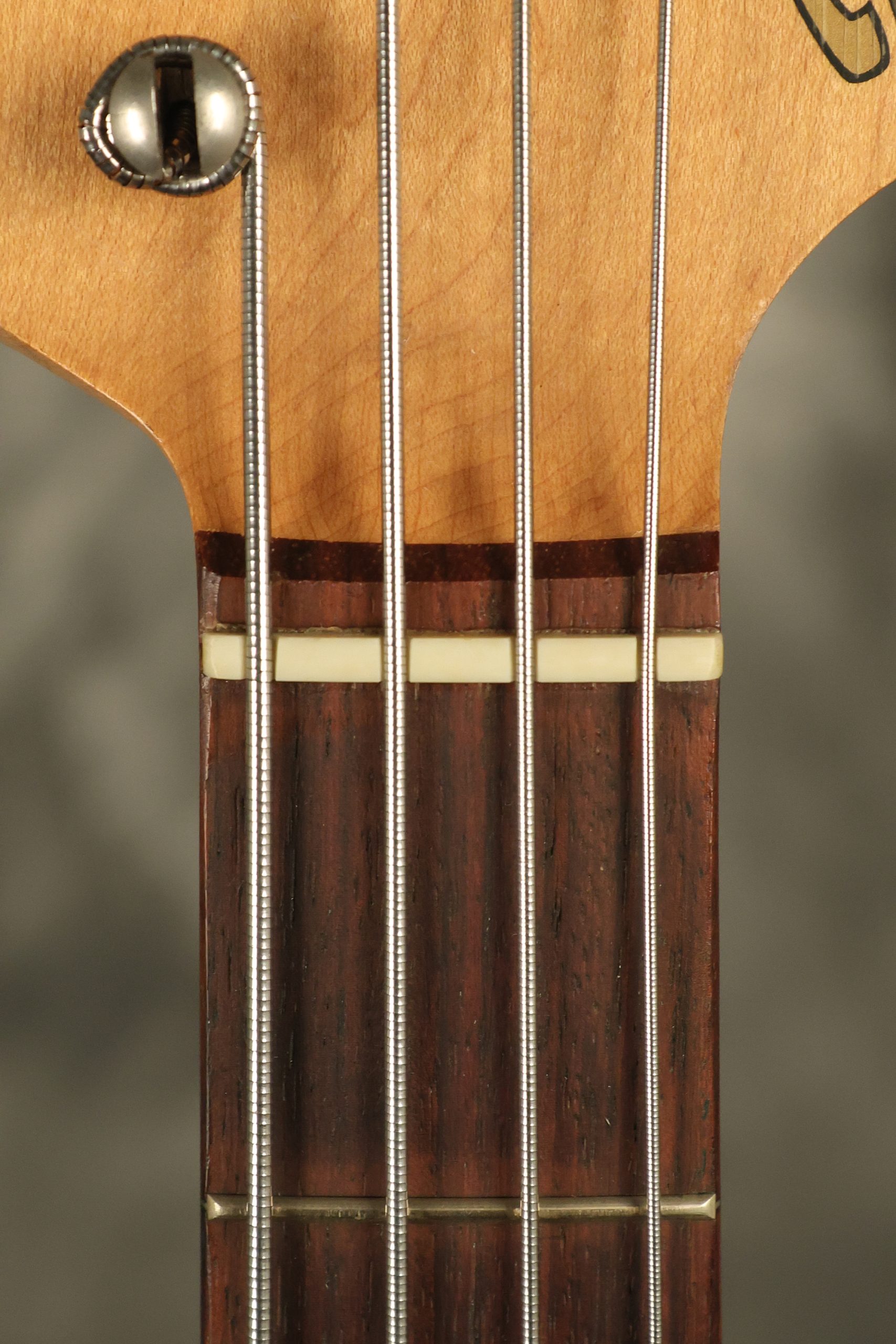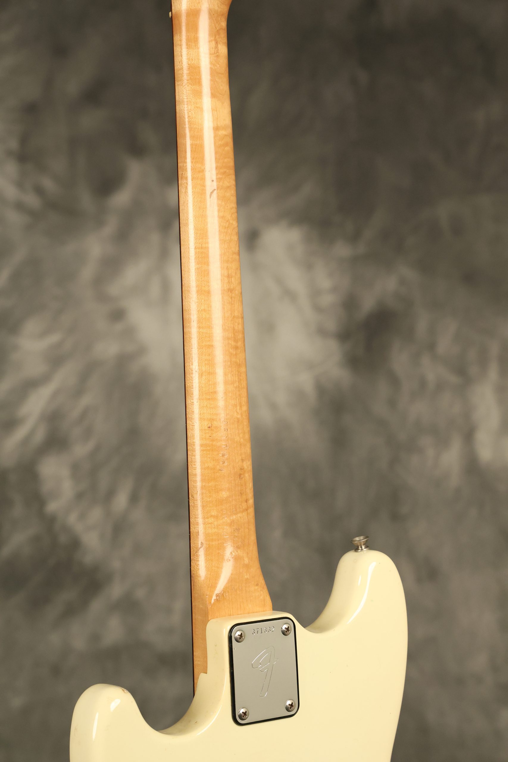 1972 Fender Musicmaster Bass in its original White finish. It has a great playing neck with good frets. It's all original with the exception of the pots and a resistor. A later Fender hardshell case is included. This Musicmaster bass looks good with some nicks + dings and other cosmetic wear including impressions in the finish on the back of the neck and body caused by an old guitar cable laying underneath it while stored in the case. The bass itself remains structurally sound with no cracks, breaks or repairs. All electronics work and sound great.