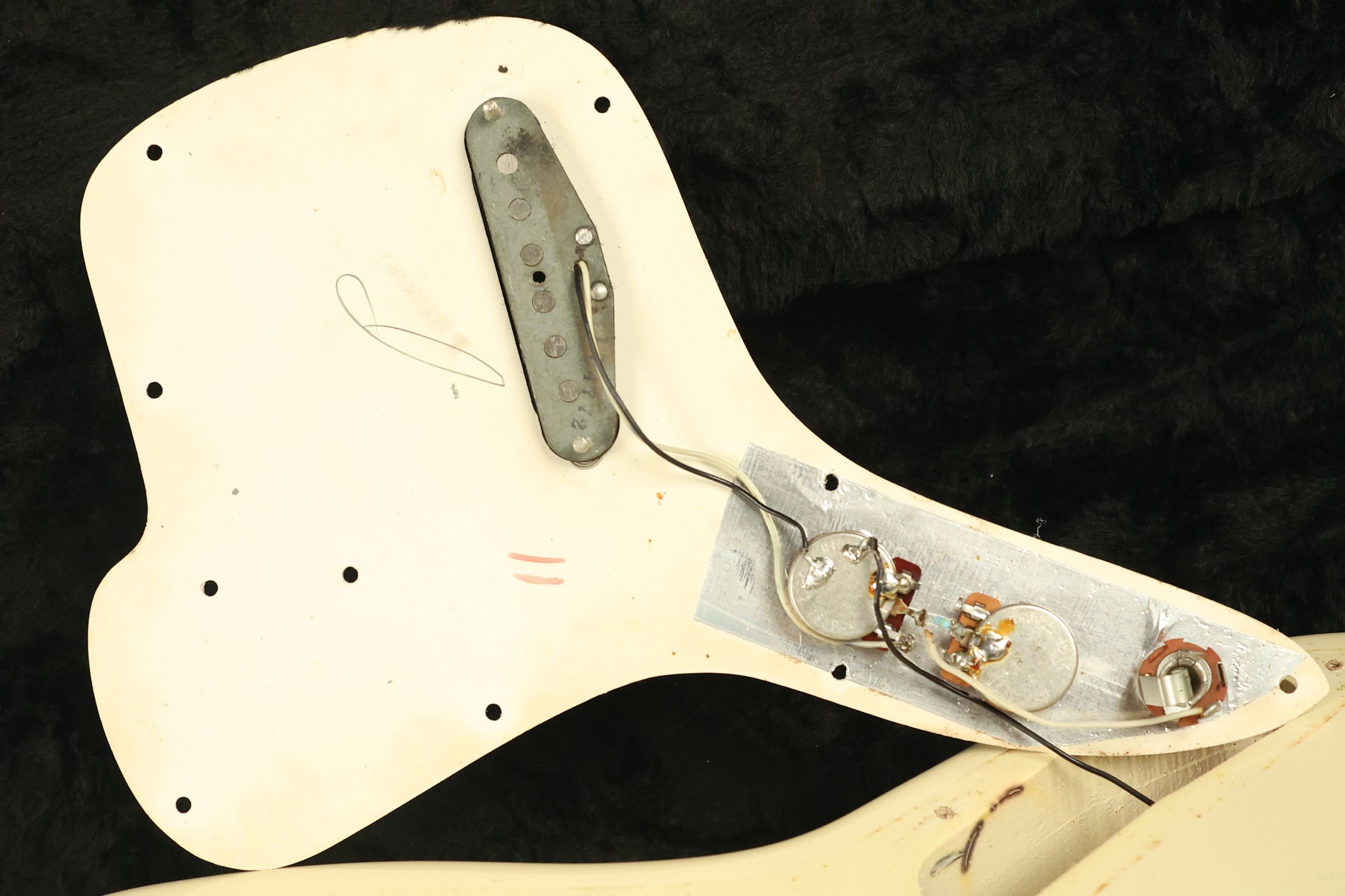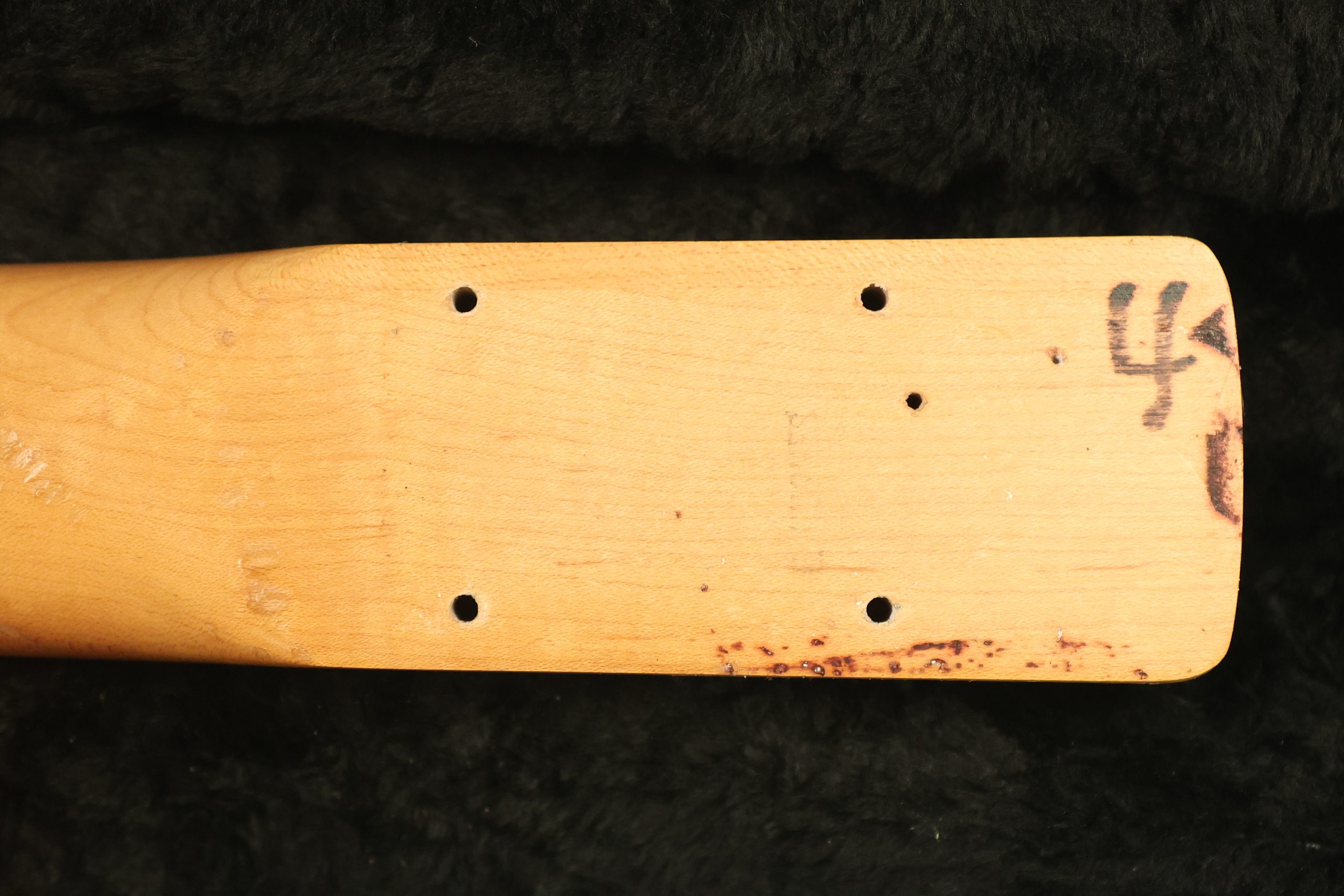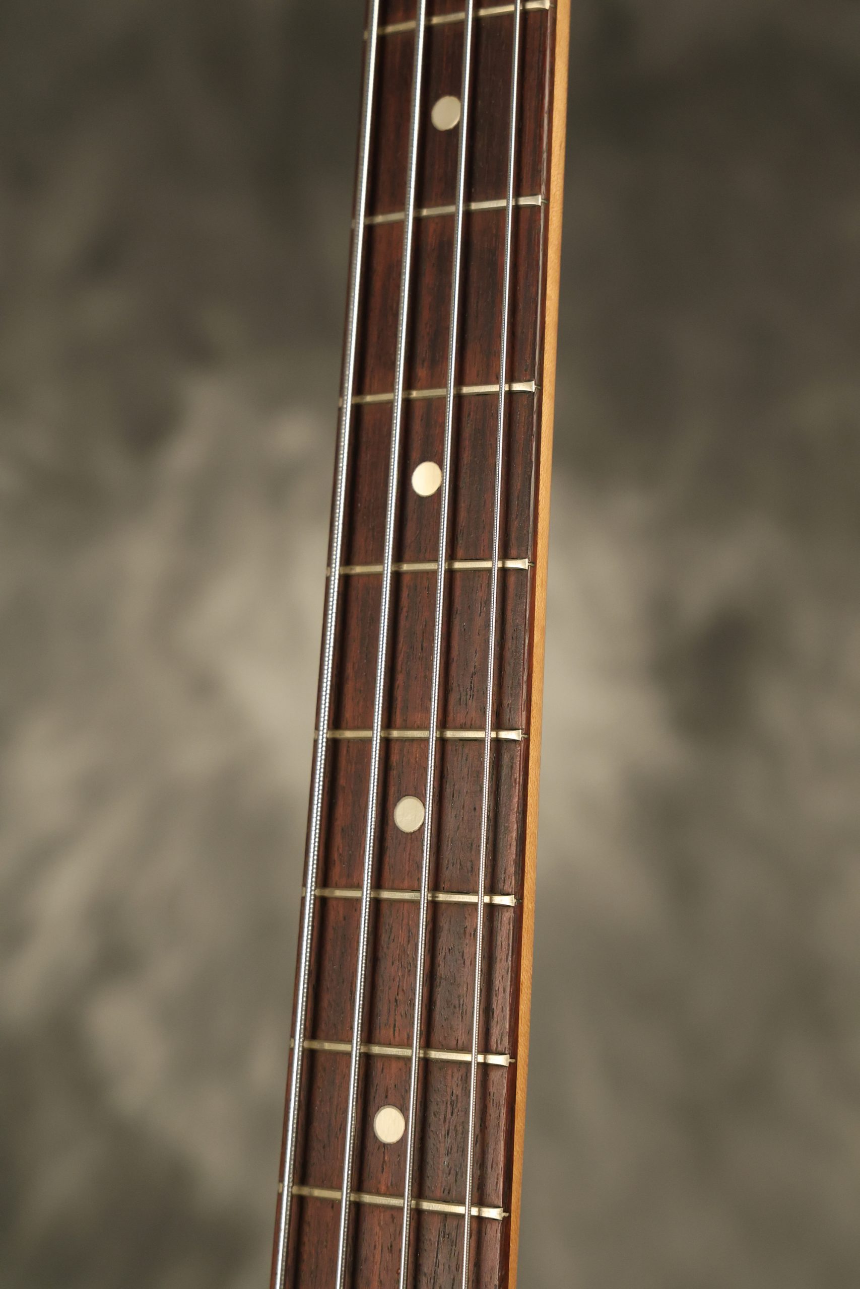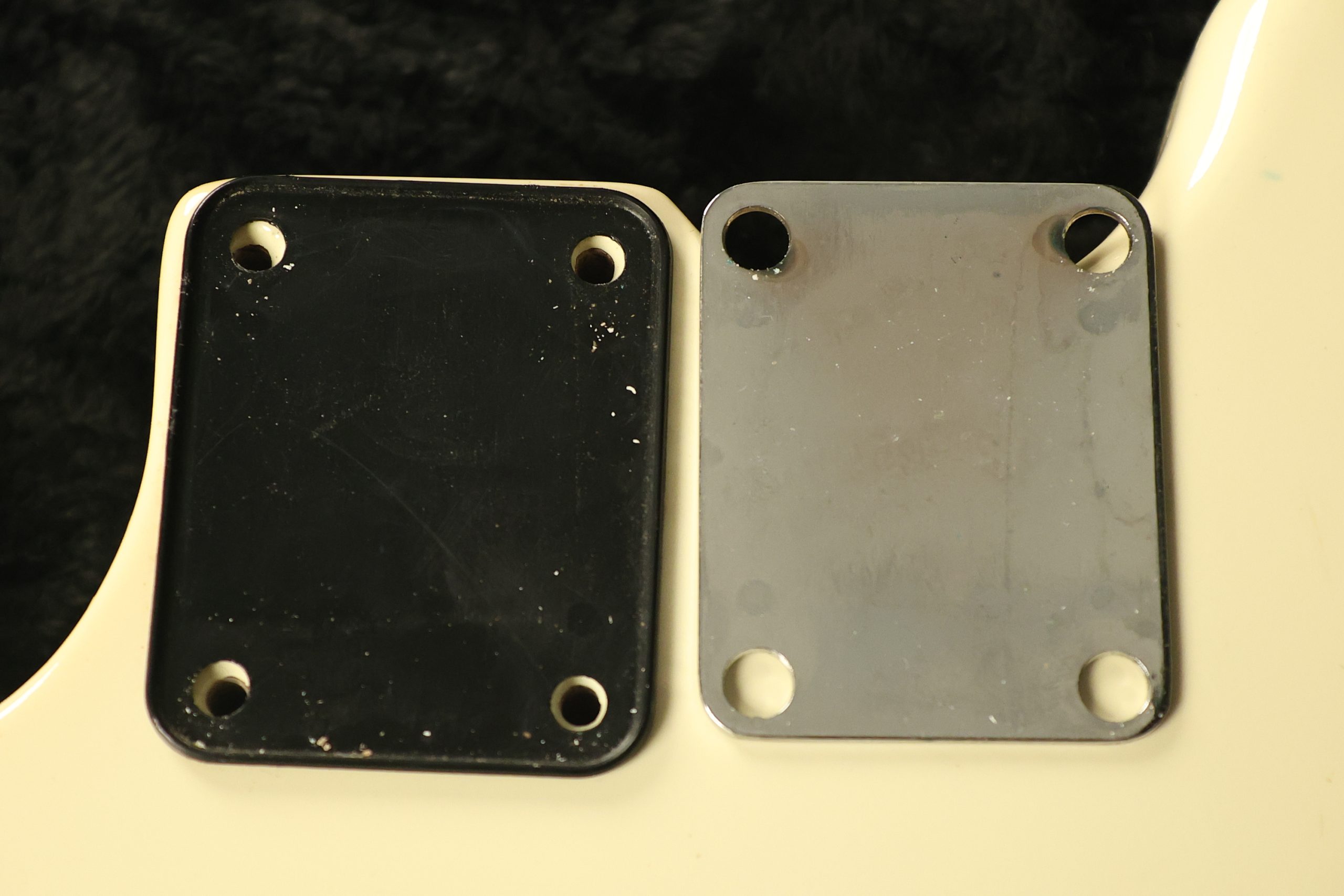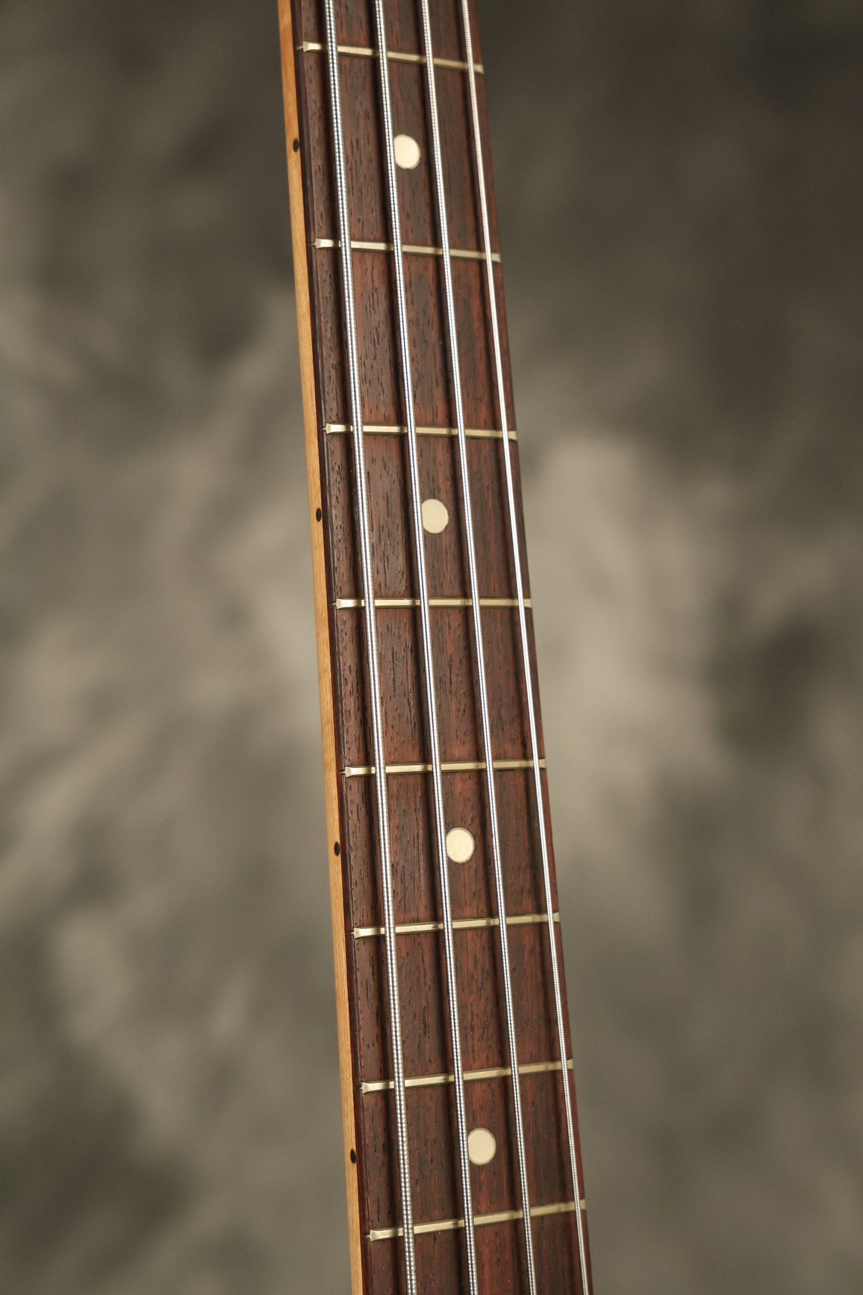 1972 Fender Musicmaster Bass in its original White finish. It has a great playing neck with good frets. It's all original with the exception of the pots and a resistor. A later Fender hardshell case is included. This Musicmaster bass looks good with some nicks + dings and other cosmetic wear including impressions in the finish on the back of the neck and body caused by an old guitar cable laying underneath it while stored in the case. The bass itself remains structurally sound with no cracks, breaks or repairs. All electronics work and sound great.