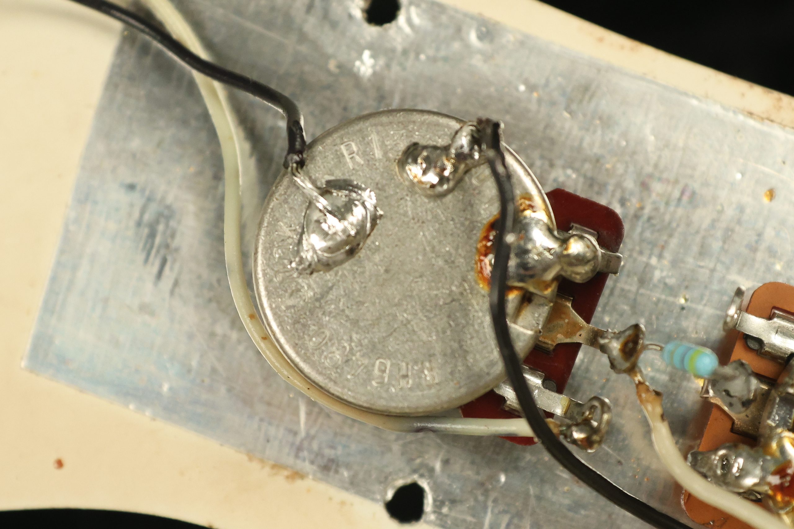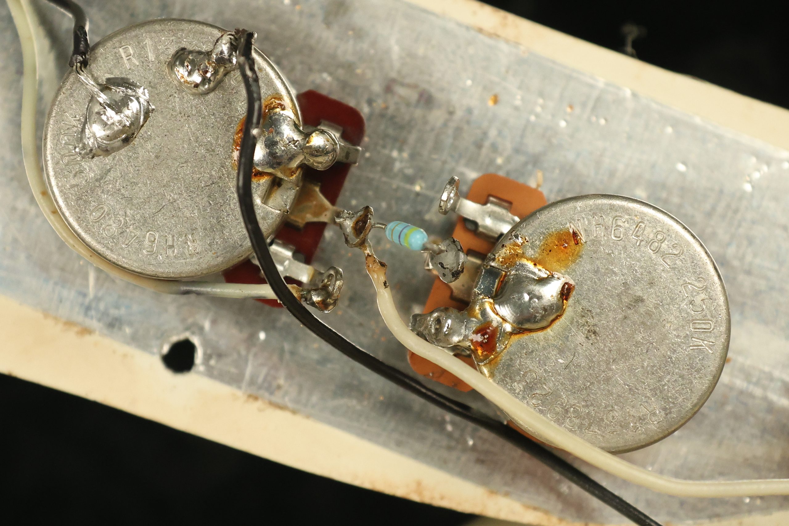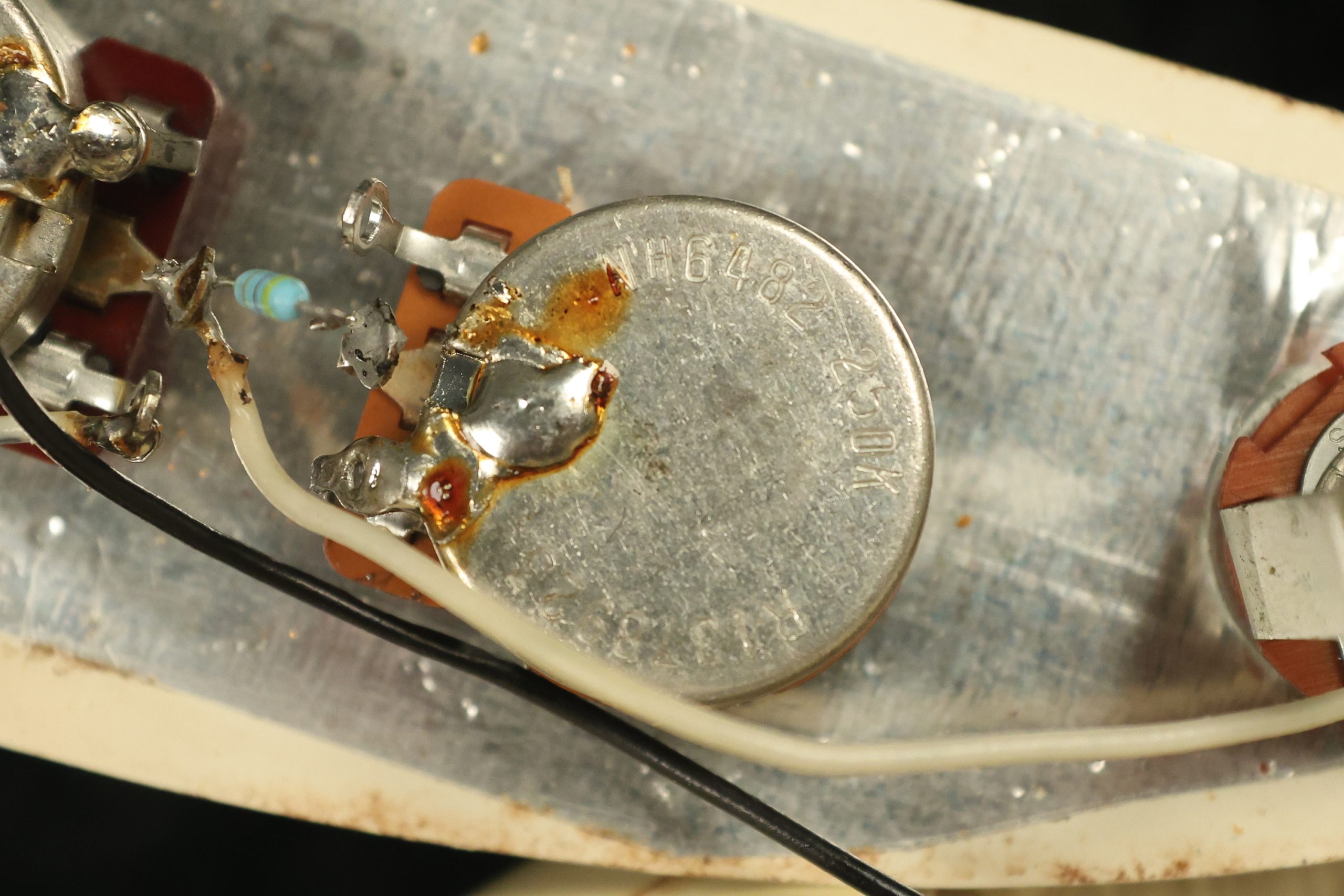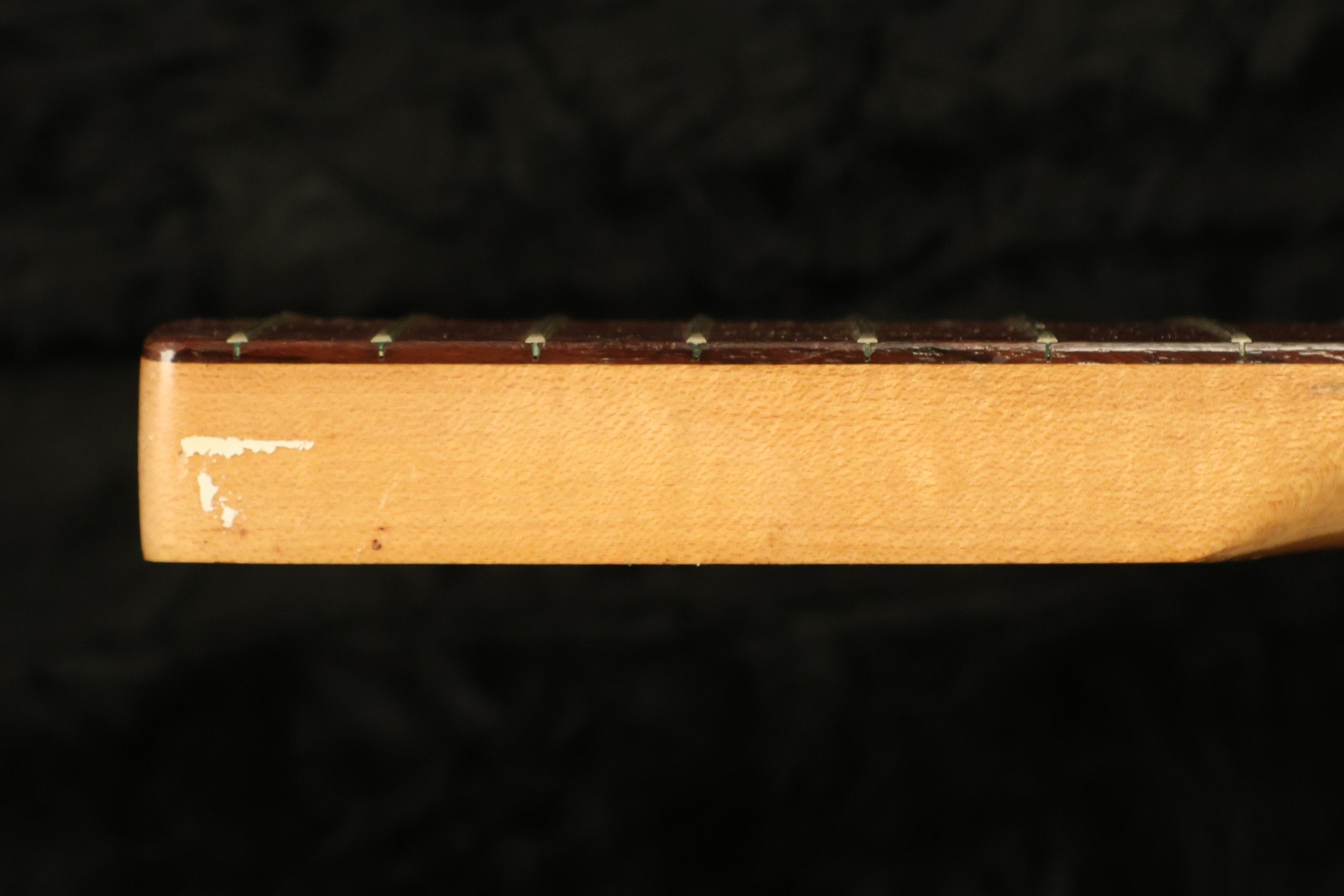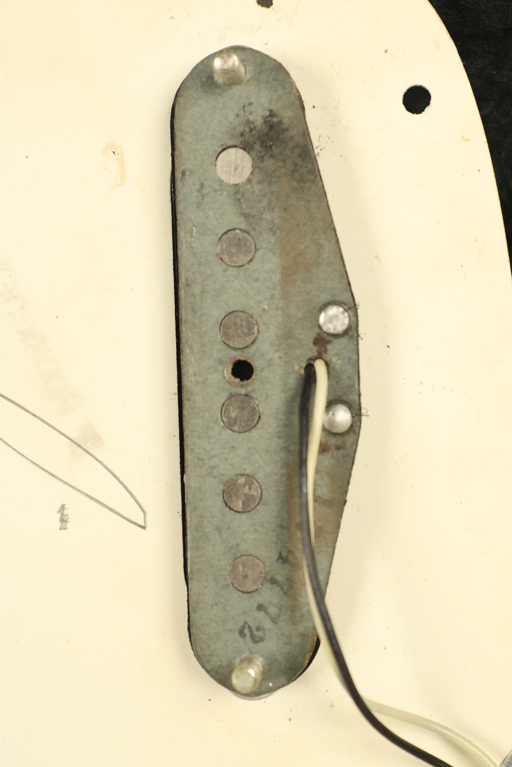 1972 Fender Musicmaster Bass in its original White finish. It has a great playing neck with good frets. It's all original with the exception of the pots and a resistor. A later Fender hardshell case is included. This Musicmaster bass looks good with some nicks + dings and other cosmetic wear including impressions in the finish on the back of the neck and body caused by an old guitar cable laying underneath it while stored in the case. The bass itself remains structurally sound with no cracks, breaks or repairs. All electronics work and sound great.