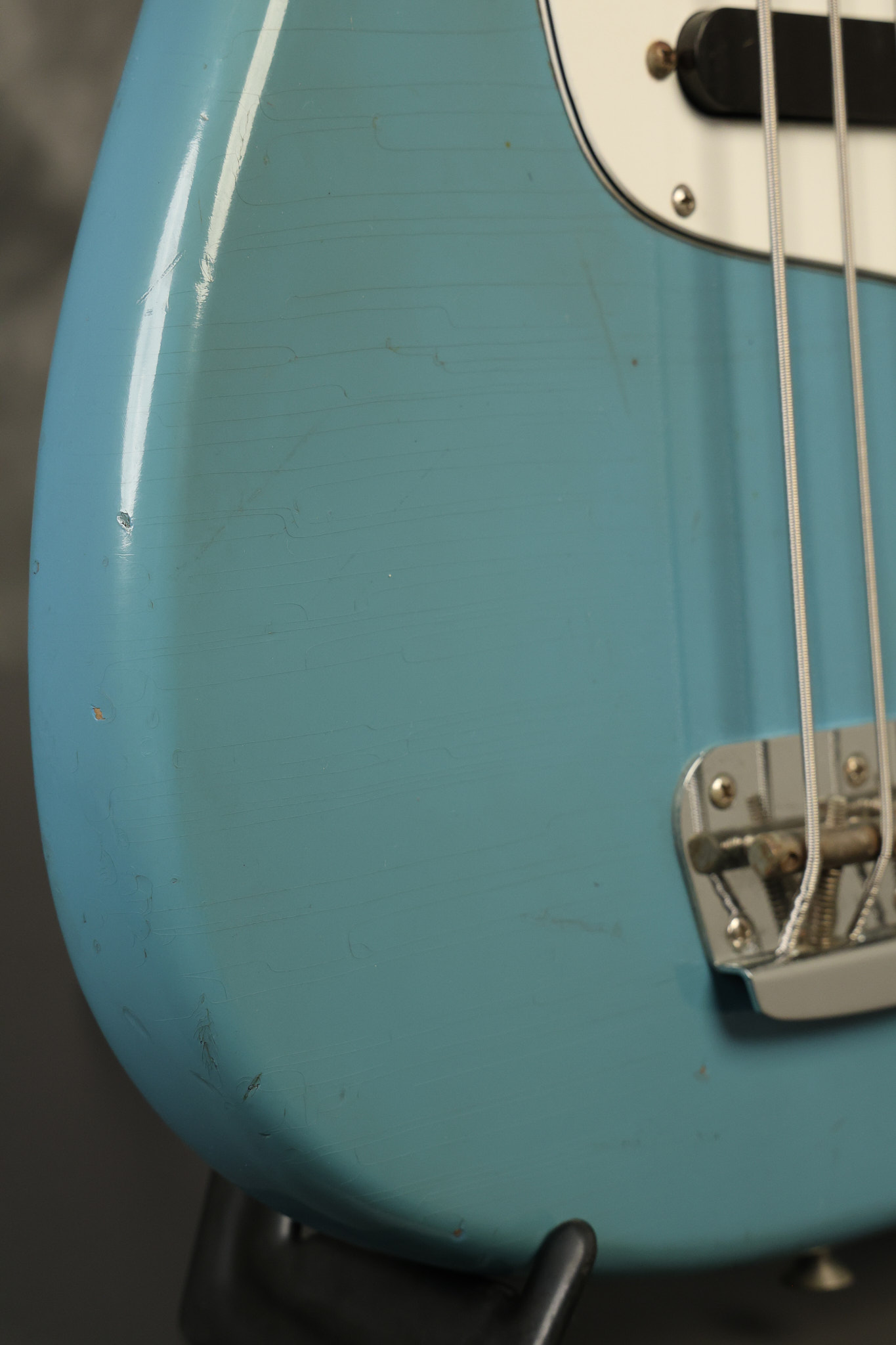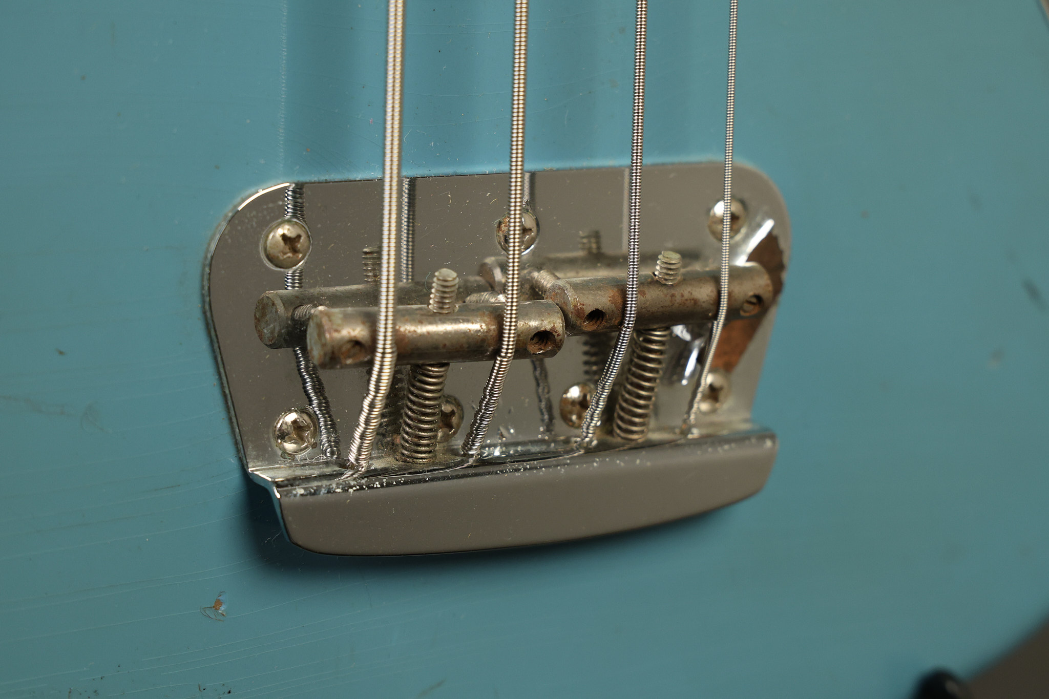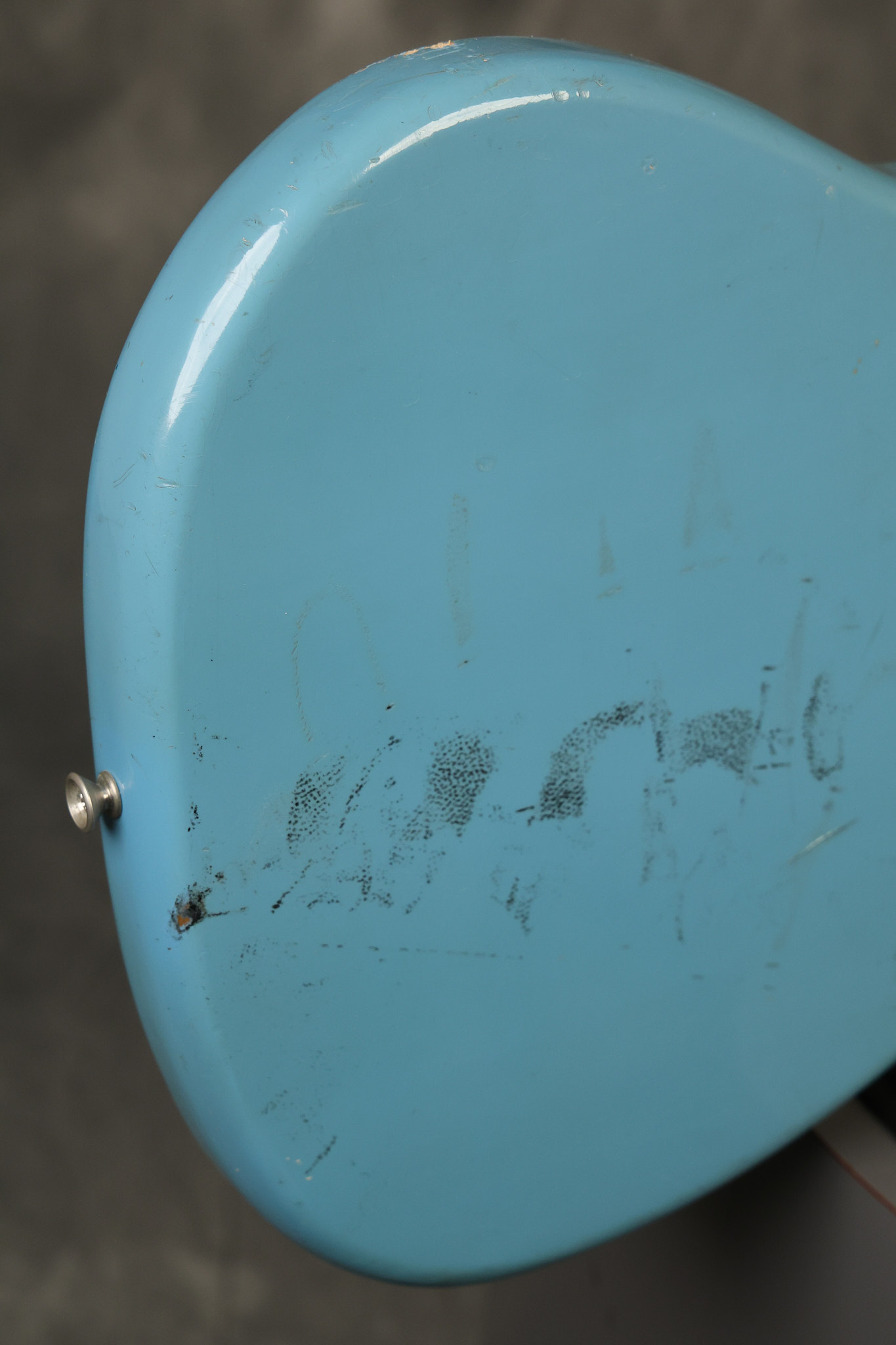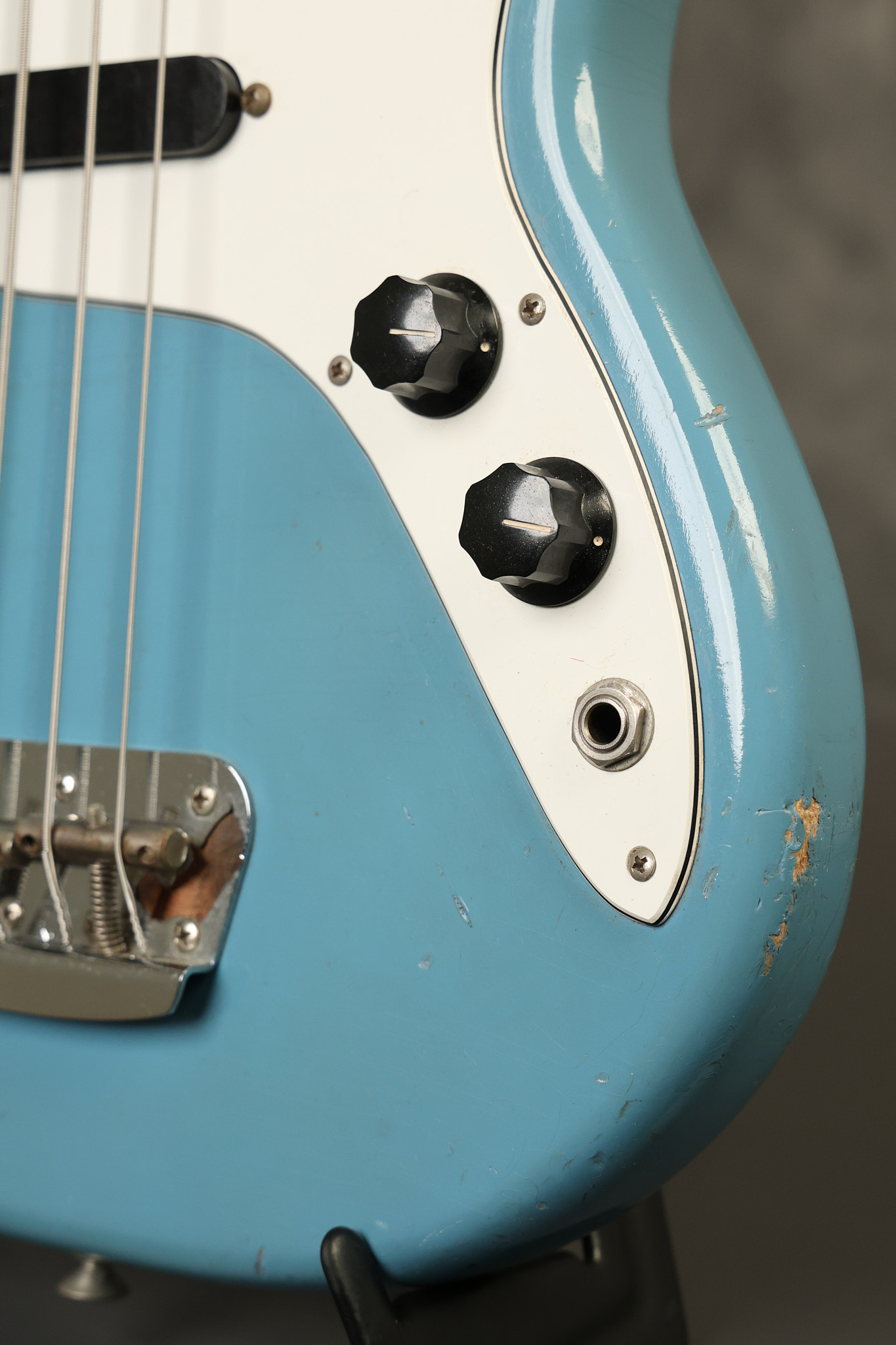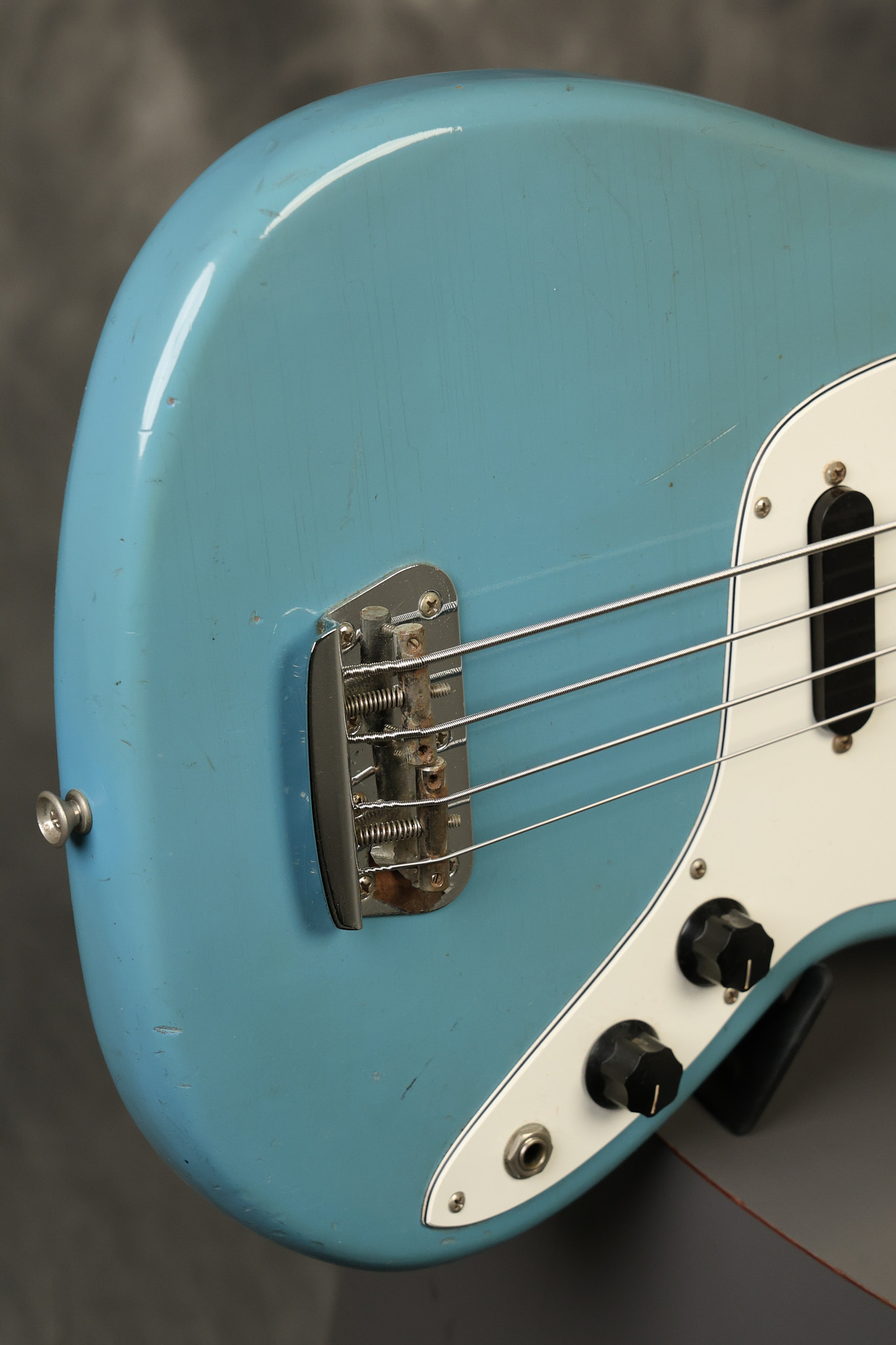 1973 Fender Musicmaster Bass in its original Blue finish. It has a great playing neck with great frets. The bass is all original and a vintage home-made hardshell case is included. There are nicks + dings, some damage in the surface of the wood on the treble side of the body, impressions in the finish on the back of the body from an old guitar strap, finish checking and other cosmetic wear including some flaking in the chrome coating of the bridge plate. The guitar itself remains structurally sound with no cracks, breaks or repairs. All electronics work and sound great.