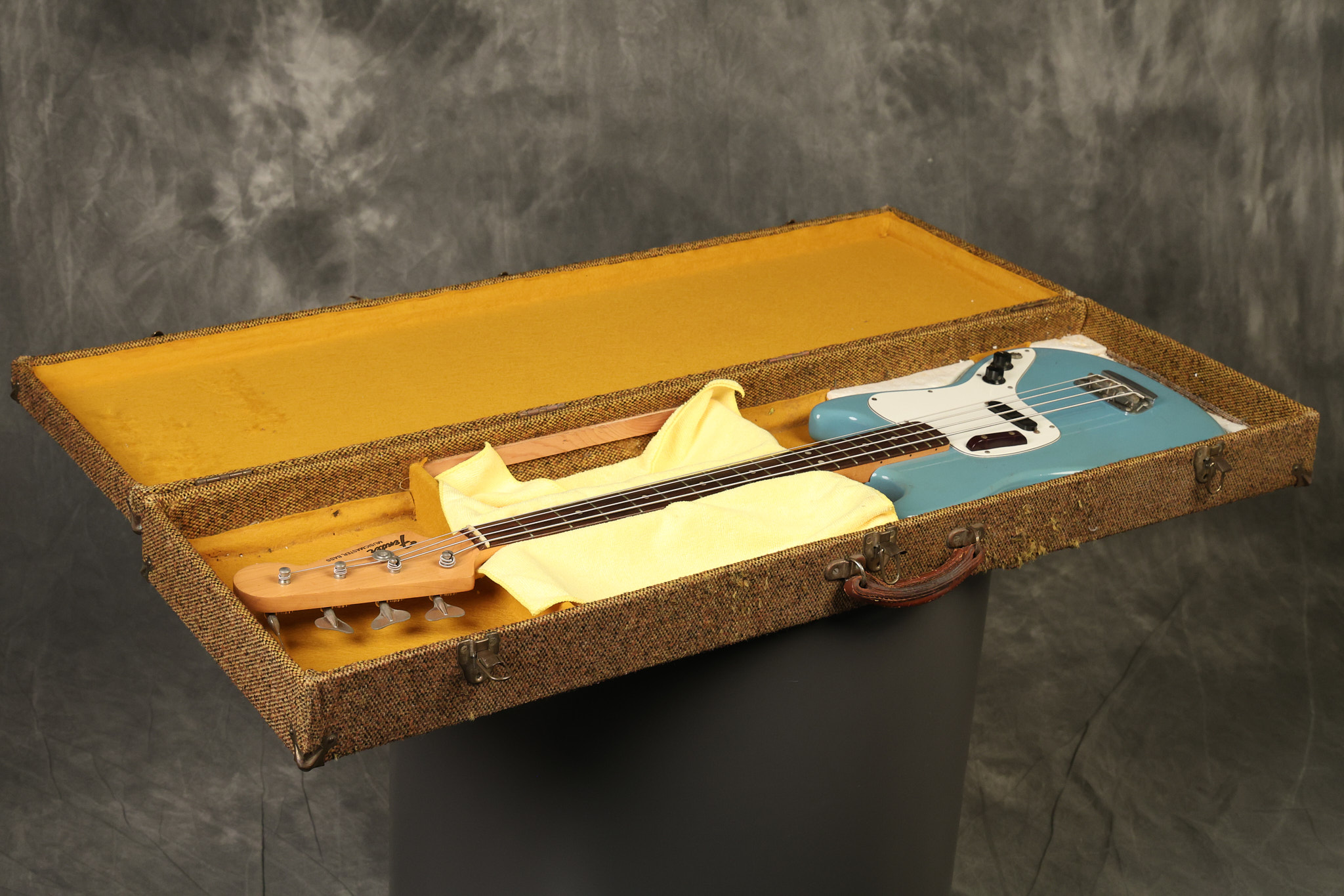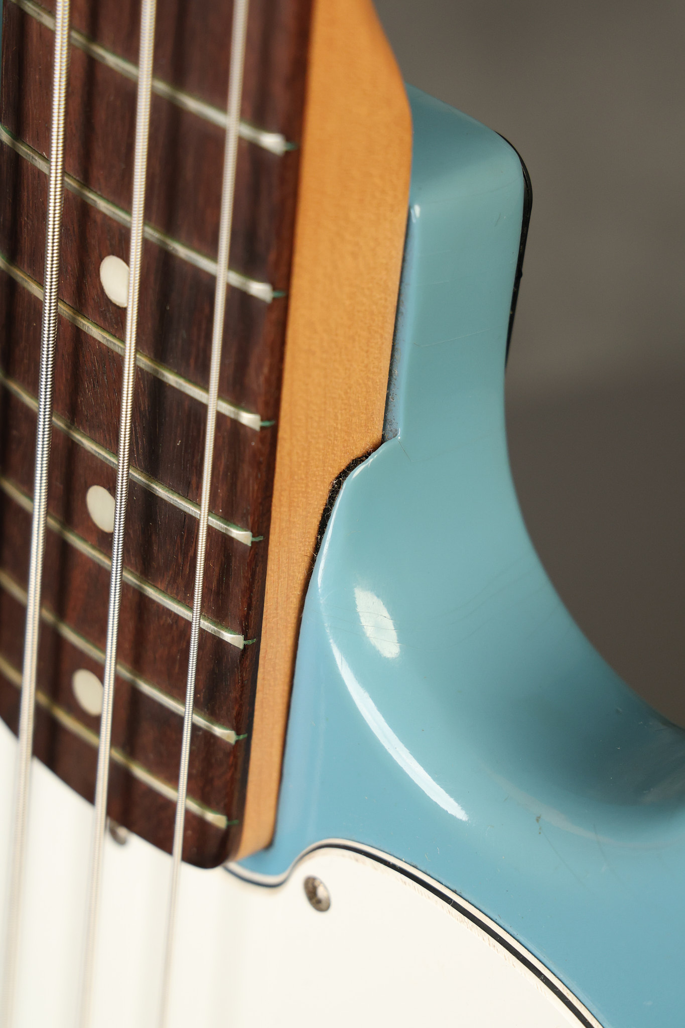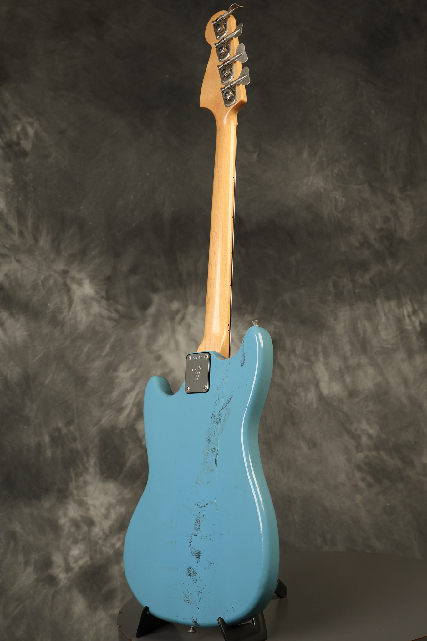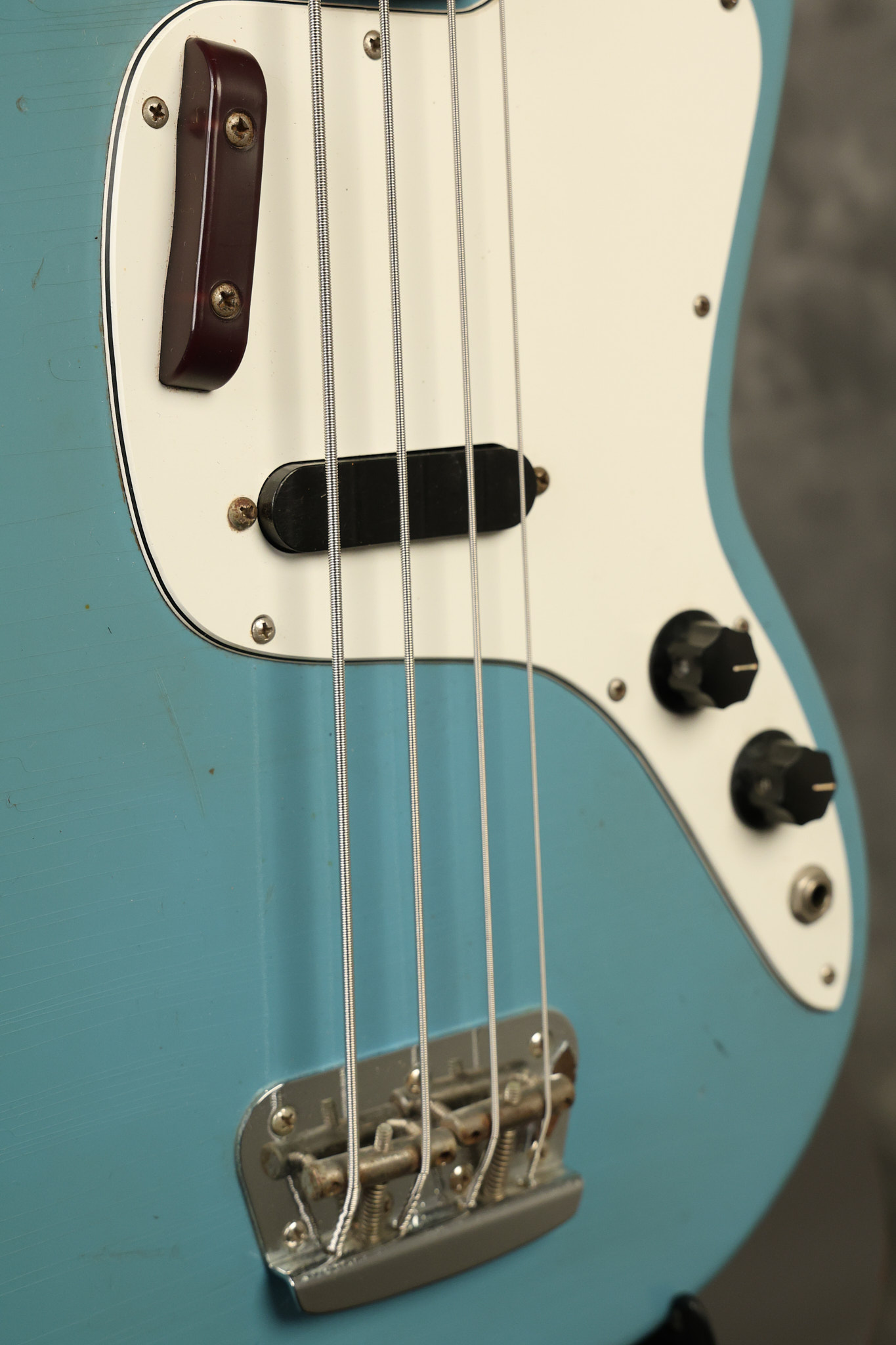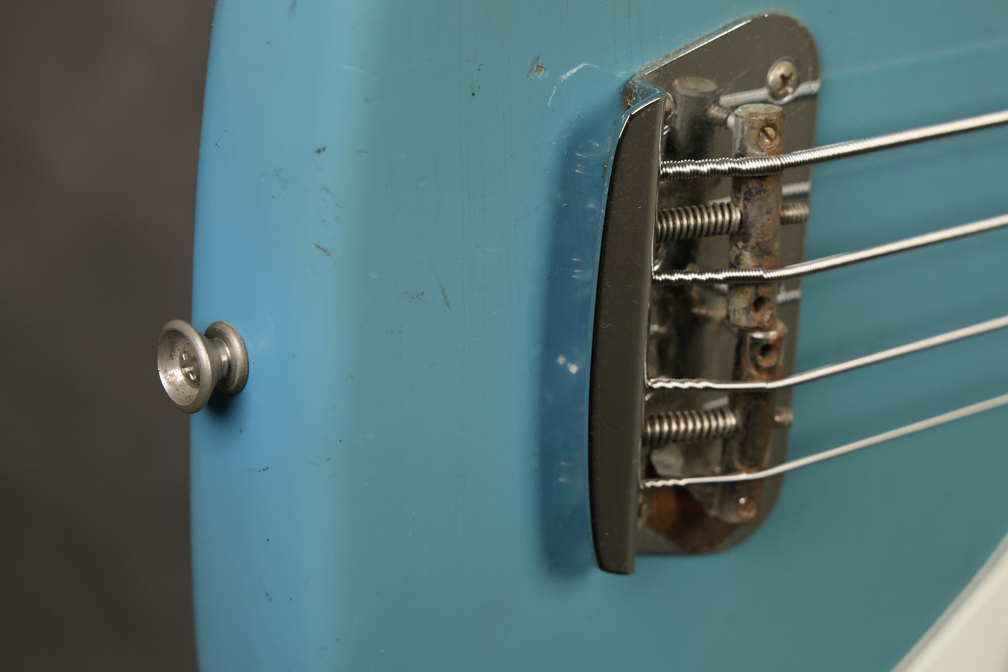 1973 Fender Musicmaster Bass in its original Blue finish. It has a great playing neck with great frets. The bass is all original and a vintage home-made hardshell case is included. There are nicks + dings, some damage in the surface of the wood on the treble side of the body, impressions in the finish on the back of the body from an old guitar strap, finish checking and other cosmetic wear including some flaking in the chrome coating of the bridge plate. The guitar itself remains structurally sound with no cracks, breaks or repairs. All electronics work and sound great.