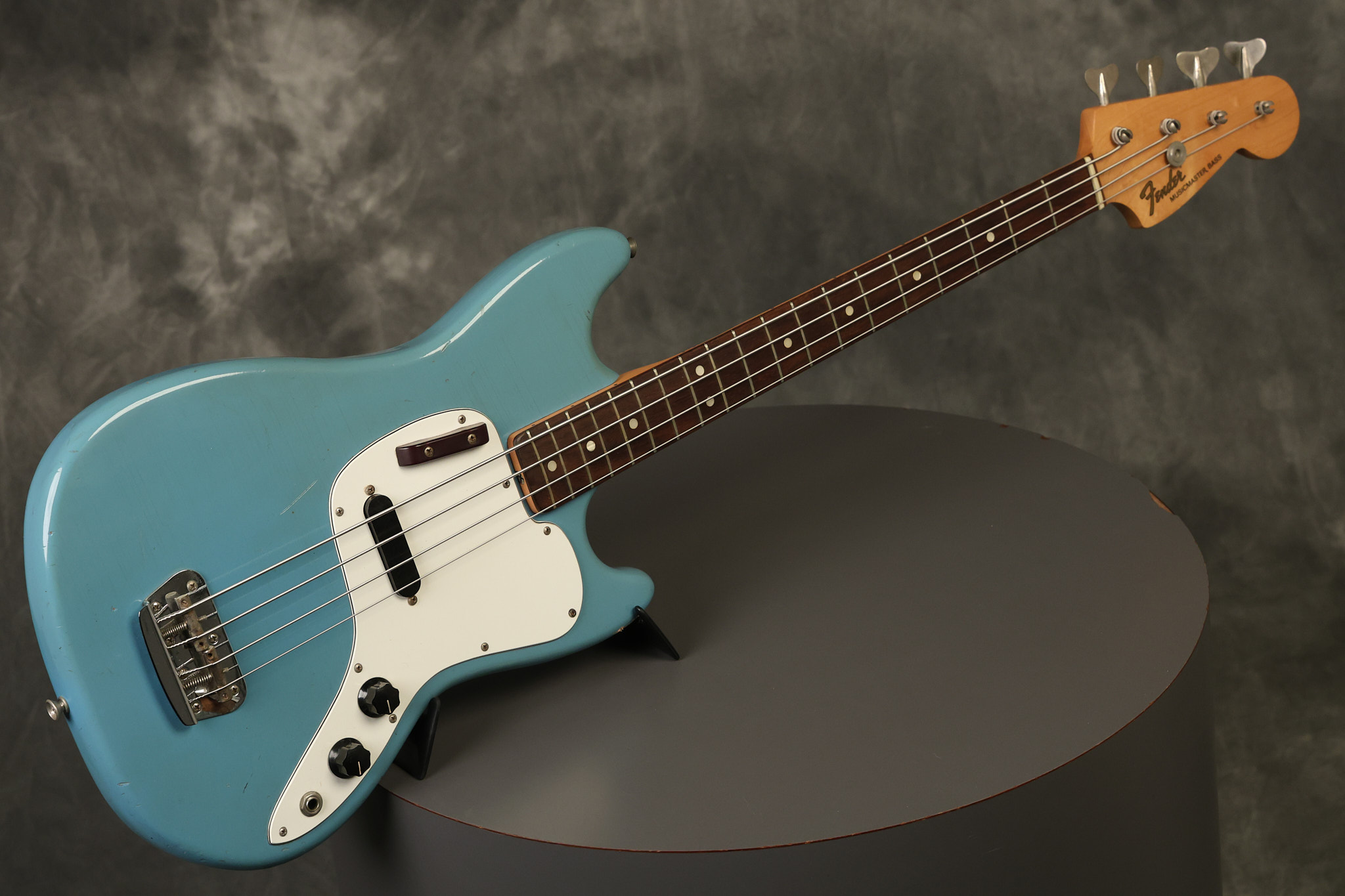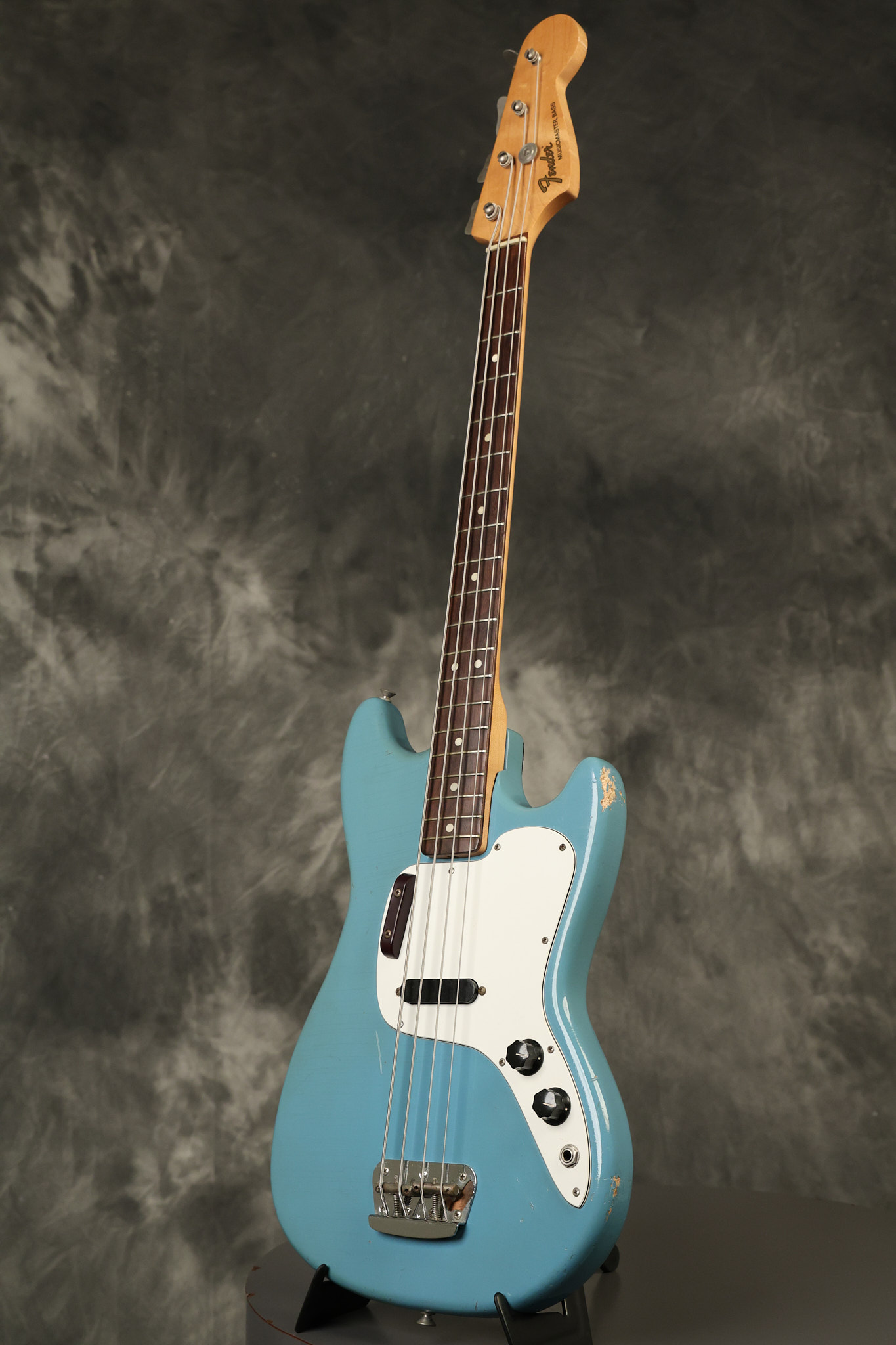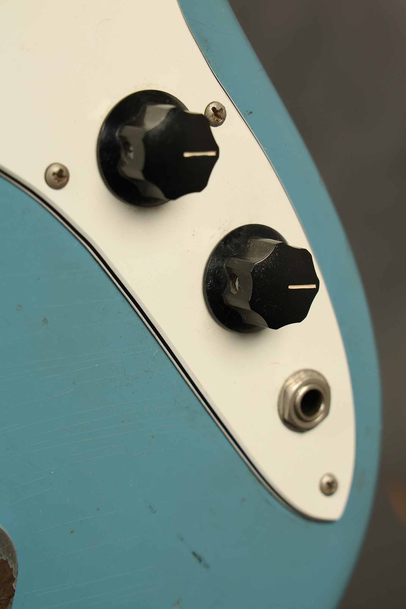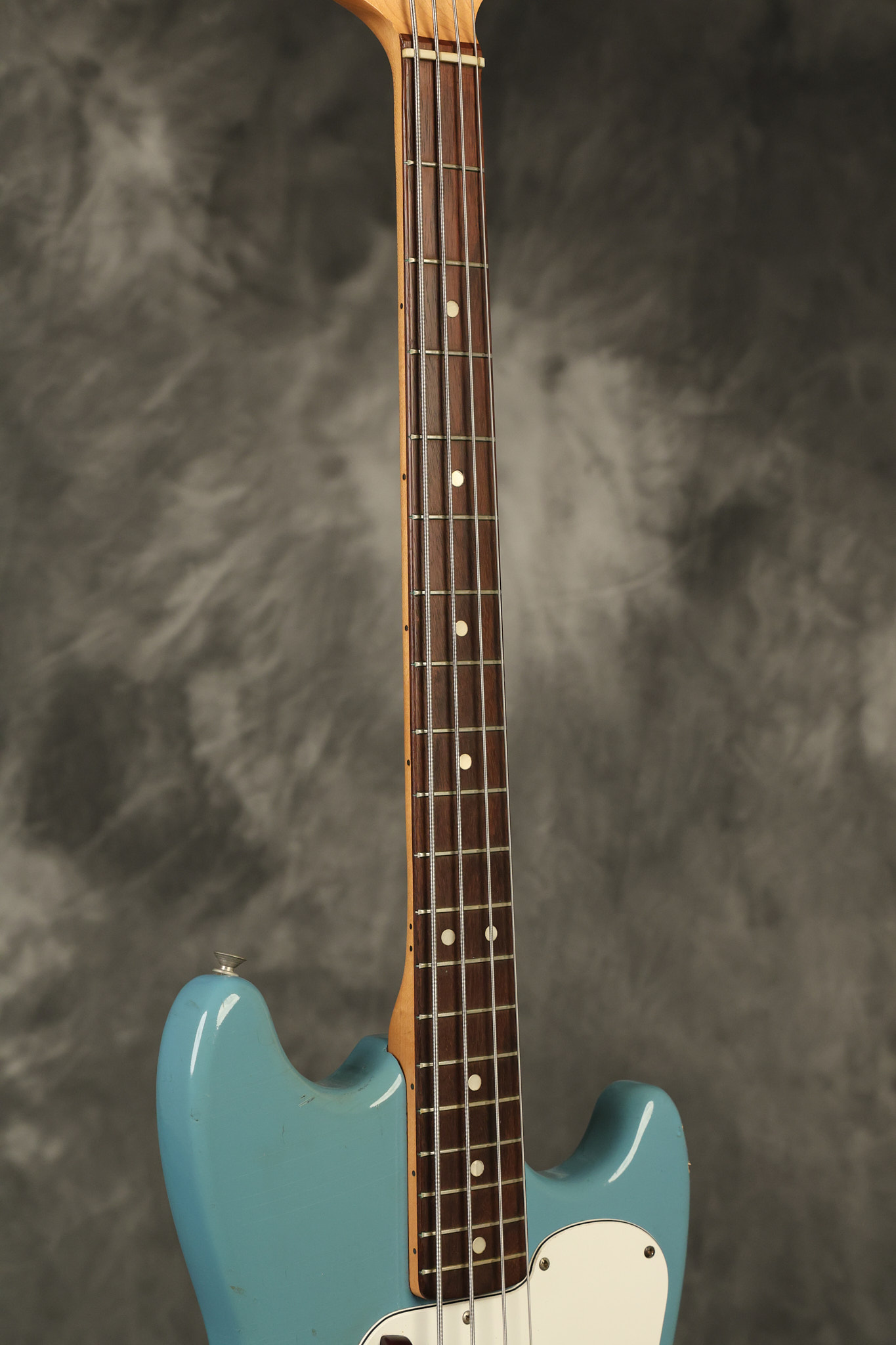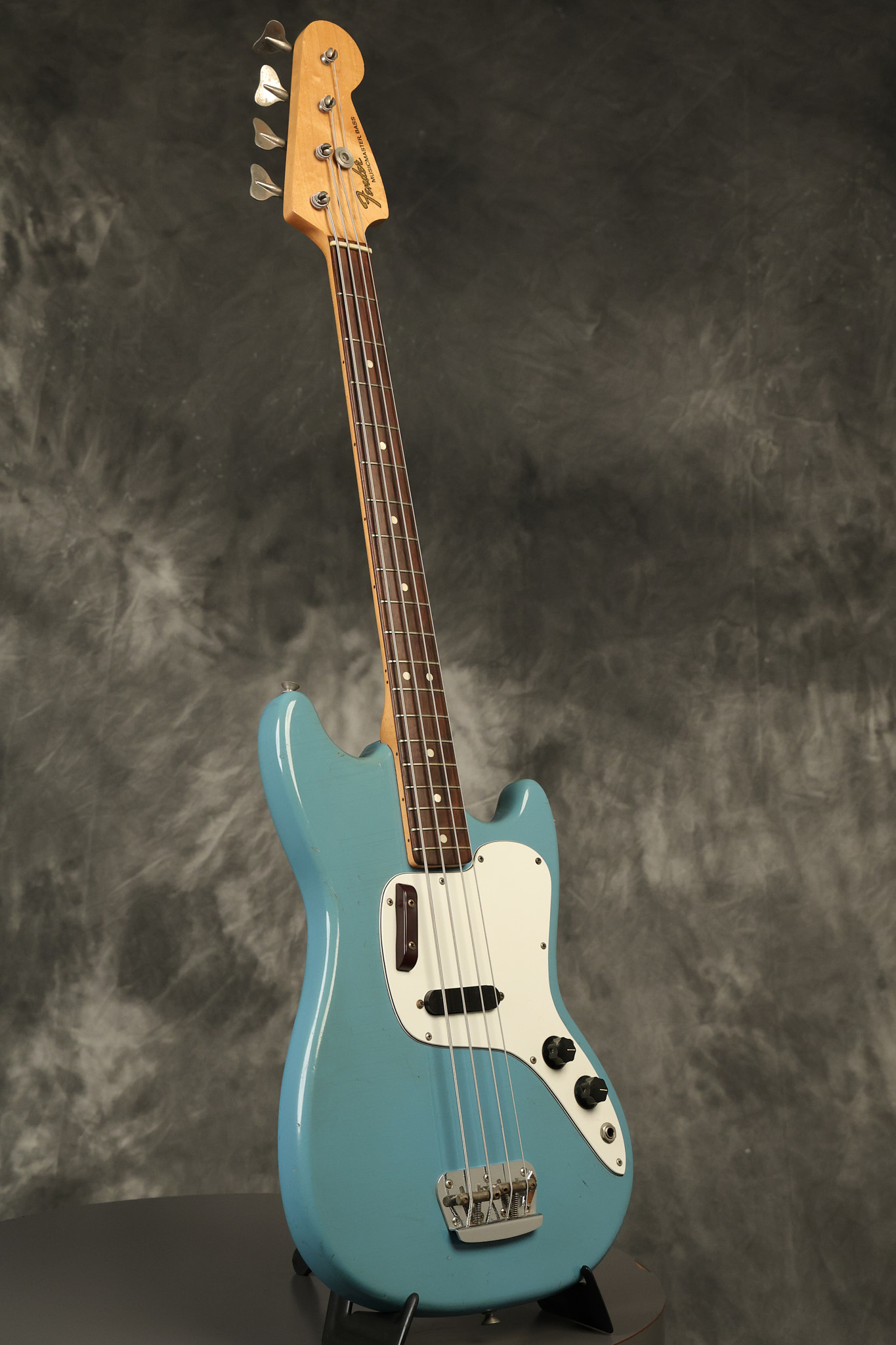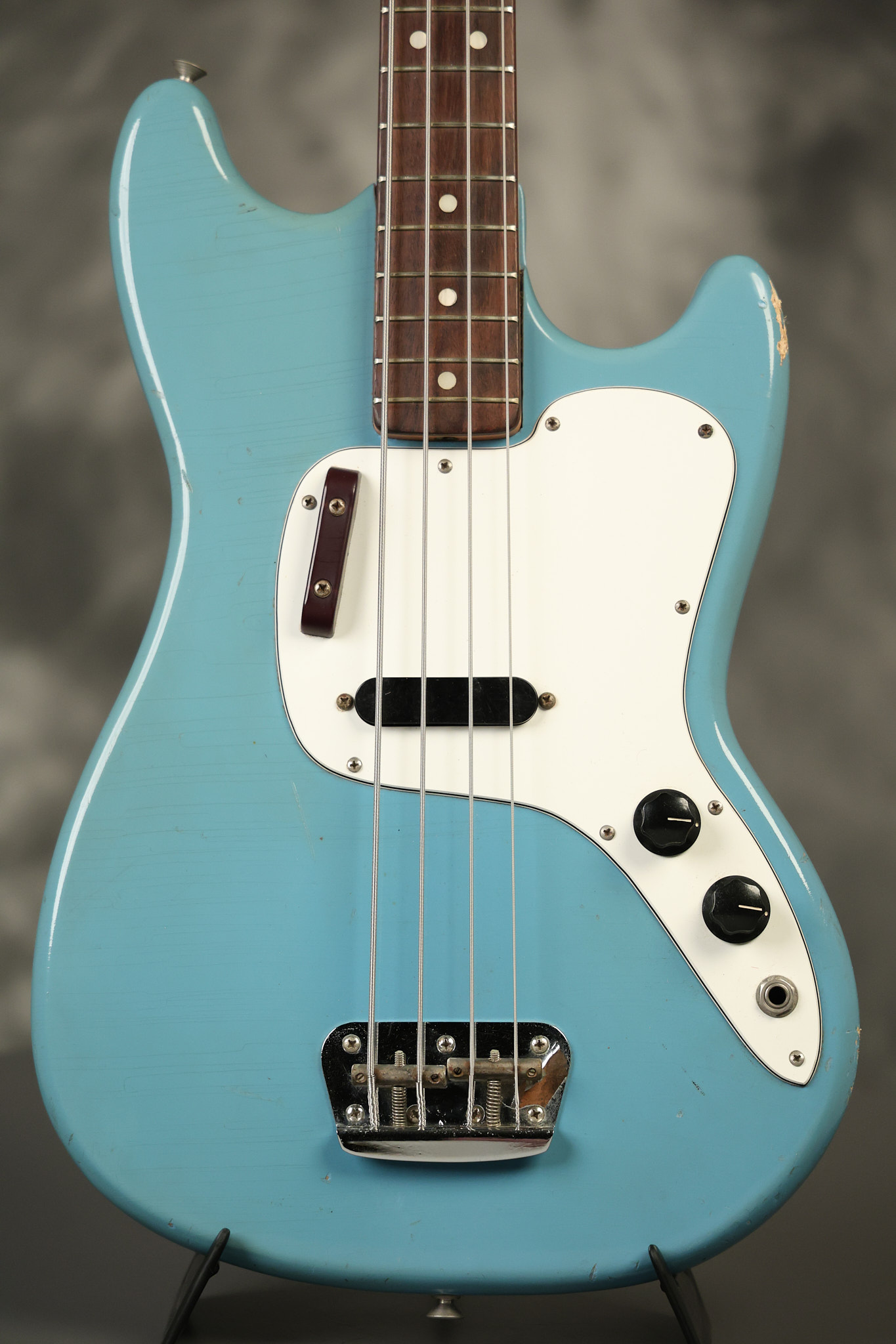 1973 Fender Musicmaster Bass in its original Blue finish. It has a great playing neck with great frets. The bass is all original and a vintage home-made hardshell case is included. There are nicks + dings, some damage in the surface of the wood on the treble side of the body, impressions in the finish on the back of the body from an old guitar strap, finish checking and other cosmetic wear including some flaking in the chrome coating of the bridge plate. The guitar itself remains structurally sound with no cracks, breaks or repairs. All electronics work and sound great.