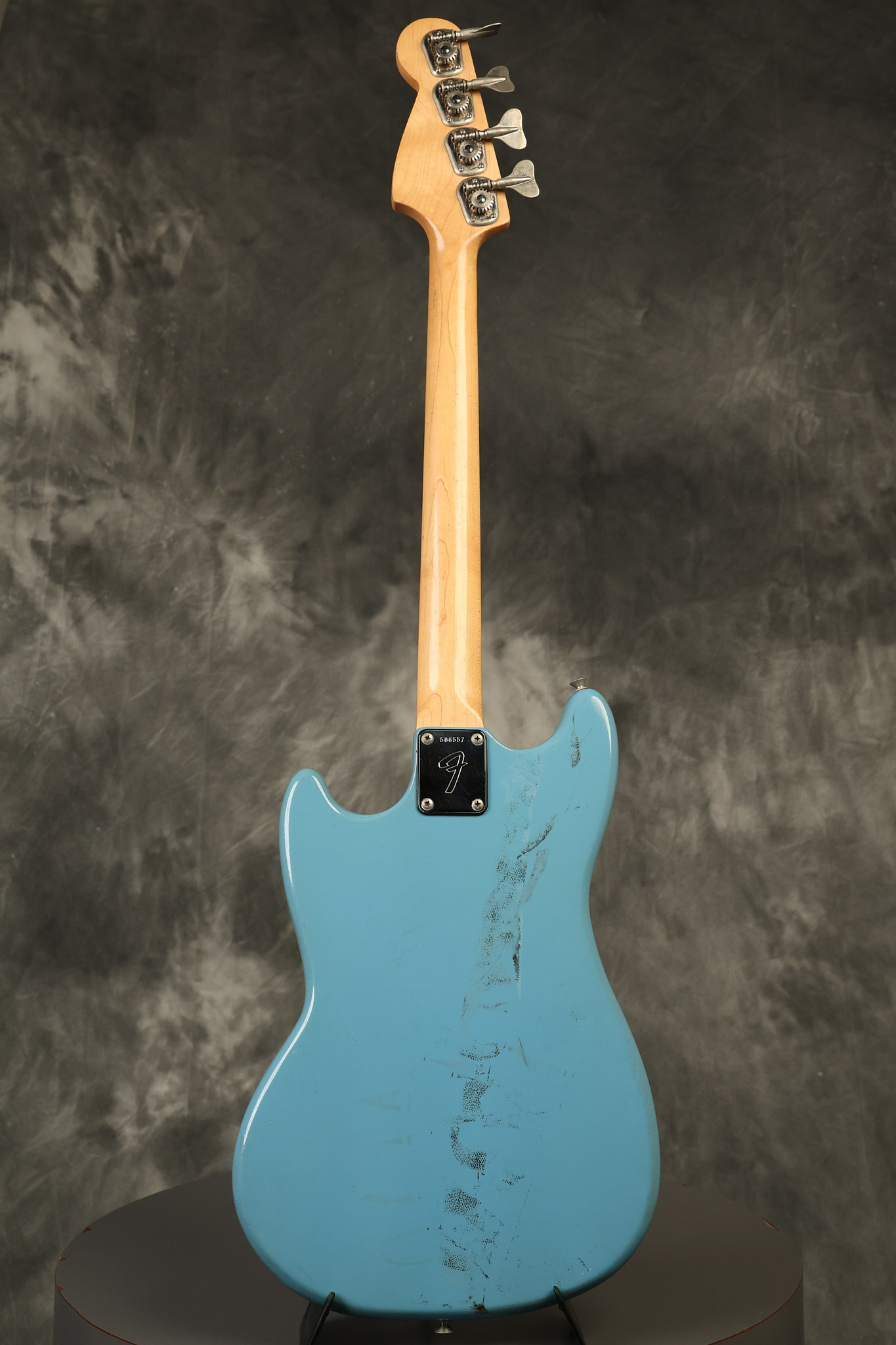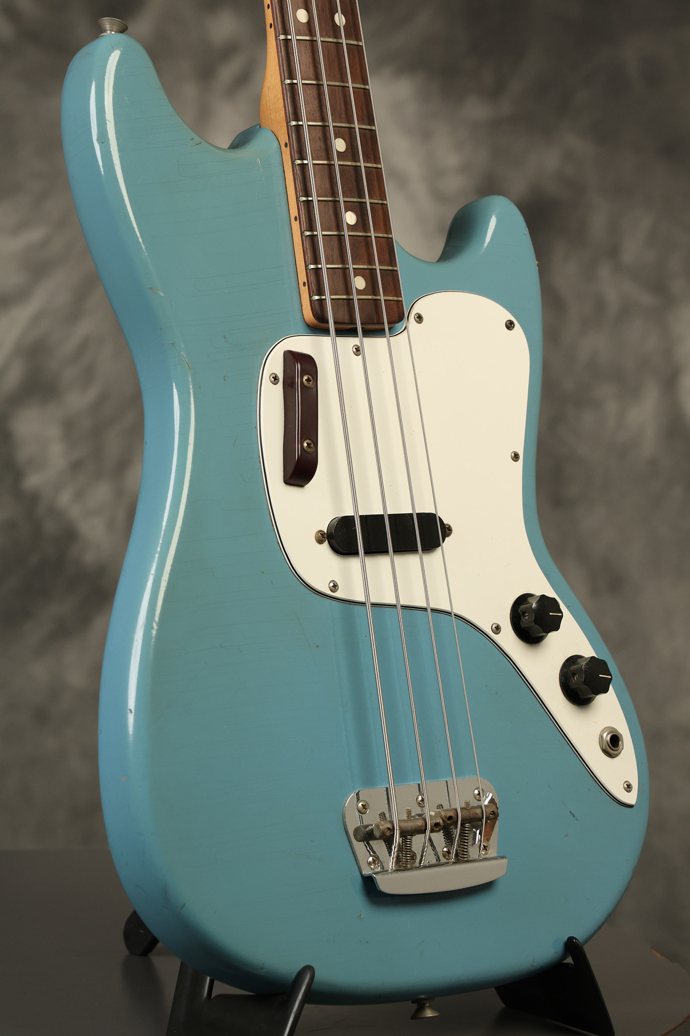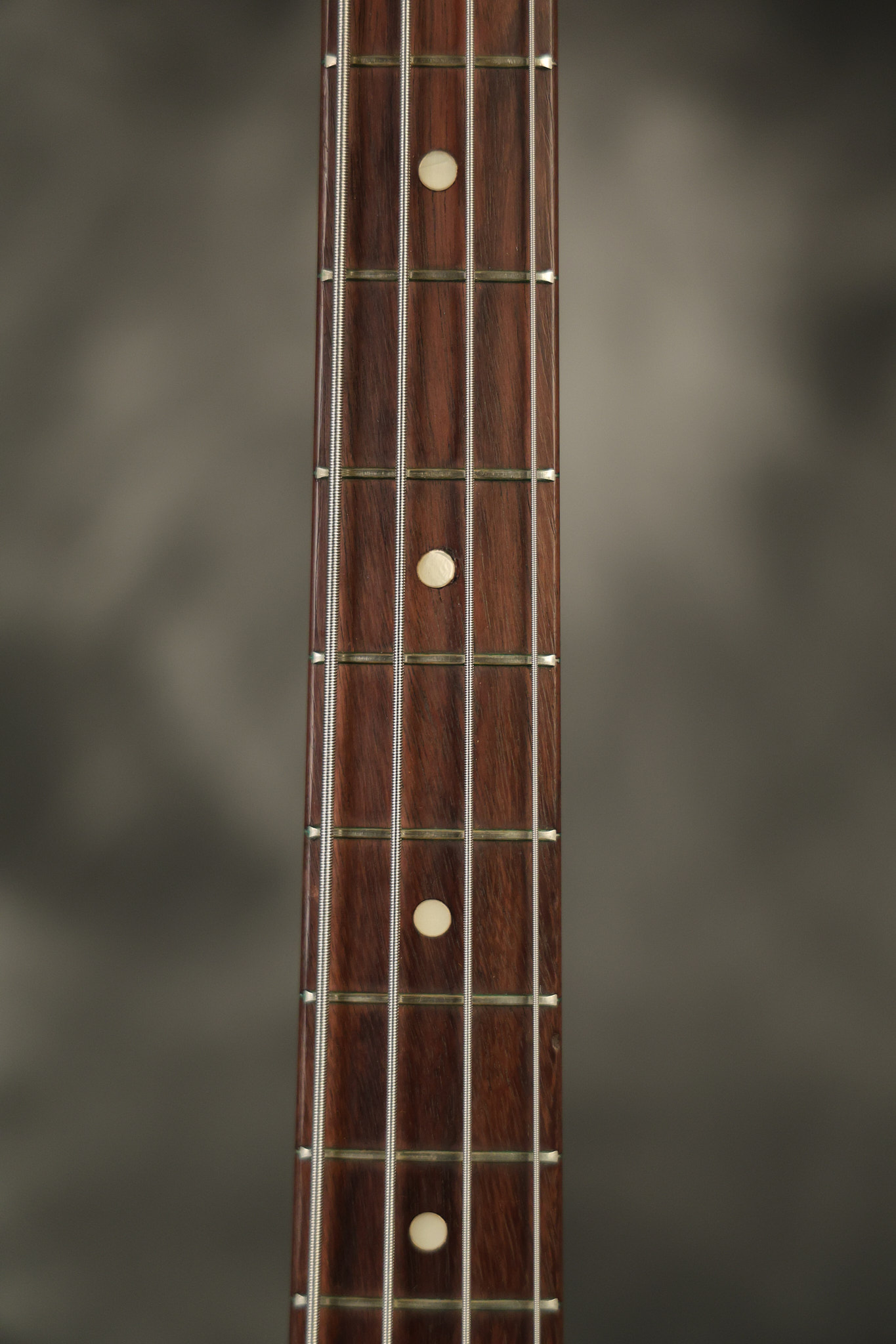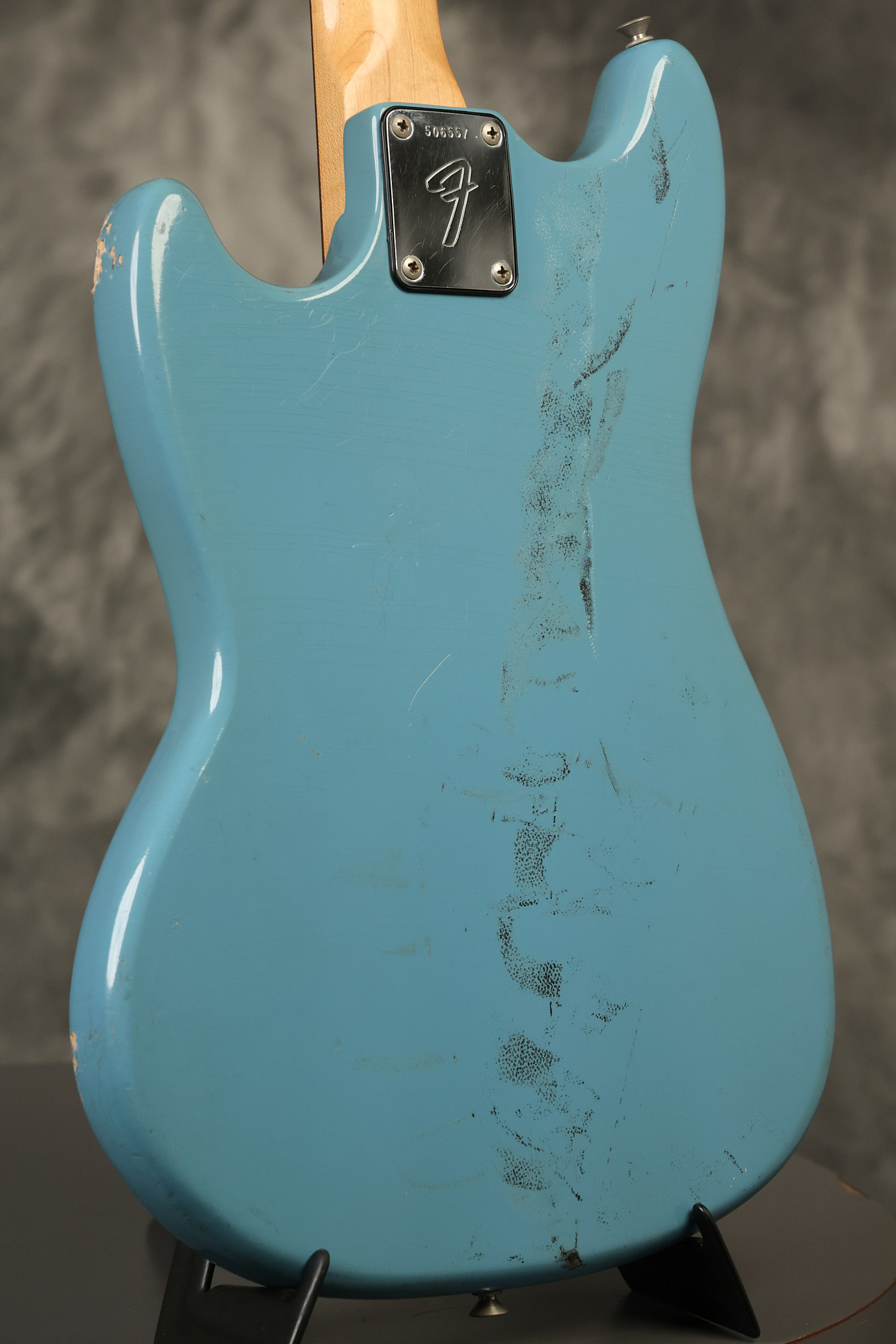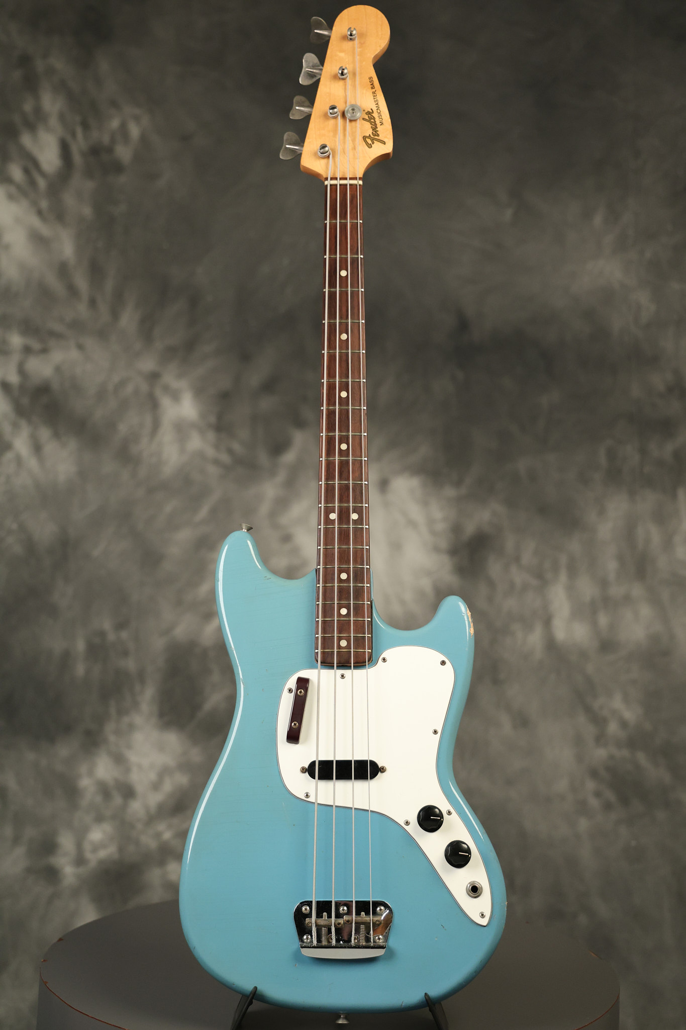 1973 Fender Musicmaster Bass in its original Blue finish. It has a great playing neck with great frets. The bass is all original and a vintage home-made hardshell case is included. There are nicks + dings, some damage in the surface of the wood on the treble side of the body, impressions in the finish on the back of the body from an old guitar strap, finish checking and other cosmetic wear including some flaking in the chrome coating of the bridge plate. The guitar itself remains structurally sound with no cracks, breaks or repairs. All electronics work and sound great.
