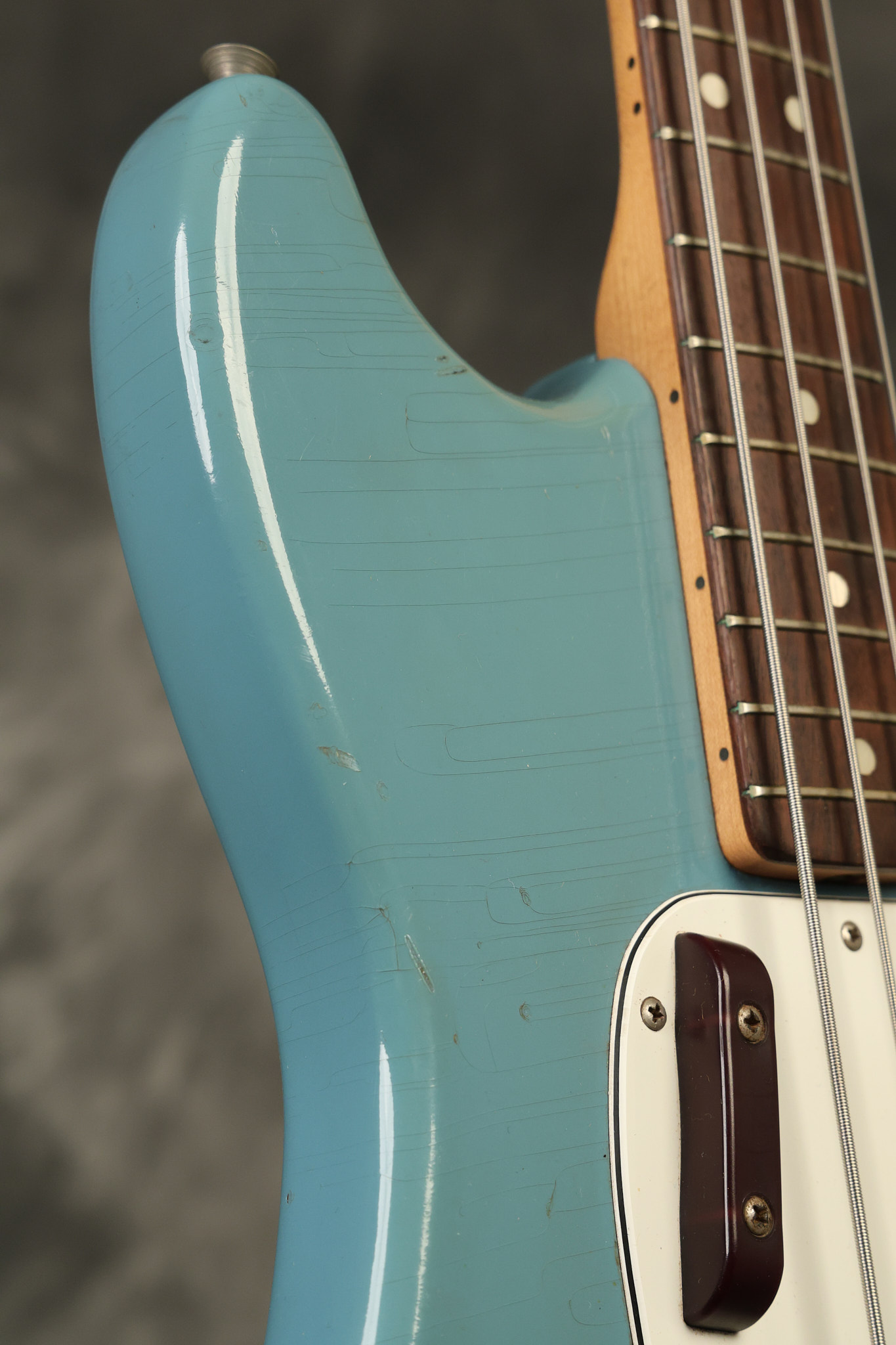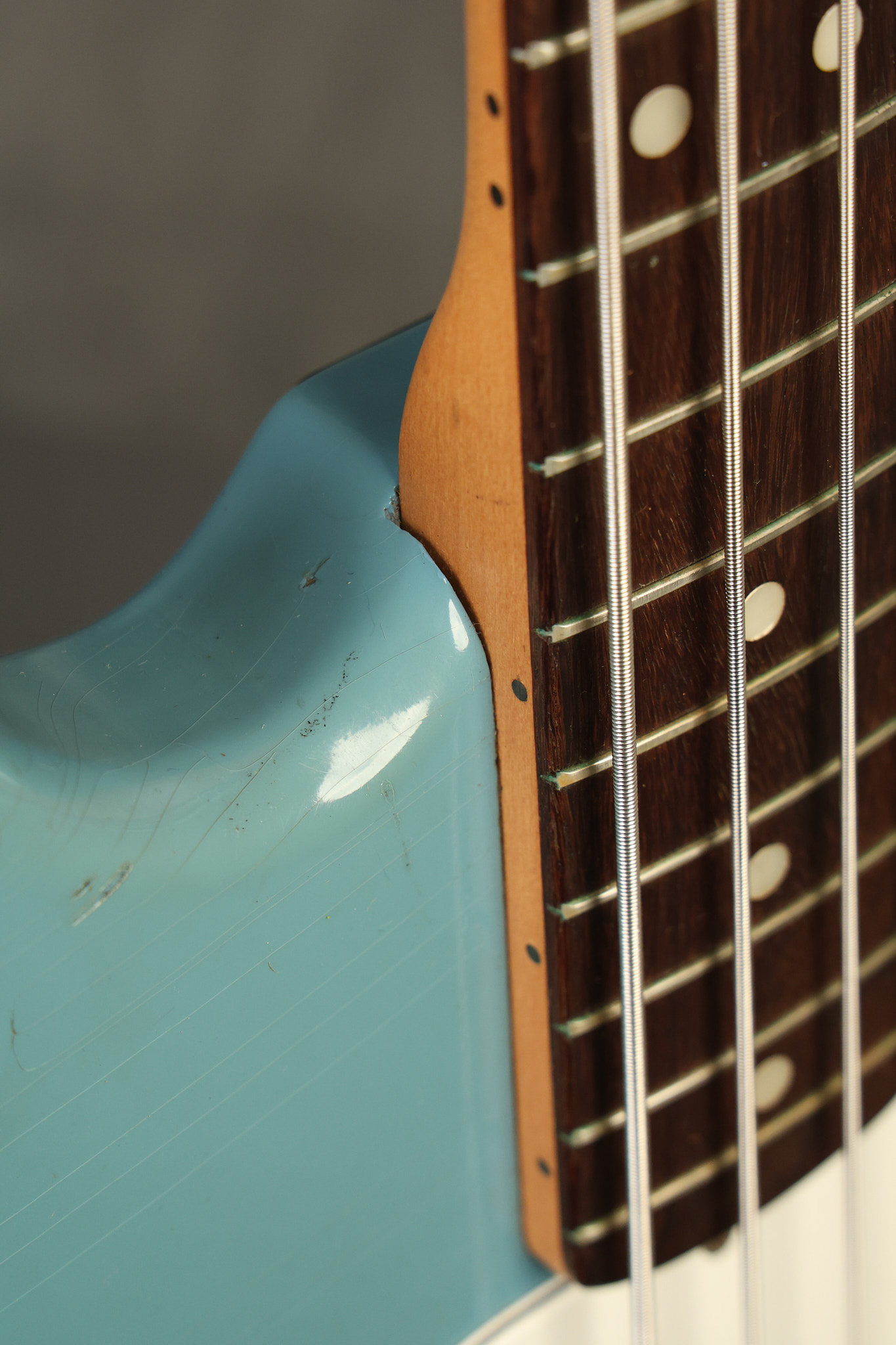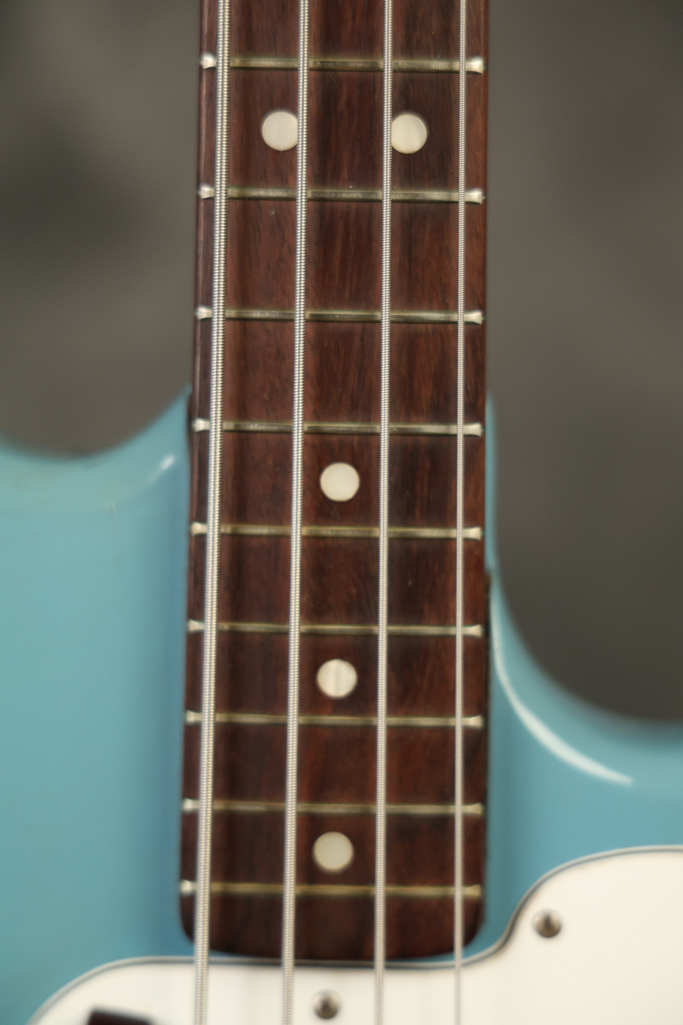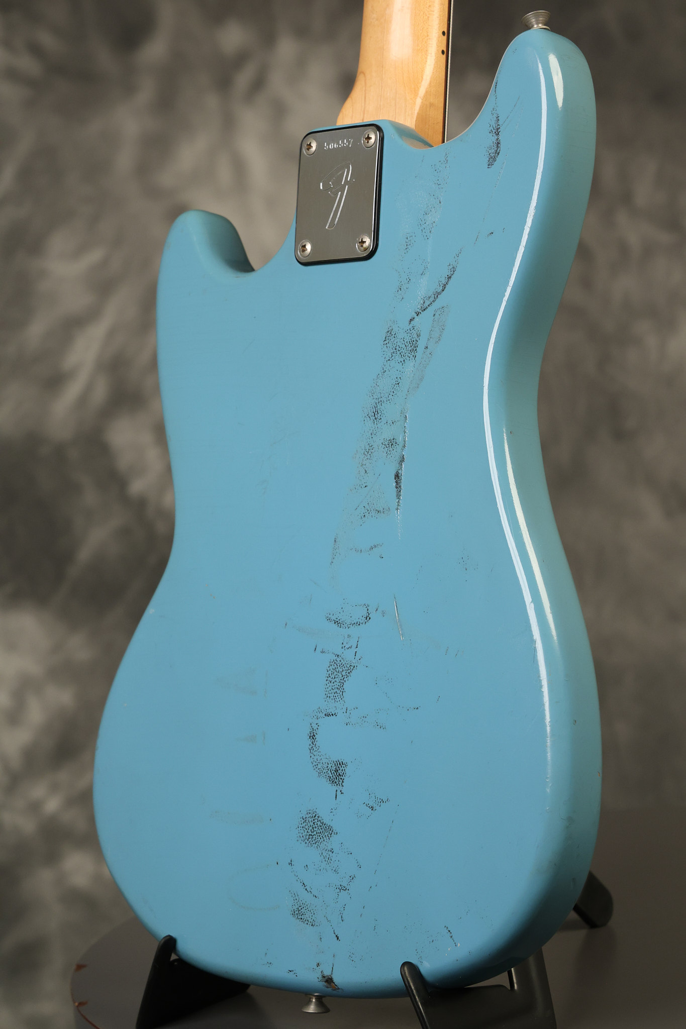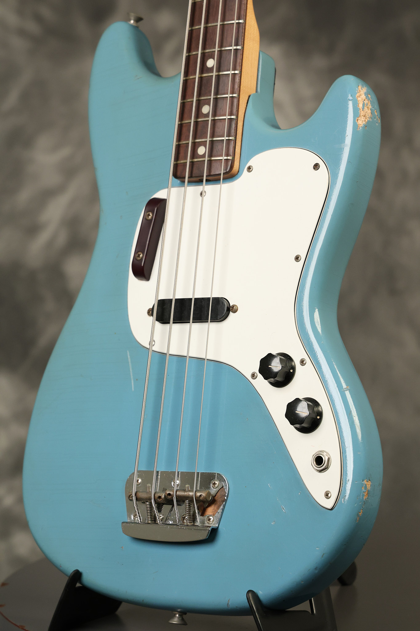 1973 Fender Musicmaster Bass in its original Blue finish. It has a great playing neck with great frets. The bass is all original and a vintage home-made hardshell case is included. There are nicks + dings, some damage in the surface of the wood on the treble side of the body, impressions in the finish on the back of the body from an old guitar strap, finish checking and other cosmetic wear including some flaking in the chrome coating of the bridge plate. The guitar itself remains structurally sound with no cracks, breaks or repairs. All electronics work and sound great.