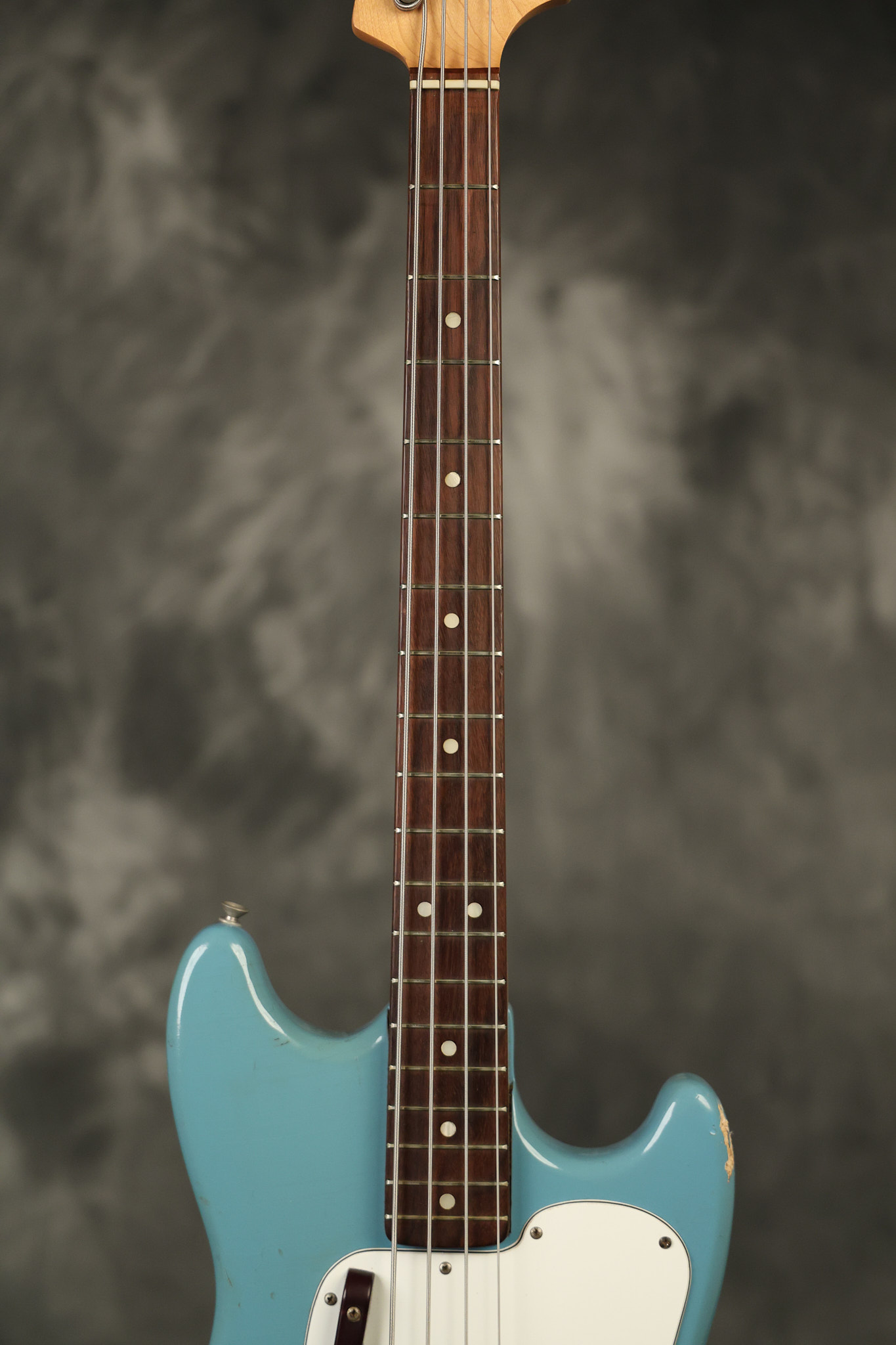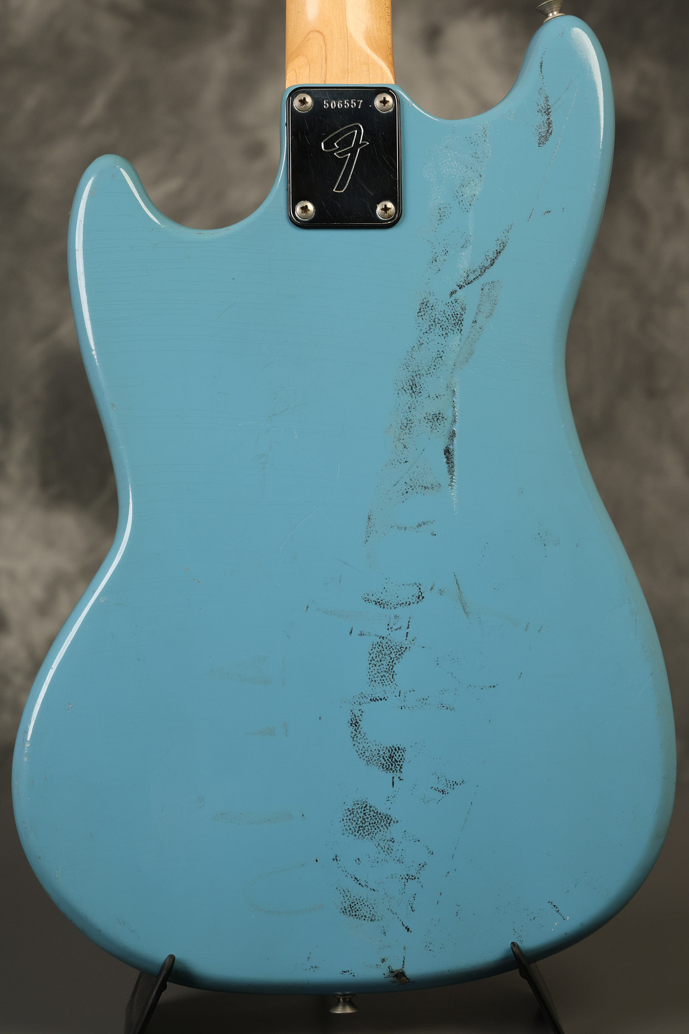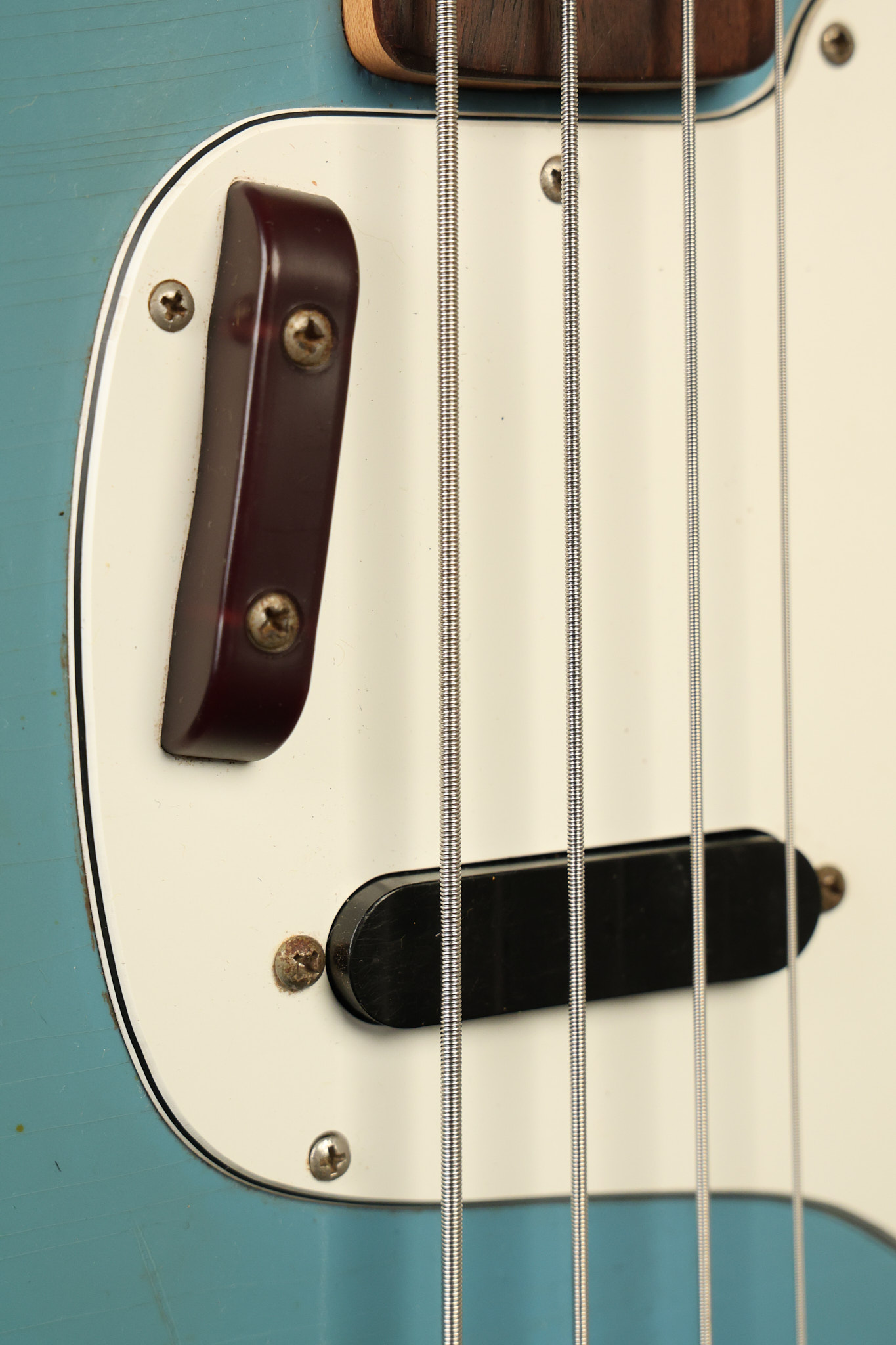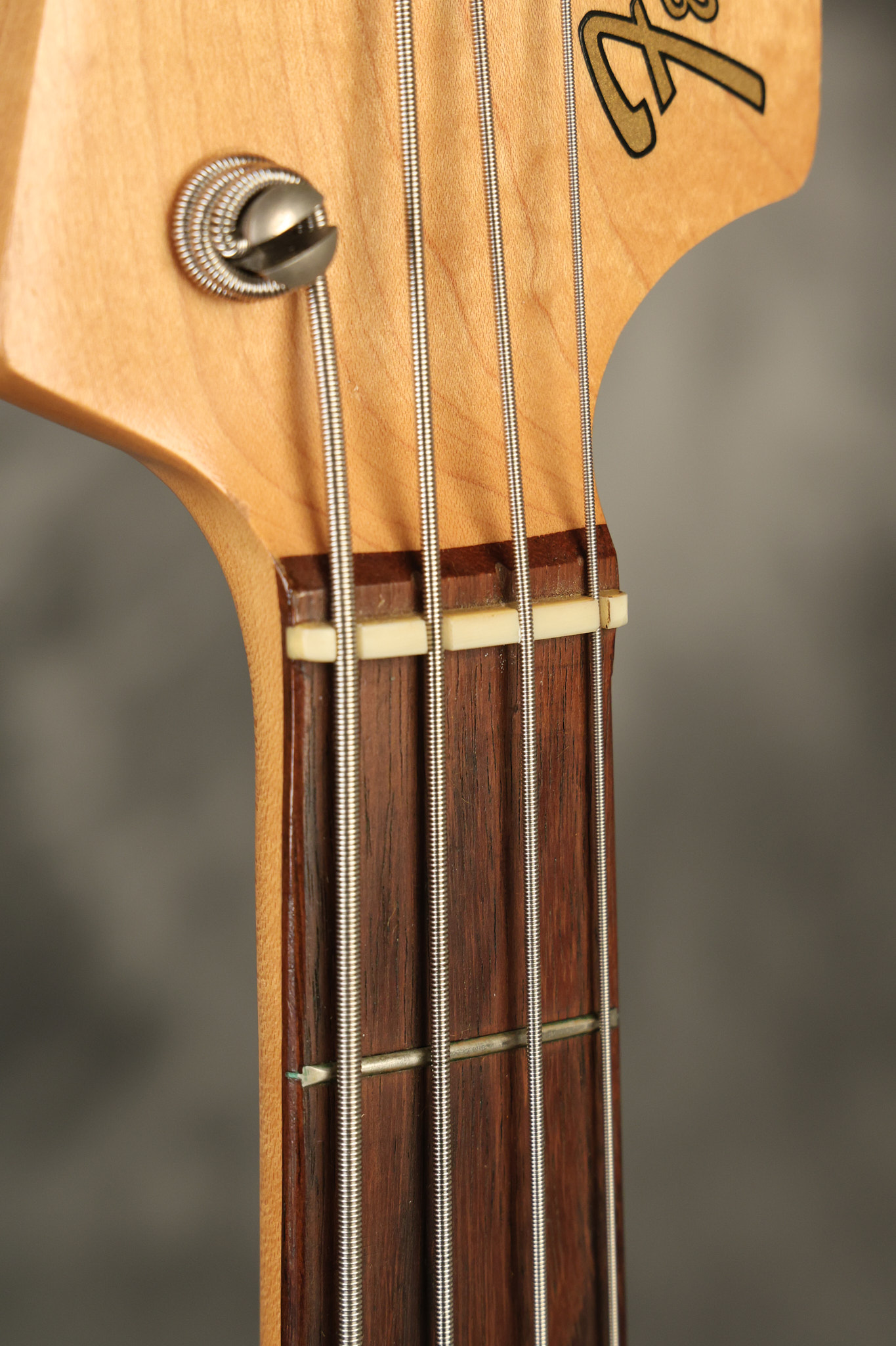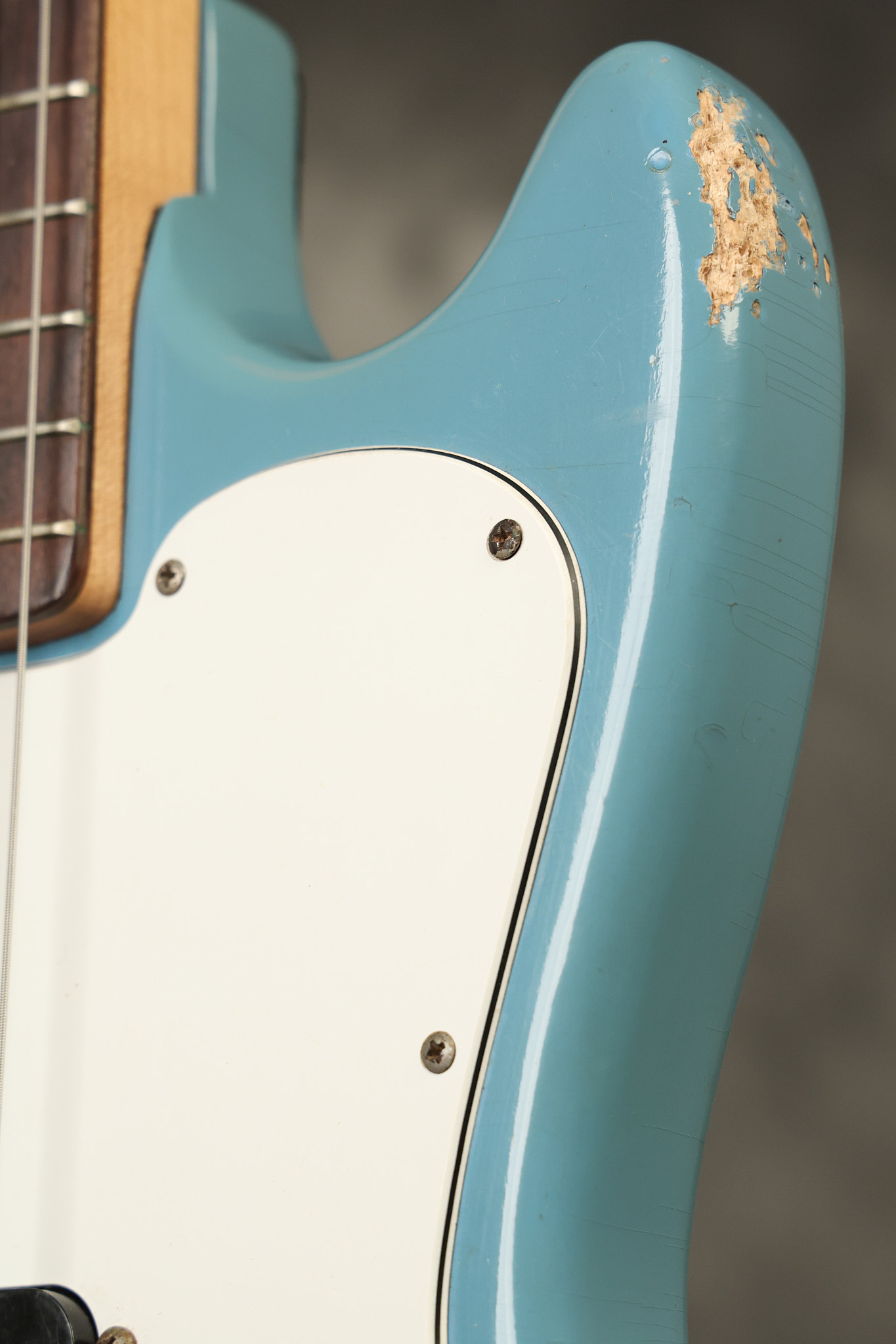 1973 Fender Musicmaster Bass in its original Blue finish. It has a great playing neck with great frets. The bass is all original and a vintage home-made hardshell case is included. There are nicks + dings, some damage in the surface of the wood on the treble side of the body, impressions in the finish on the back of the body from an old guitar strap, finish checking and other cosmetic wear including some flaking in the chrome coating of the bridge plate. The guitar itself remains structurally sound with no cracks, breaks or repairs. All electronics work and sound great.