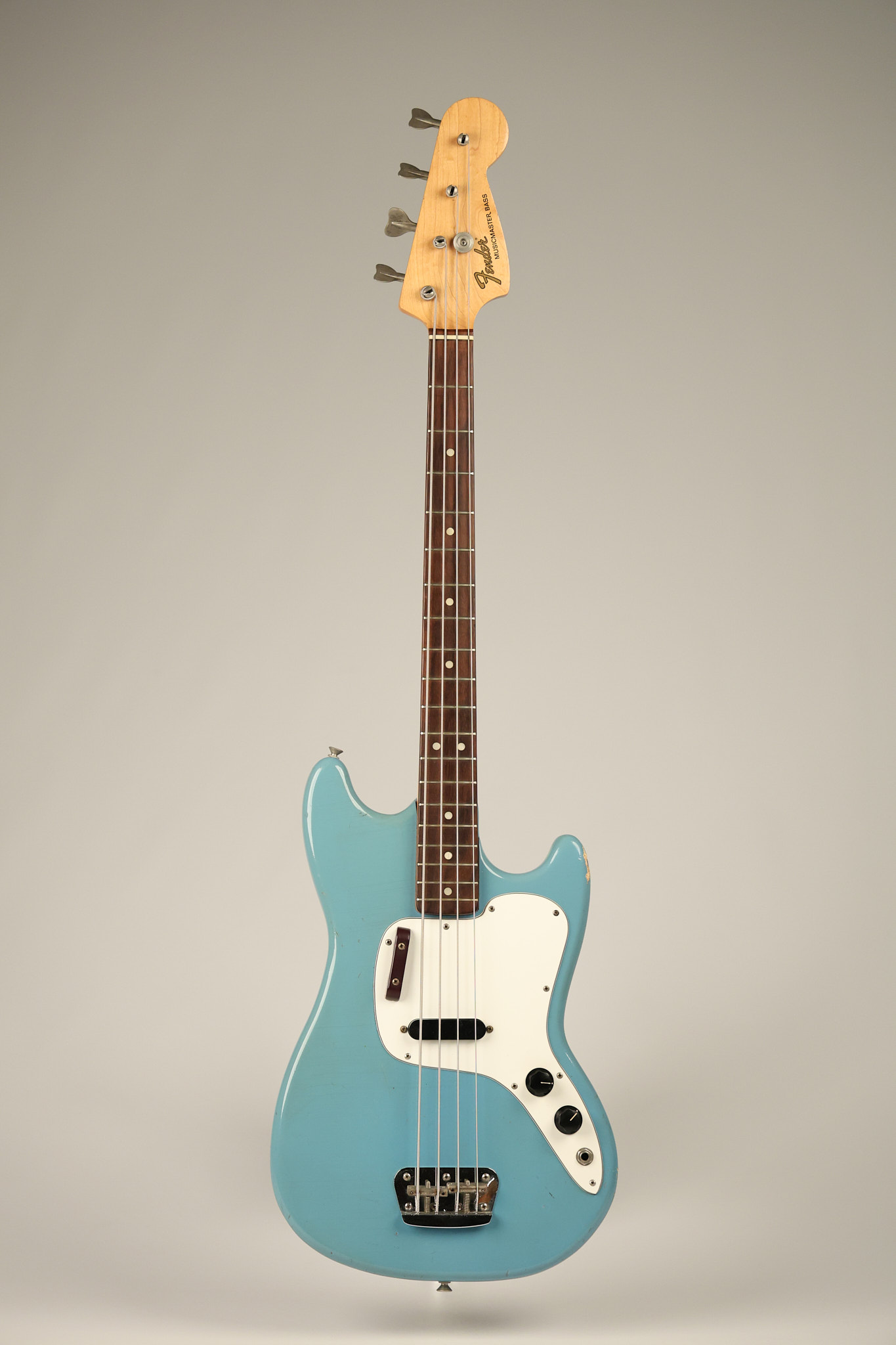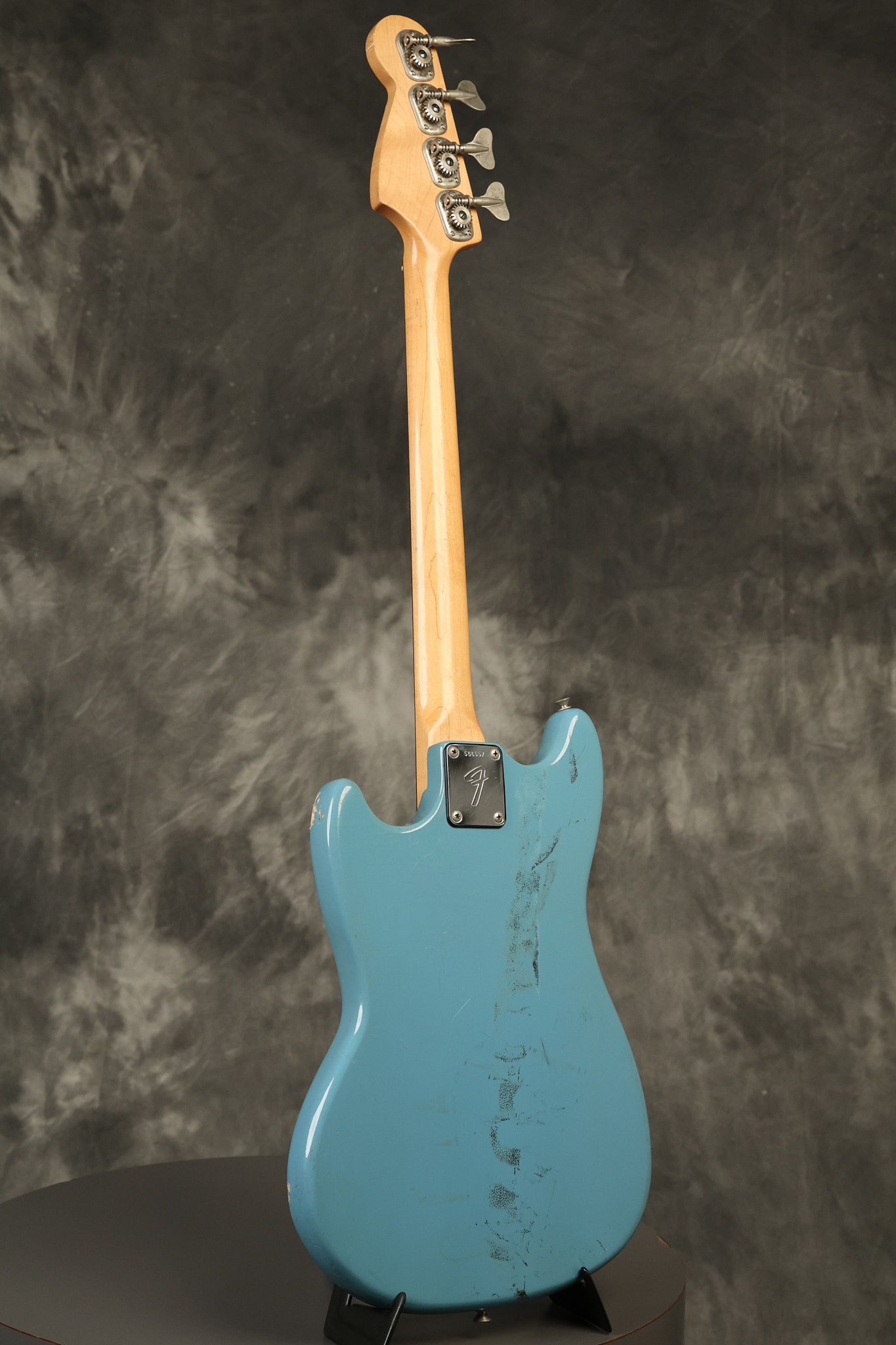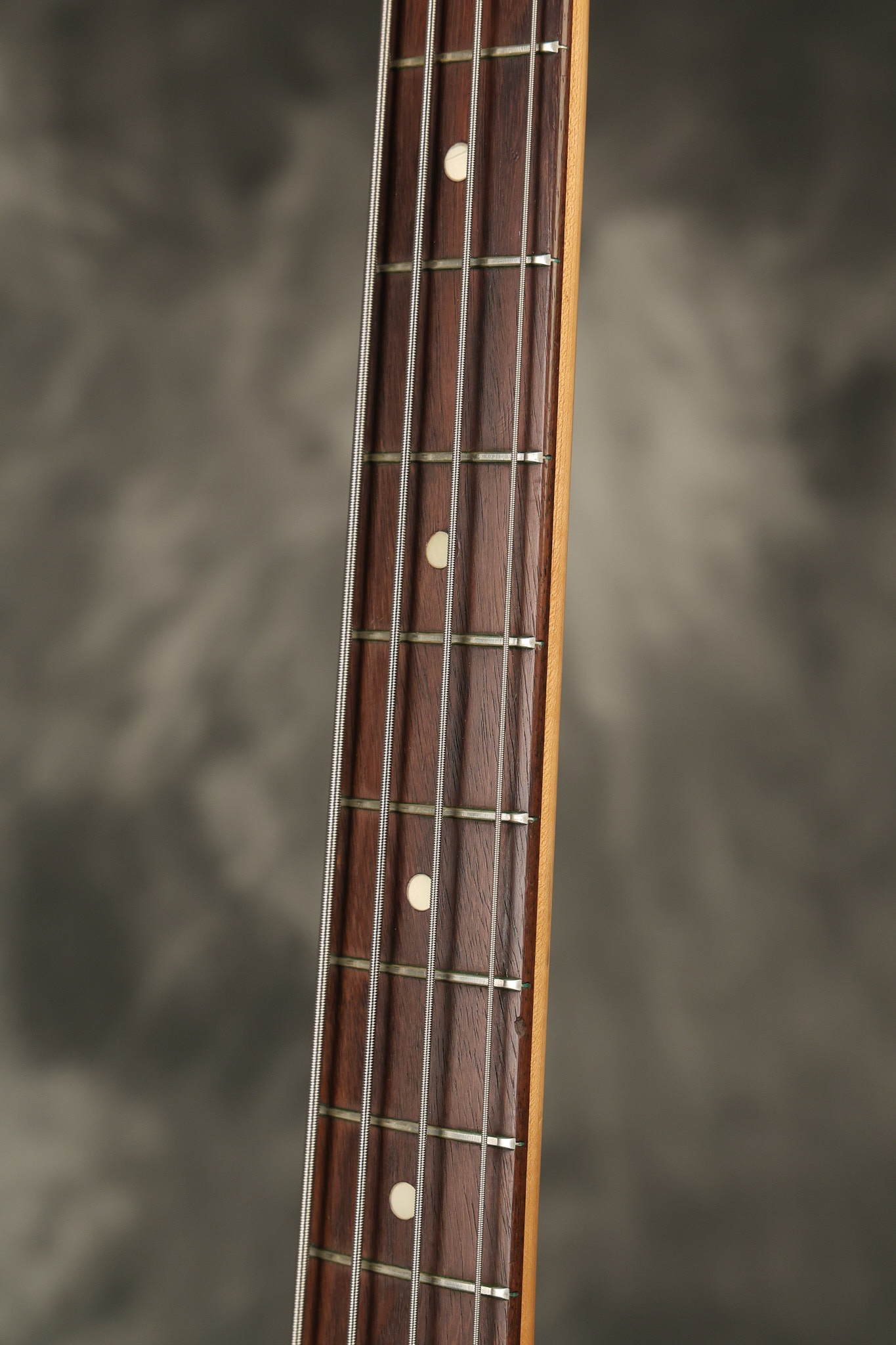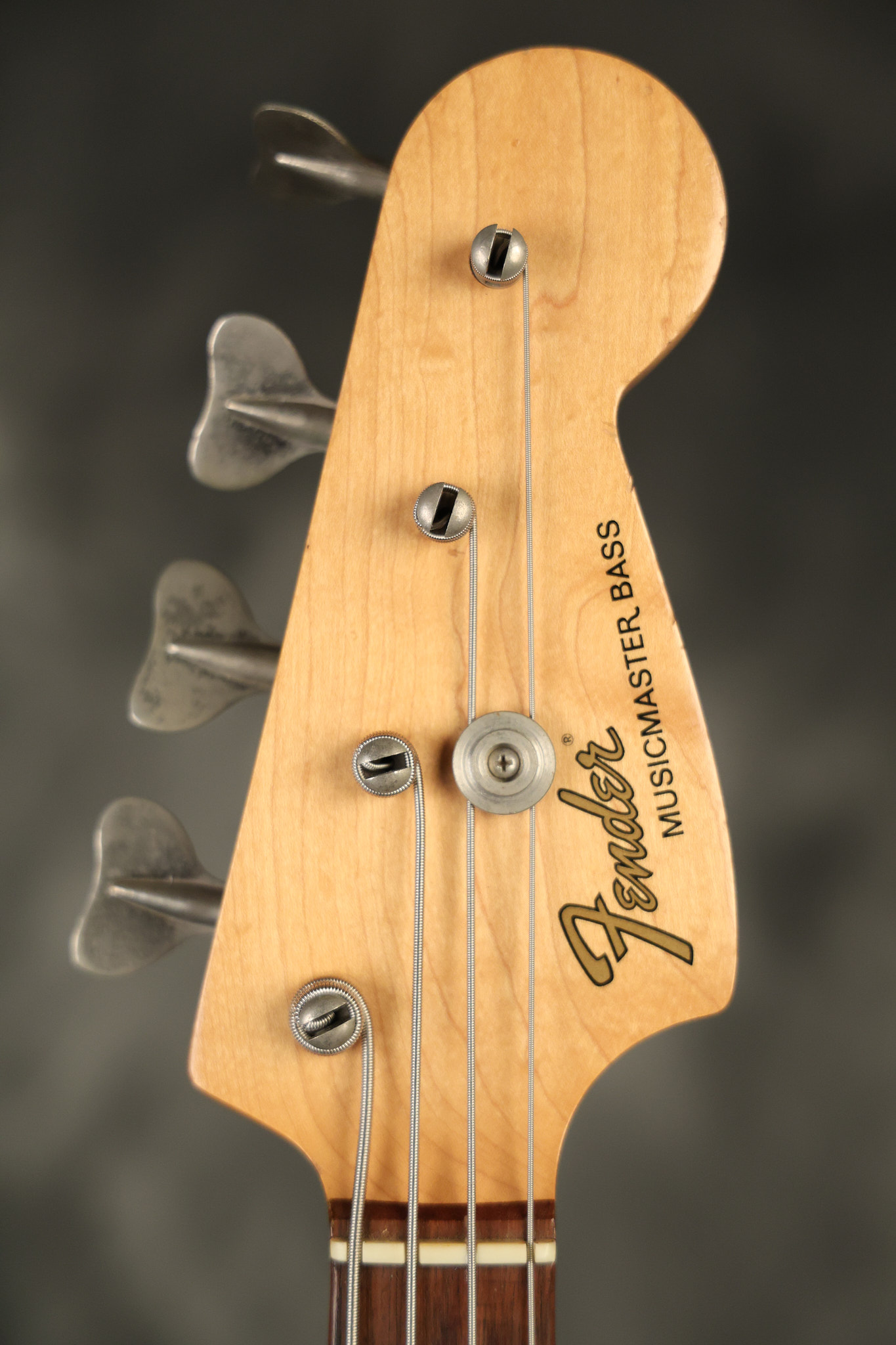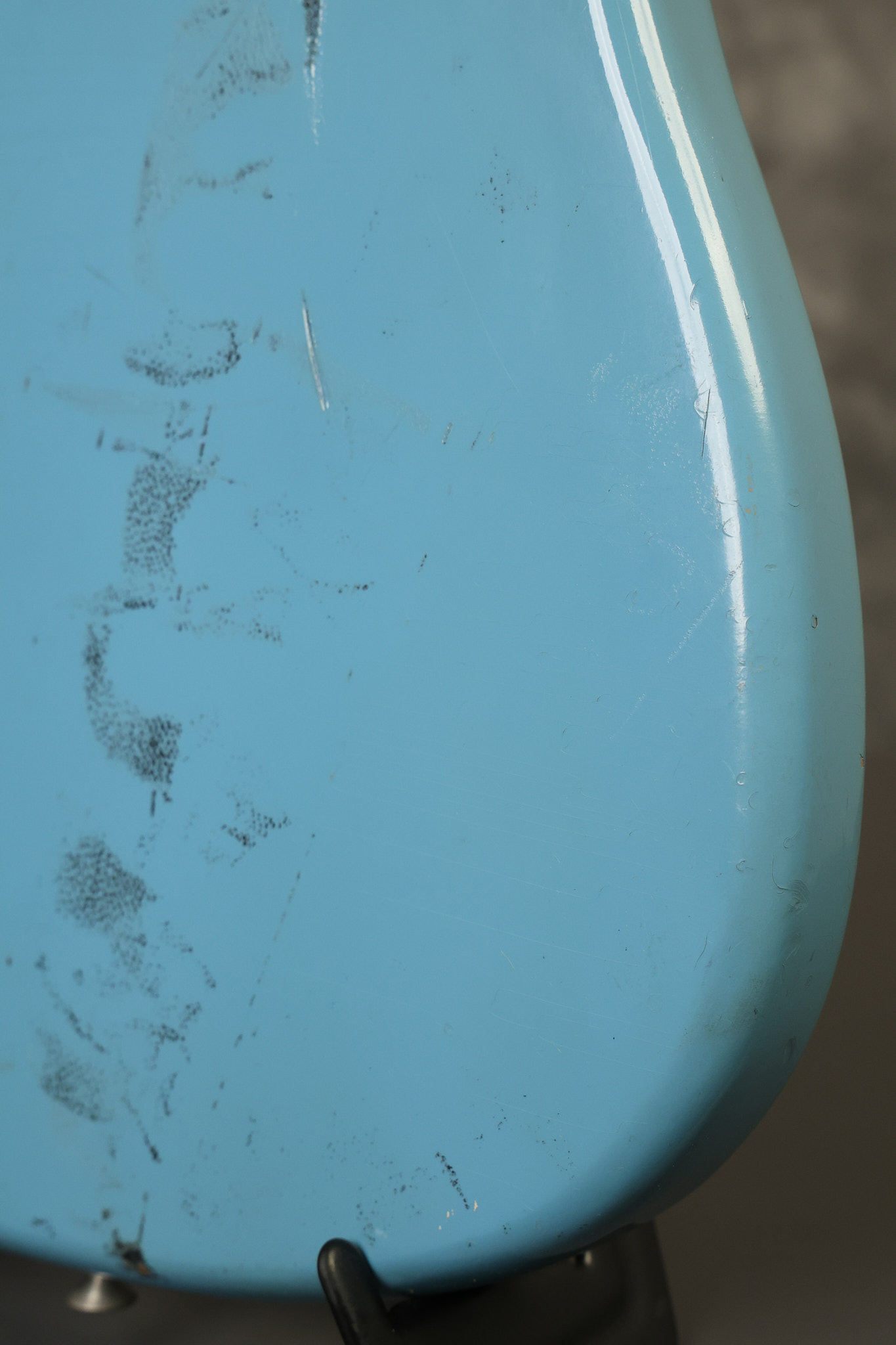 1973 Fender Musicmaster Bass in its original Blue finish. It has a great playing neck with great frets. The bass is all original and a vintage home-made hardshell case is included. There are nicks + dings, some damage in the surface of the wood on the treble side of the body, impressions in the finish on the back of the body from an old guitar strap, finish checking and other cosmetic wear including some flaking in the chrome coating of the bridge plate. The guitar itself remains structurally sound with no cracks, breaks or repairs. All electronics work and sound great.