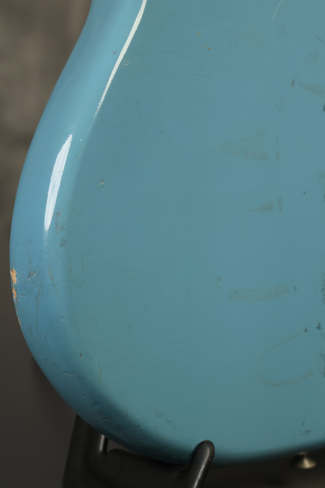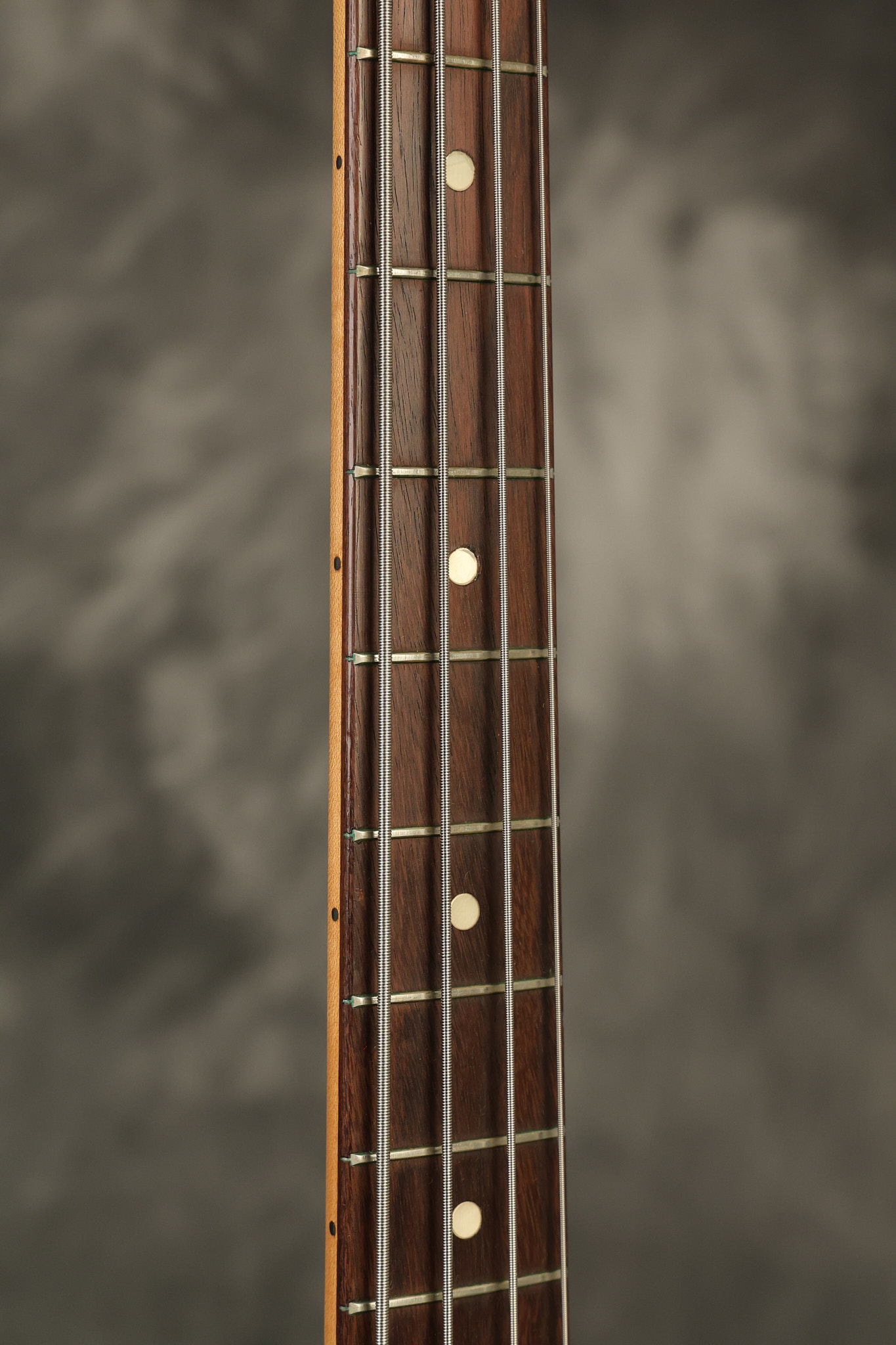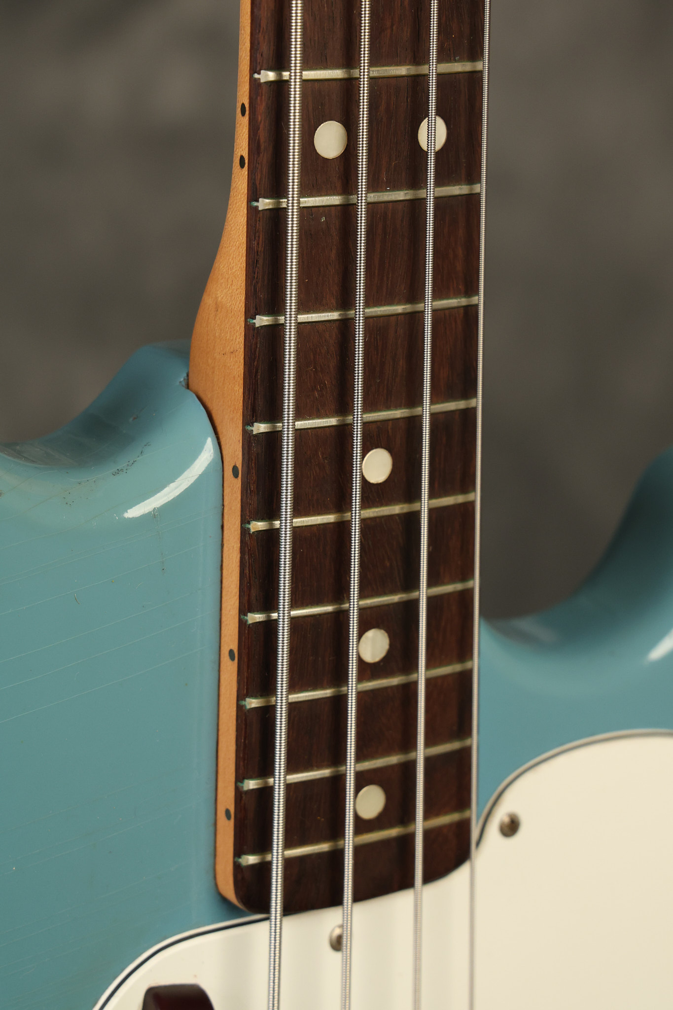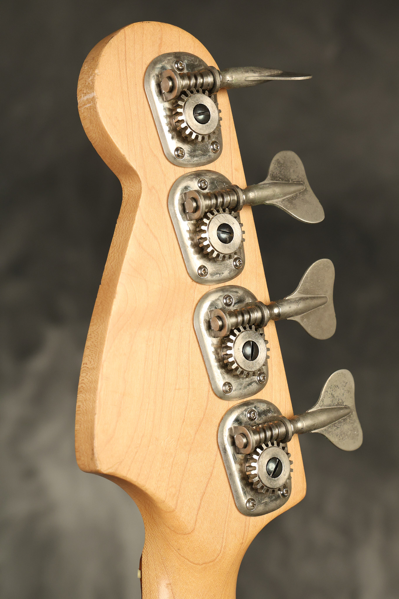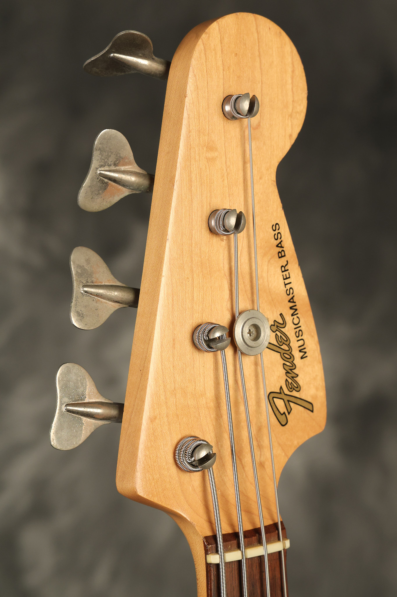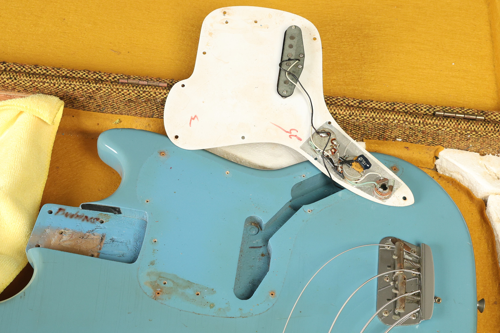 1973 Fender Musicmaster Bass in its original Blue finish. It has a great playing neck with great frets. The bass is all original and a vintage home-made hardshell case is included. There are nicks + dings, some damage in the surface of the wood on the treble side of the body, impressions in the finish on the back of the body from an old guitar strap, finish checking and other cosmetic wear including some flaking in the chrome coating of the bridge plate. The guitar itself remains structurally sound with no cracks, breaks or repairs. All electronics work and sound great.