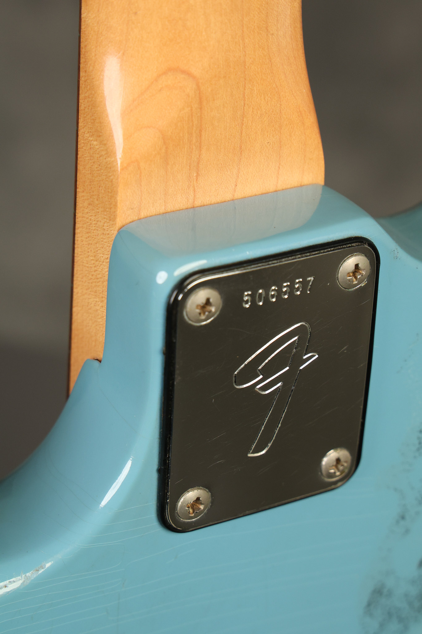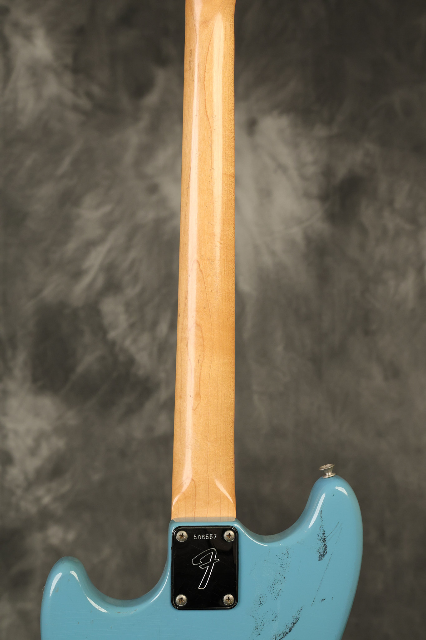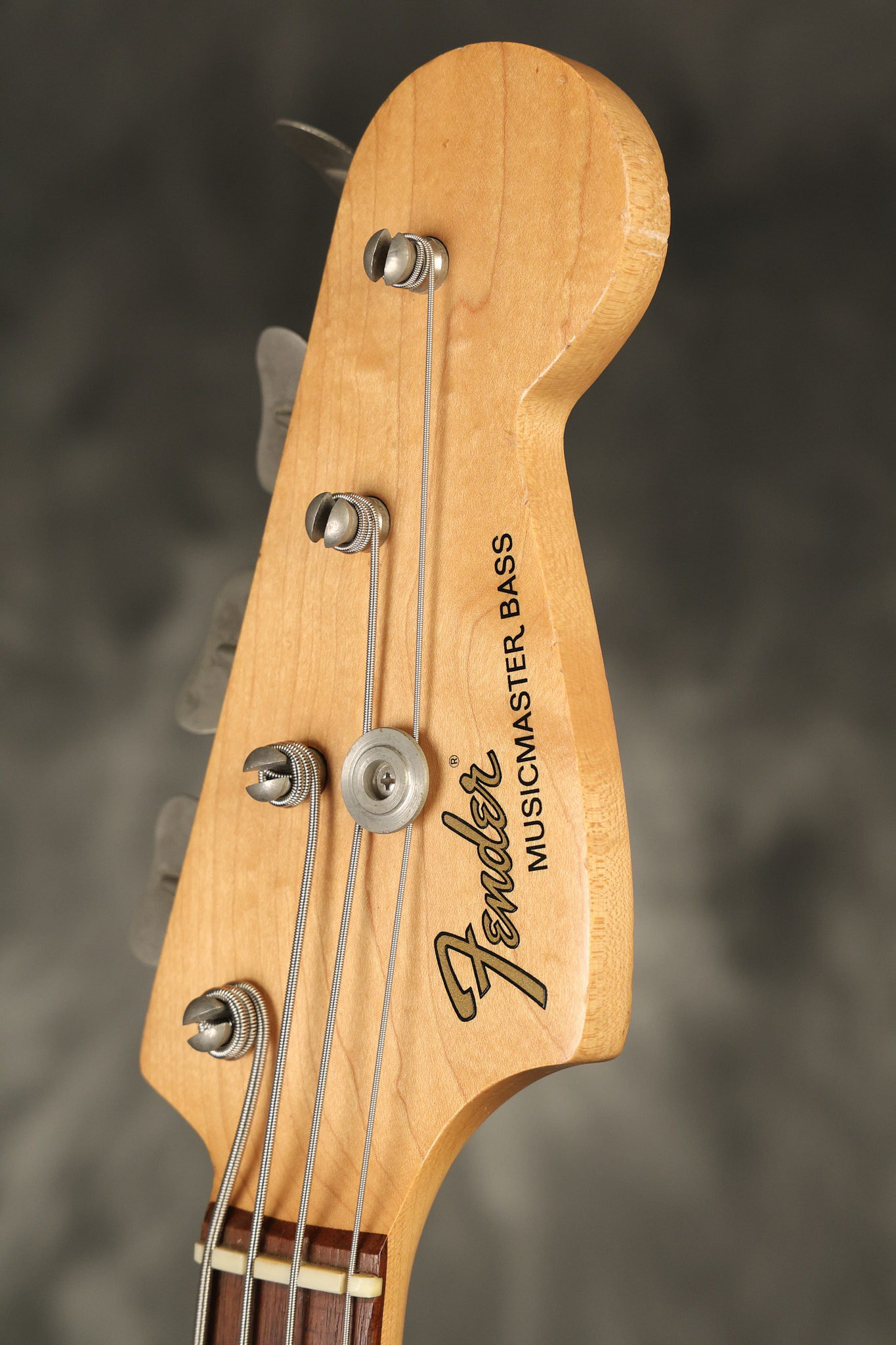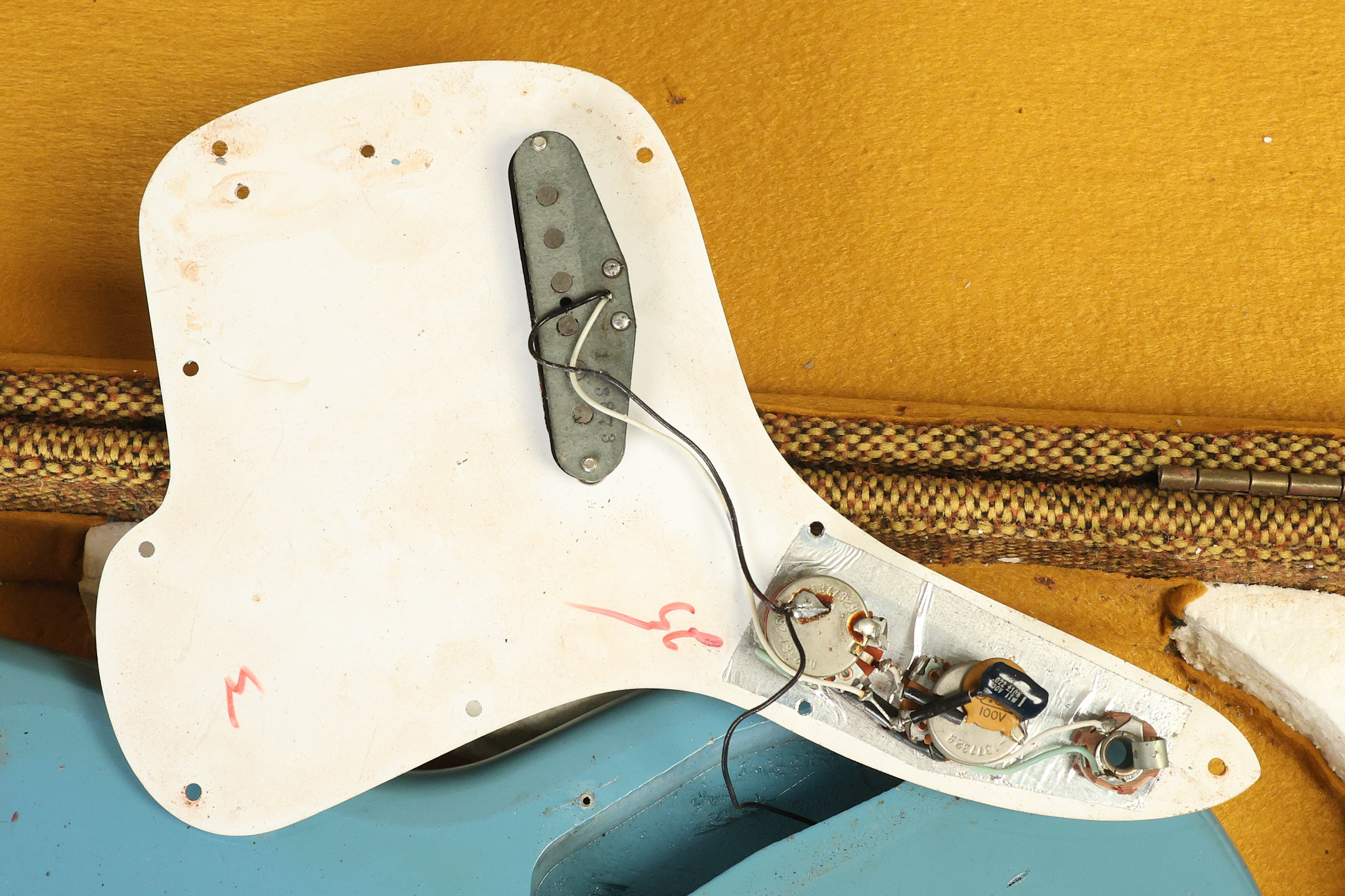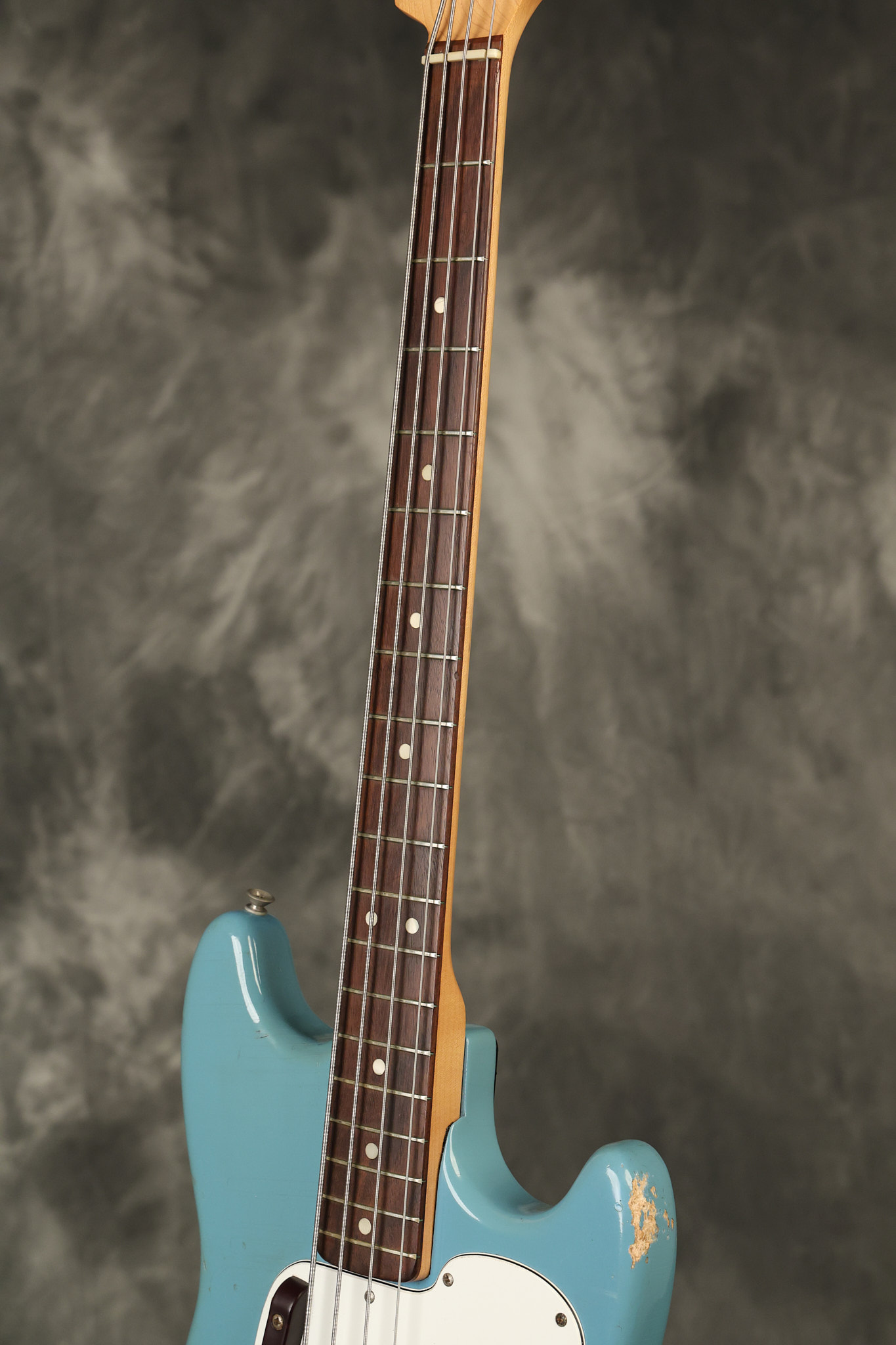1973 Fender Musicmaster Bass in its original Blue finish. It has a great playing neck with great frets. The bass is all original and a vintage home-made hardshell case is included. There are nicks + dings, some damage in the surface of the wood on the treble side of the body, impressions in the finish on the back of the body from an old guitar strap, finish checking and other cosmetic wear including some flaking in the chrome coating of the bridge plate. The guitar itself remains structurally sound with no cracks, breaks or repairs. All electronics work and sound great.