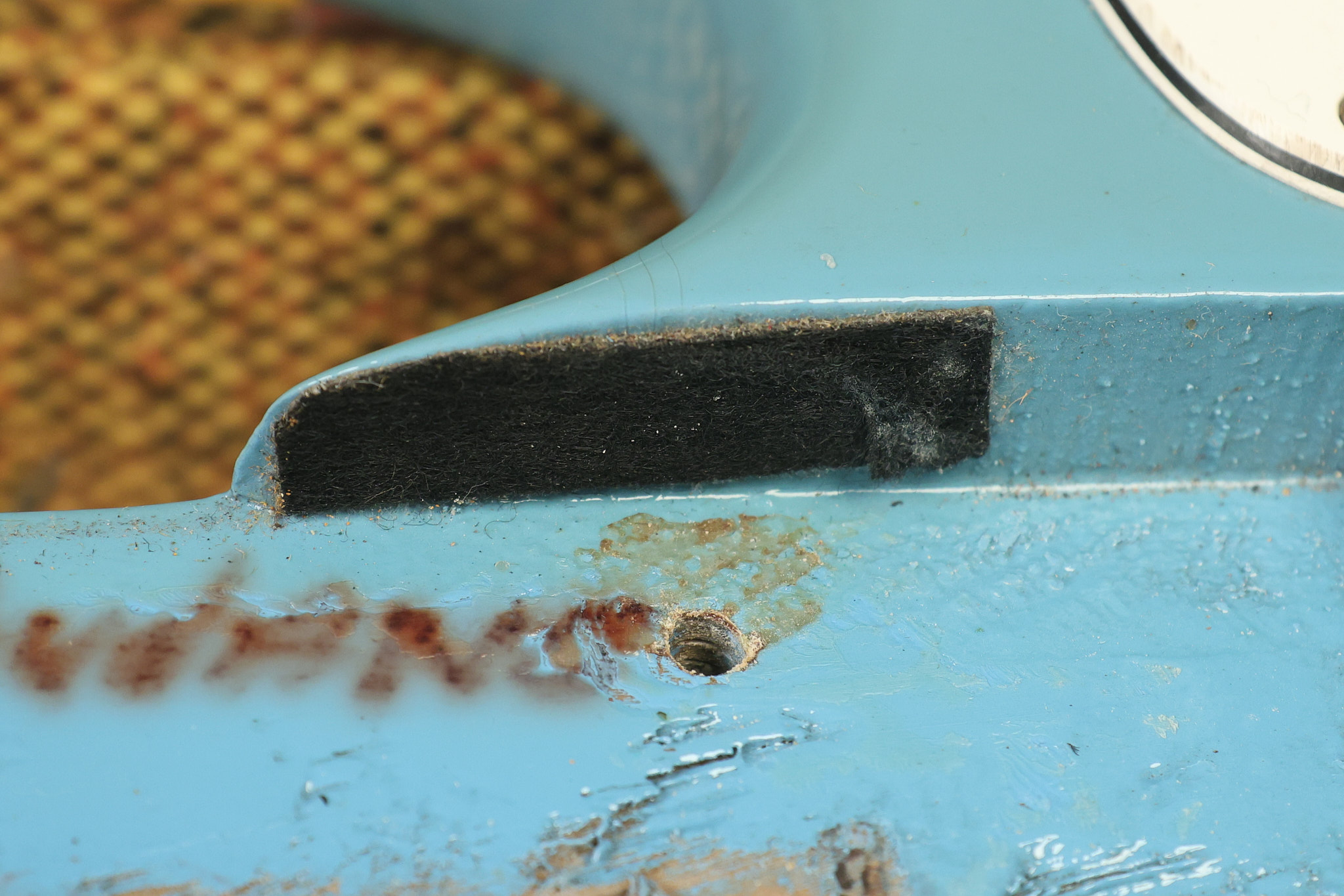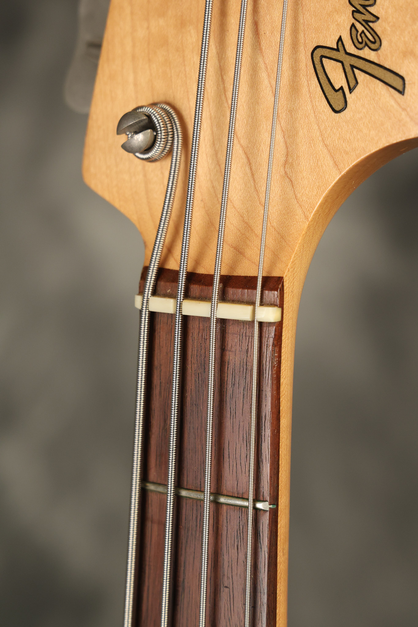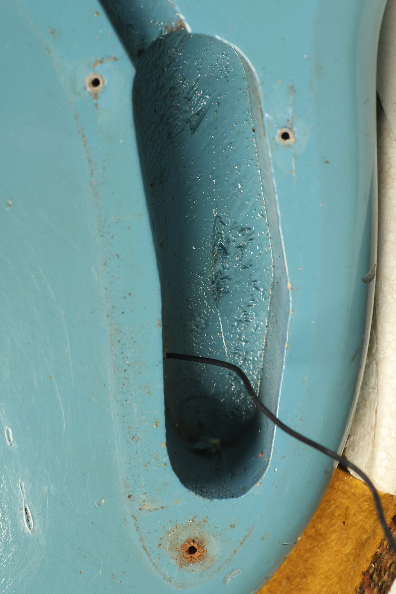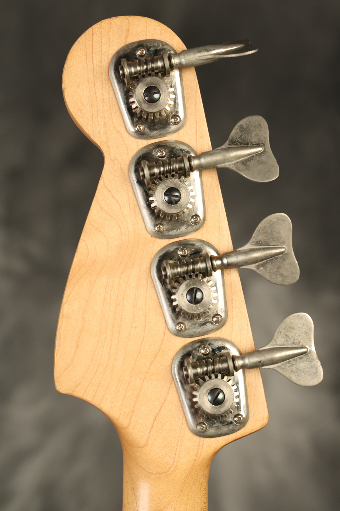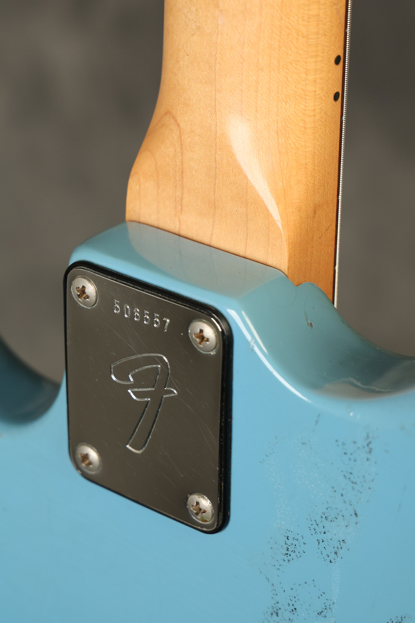 1973 Fender Musicmaster Bass in its original Blue finish. It has a great playing neck with great frets. The bass is all original and a vintage home-made hardshell case is included. There are nicks + dings, some damage in the surface of the wood on the treble side of the body, impressions in the finish on the back of the body from an old guitar strap, finish checking and other cosmetic wear including some flaking in the chrome coating of the bridge plate. The guitar itself remains structurally sound with no cracks, breaks or repairs. All electronics work and sound great.