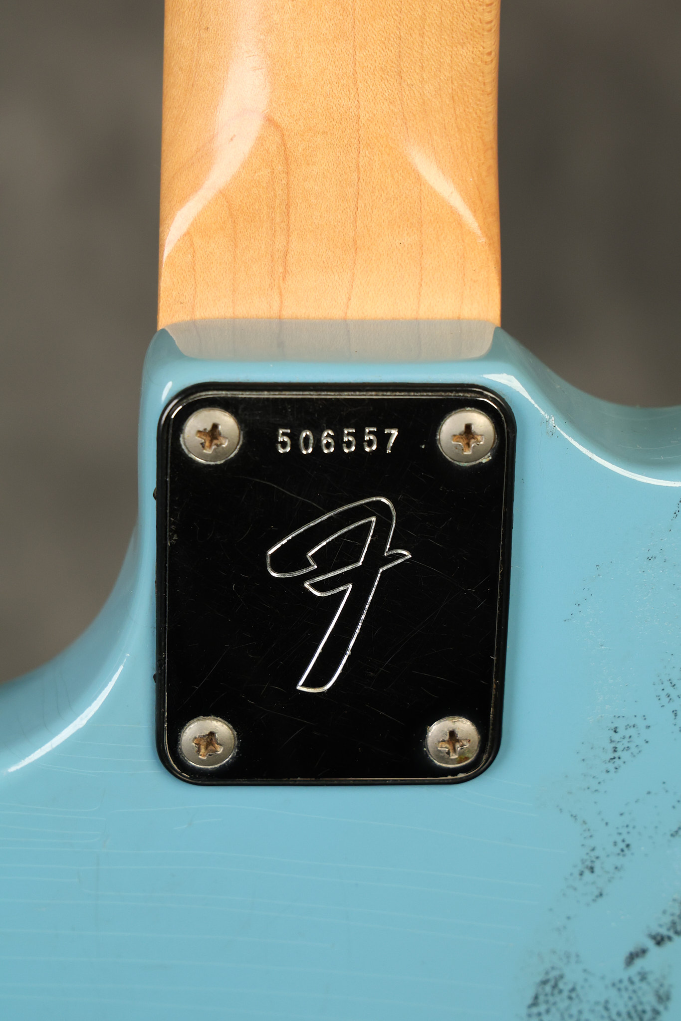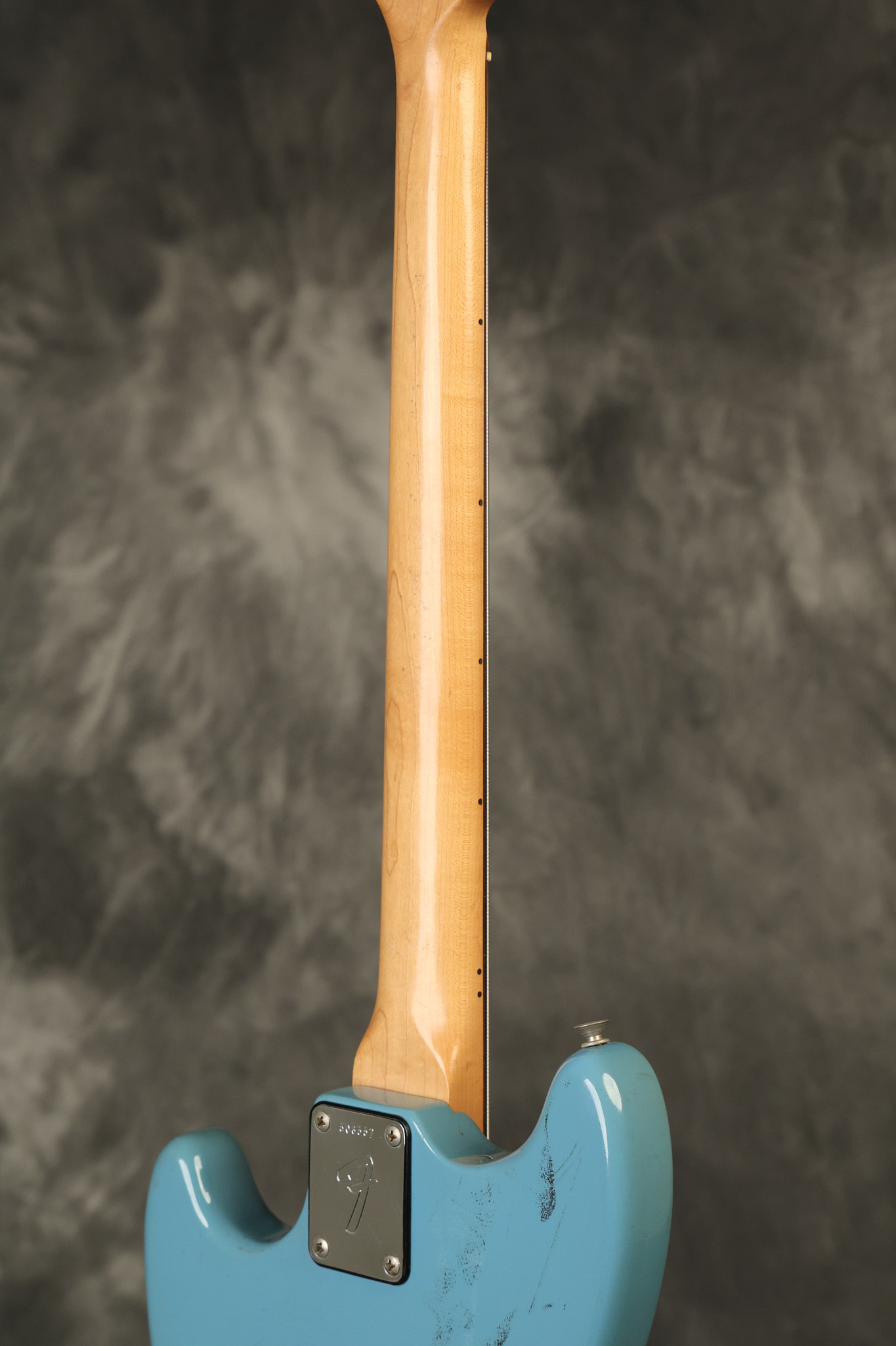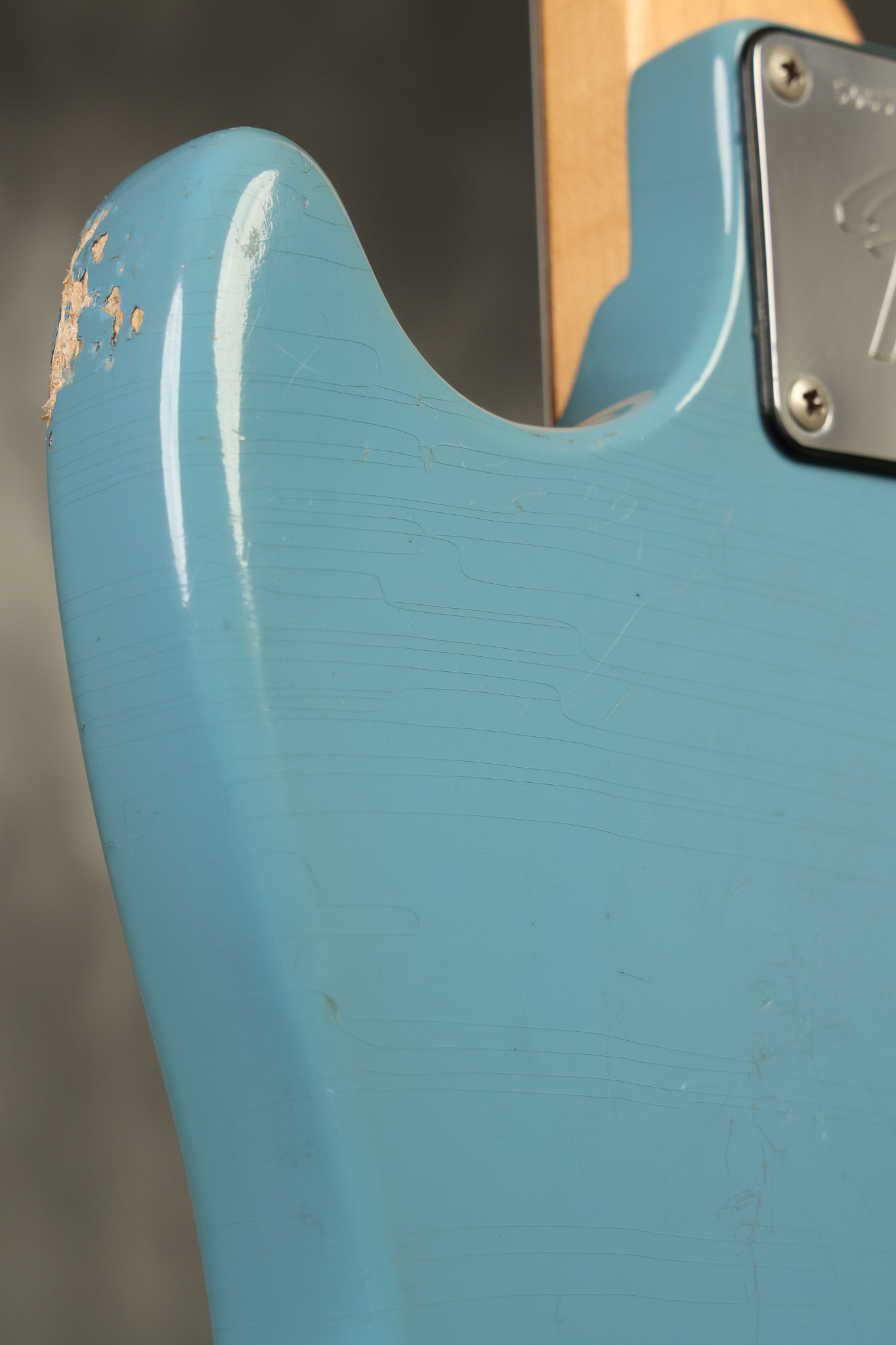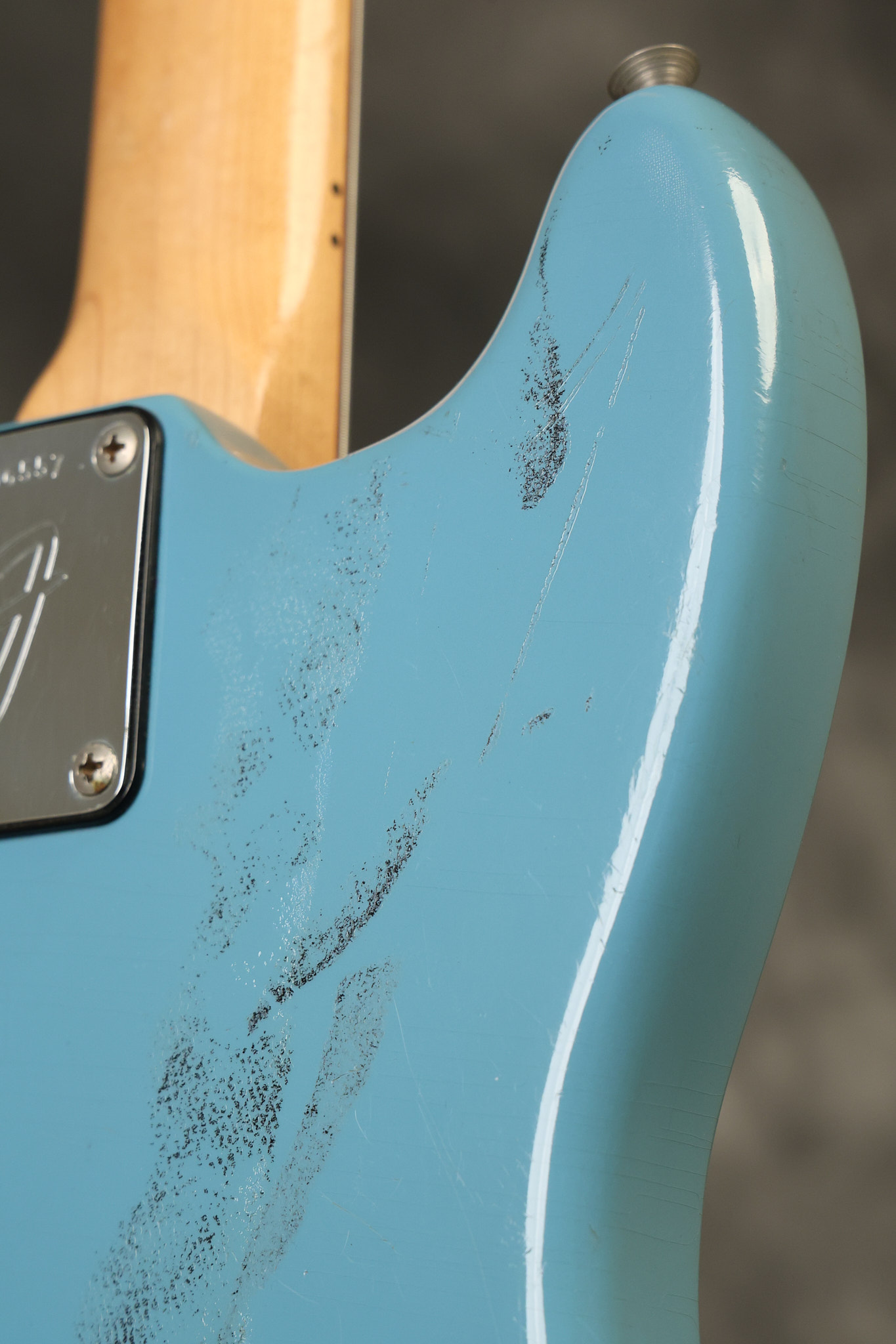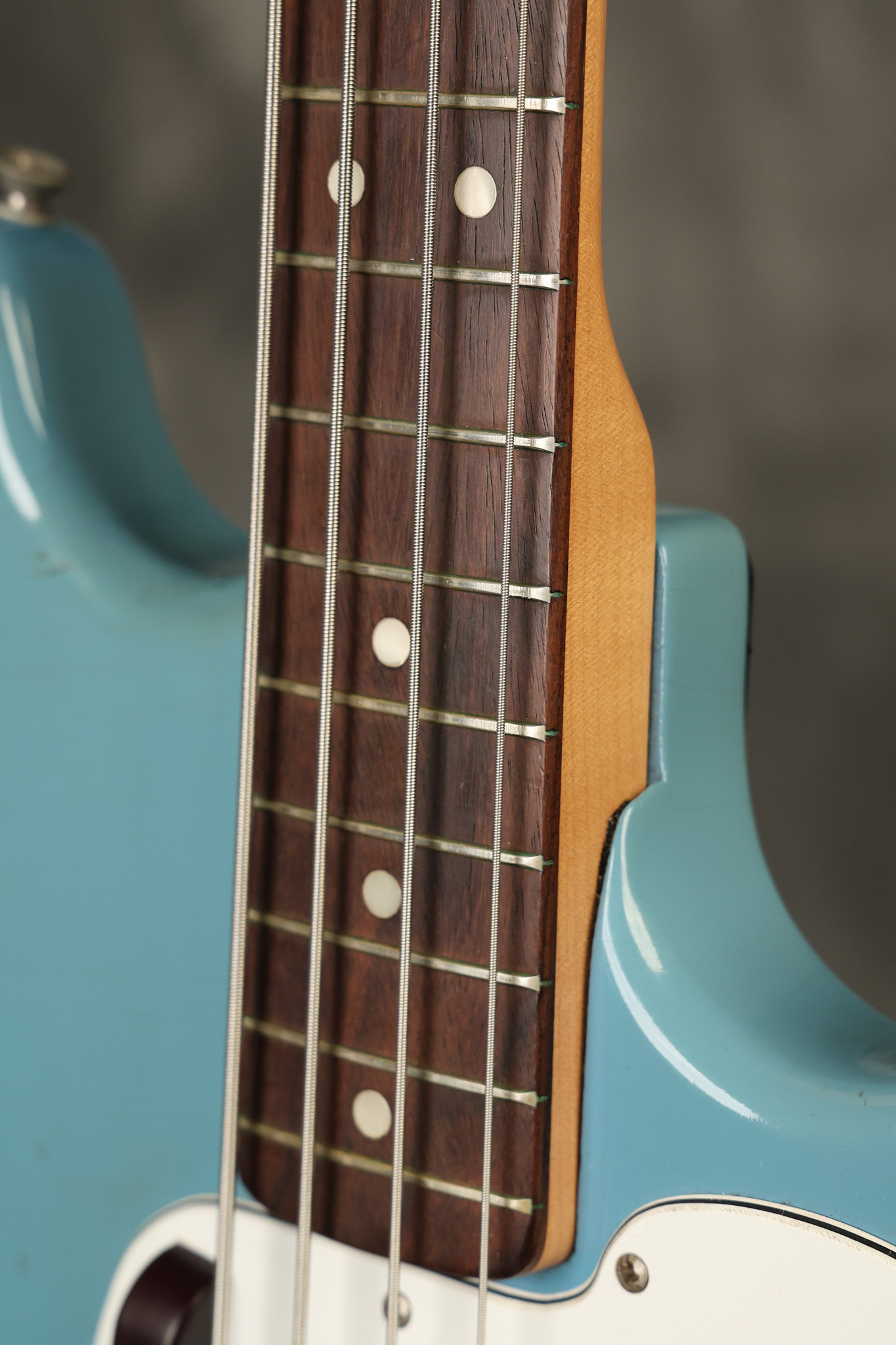 1973 Fender Musicmaster Bass in its original Blue finish. It has a great playing neck with great frets. The bass is all original and a vintage home-made hardshell case is included. There are nicks + dings, some damage in the surface of the wood on the treble side of the body, impressions in the finish on the back of the body from an old guitar strap, finish checking and other cosmetic wear including some flaking in the chrome coating of the bridge plate. The guitar itself remains structurally sound with no cracks, breaks or repairs. All electronics work and sound great.