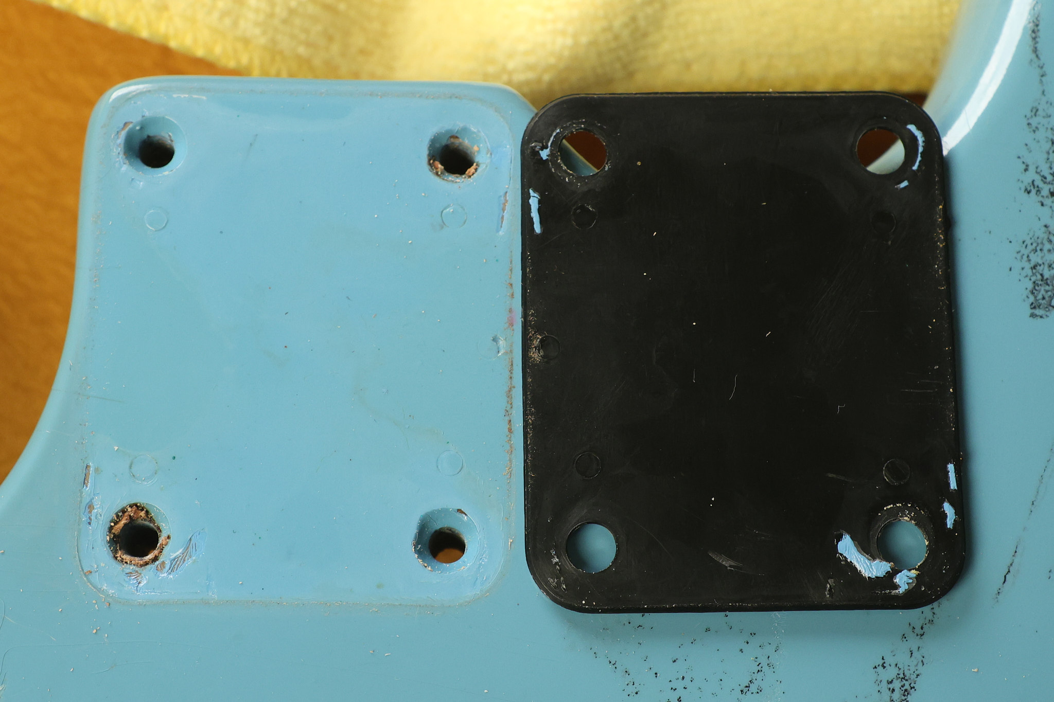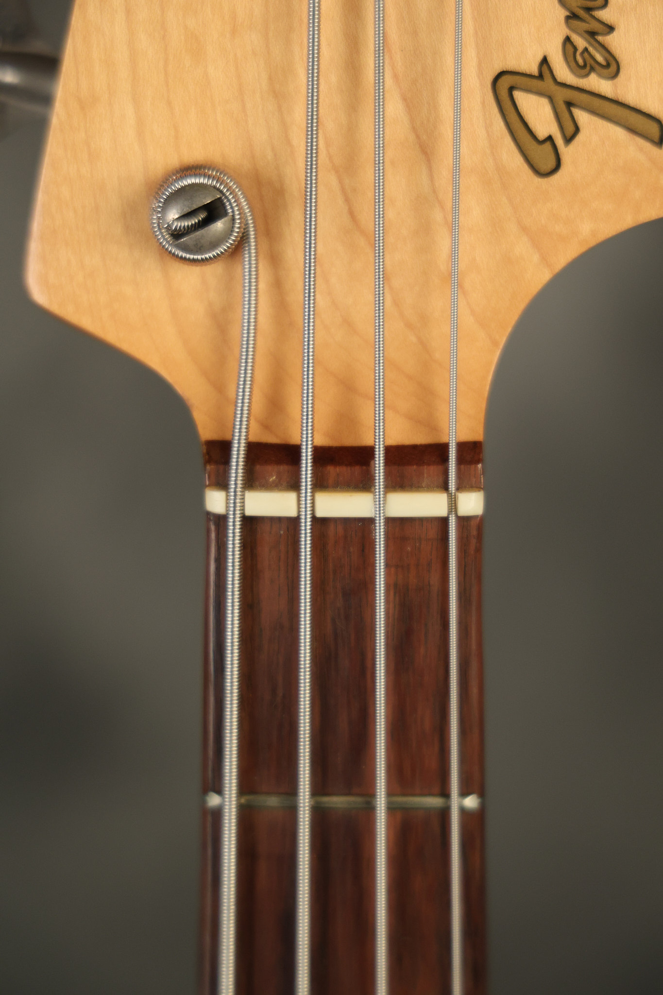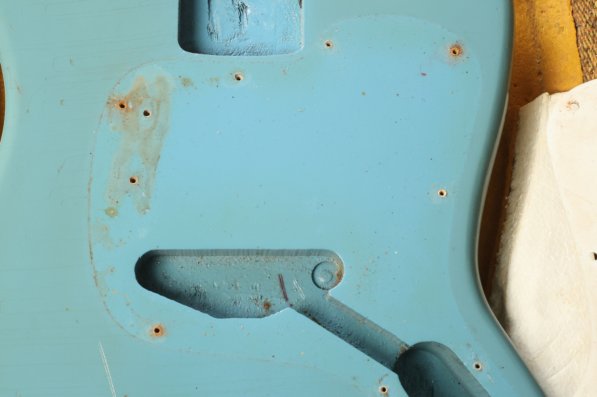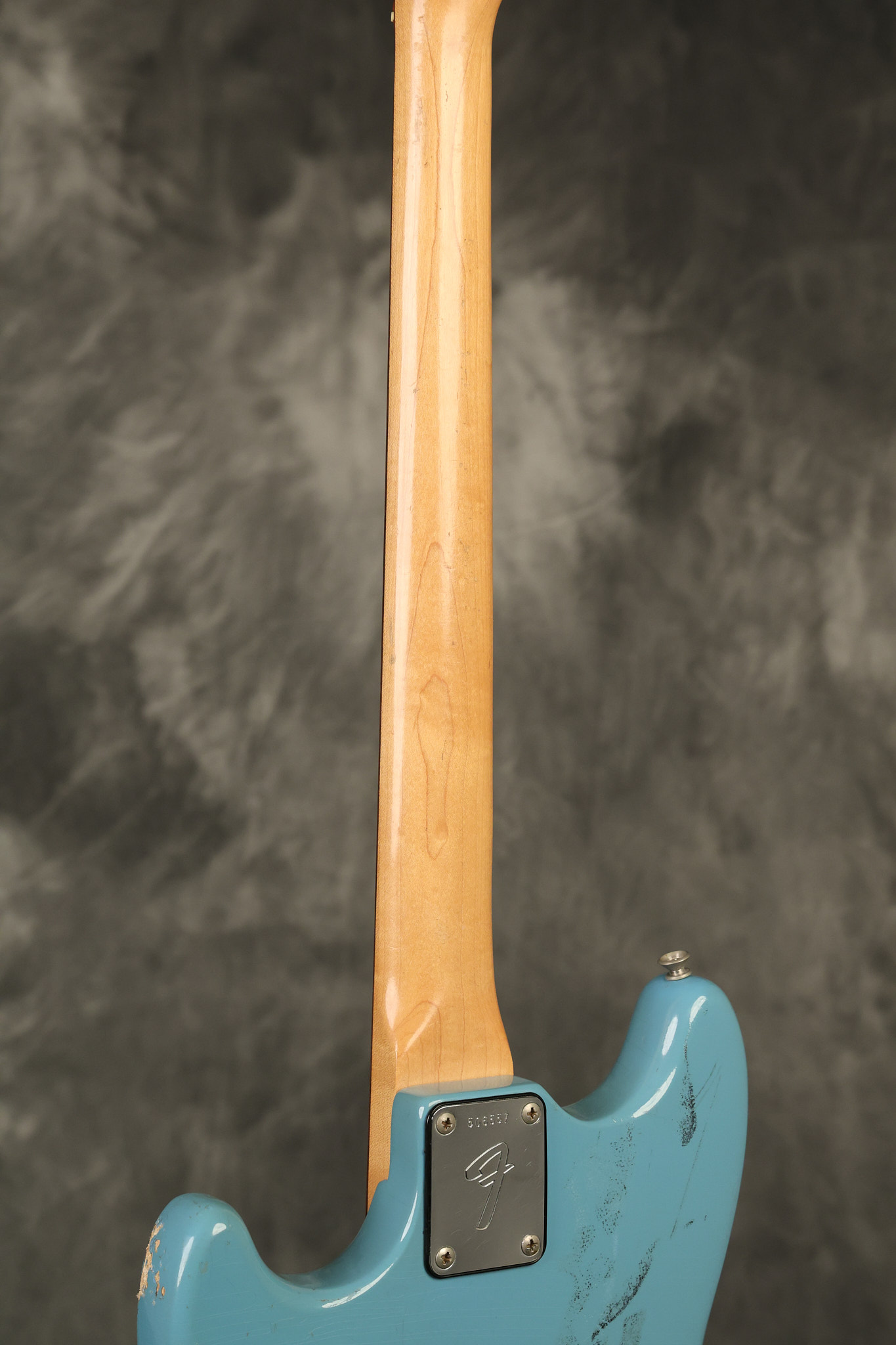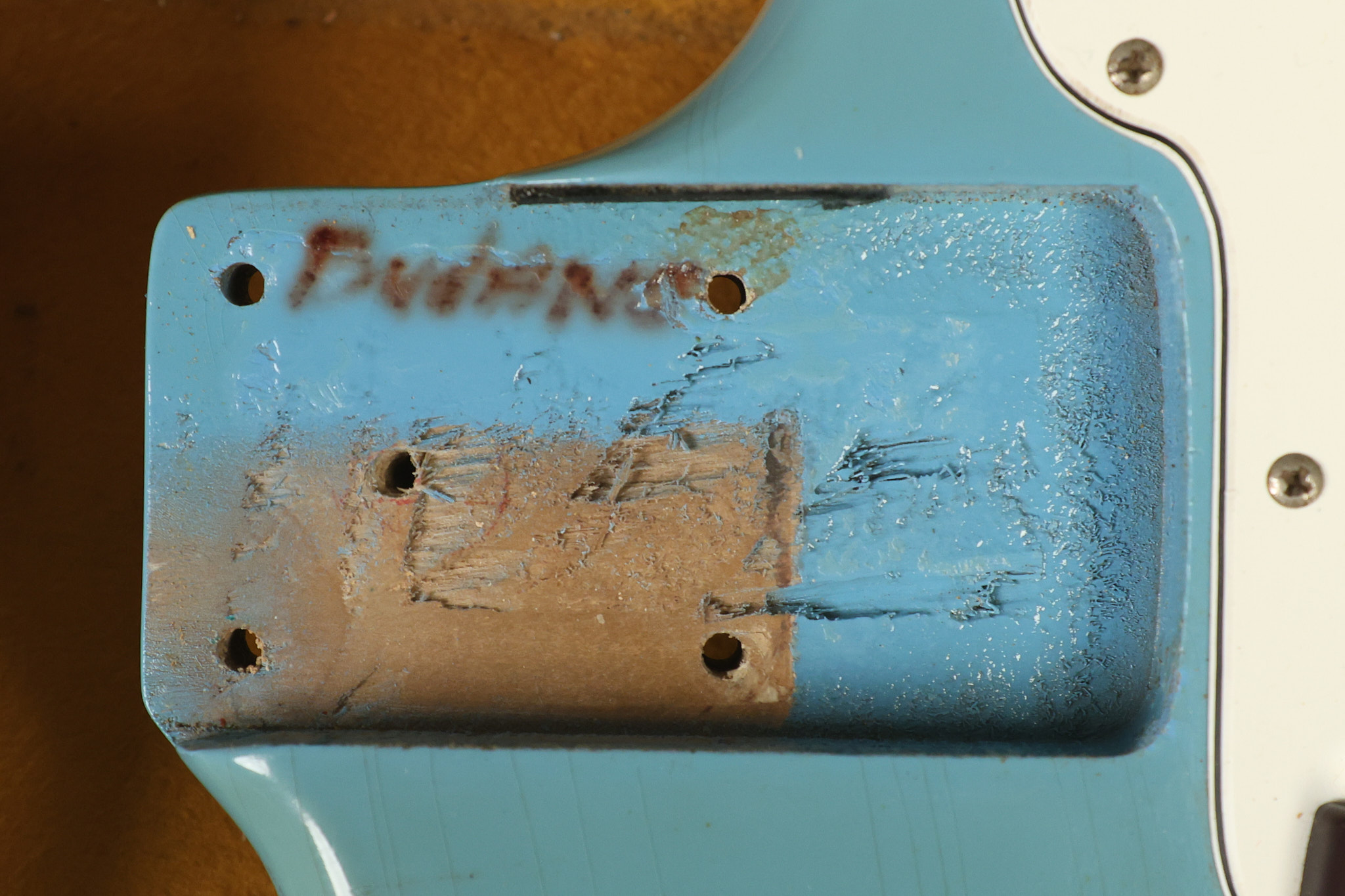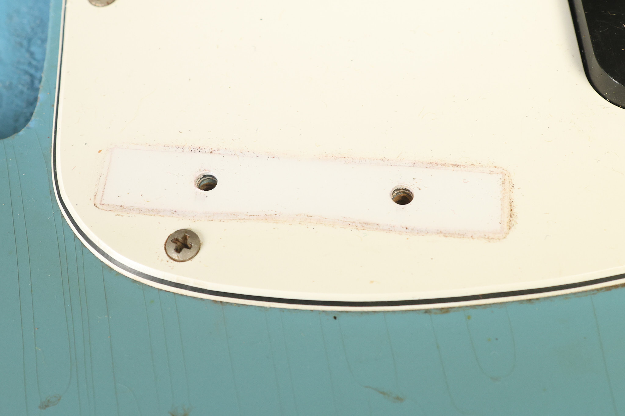 1973 Fender Musicmaster Bass in its original Blue finish. It has a great playing neck with great frets. The bass is all original and a vintage home-made hardshell case is included. There are nicks + dings, some damage in the surface of the wood on the treble side of the body, impressions in the finish on the back of the body from an old guitar strap, finish checking and other cosmetic wear including some flaking in the chrome coating of the bridge plate. The guitar itself remains structurally sound with no cracks, breaks or repairs. All electronics work and sound great.