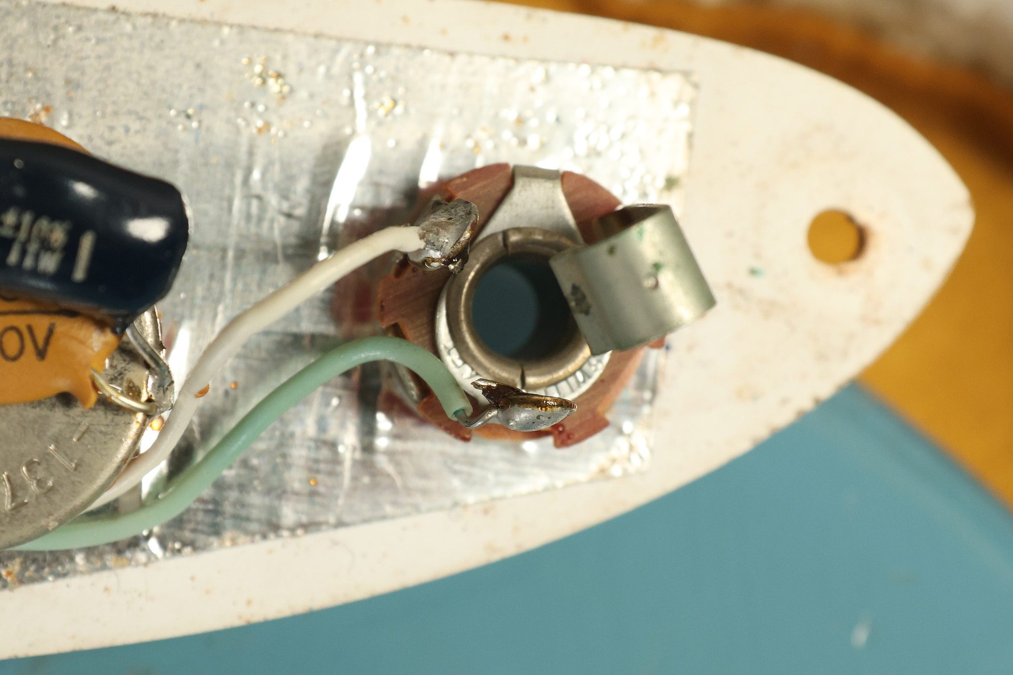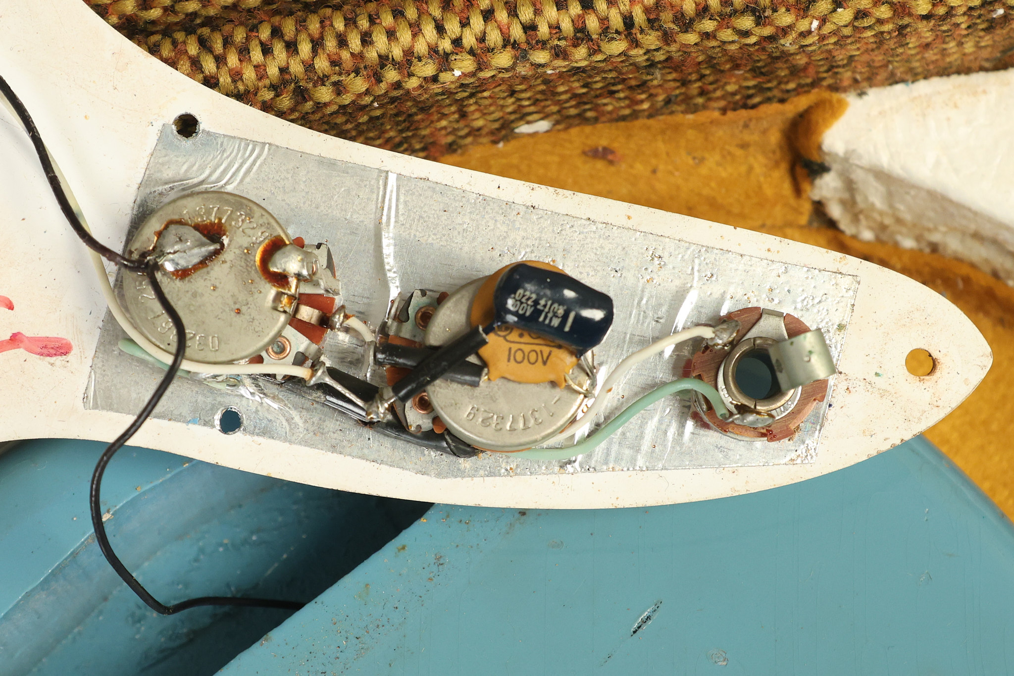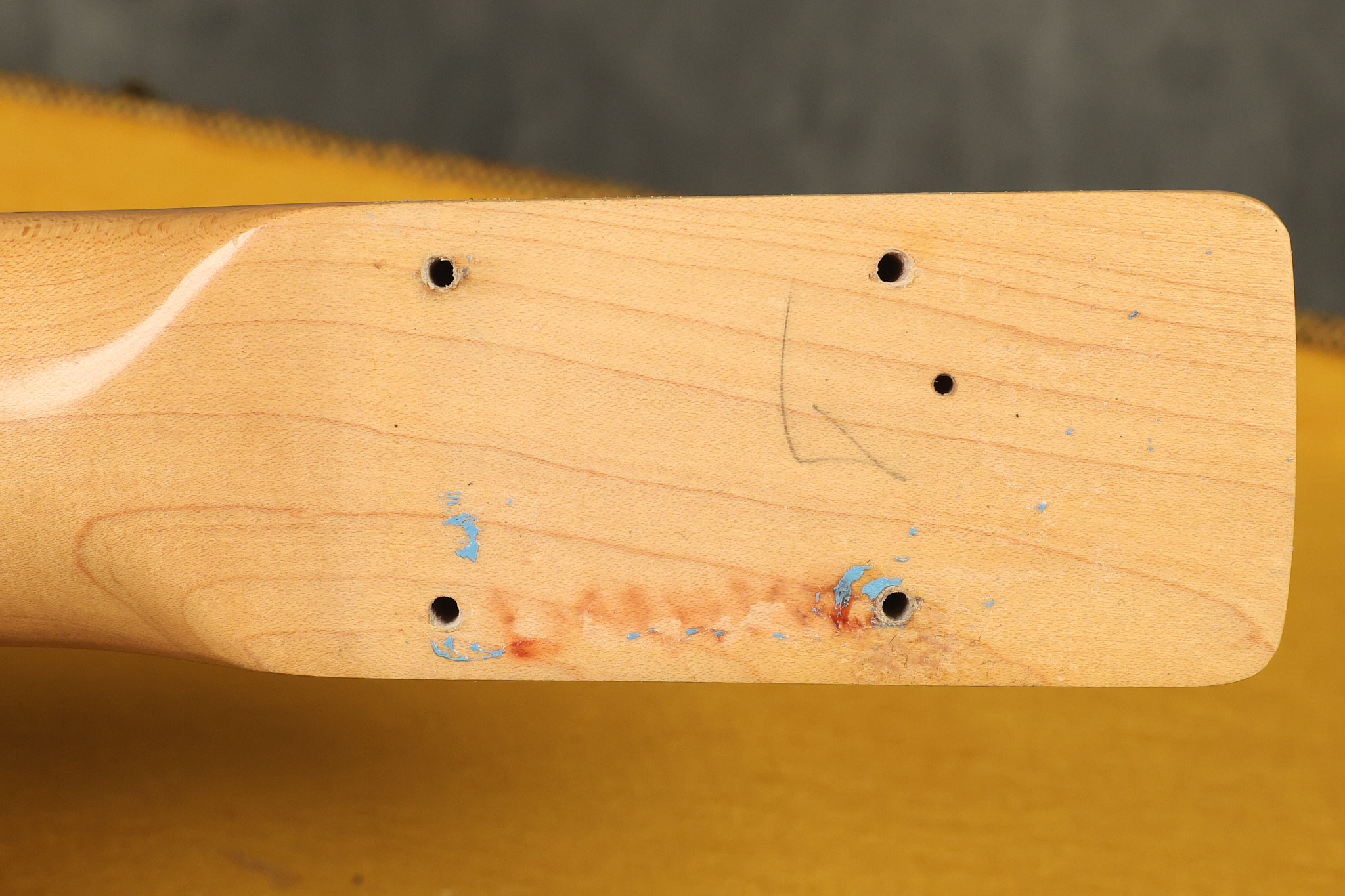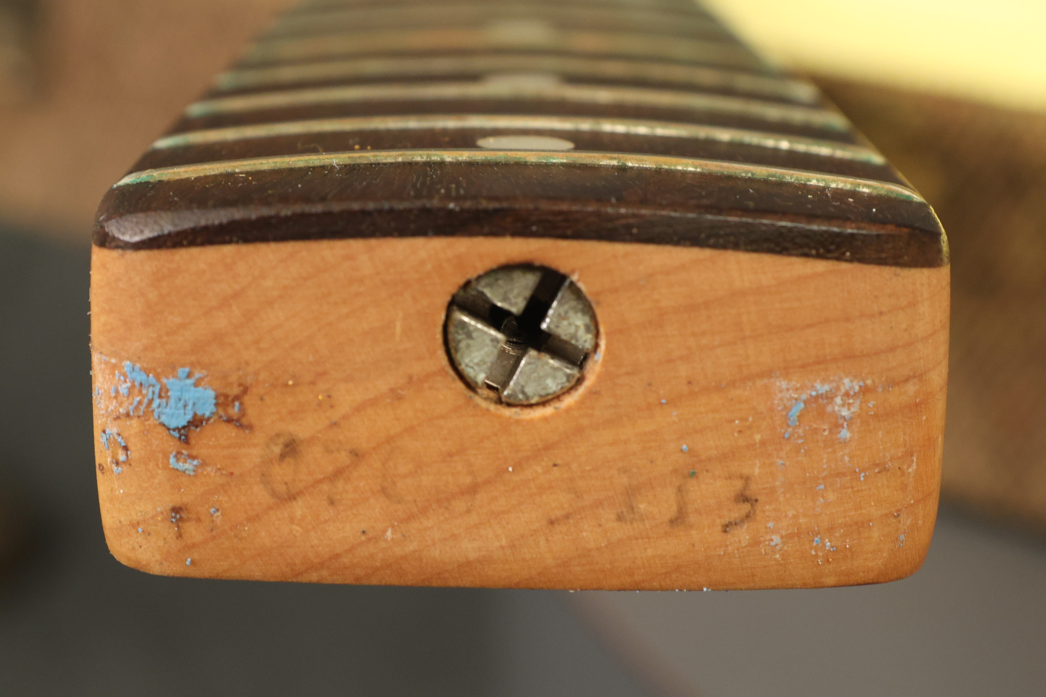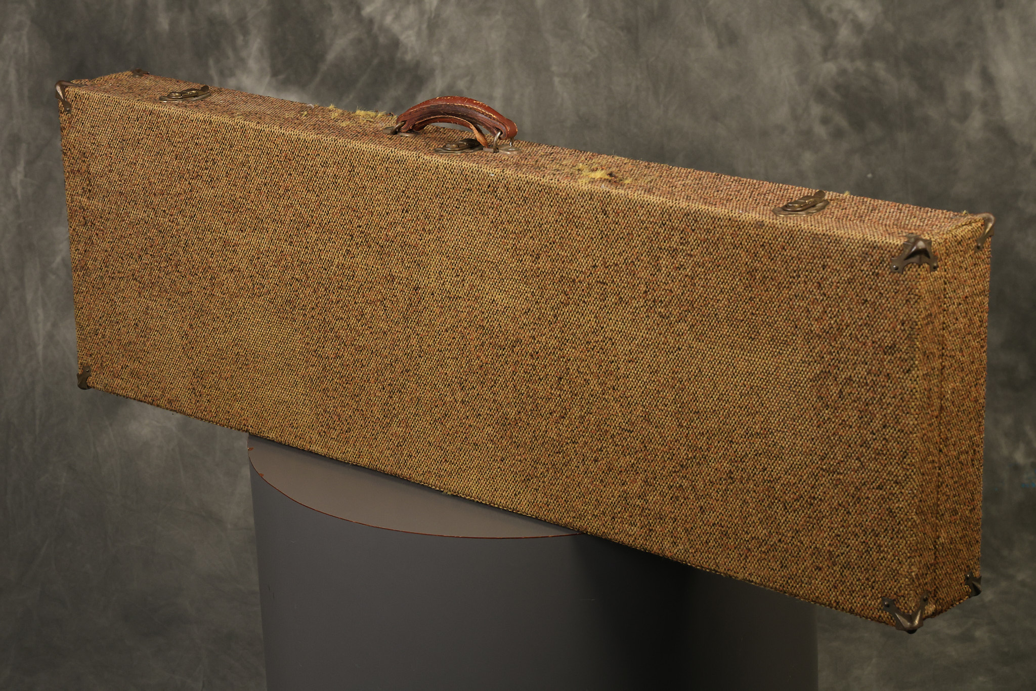 1973 Fender Musicmaster Bass in its original Blue finish. It has a great playing neck with great frets. The bass is all original and a vintage home-made hardshell case is included. There are nicks + dings, some damage in the surface of the wood on the treble side of the body, impressions in the finish on the back of the body from an old guitar strap, finish checking and other cosmetic wear including some flaking in the chrome coating of the bridge plate. The guitar itself remains structurally sound with no cracks, breaks or repairs. All electronics work and sound great.