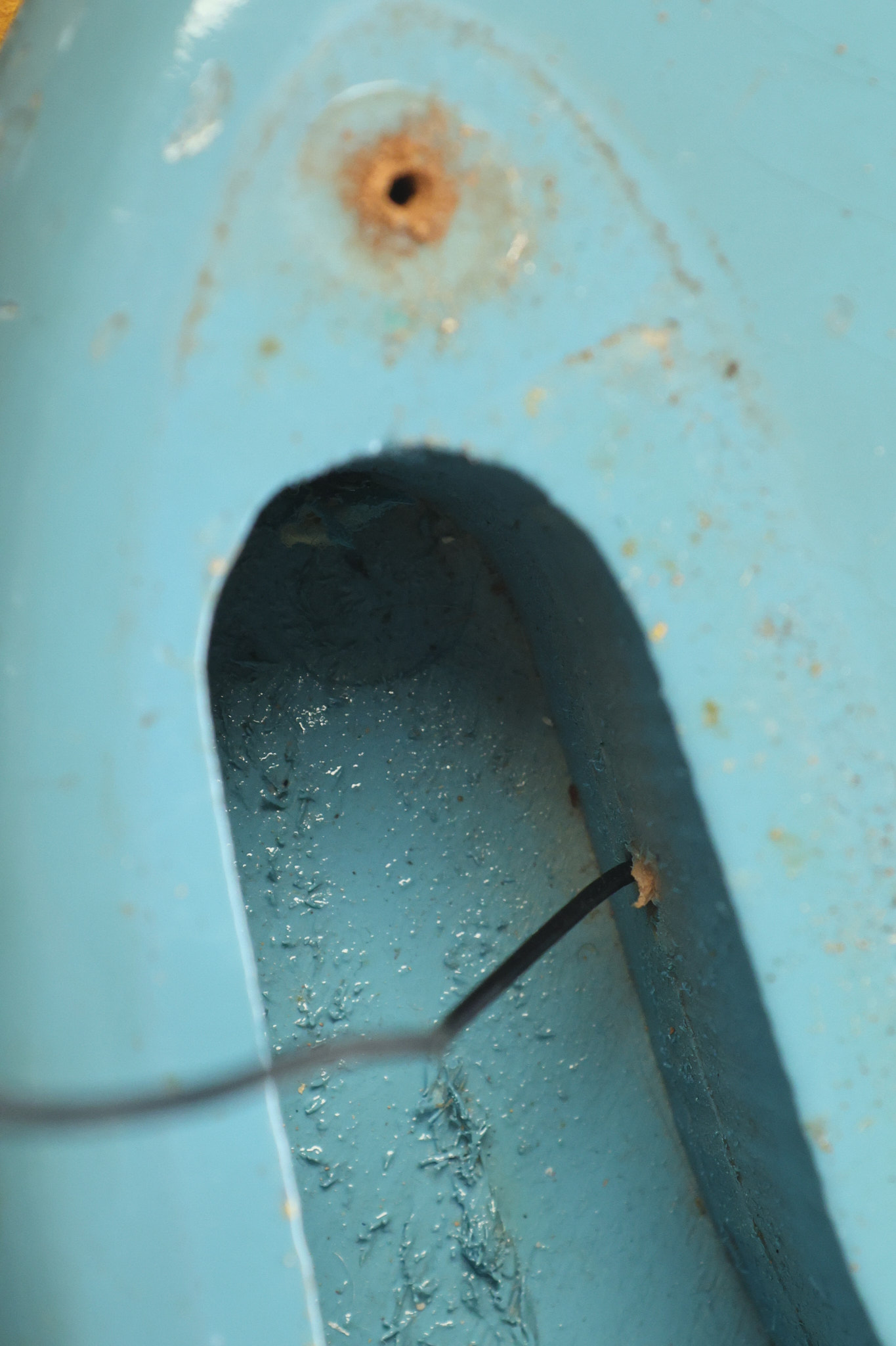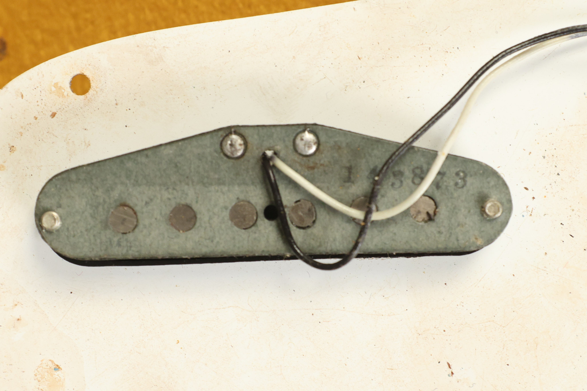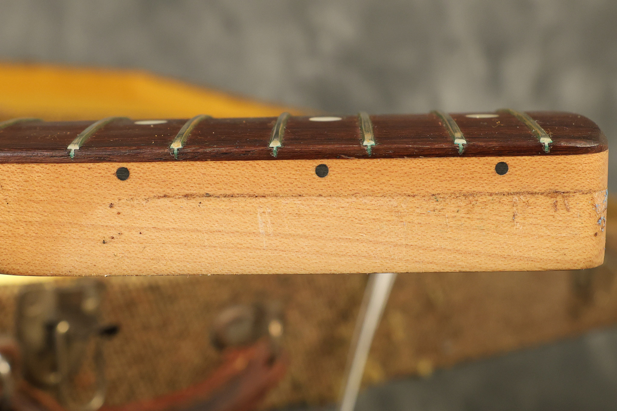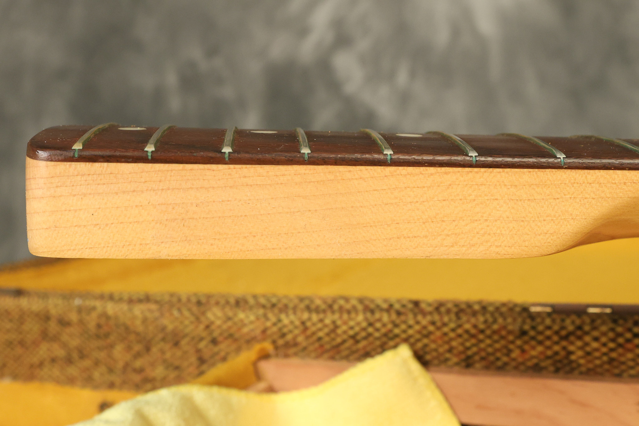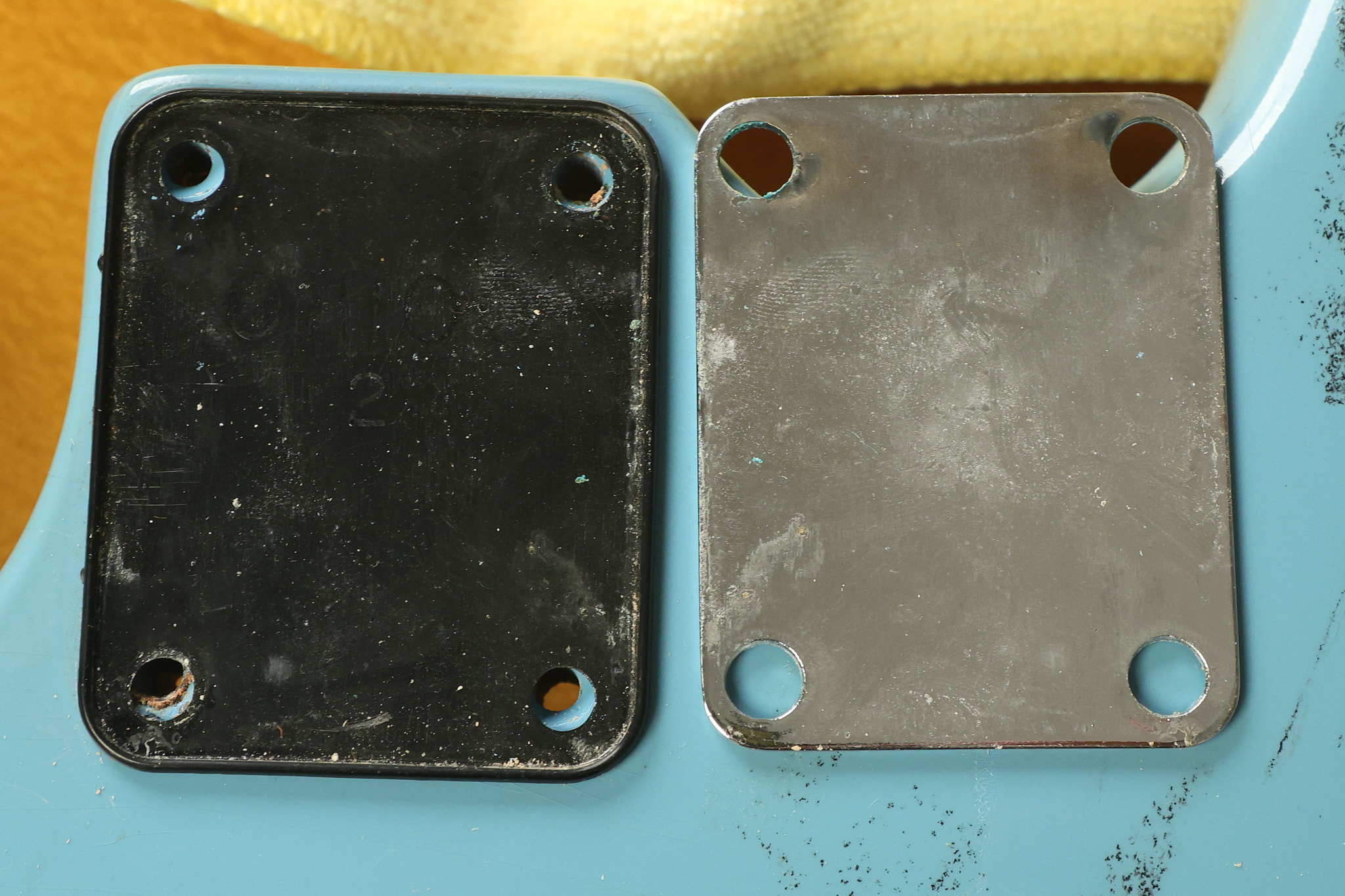 1973 Fender Musicmaster Bass in its original Blue finish. It has a great playing neck with great frets. The bass is all original and a vintage home-made hardshell case is included. There are nicks + dings, some damage in the surface of the wood on the treble side of the body, impressions in the finish on the back of the body from an old guitar strap, finish checking and other cosmetic wear including some flaking in the chrome coating of the bridge plate. The guitar itself remains structurally sound with no cracks, breaks or repairs. All electronics work and sound great.