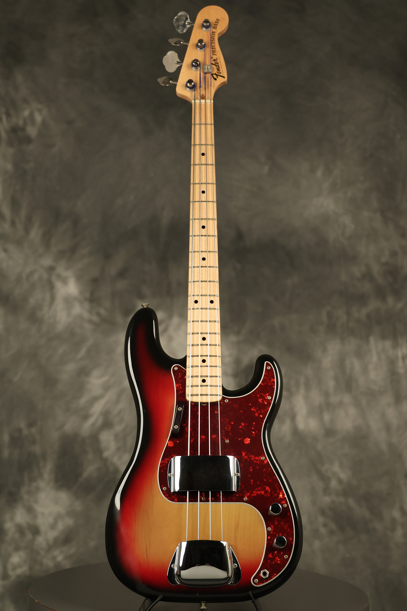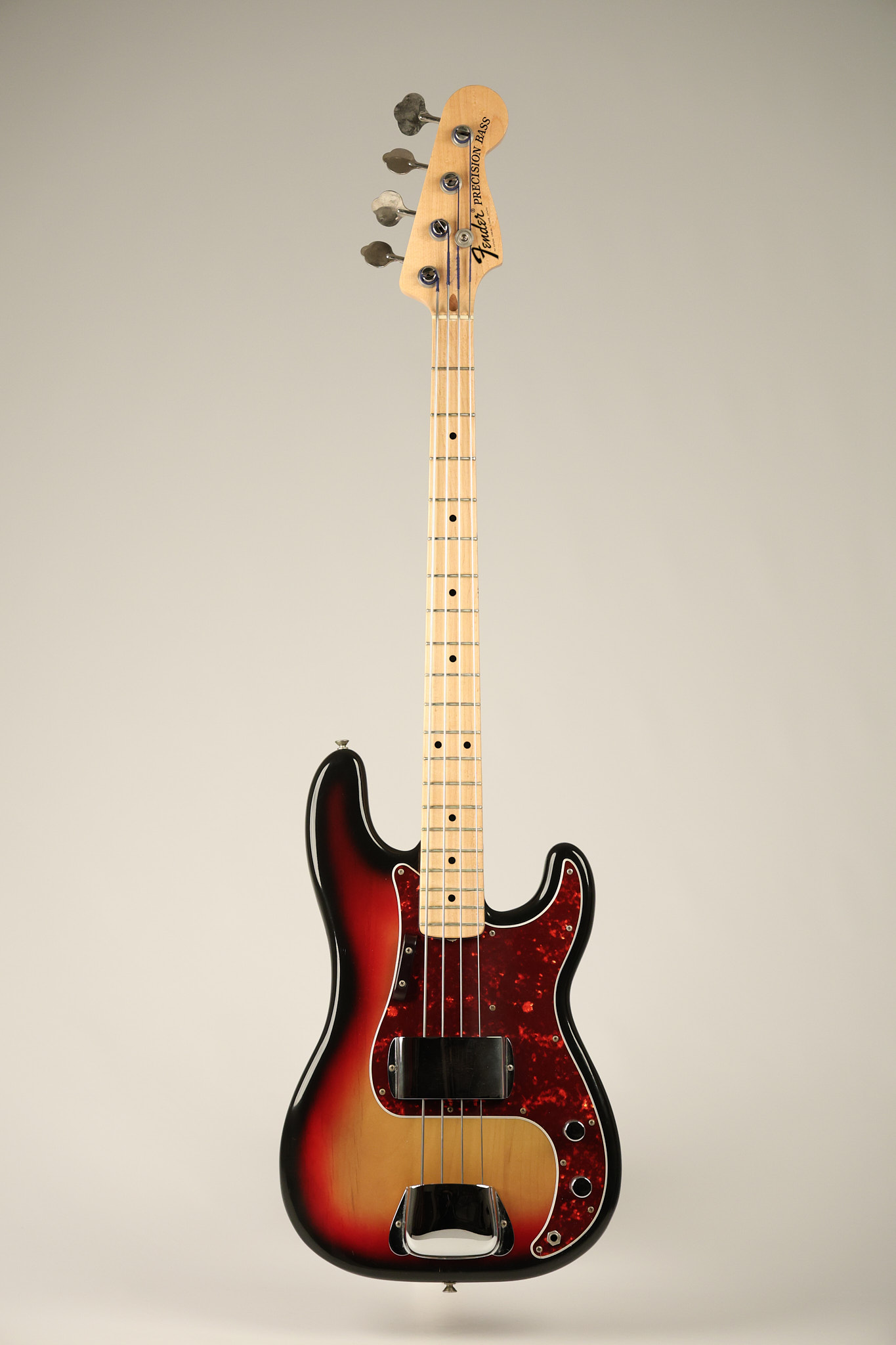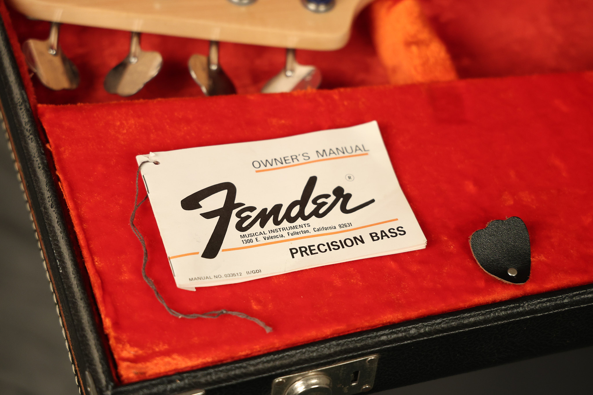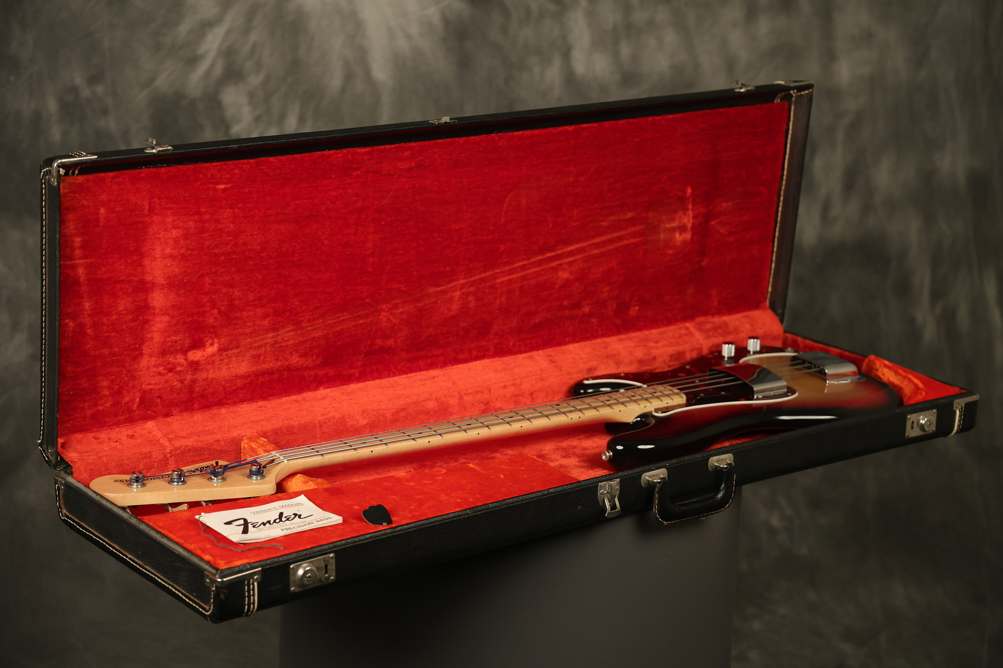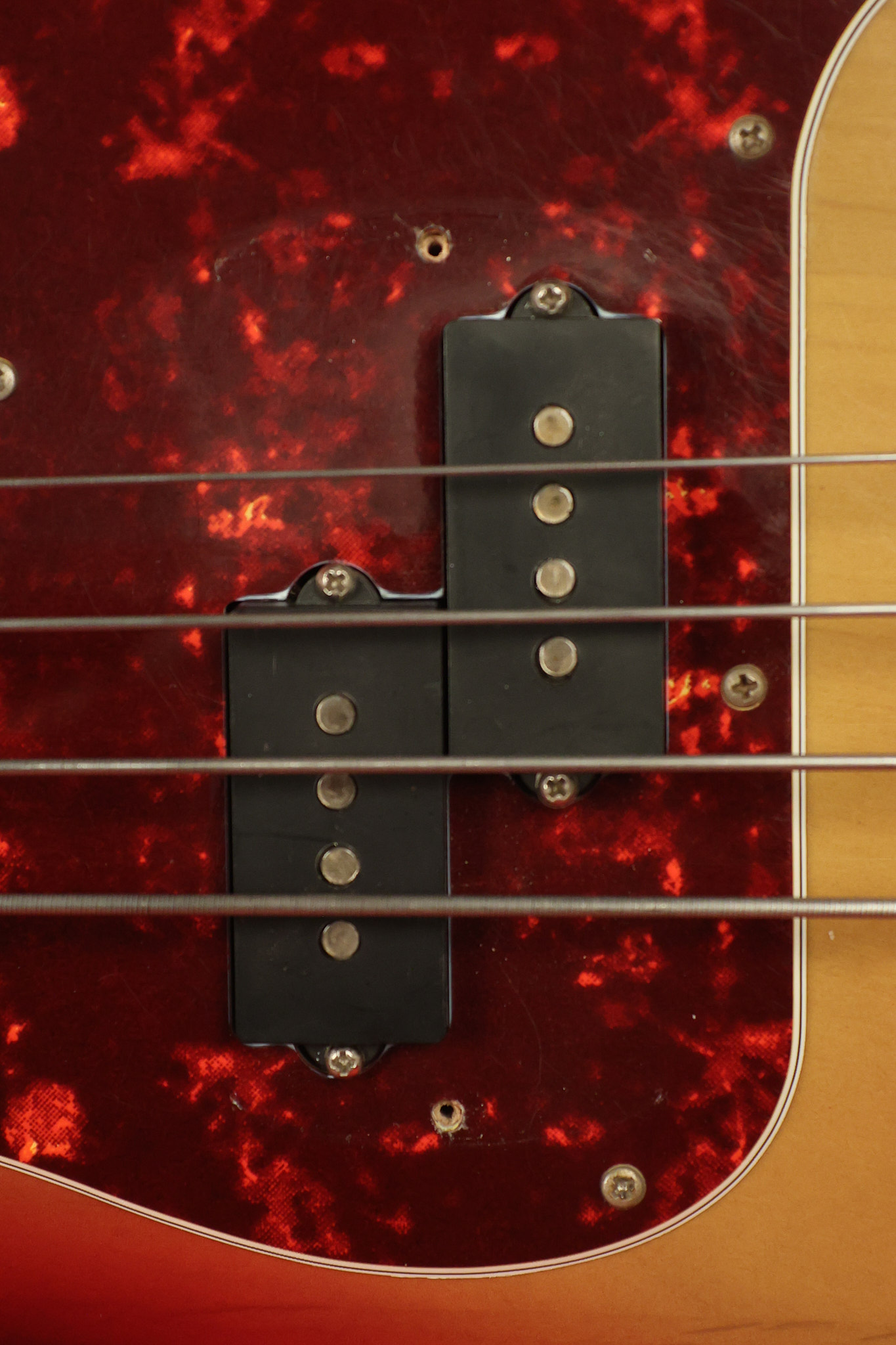 1974 Fender Precision Bass in its original Sunburst finish. It has a great playing neck with great frets. A shim has been placed at the top end of the neck pocket to allow more adjustment range for the bridge saddles. It's all original and 100% complete including both chrome covers, original owner's manual and the original hardshell case. It's in EXCELLENT condition with only some very minor nicks + dings and other very minor cosmetic wear including one tiny pickguard crack near the input jack. The guitar itself remains structurally sound with no cracks, breaks or repairs. All electronics work and sound great as it provides an authentic '70's P-Bass tone. The weight is 8 lbs. 6.2 oz without the chrome covers.