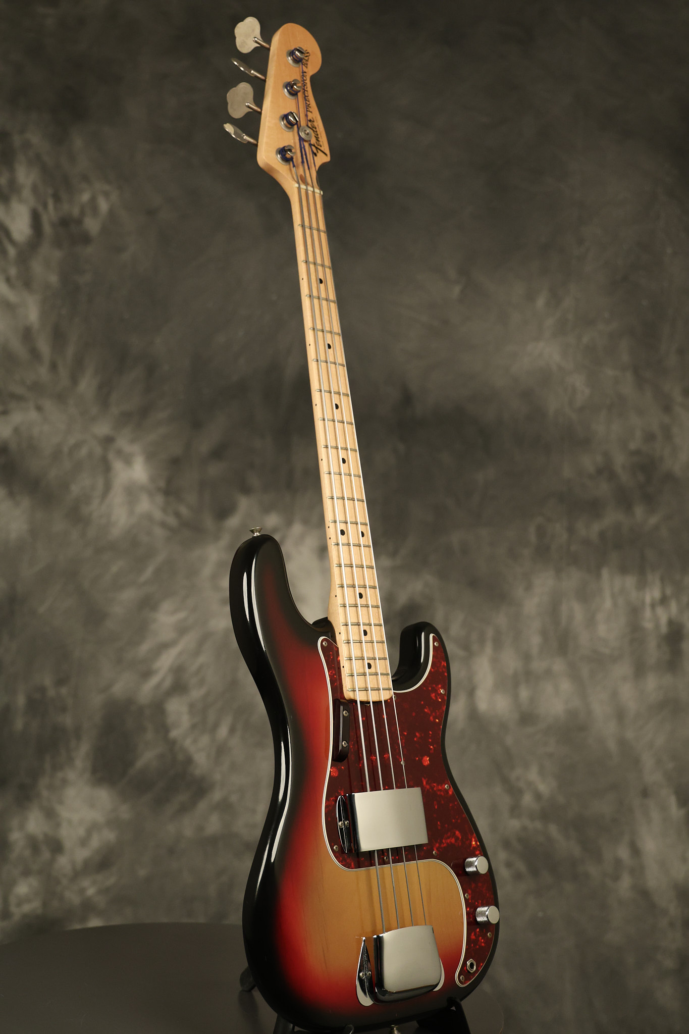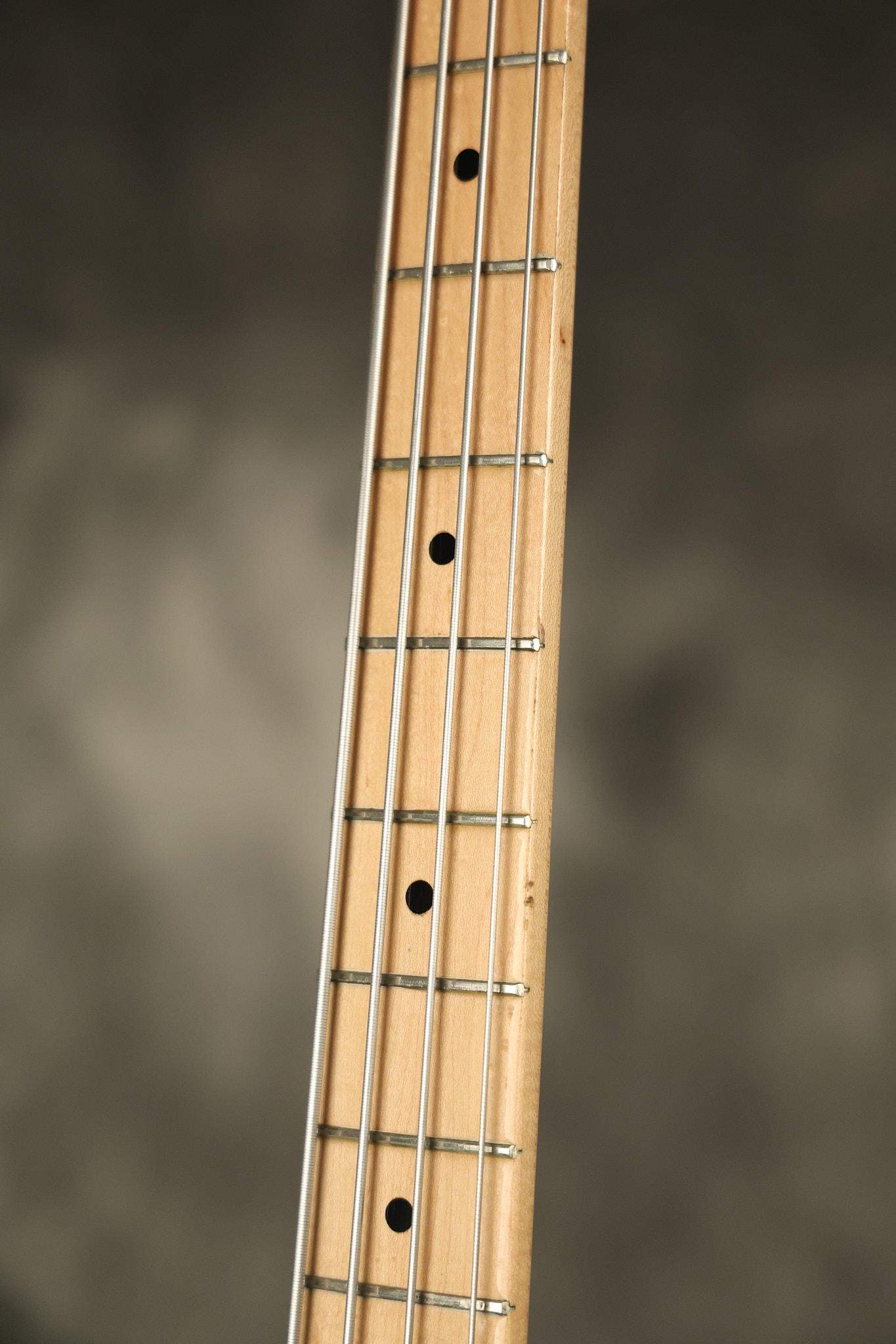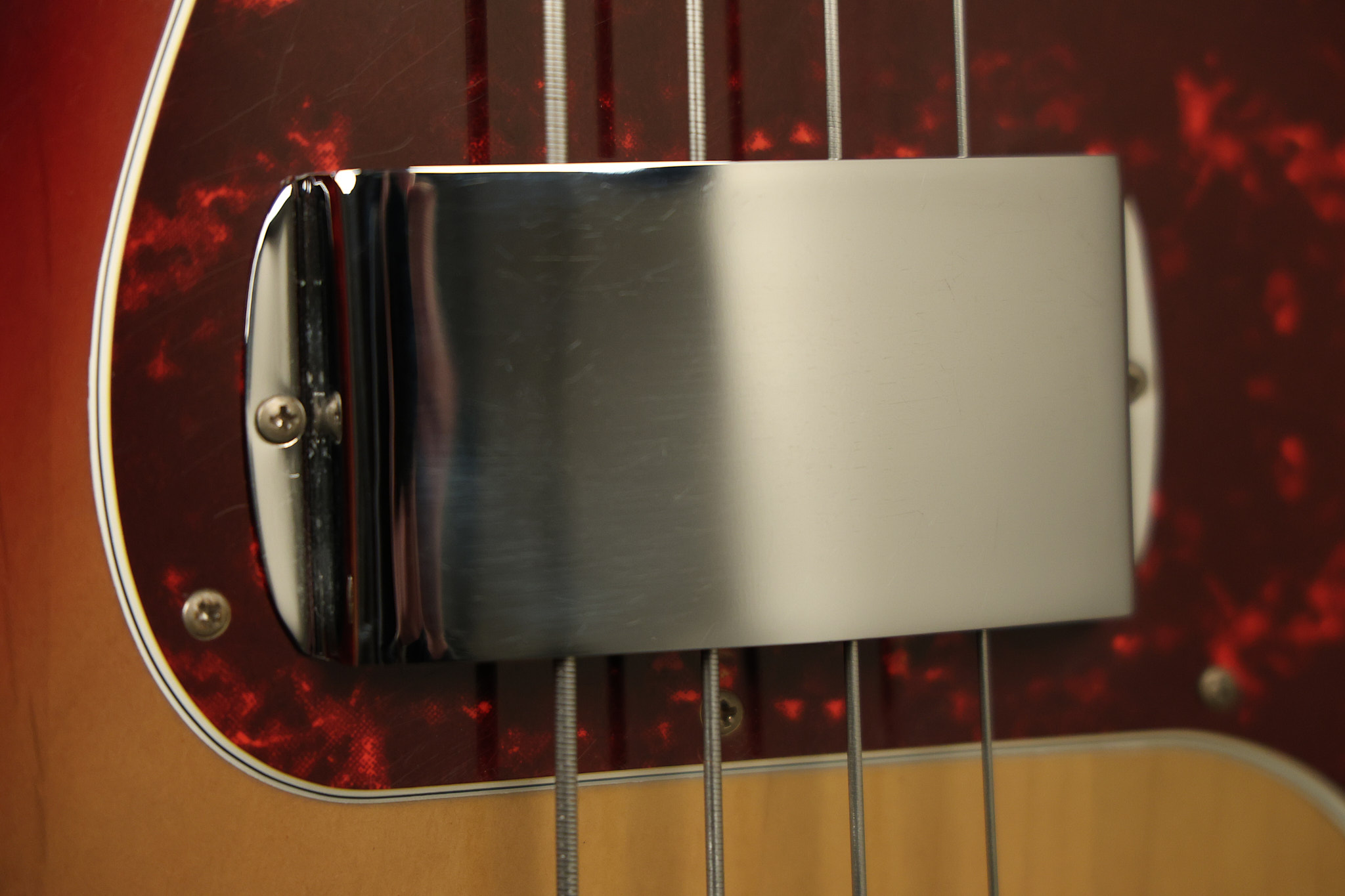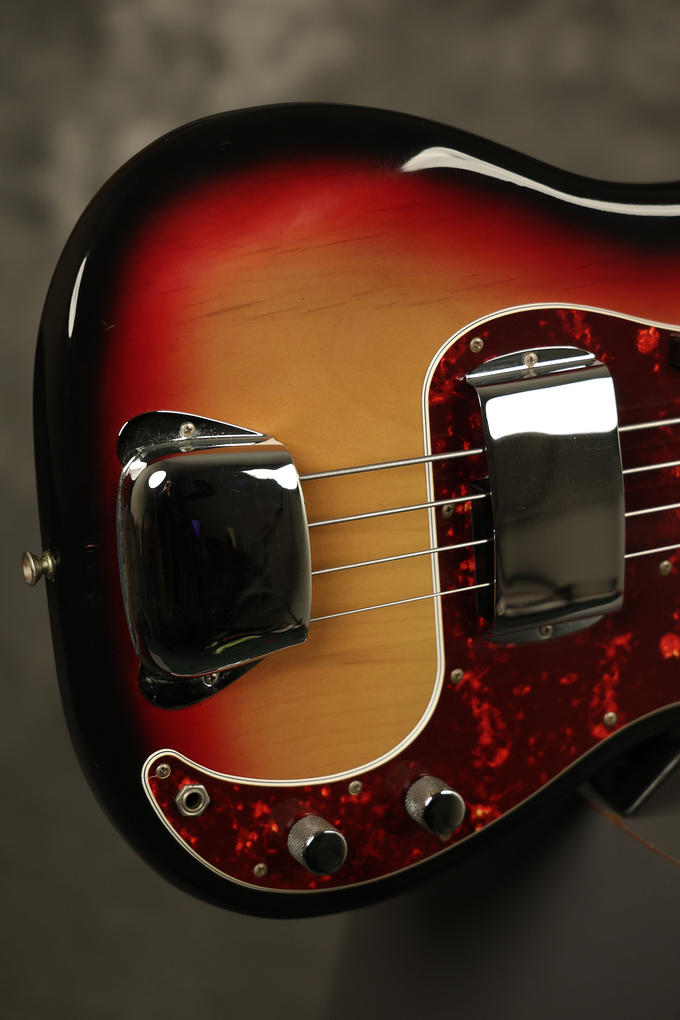 1974 Fender Precision Bass in its original Sunburst finish. It has a great playing neck with great frets. A shim has been placed at the top end of the neck pocket to allow more adjustment range for the bridge saddles. It's all original and 100% complete including both chrome covers, original owner's manual and the original hardshell case. It's in EXCELLENT condition with only some very minor nicks + dings and other very minor cosmetic wear including one tiny pickguard crack near the input jack. The guitar itself remains structurally sound with no cracks, breaks or repairs. All electronics work and sound great as it provides an authentic '70's P-Bass tone. The weight is 8 lbs. 6.2 oz without the chrome covers.
