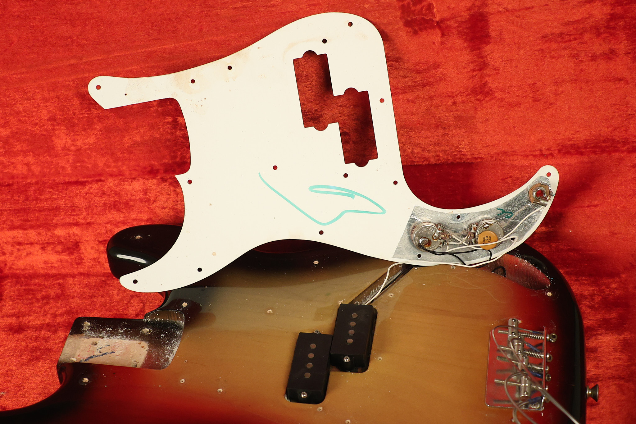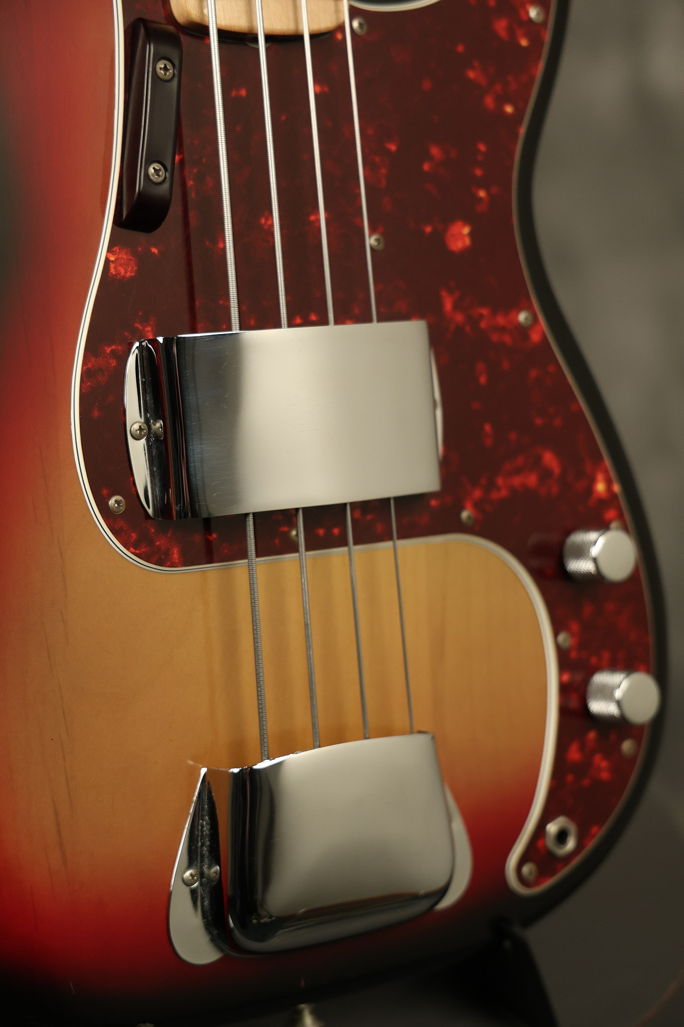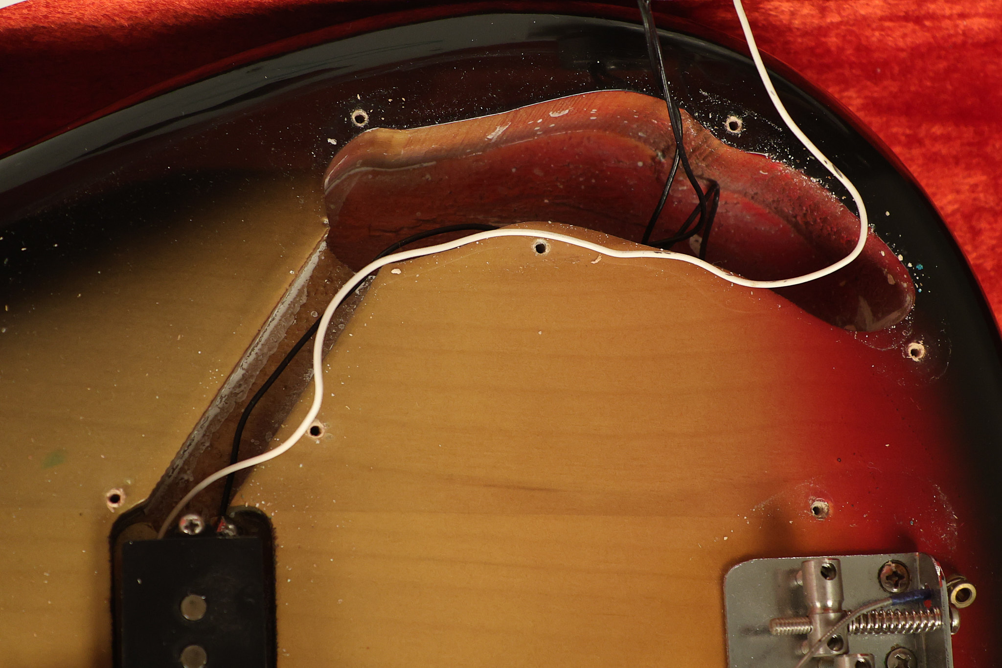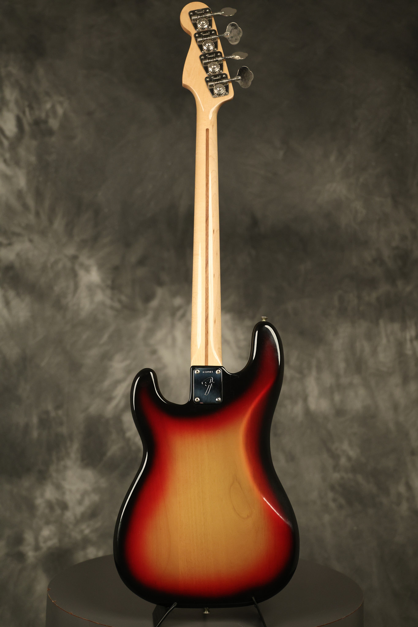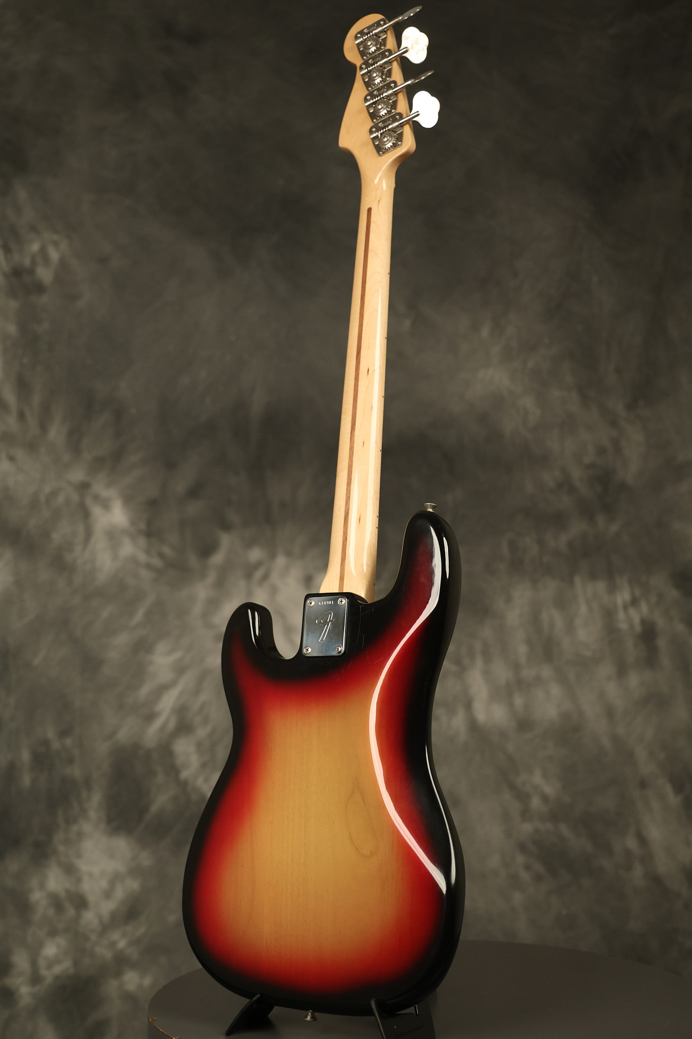 1974 Fender Precision Bass in its original Sunburst finish. It has a great playing neck with great frets. A shim has been placed at the top end of the neck pocket to allow more adjustment range for the bridge saddles. It's all original and 100% complete including both chrome covers, original owner's manual and the original hardshell case. It's in EXCELLENT condition with only some very minor nicks + dings and other very minor cosmetic wear including one tiny pickguard crack near the input jack. The guitar itself remains structurally sound with no cracks, breaks or repairs. All electronics work and sound great as it provides an authentic '70's P-Bass tone. The weight is 8 lbs. 6.2 oz without the chrome covers.