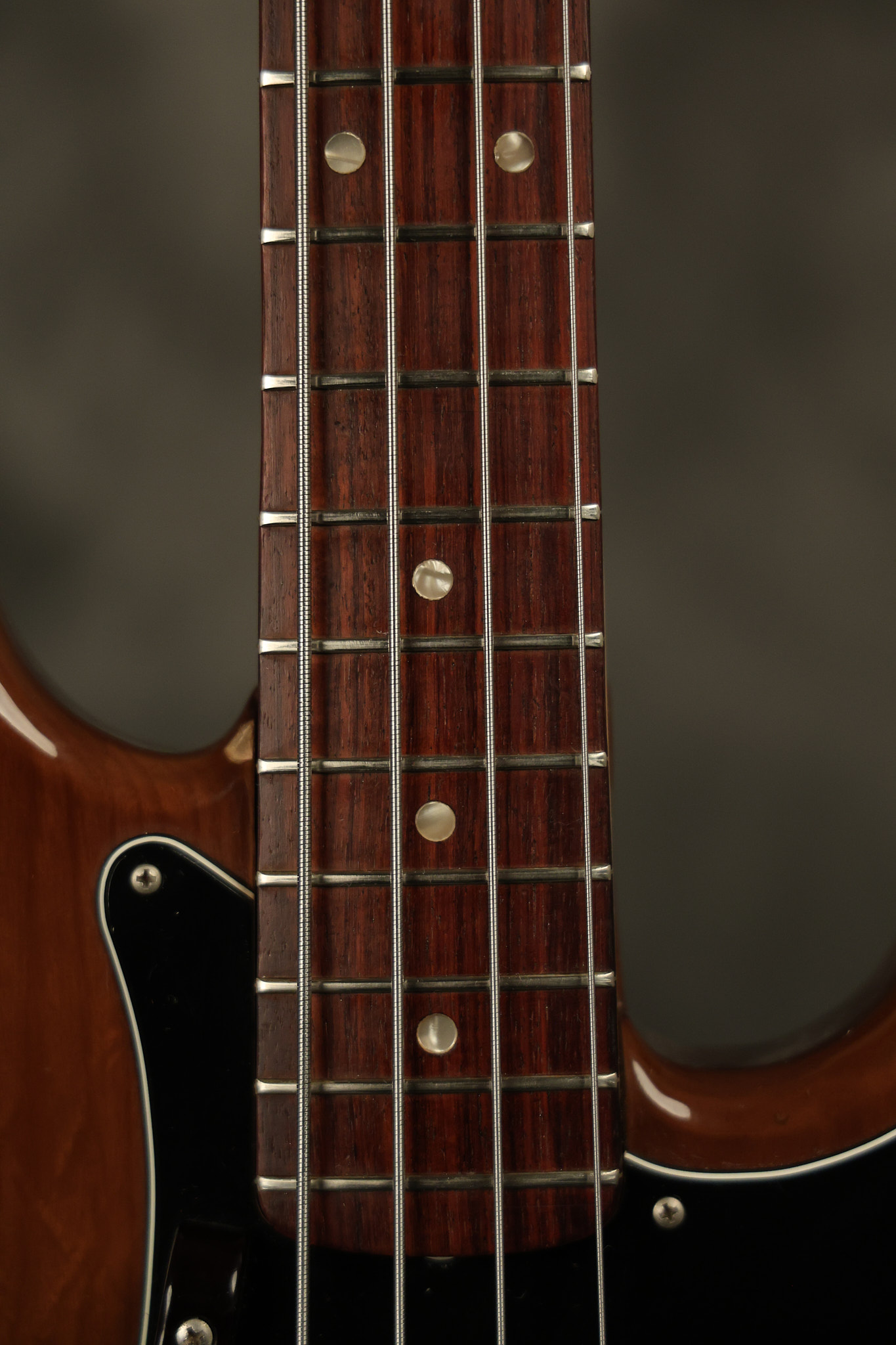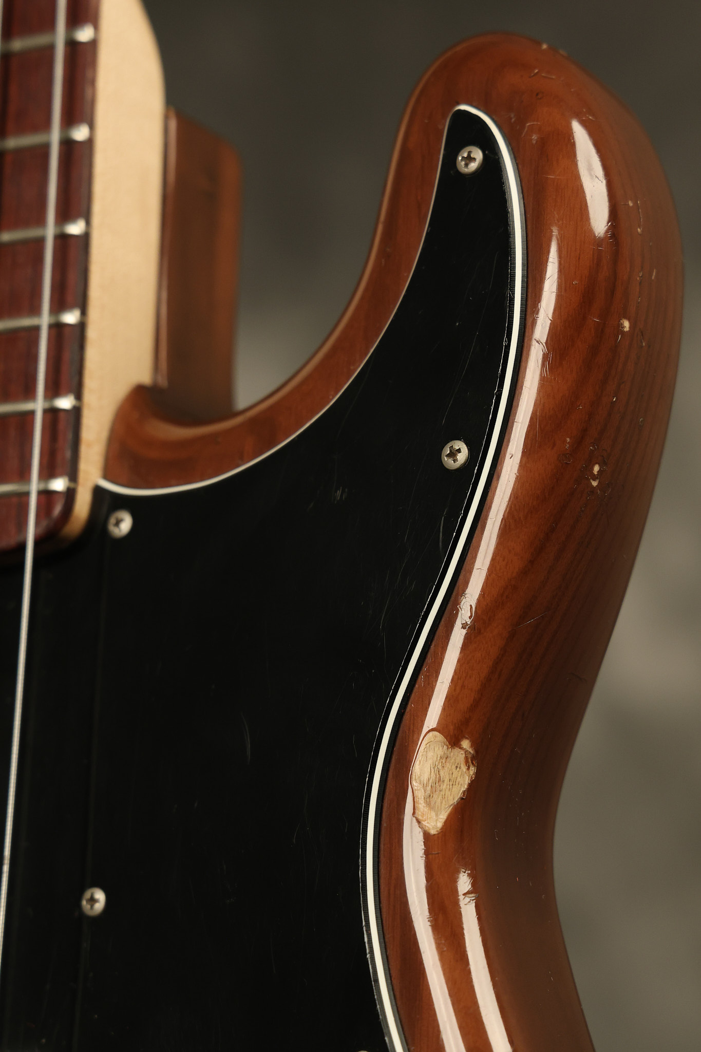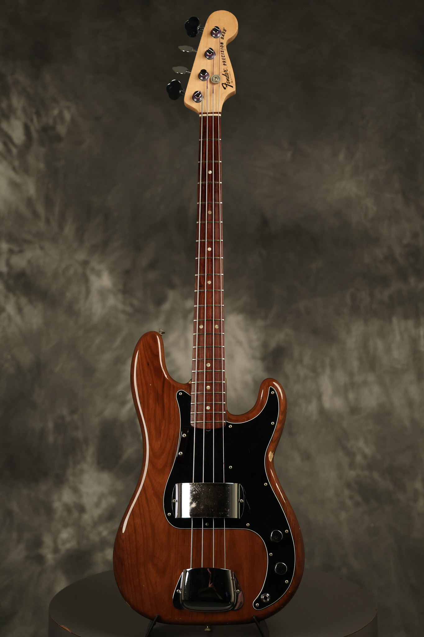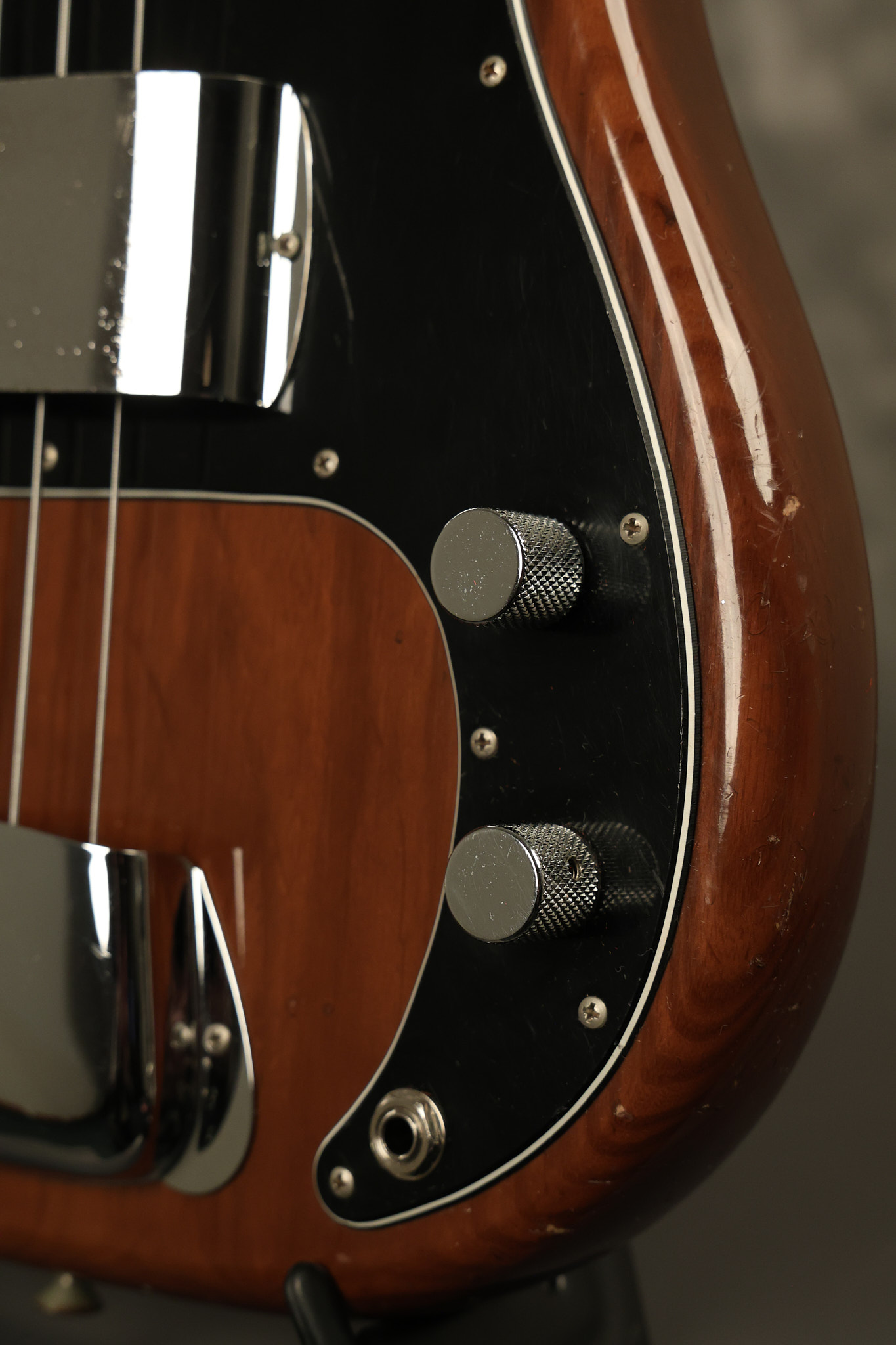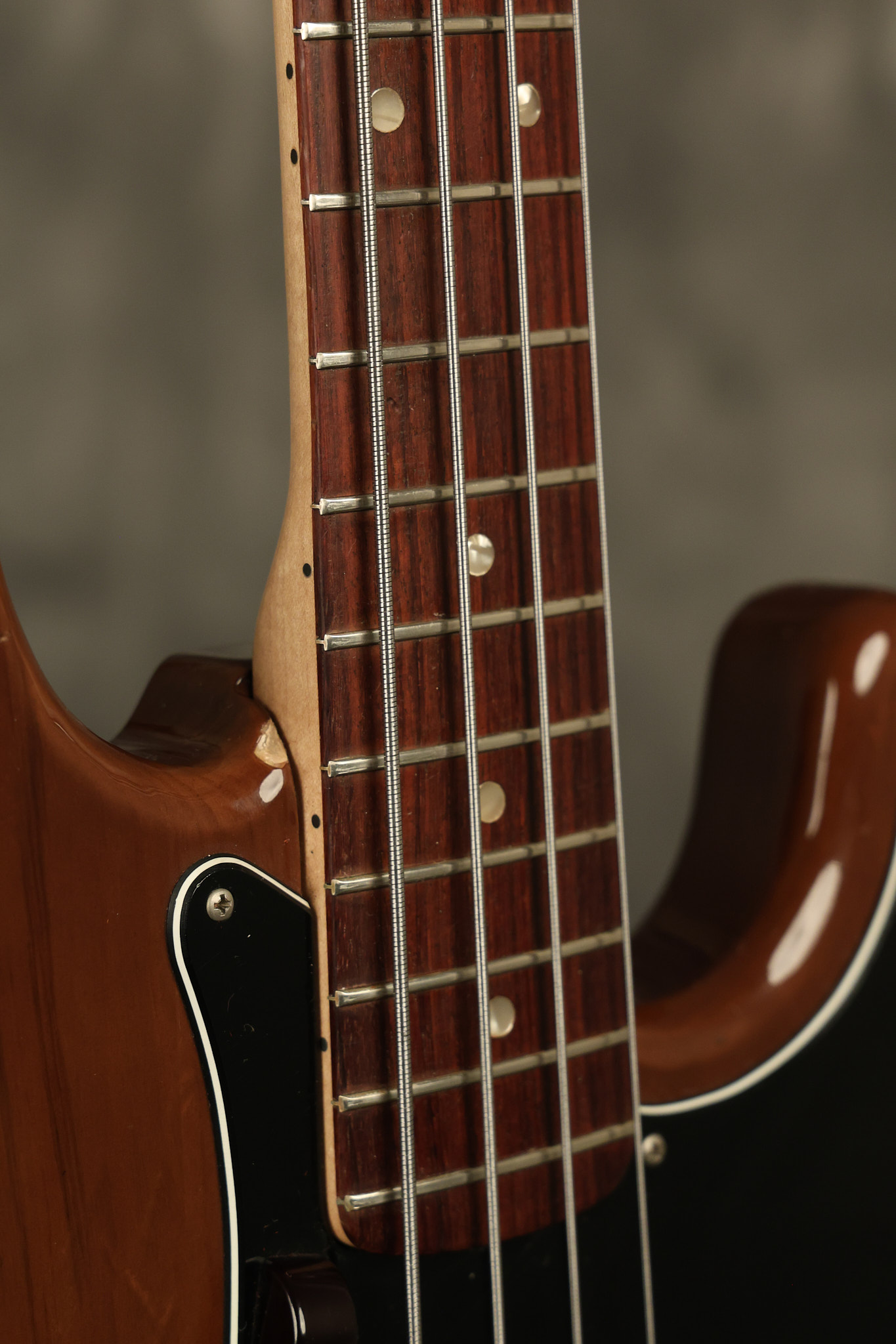 1978 Fender Precision Bass in its original Walnut finish. It has a good playing neck with great frets. It's all original with the exception of the jack and a couple of wires. The treble side pickup has been professionally rewound. It's also 100% complete along with both chrome covers and the original hardshell case. There are nicks + dings, a few finish cracks on the back of the body and other cosmetic wear. The bass itself remains structurally sound with no cracks, breaks or repairs. All electronics work and sound great as it provides an authentic '70's P-Bass tone.