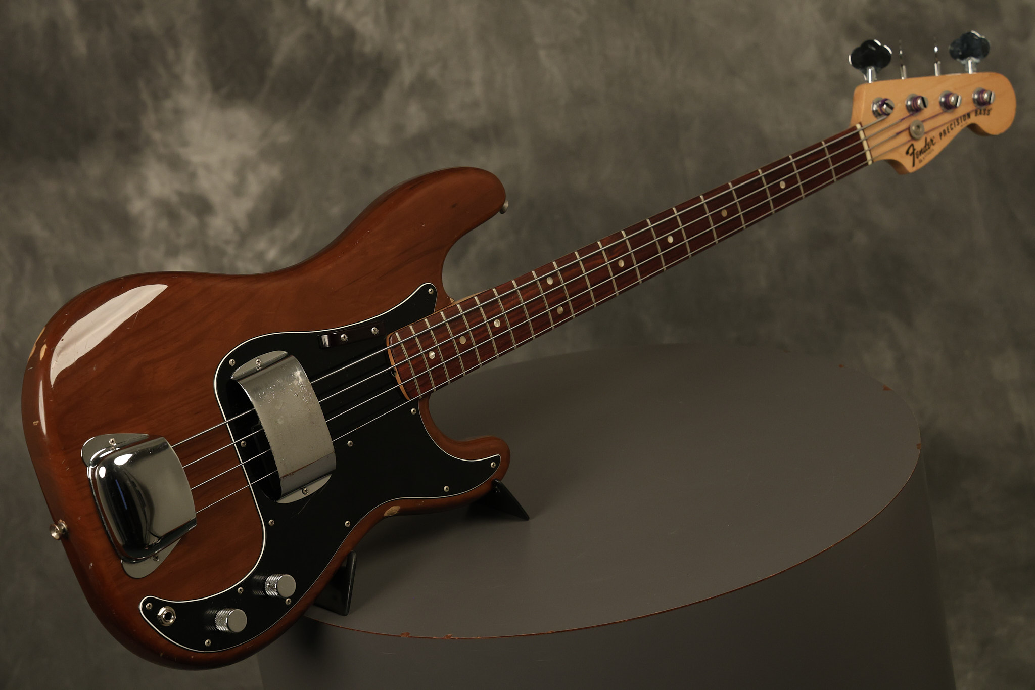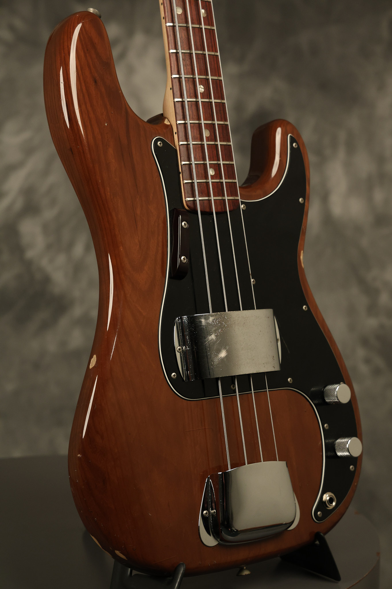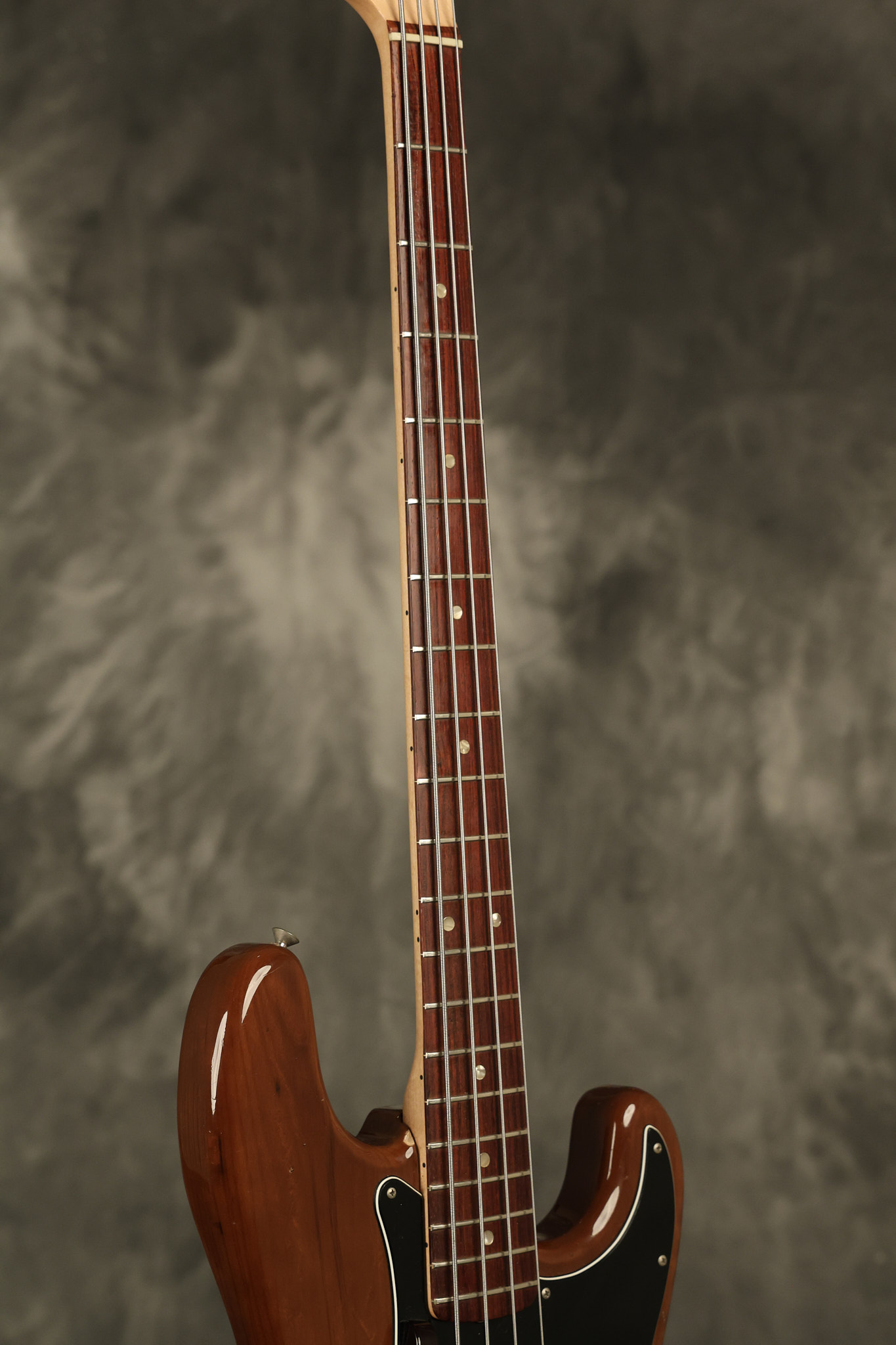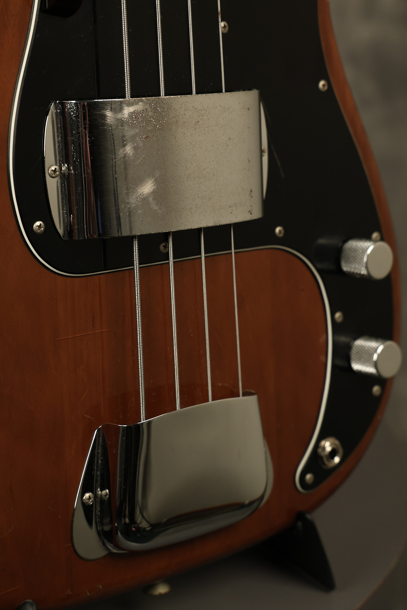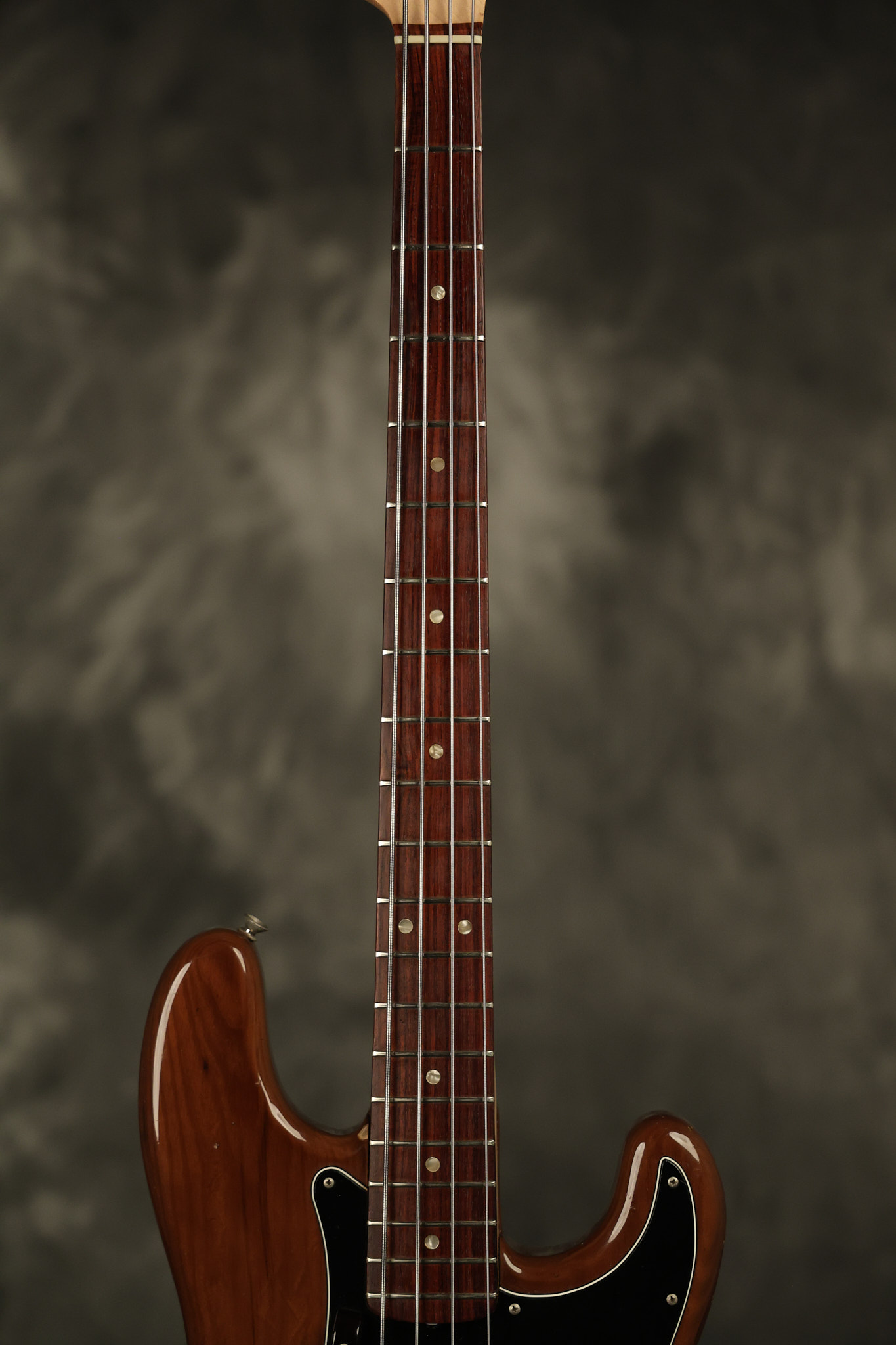 1978 Fender Precision Bass in its original Walnut finish. It has a good playing neck with great frets. It's all original with the exception of the jack and a couple of wires. The treble side pickup has been professionally rewound. It's also 100% complete along with both chrome covers and the original hardshell case. There are nicks + dings, a few finish cracks on the back of the body and other cosmetic wear. The bass itself remains structurally sound with no cracks, breaks or repairs. All electronics work and sound great as it provides an authentic '70's P-Bass tone.
