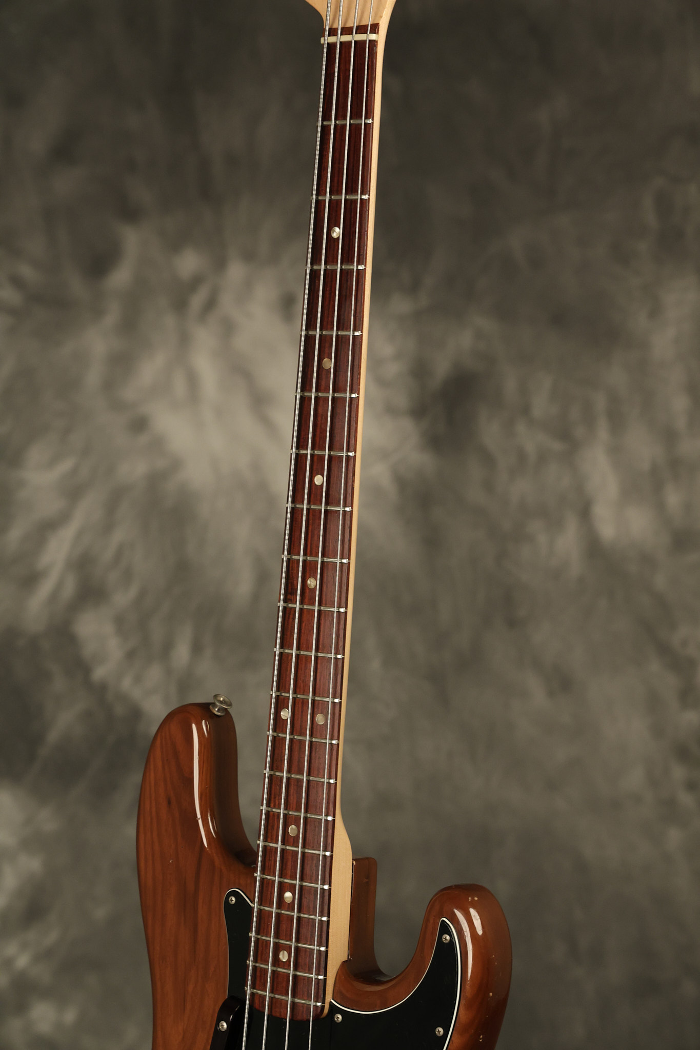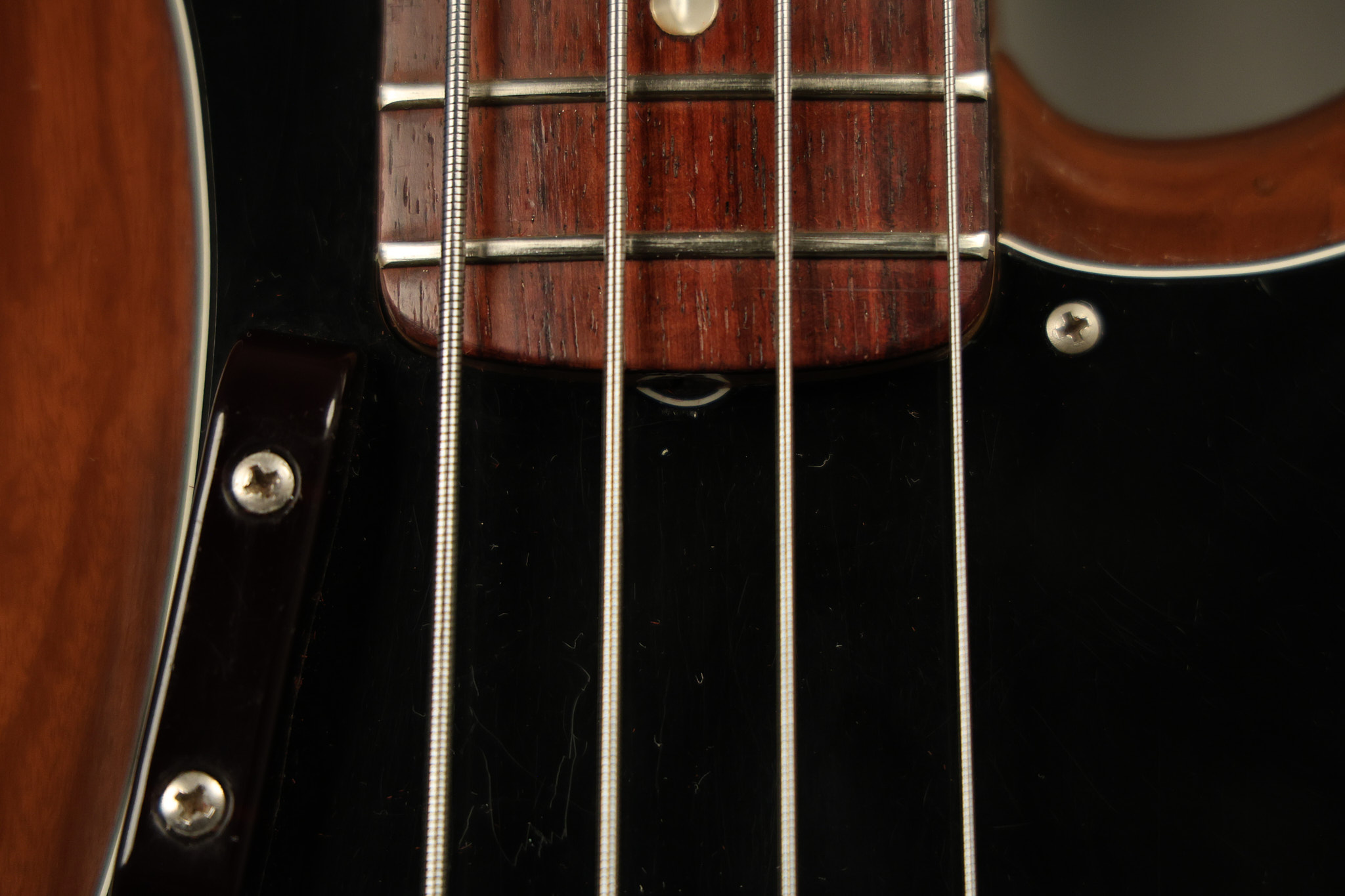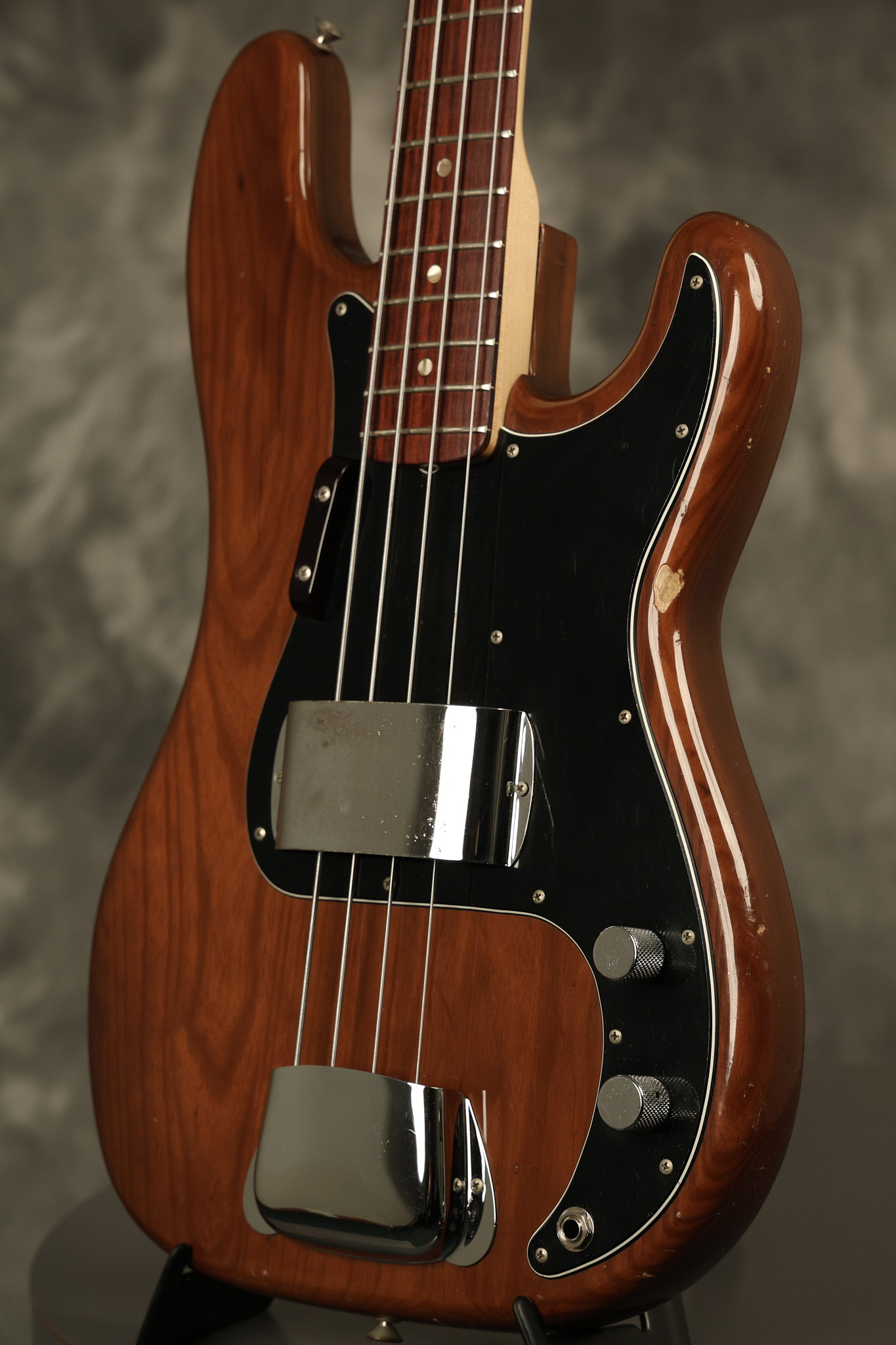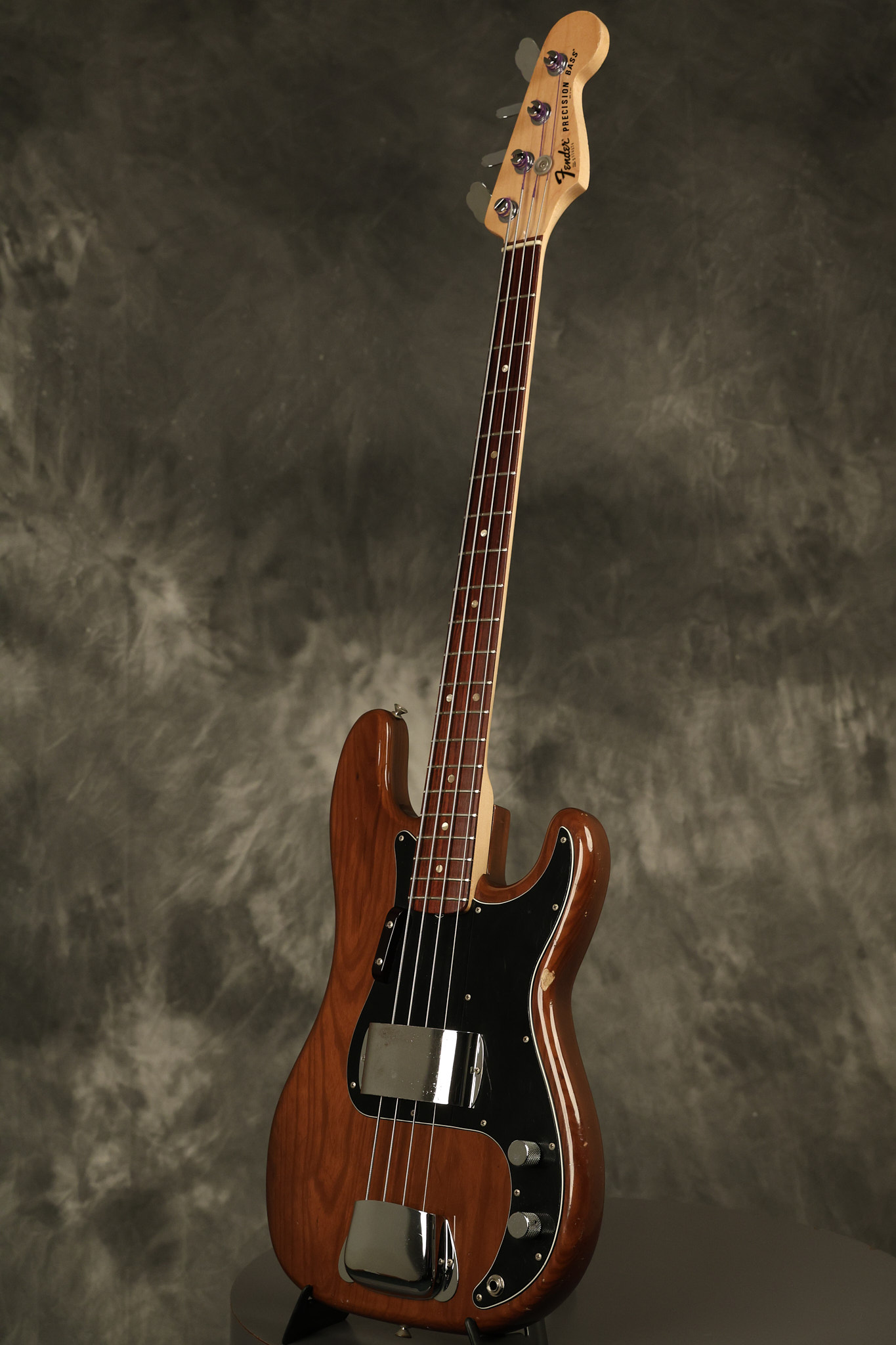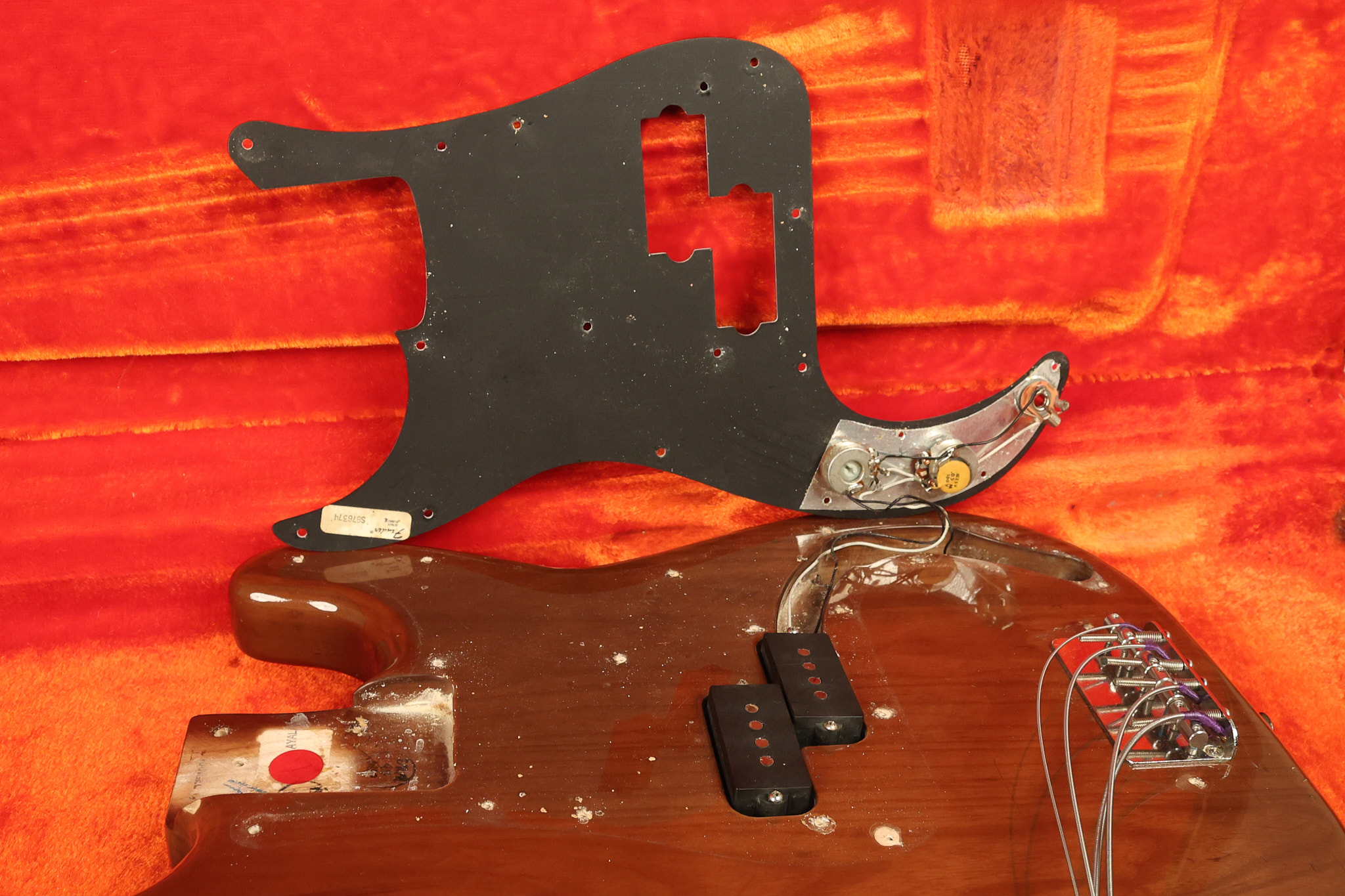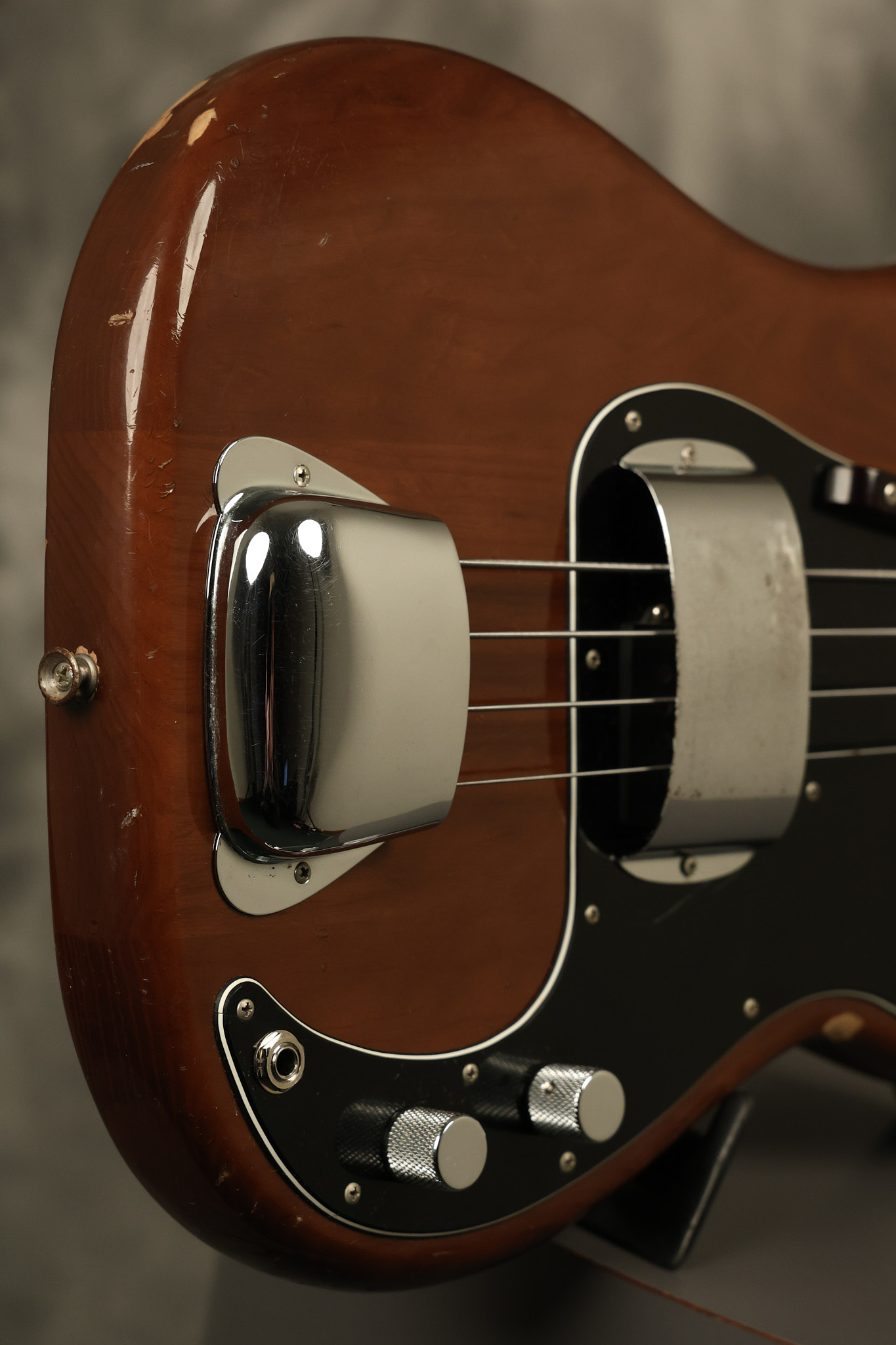 1978 Fender Precision Bass in its original Walnut finish. It has a good playing neck with great frets. It's all original with the exception of the jack and a couple of wires. The treble side pickup has been professionally rewound. It's also 100% complete along with both chrome covers and the original hardshell case. There are nicks + dings, a few finish cracks on the back of the body and other cosmetic wear. The bass itself remains structurally sound with no cracks, breaks or repairs. All electronics work and sound great as it provides an authentic '70's P-Bass tone.