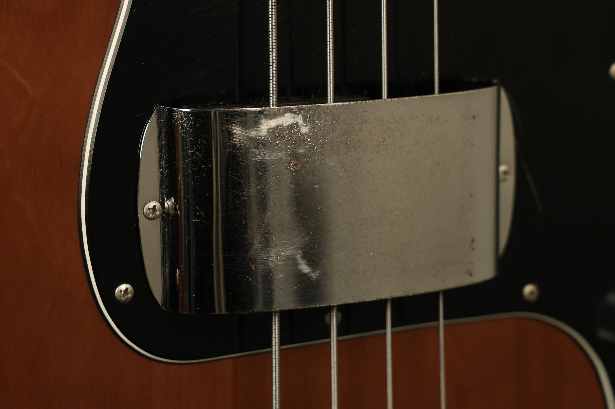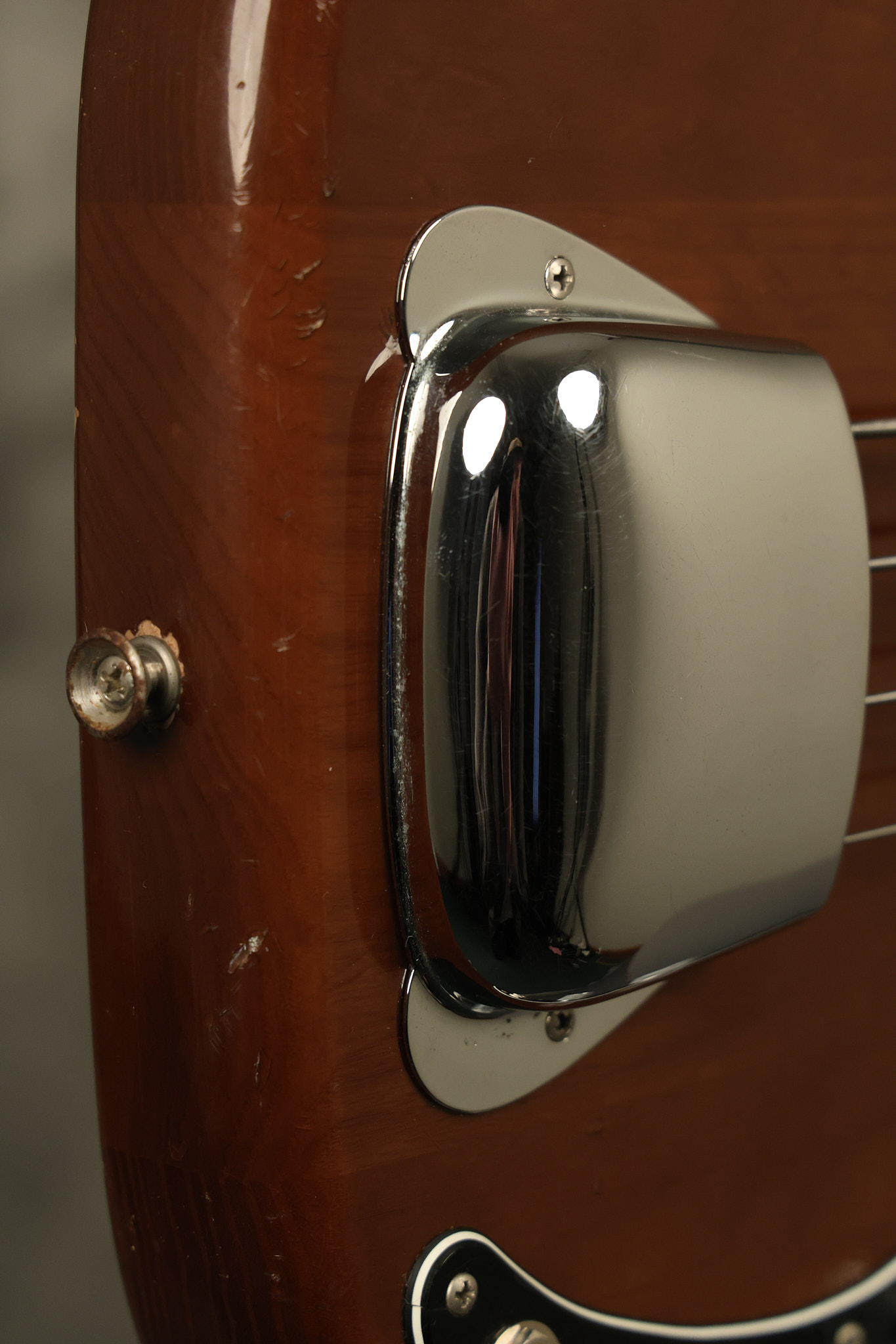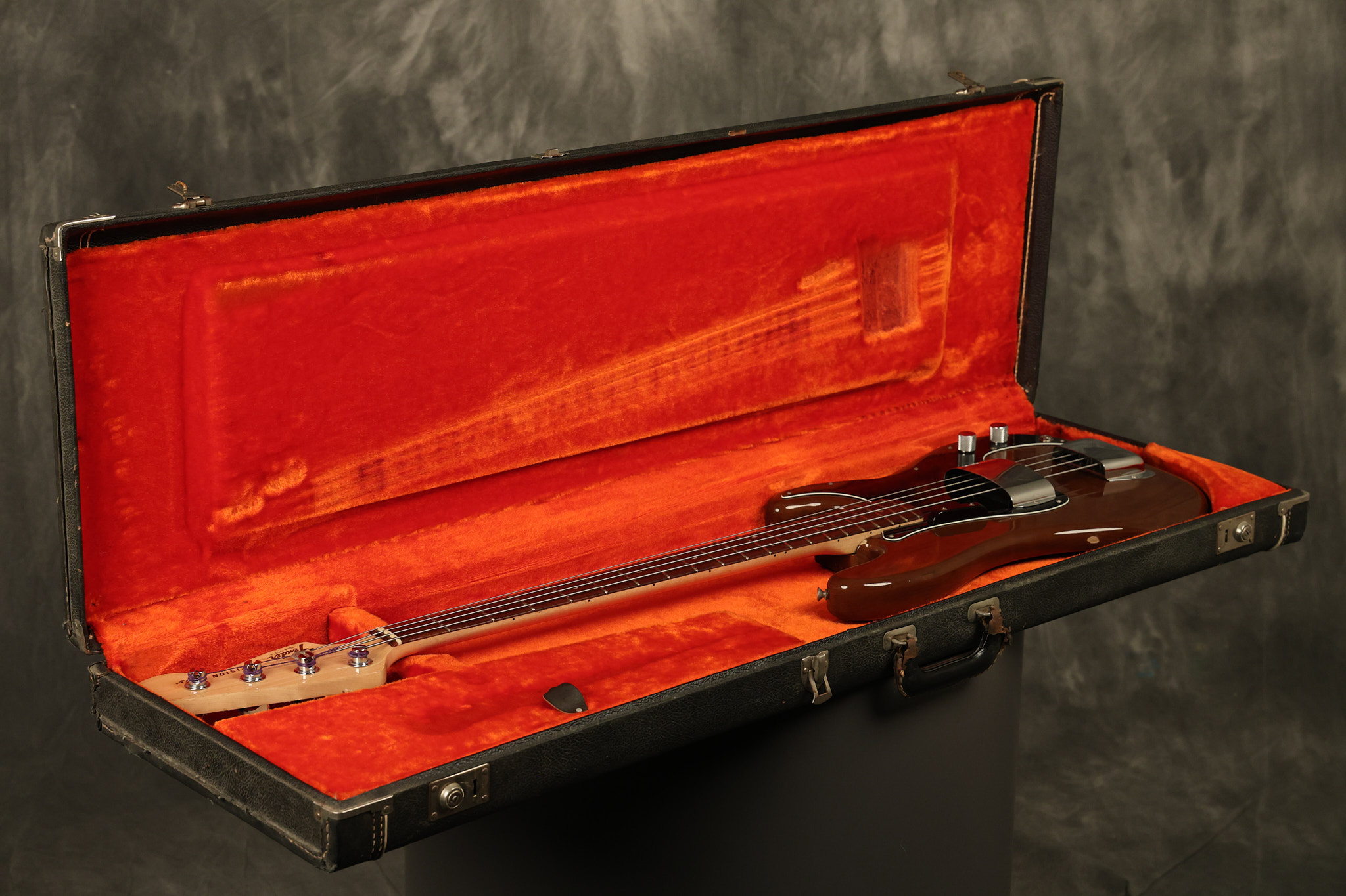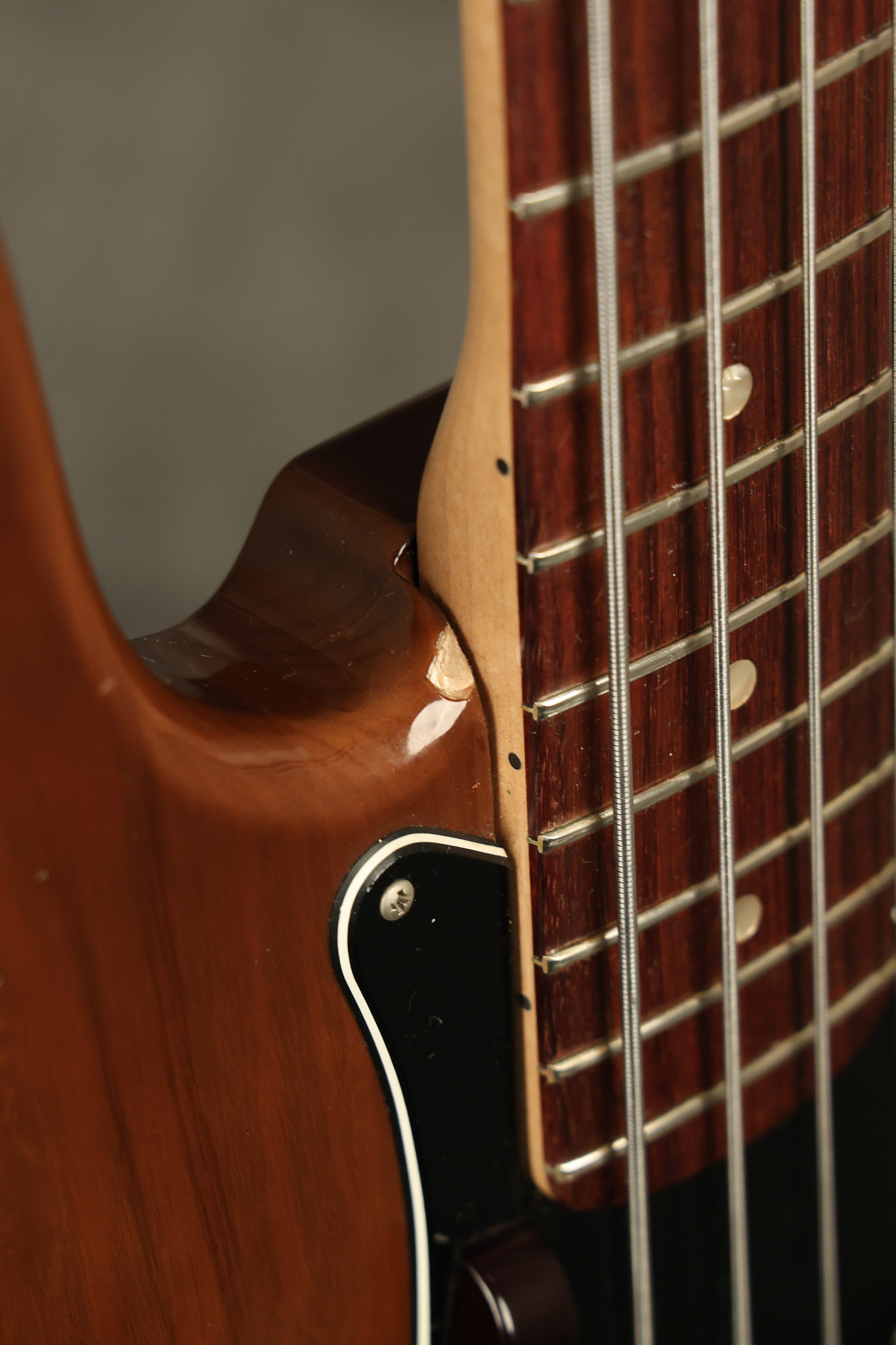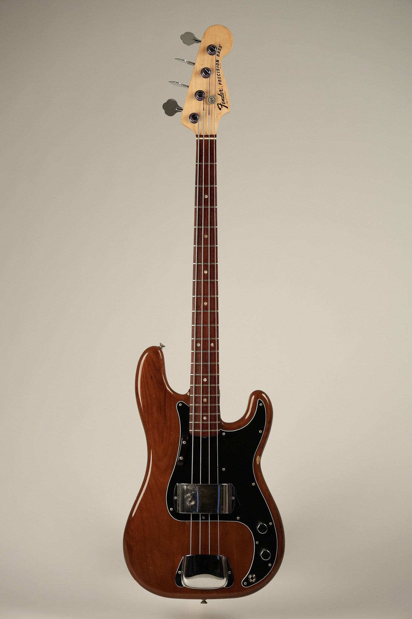 1978 Fender Precision Bass in its original Walnut finish. It has a good playing neck with great frets. It's all original with the exception of the jack and a couple of wires. The treble side pickup has been professionally rewound. It's also 100% complete along with both chrome covers and the original hardshell case. There are nicks + dings, a few finish cracks on the back of the body and other cosmetic wear. The bass itself remains structurally sound with no cracks, breaks or repairs. All electronics work and sound great as it provides an authentic '70's P-Bass tone.